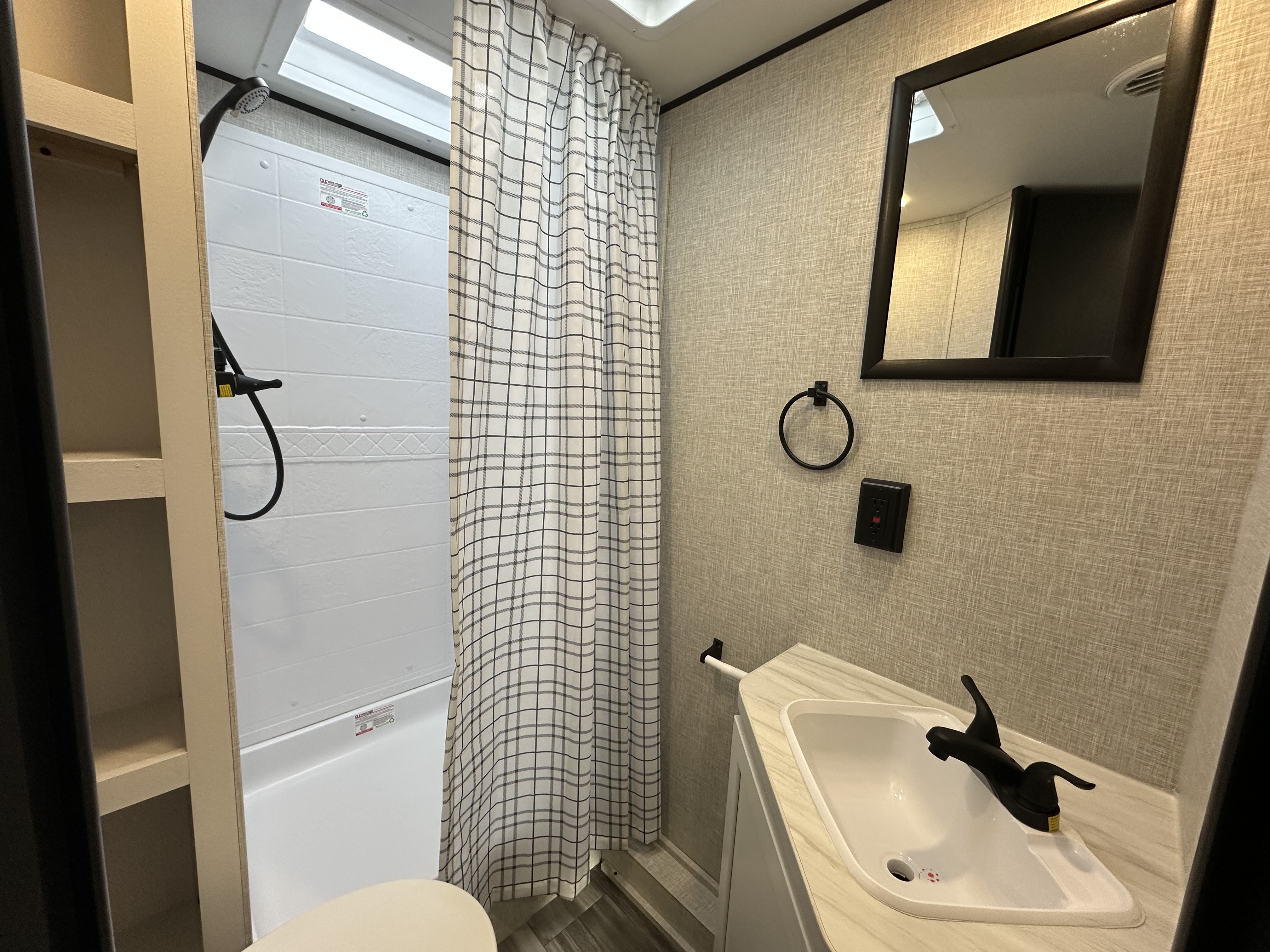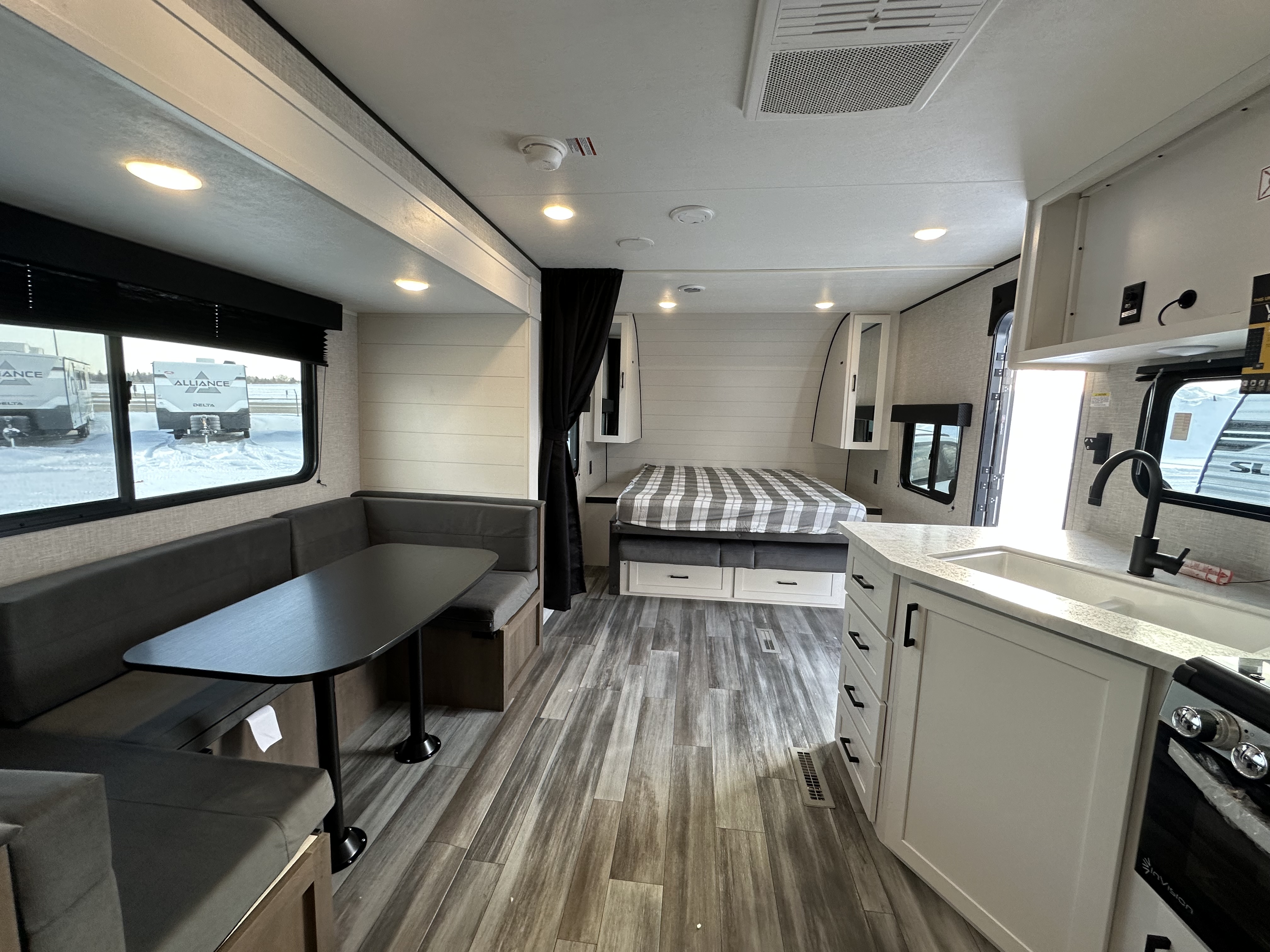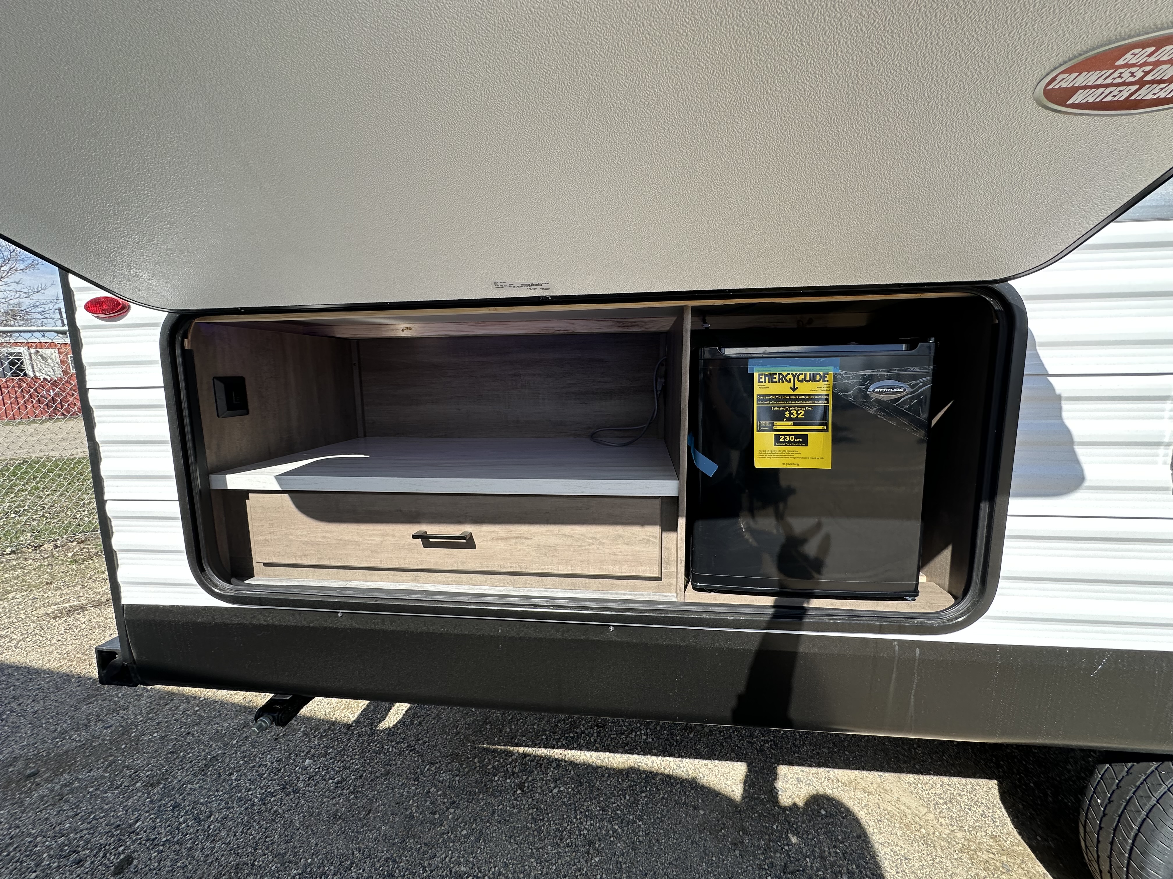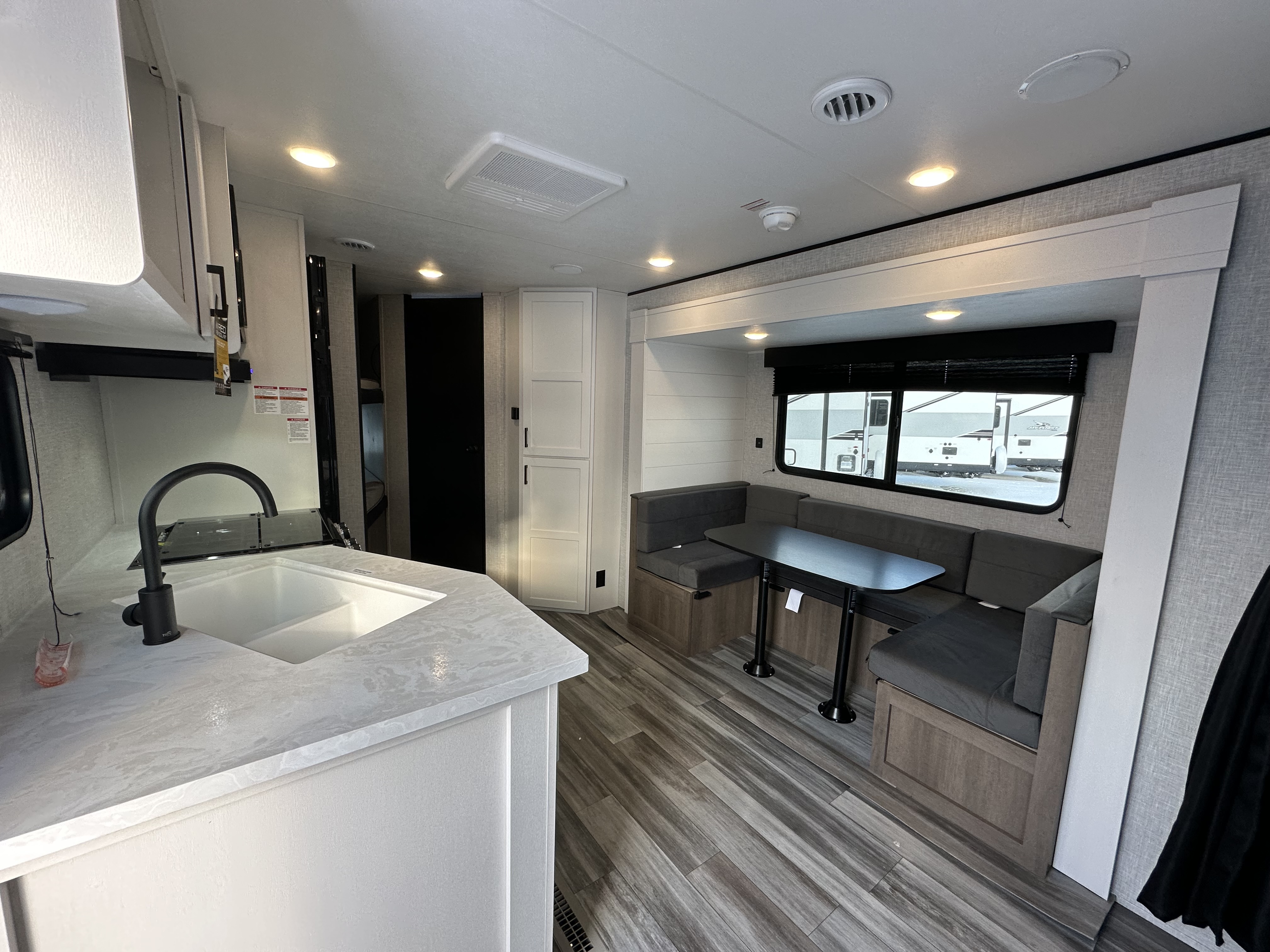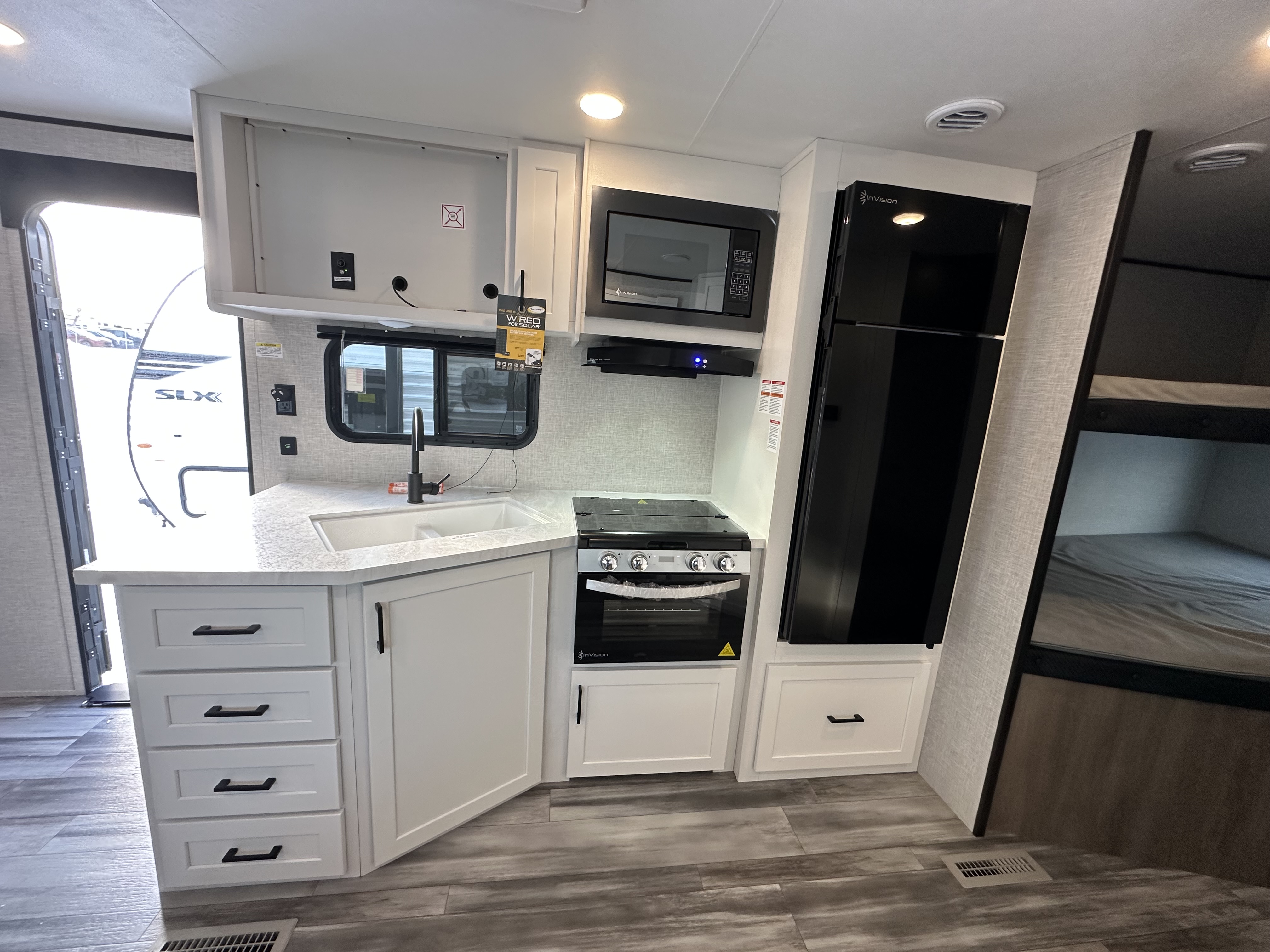 Inside, the Jay Flight SLX boasts some luxe residential features. Solid hardwood cabinet doors and drawers, with hidden cabinet hinges, offer a modern and sleek look. We continue to keep our owner's needs at the top of our mind, by offering oversized cabinets for increased storage space. In addition, you'll find maximized storage underneath the bed or bunk beds, under the dinettes, under the jack-knife sofas and even a neatly finished and lit exterior passthrough storage space. And just like our larger units, the Jay Flight SLX comes standard with a 60,000 BTU on-demand tankless water heater, for comfortable water temperatures as needed.