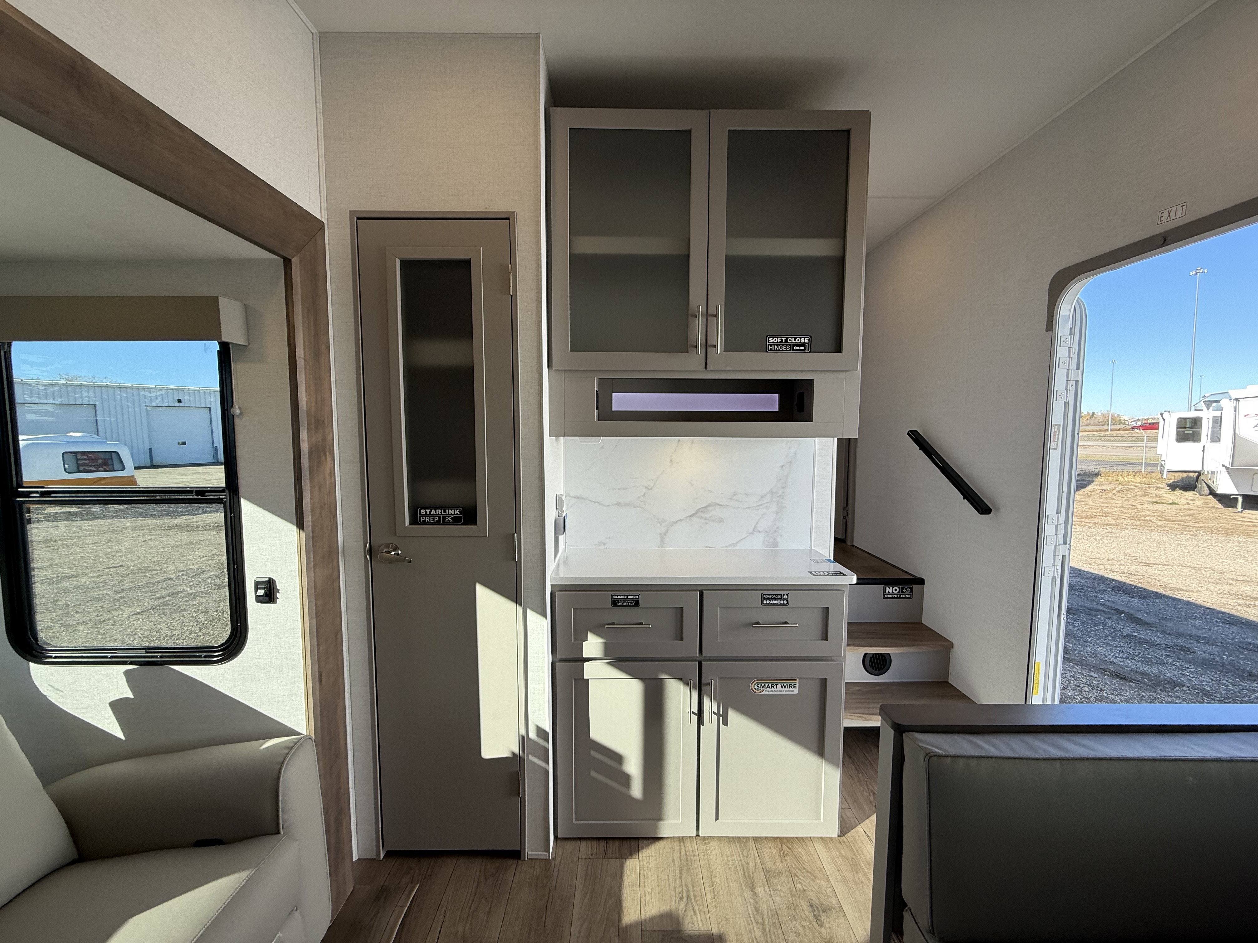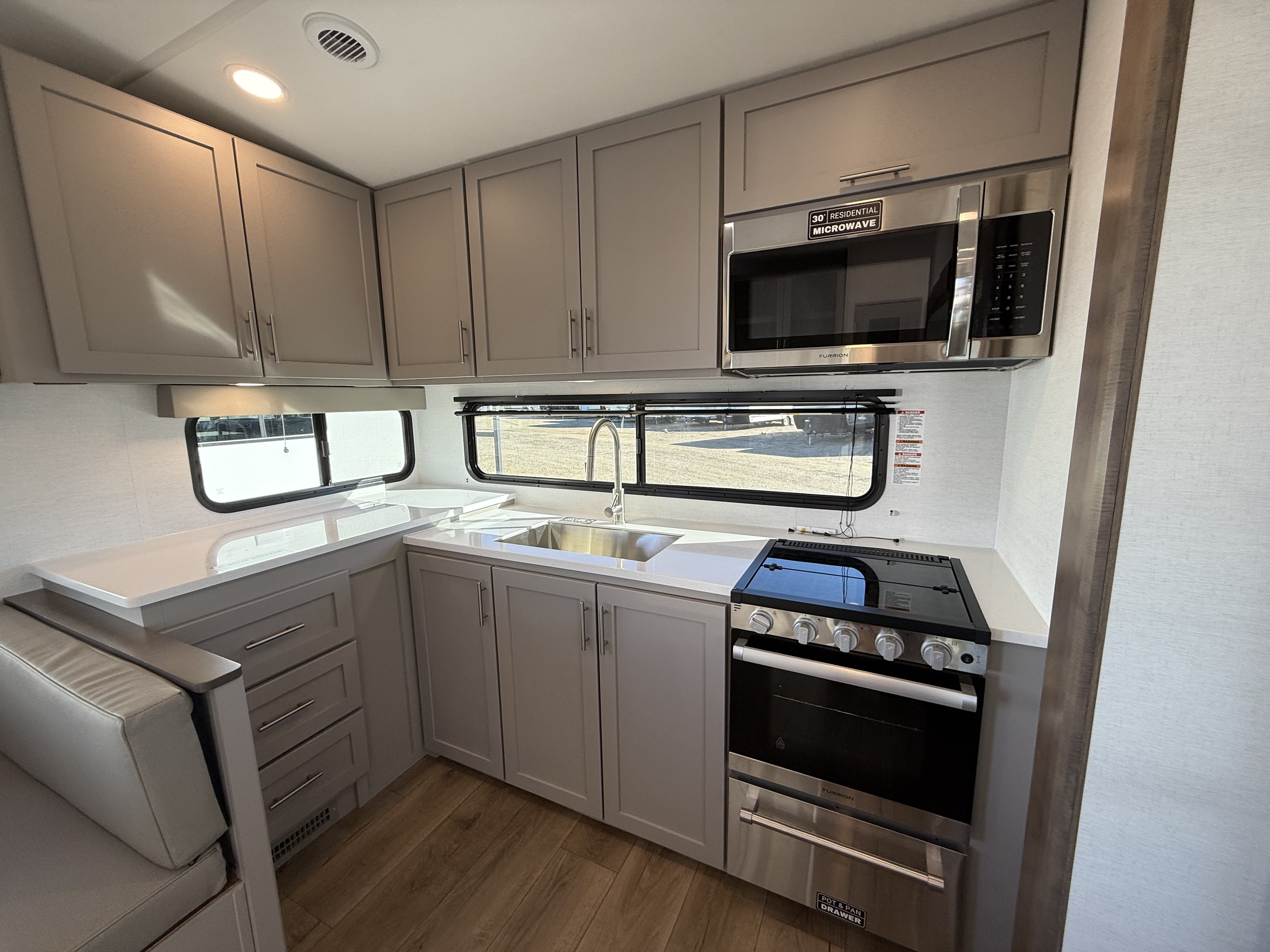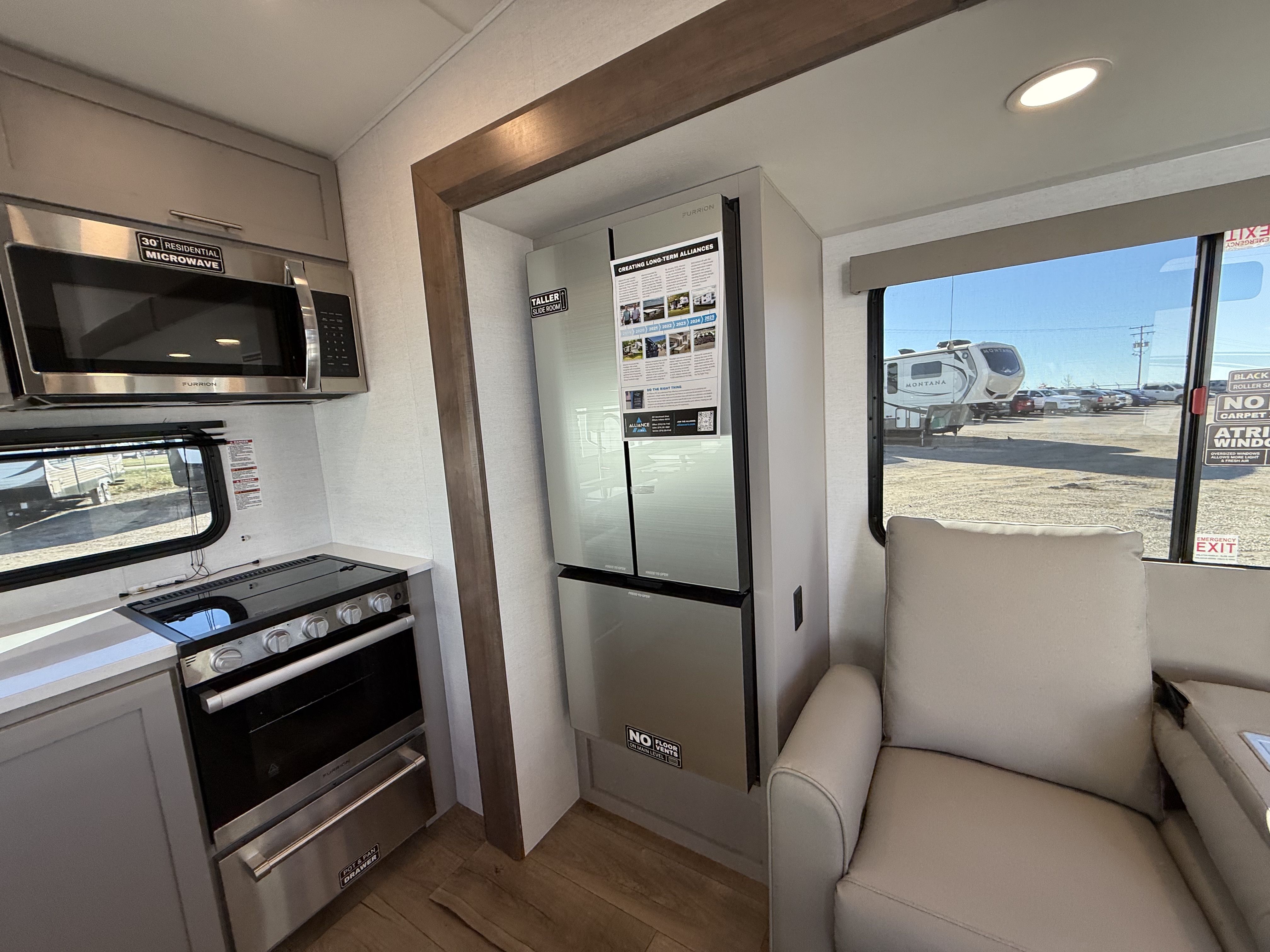 - Well-appointed rear kitchen with a large pantry and a 10 cu. ft. 12V refrigerator