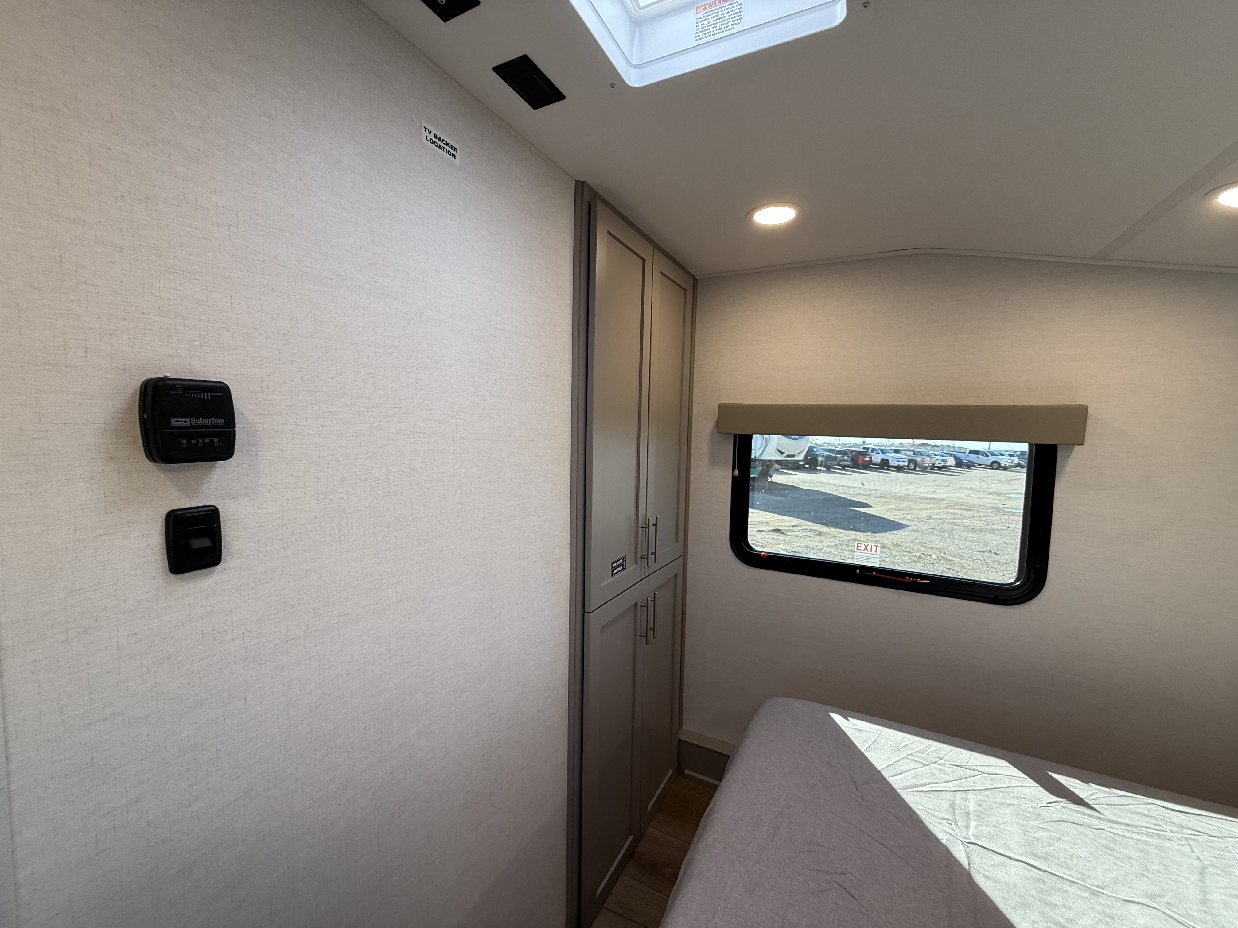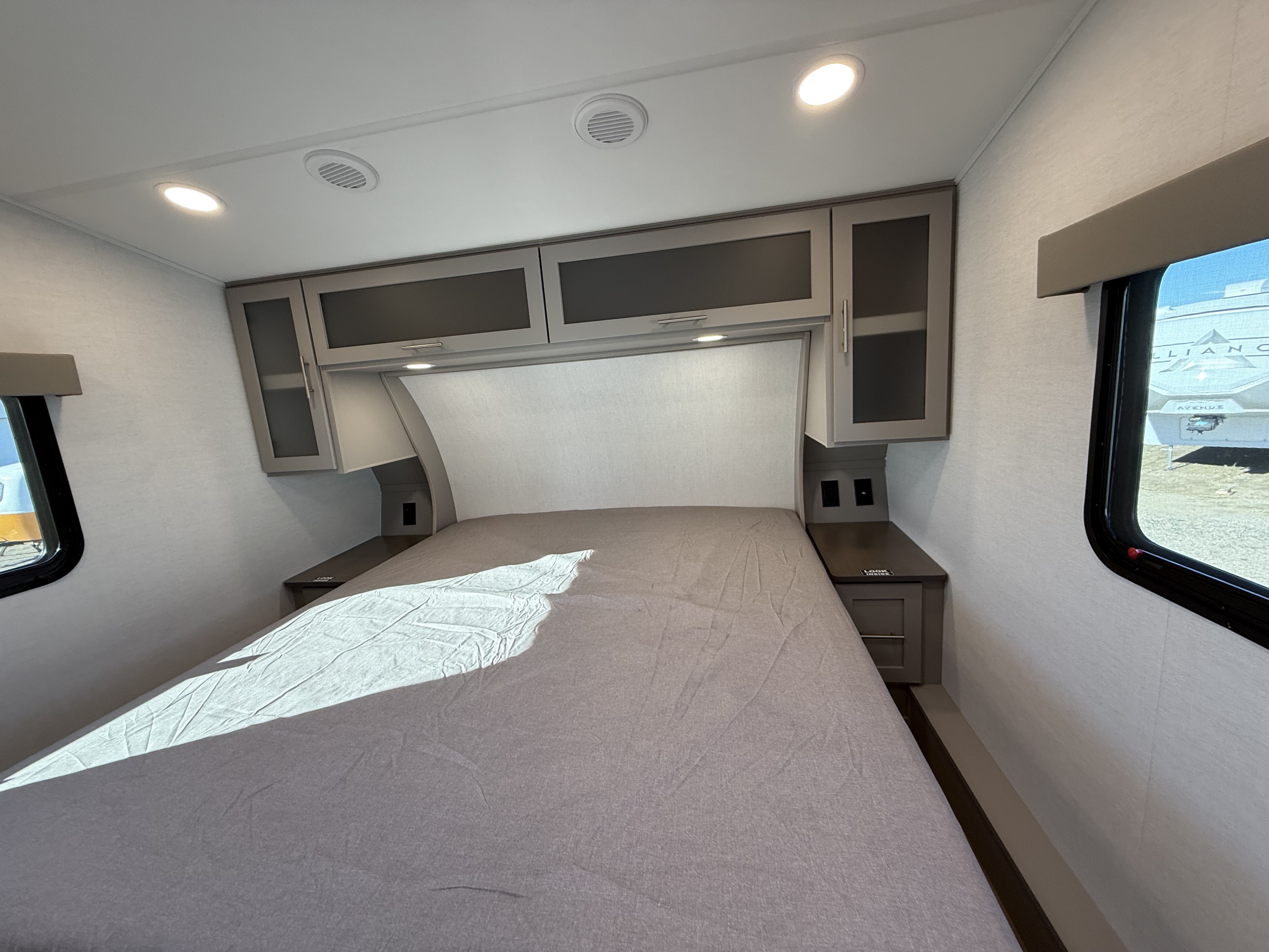 - Queen bed in a private front bedroom with dual nightstands and overhead storage