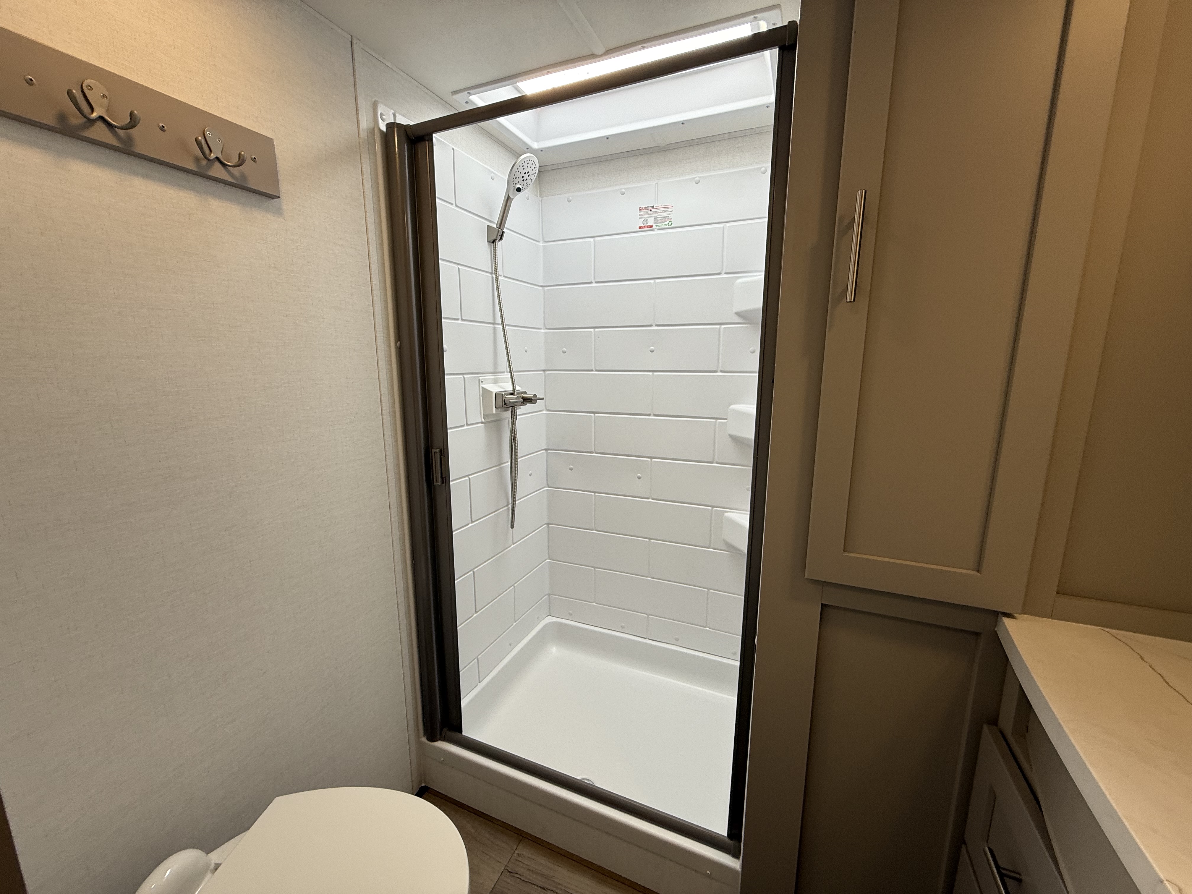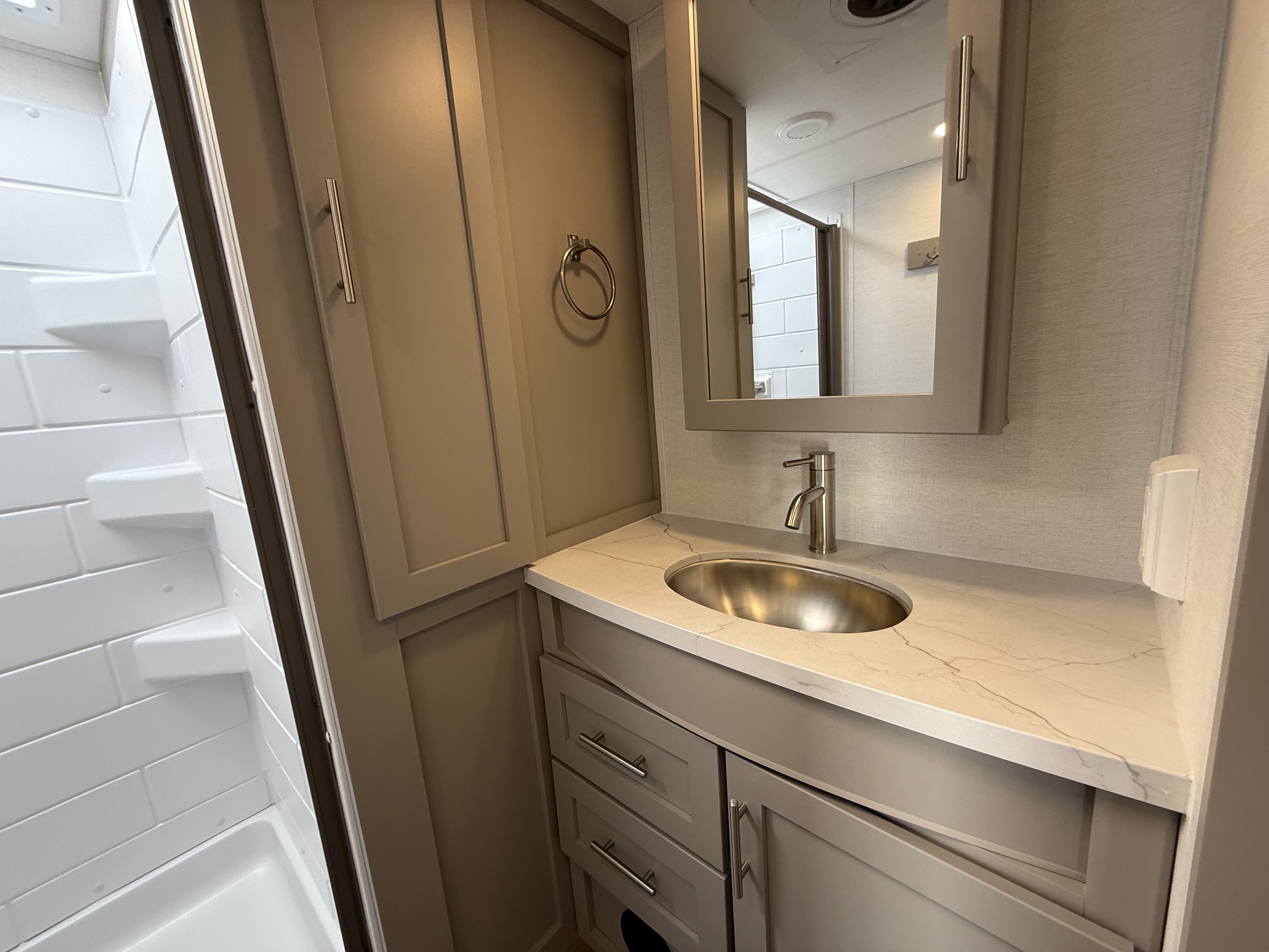 - Side-aisle bathroom featuring a 30" x 36" shower, vanity, and linen storage