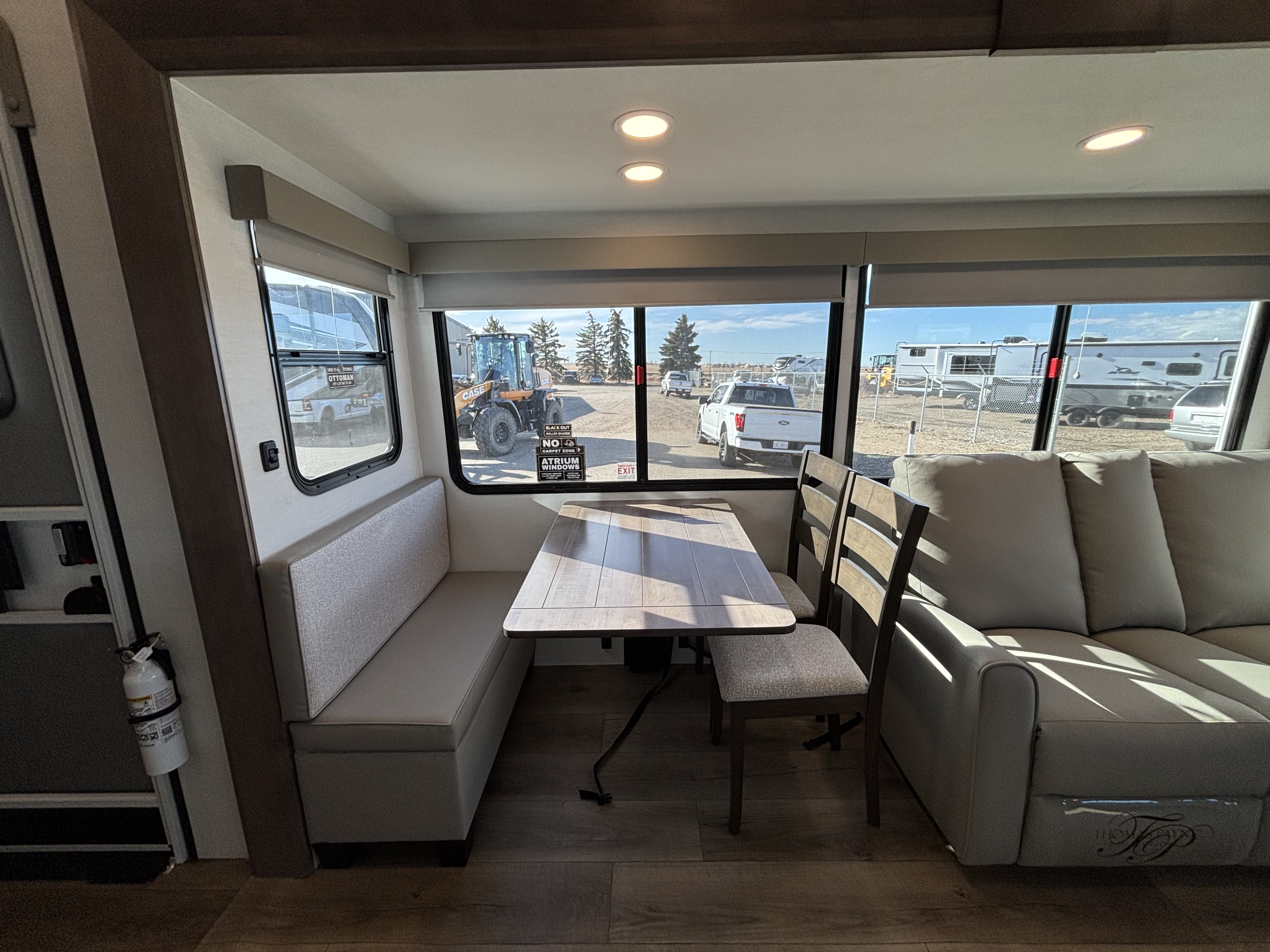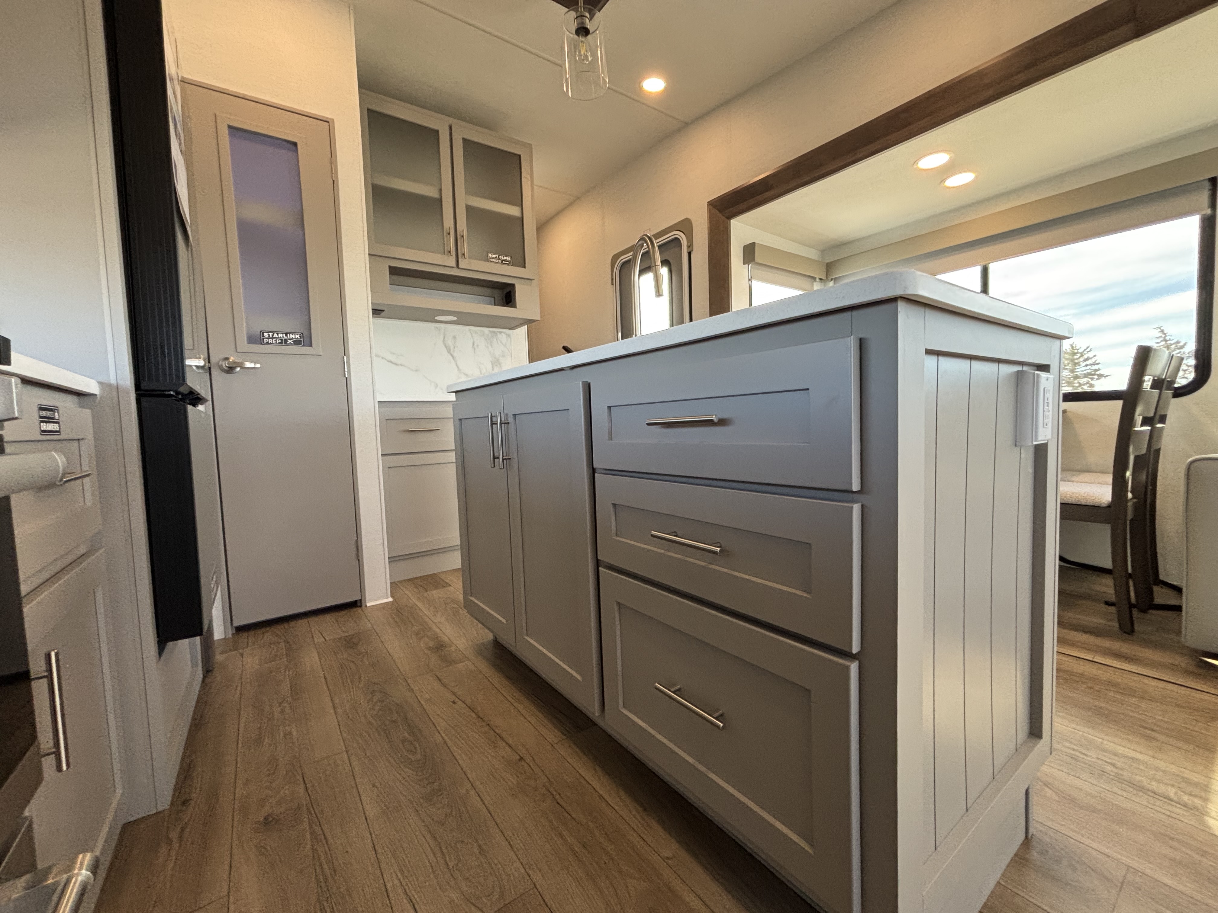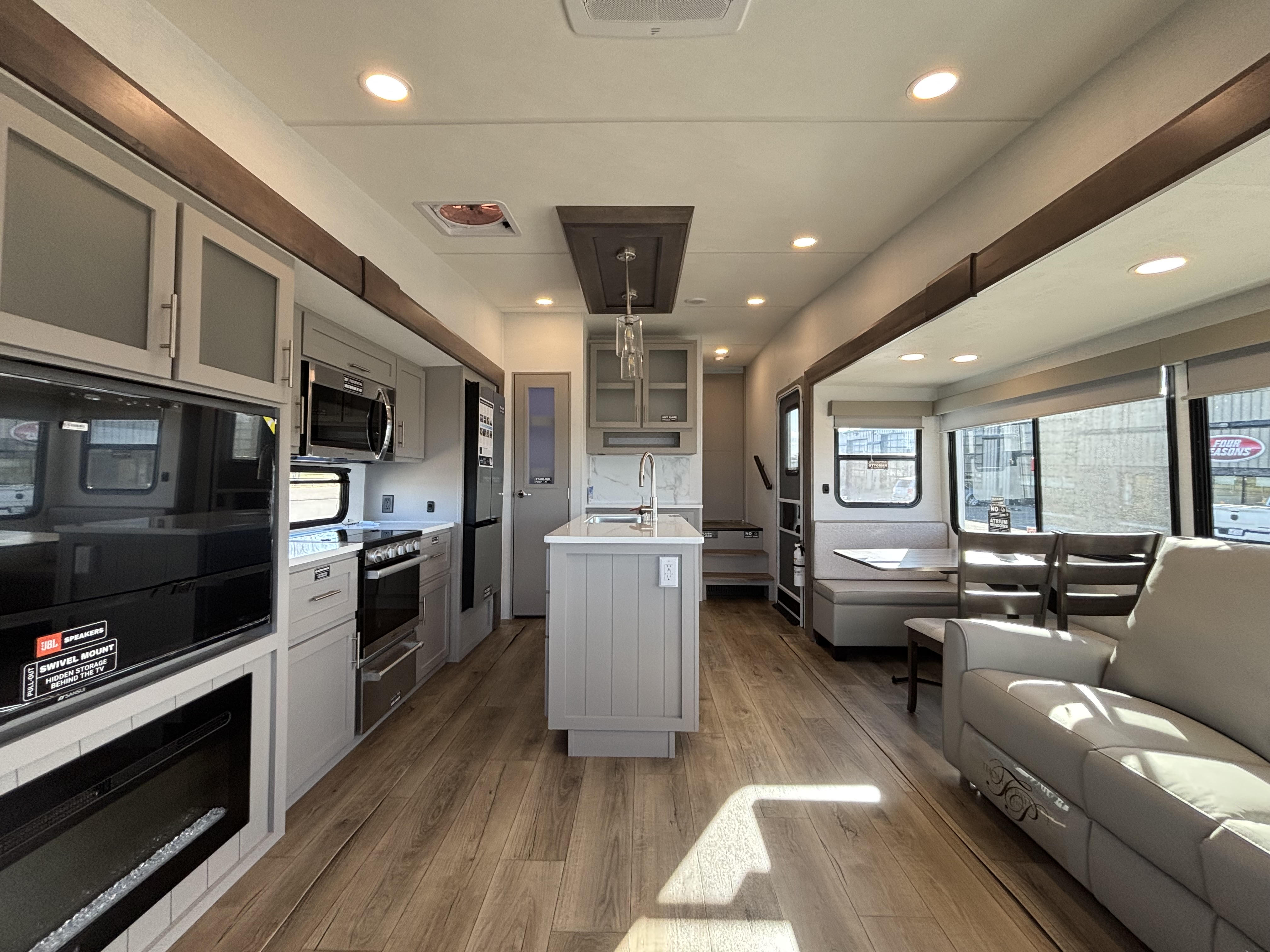 The kitchen is designed for ease, with a 10 cu. ft. 12V refrigerator, a three-burner cooktop, and a kitchen island for extra counter space. Enjoy meals at the floating dinette with two chairs, and utilize the pantry and hutch for storing dishes and supplies. The living area is equipped with dual recliner theater seats facing a 50" swing mount HDTV, with hidden storage behind.