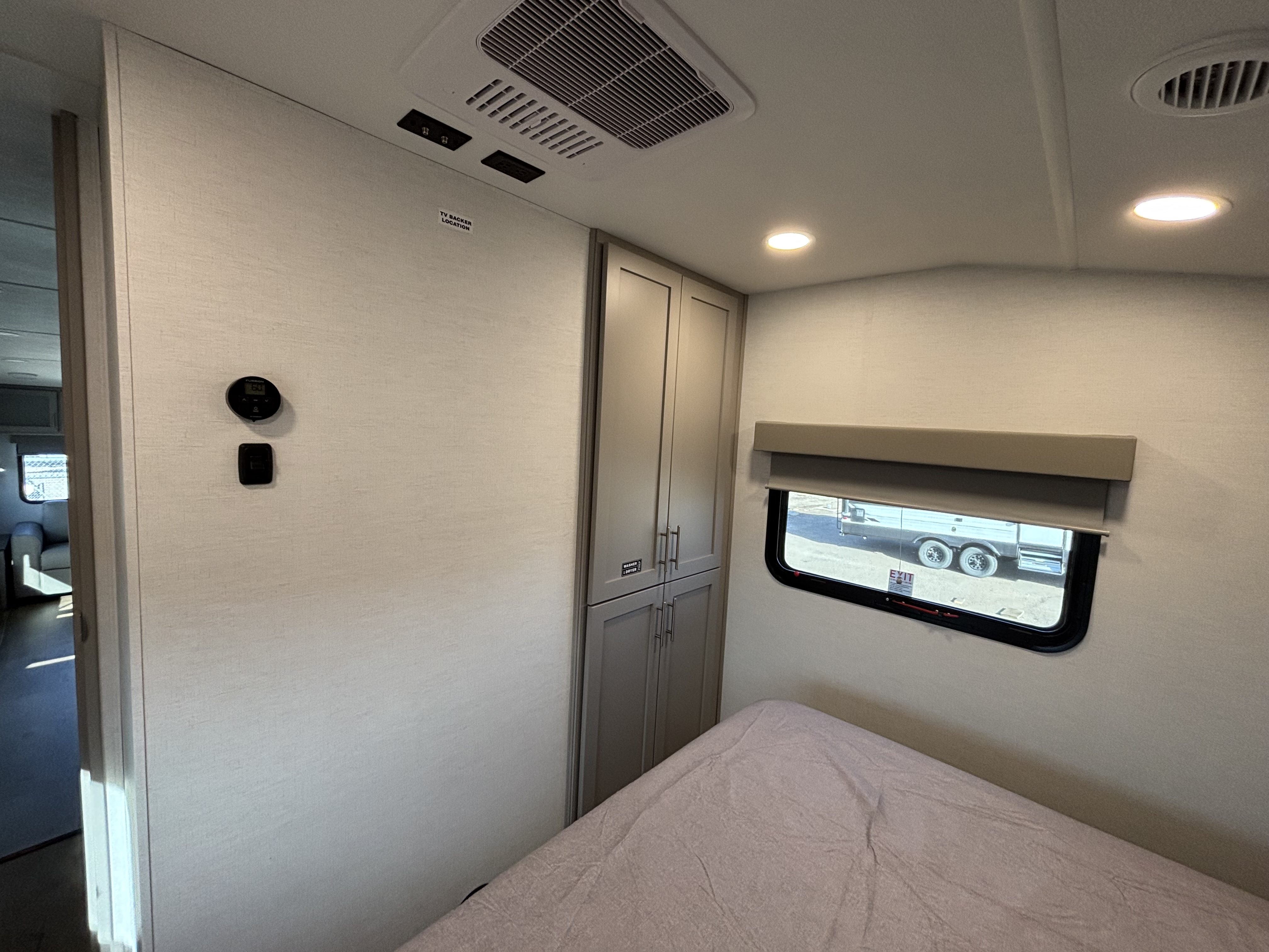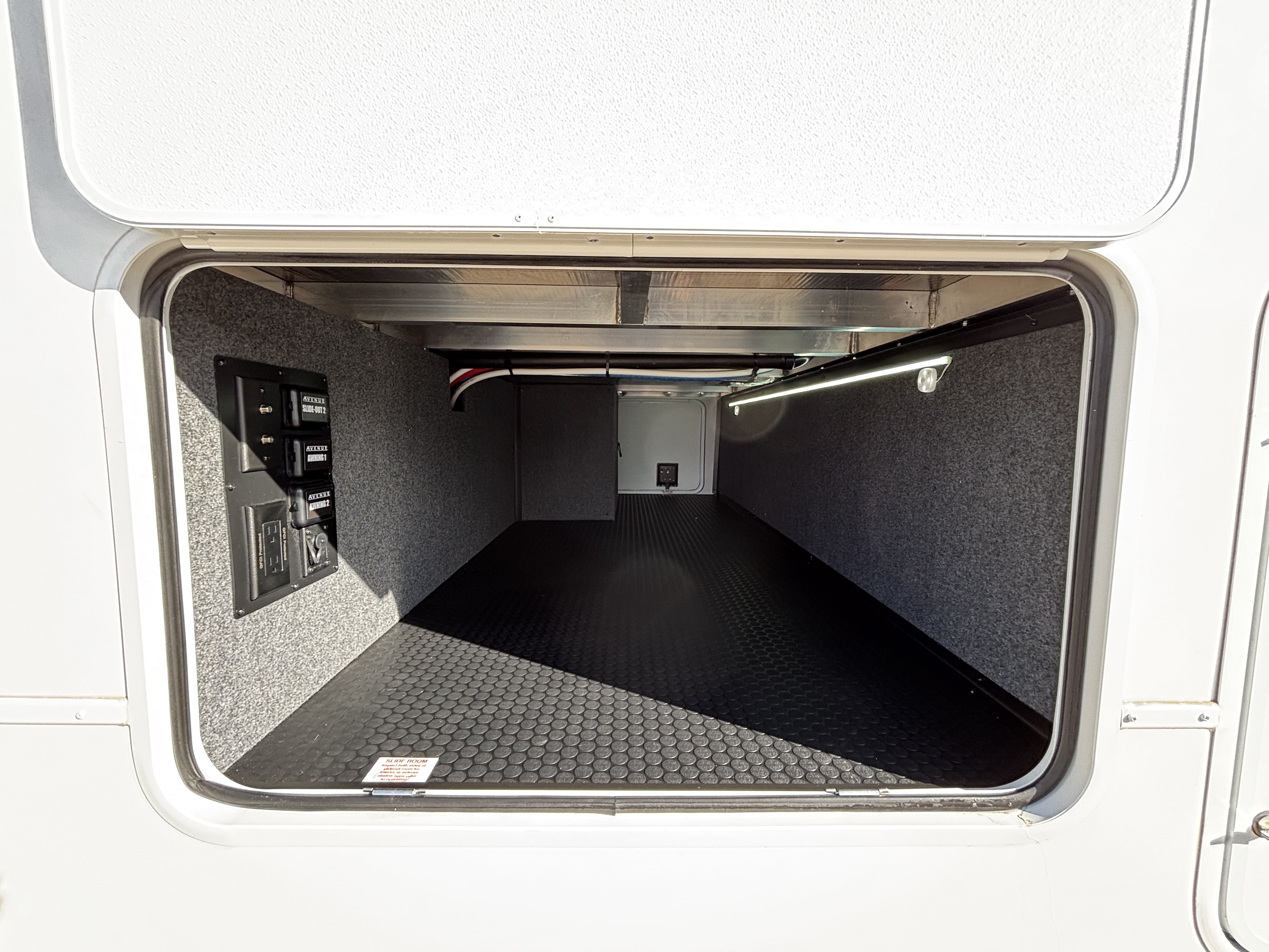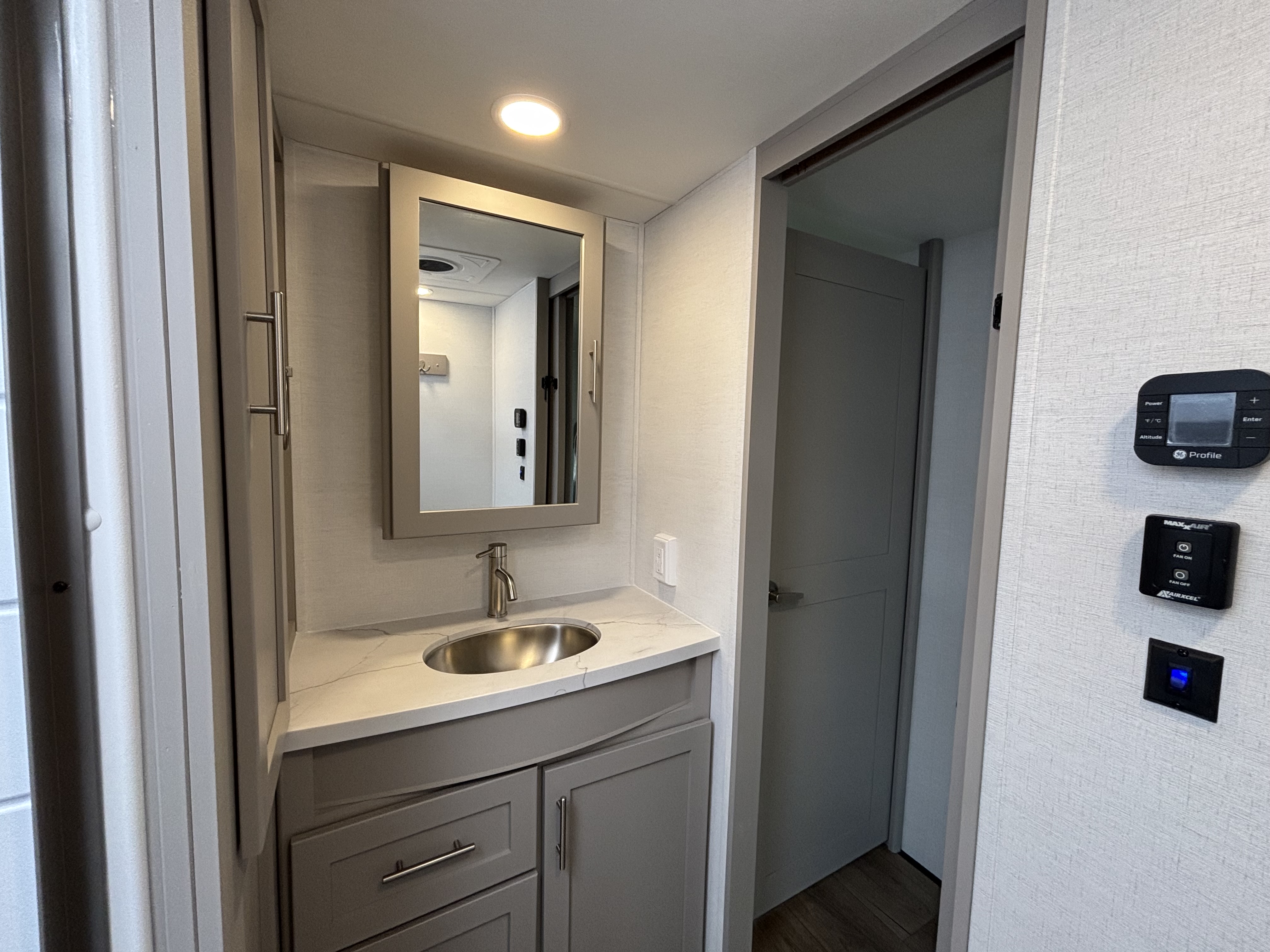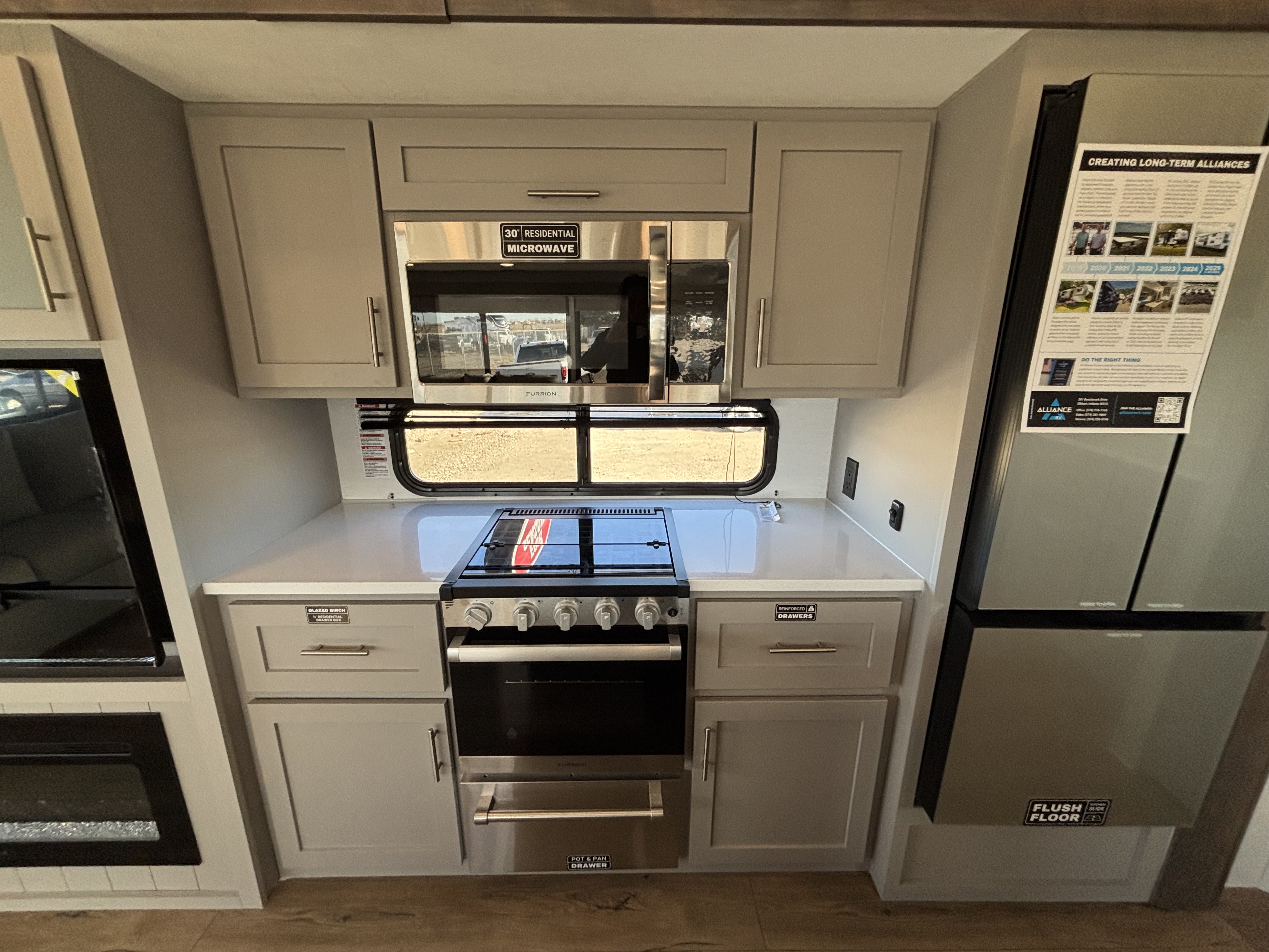 The kitchen is designed for ease, with a 10 cu. ft. 12V refrigerator, a three-burner cooktop, and a kitchen island for extra counter space. Enjoy meals at the floating dinette with two chairs, and utilize the pantry and hutch for storing dishes and supplies. The living area is equipped with dual recliner theater seats facing a 50" swing mount HDTV, with hidden storage behind.