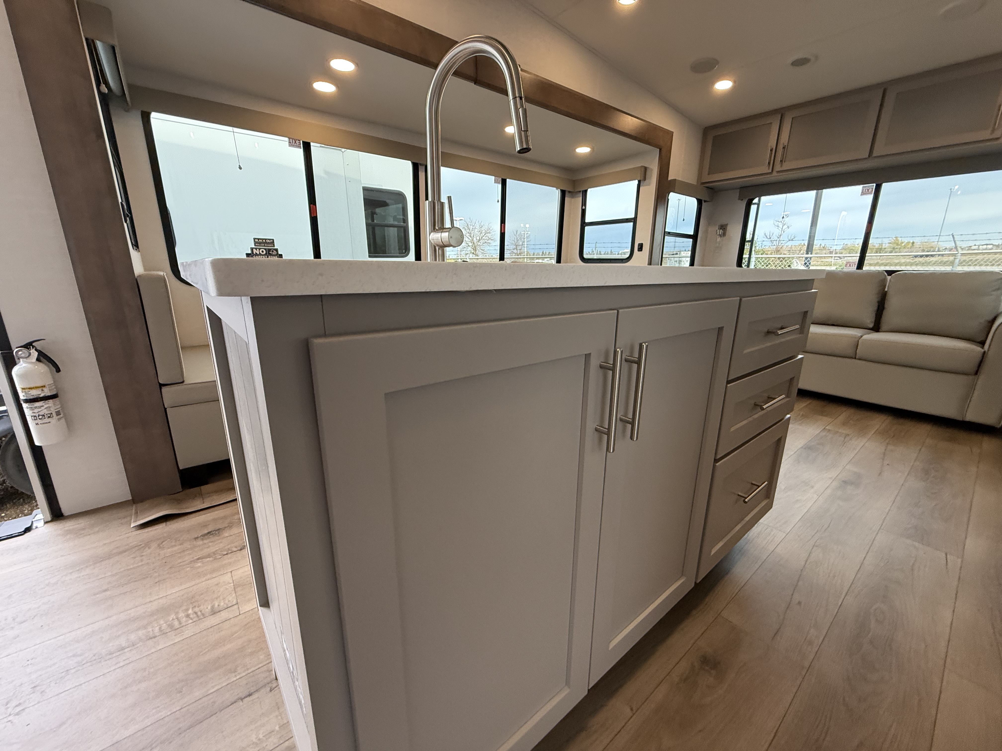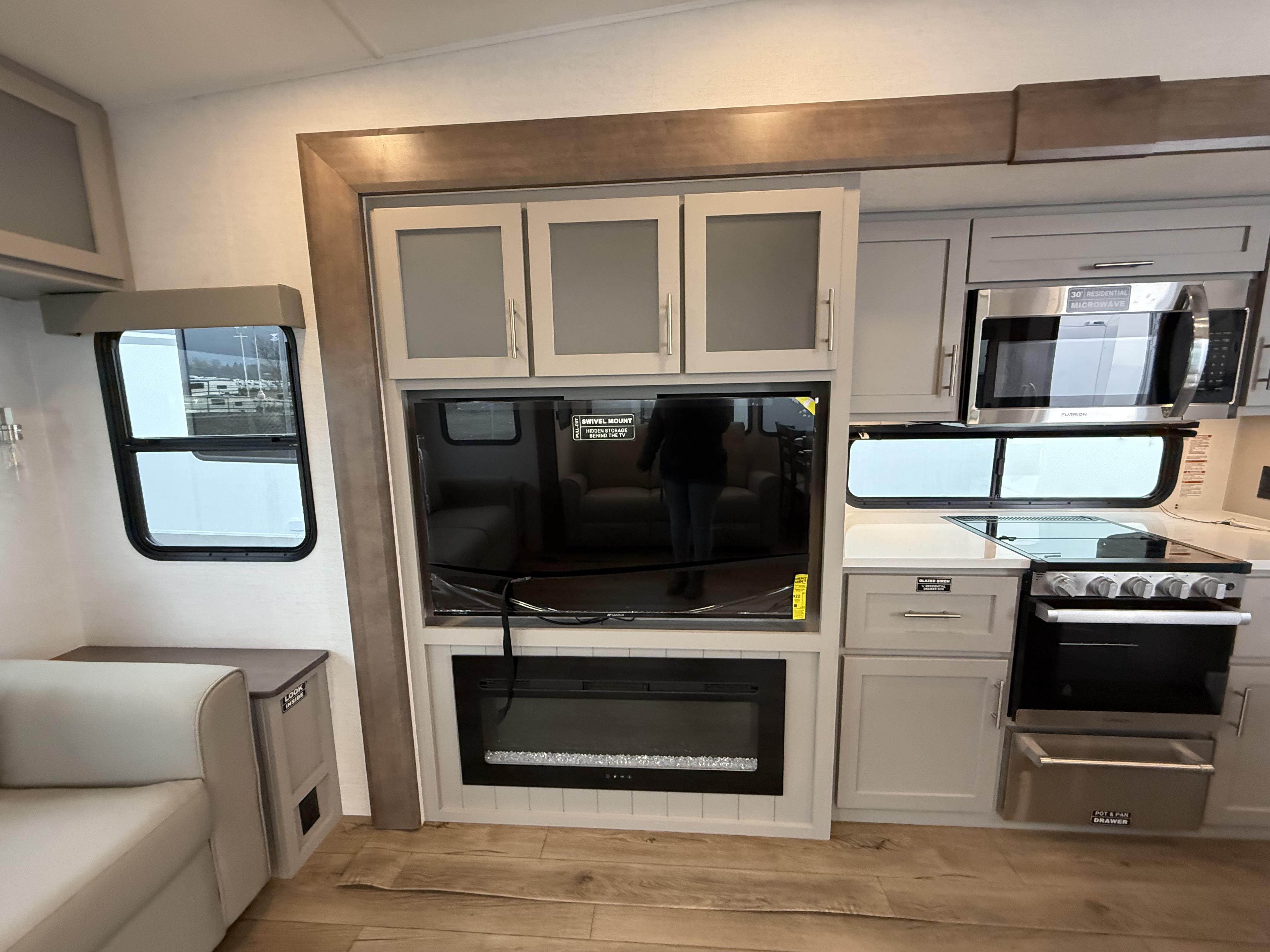 The kitchen is designed for ease, with a 10 cu. ft. 12V refrigerator, a three-burner cooktop, and a kitchen island for extra counter space. Enjoy meals at the floating dinette with two chairs, and utilize the pantry and hutch for storing dishes and supplies. The living area is equipped with dual recliner theater seats facing a 50" swing mount HDTV, with hidden storage behind.