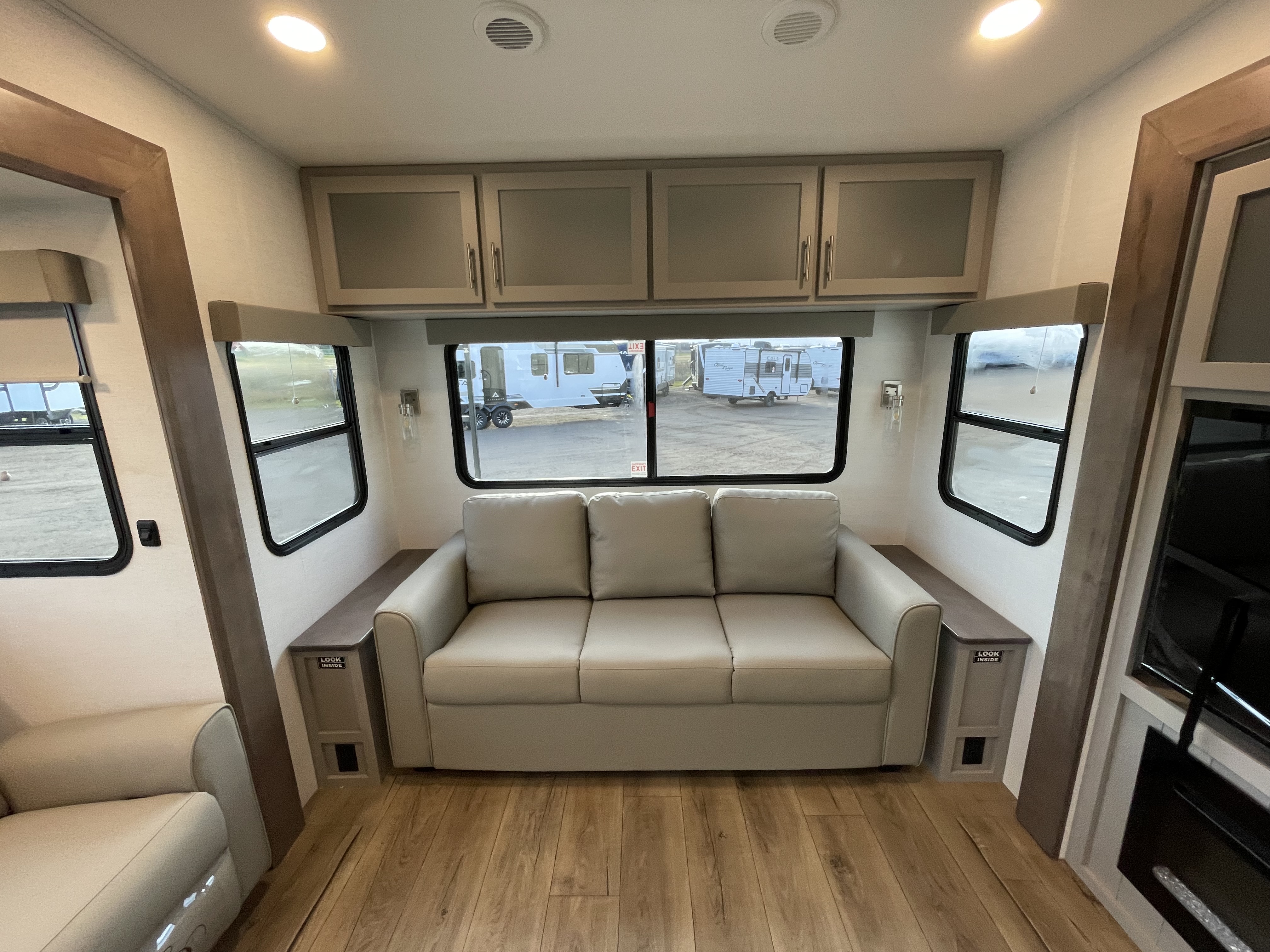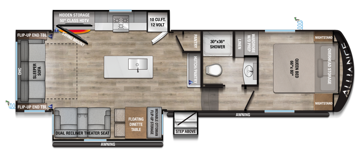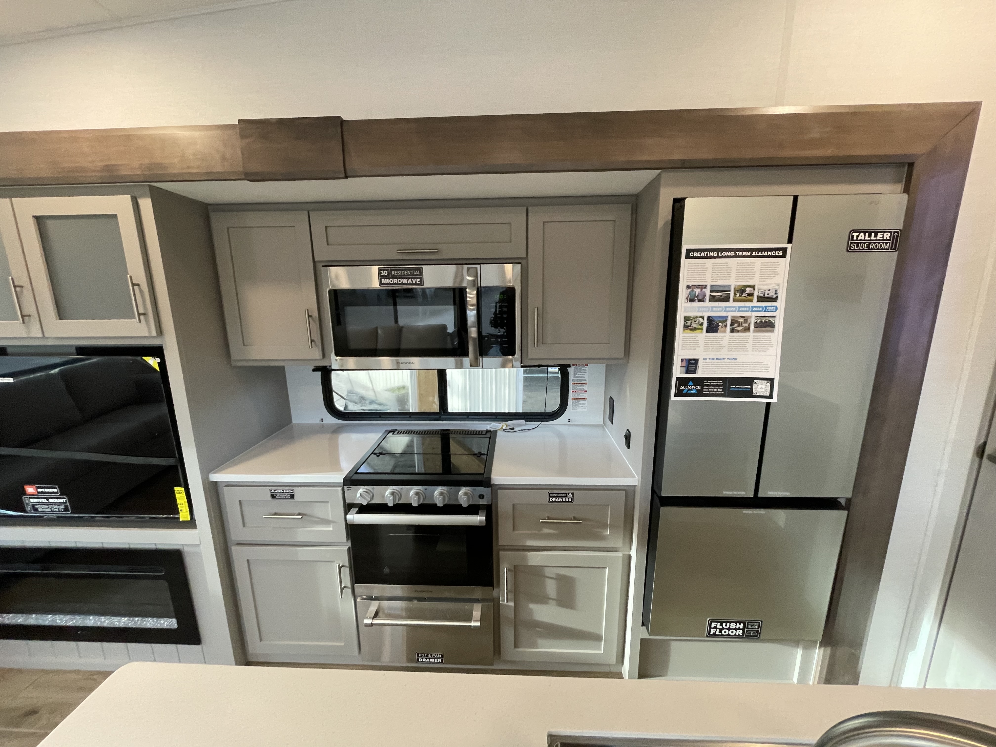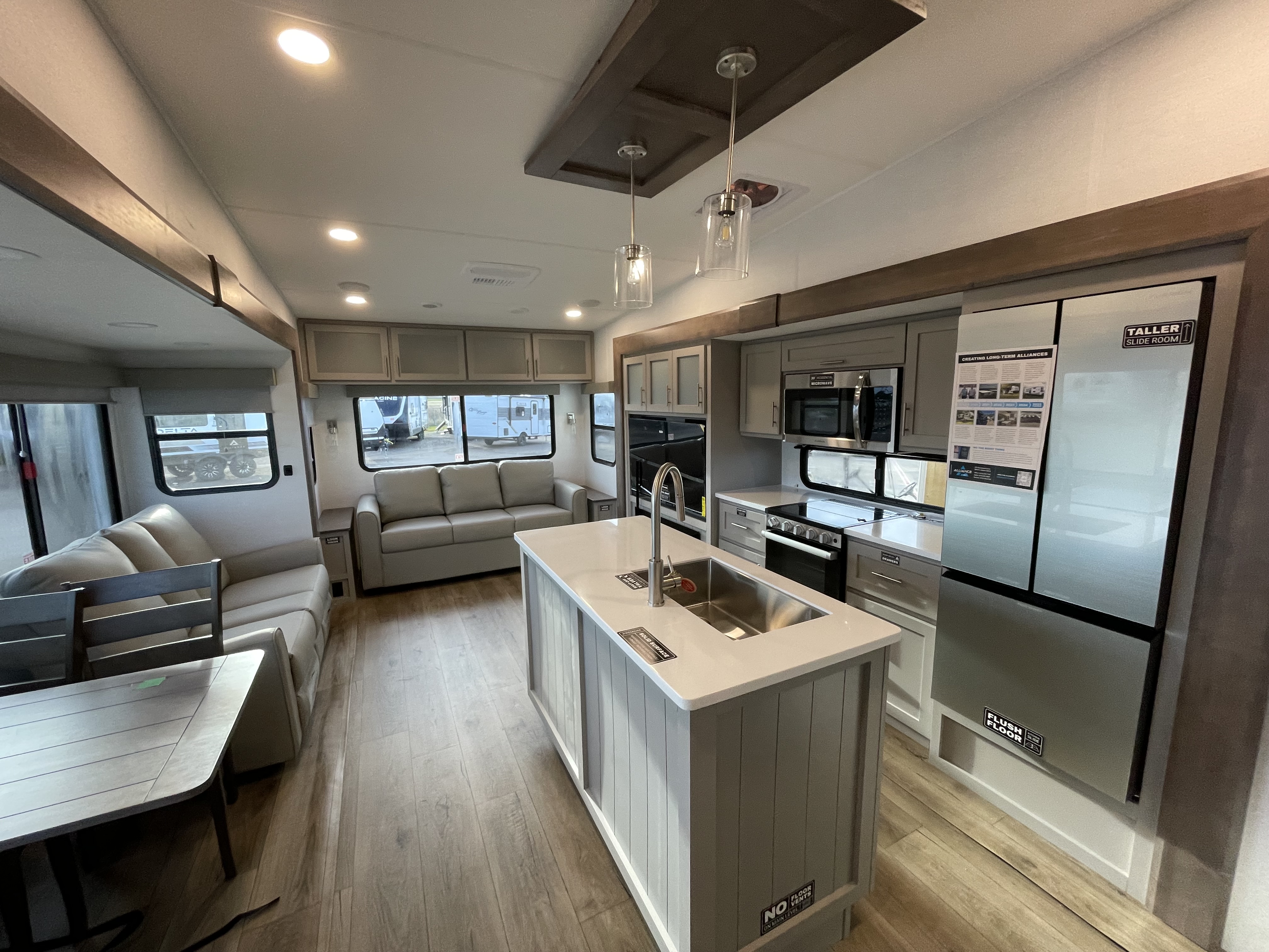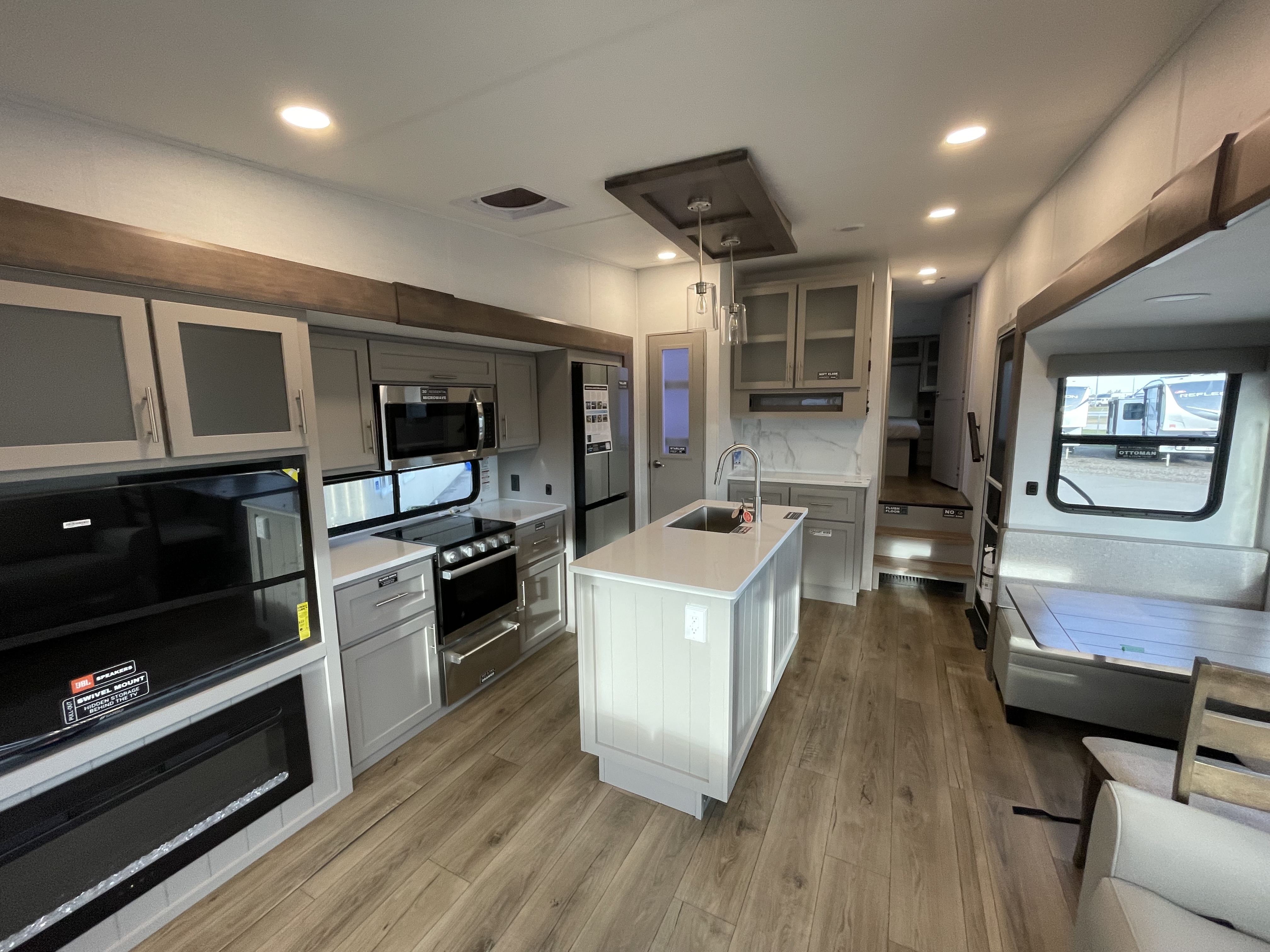 The kitchen is designed for ease, with a 10 cu. ft. 12V refrigerator, a three-burner cooktop, and a kitchen island for extra counter space. Enjoy meals at the floating dinette with two chairs, and utilize the pantry and hutch for storing dishes and supplies. The living area is equipped with dual recliner theater seats facing a 50" swing mount HDTV, with hidden storage behind.