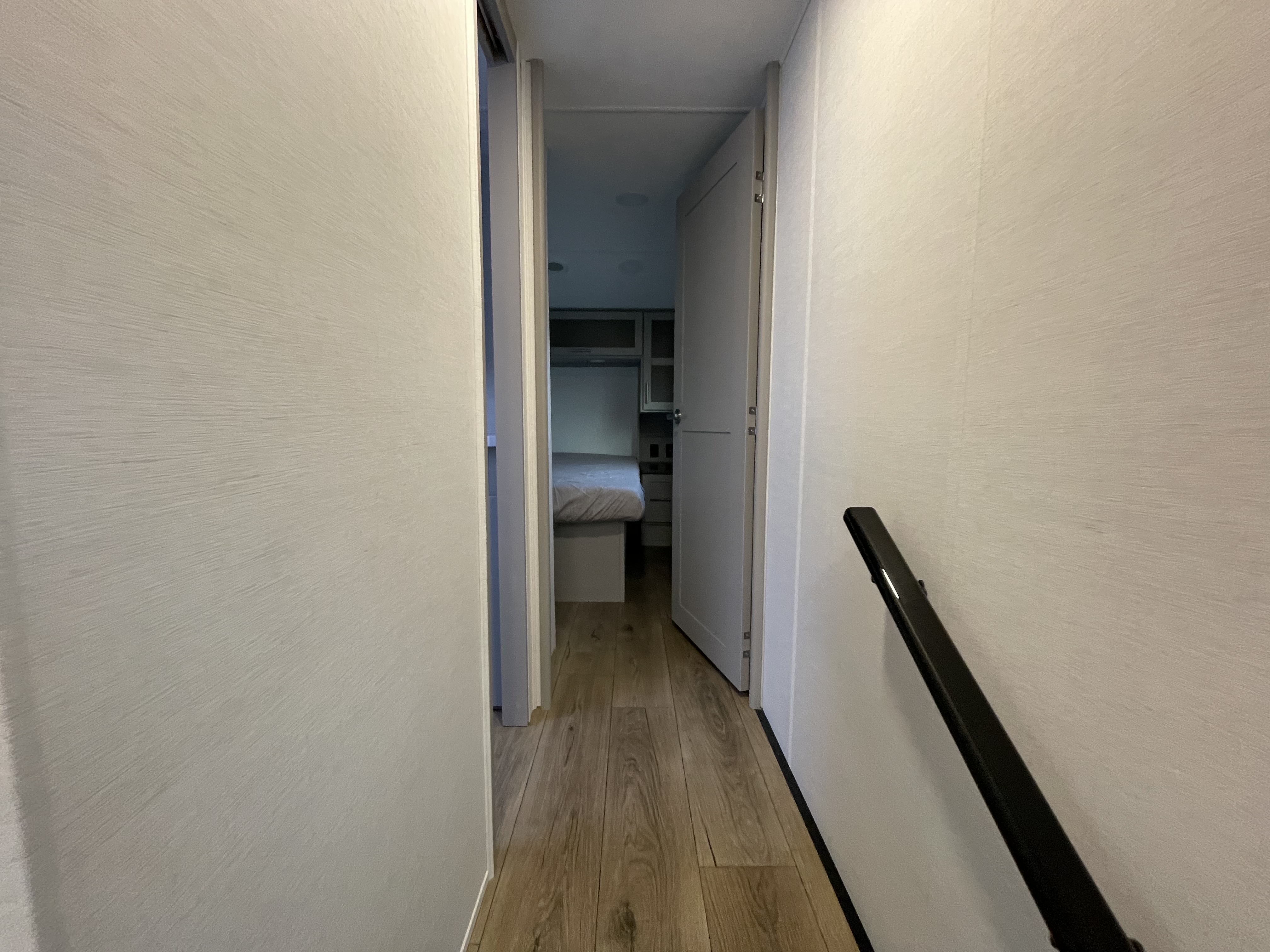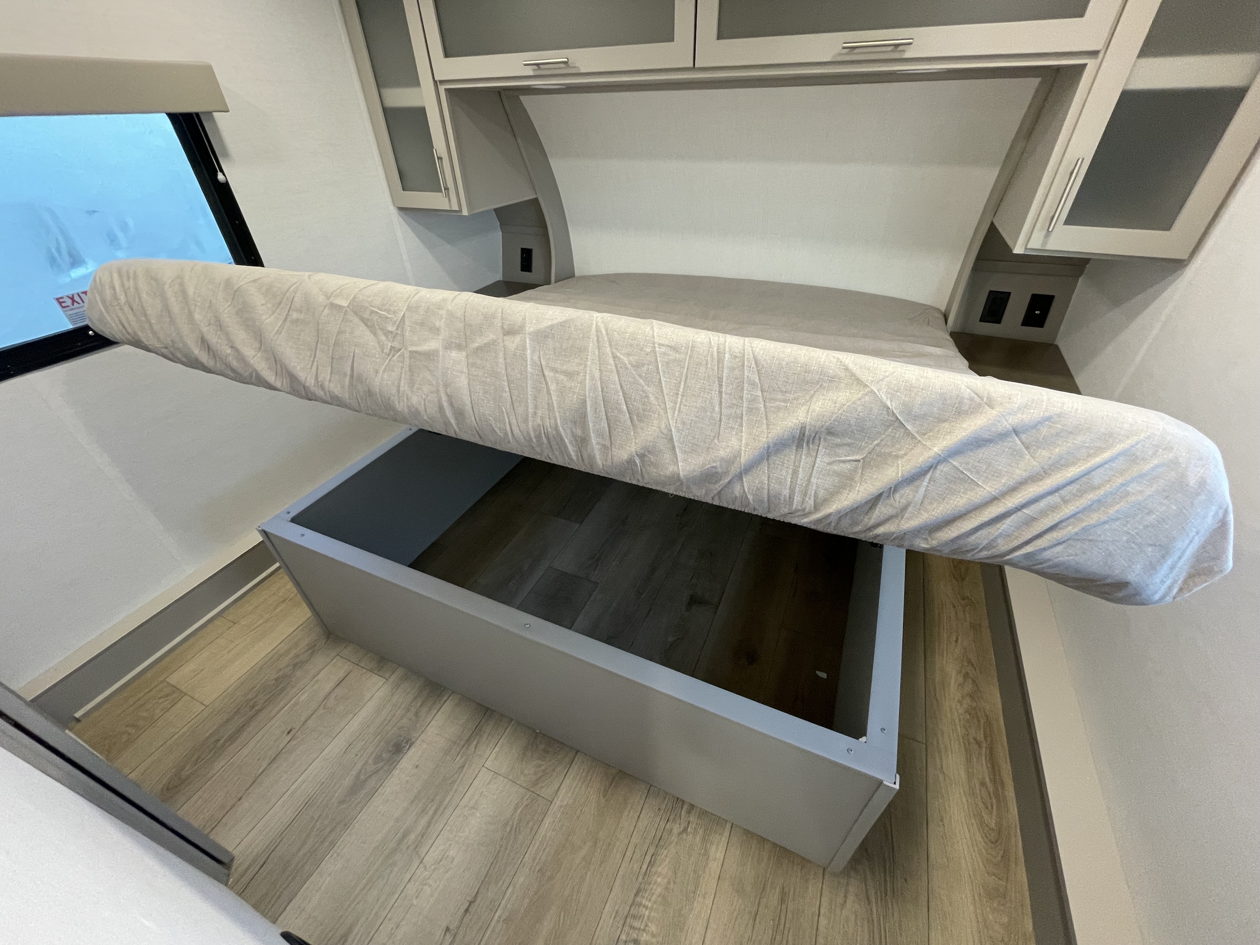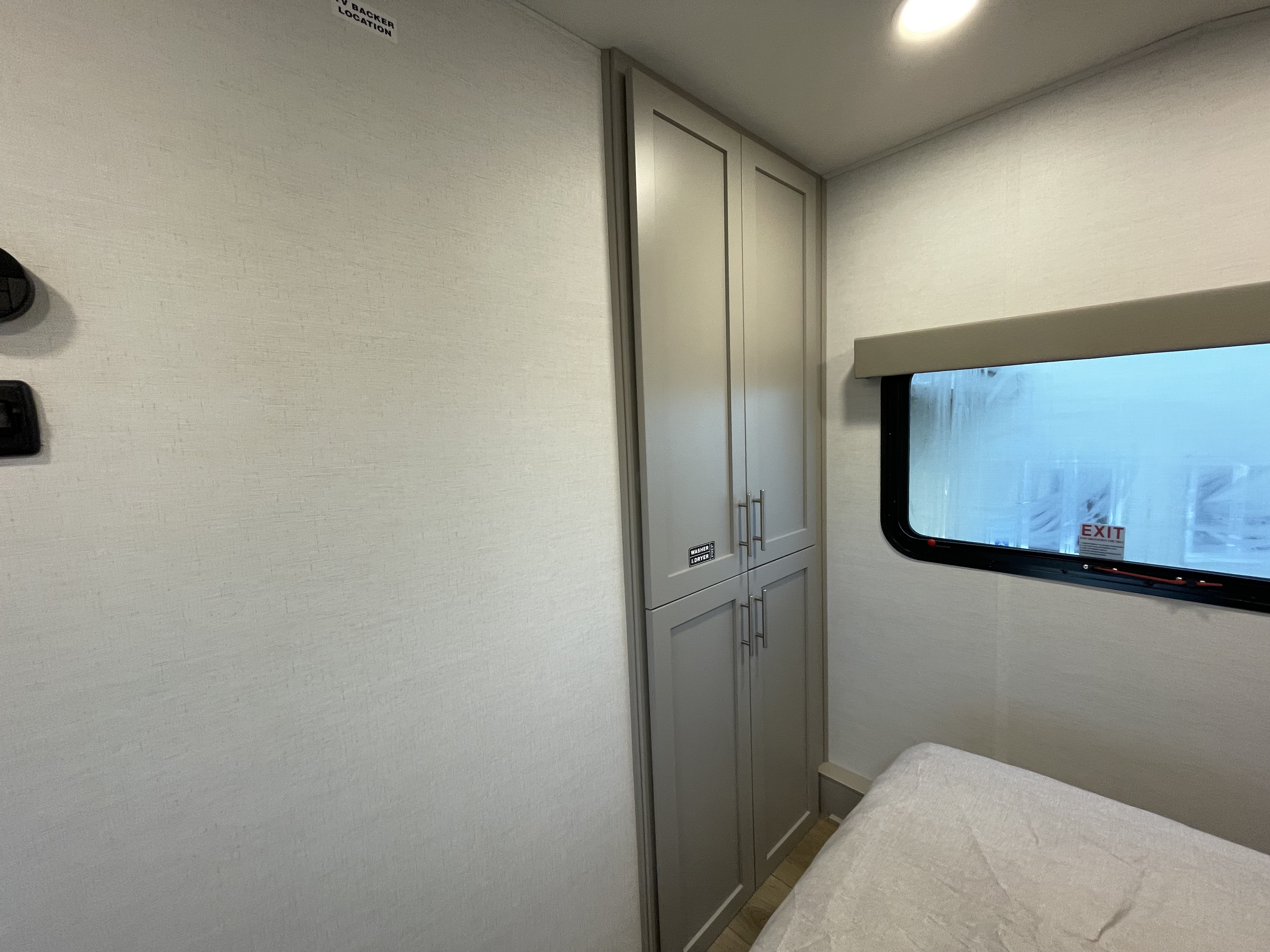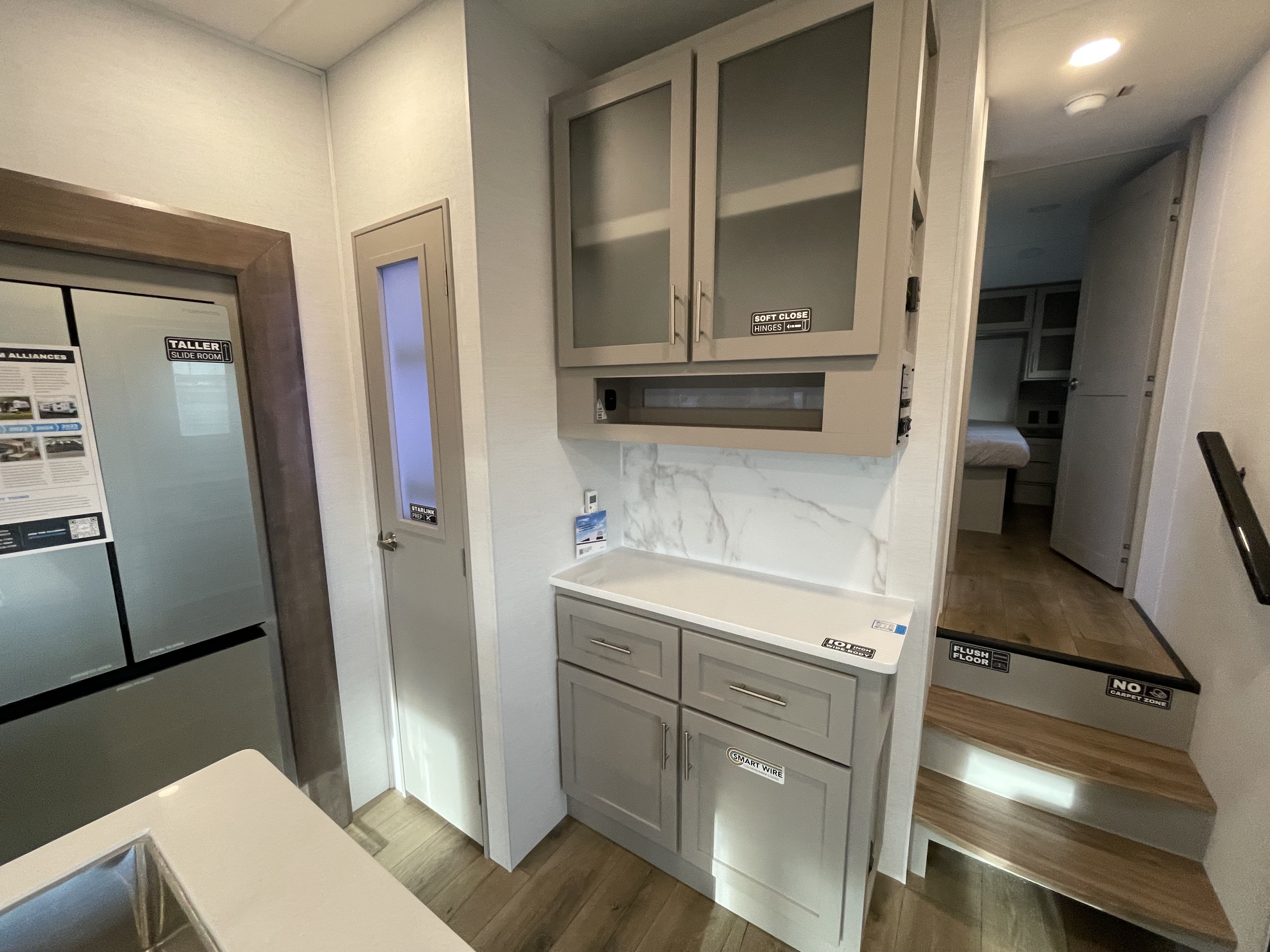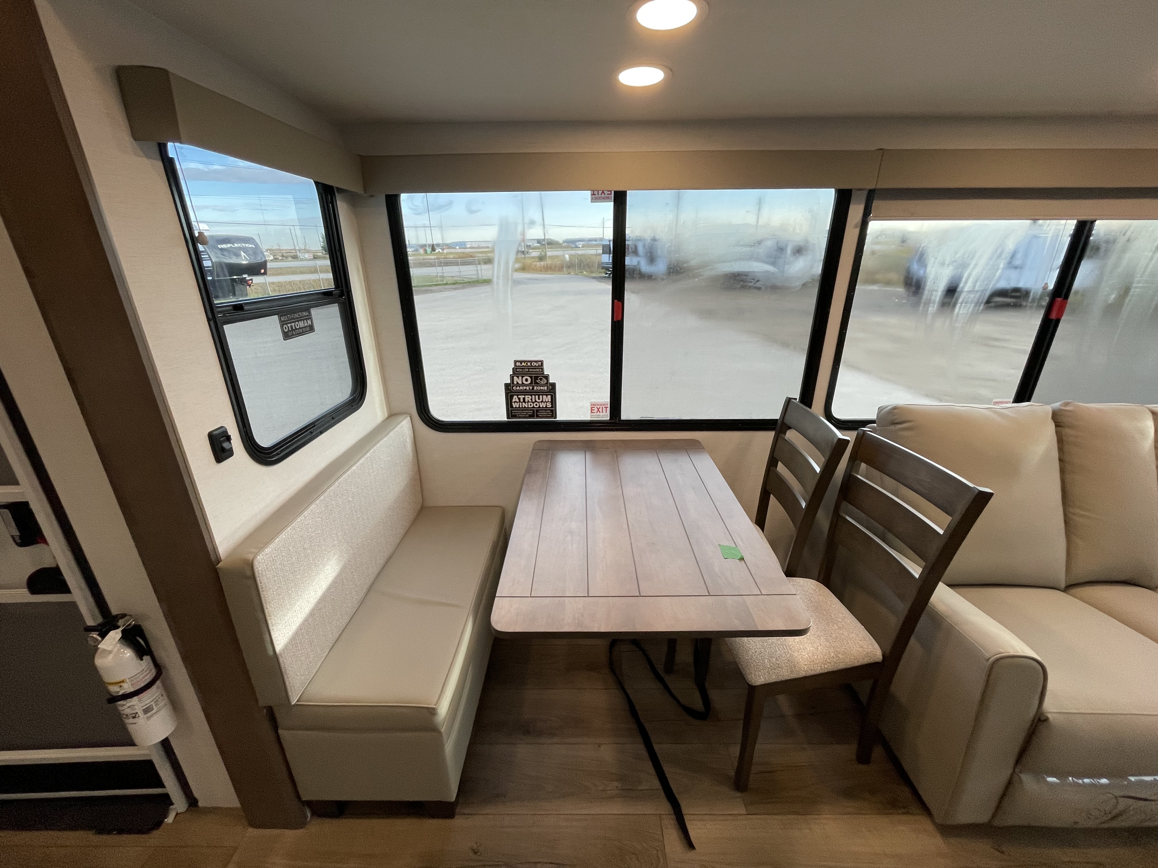 The kitchen is designed for ease, with a 10 cu. ft. 12V refrigerator, a three-burner cooktop, and a kitchen island for extra counter space. Enjoy meals at the floating dinette with two chairs, and utilize the pantry and hutch for storing dishes and supplies. The living area is equipped with dual recliner theater seats facing a 50" swing mount HDTV, with hidden storage behind.