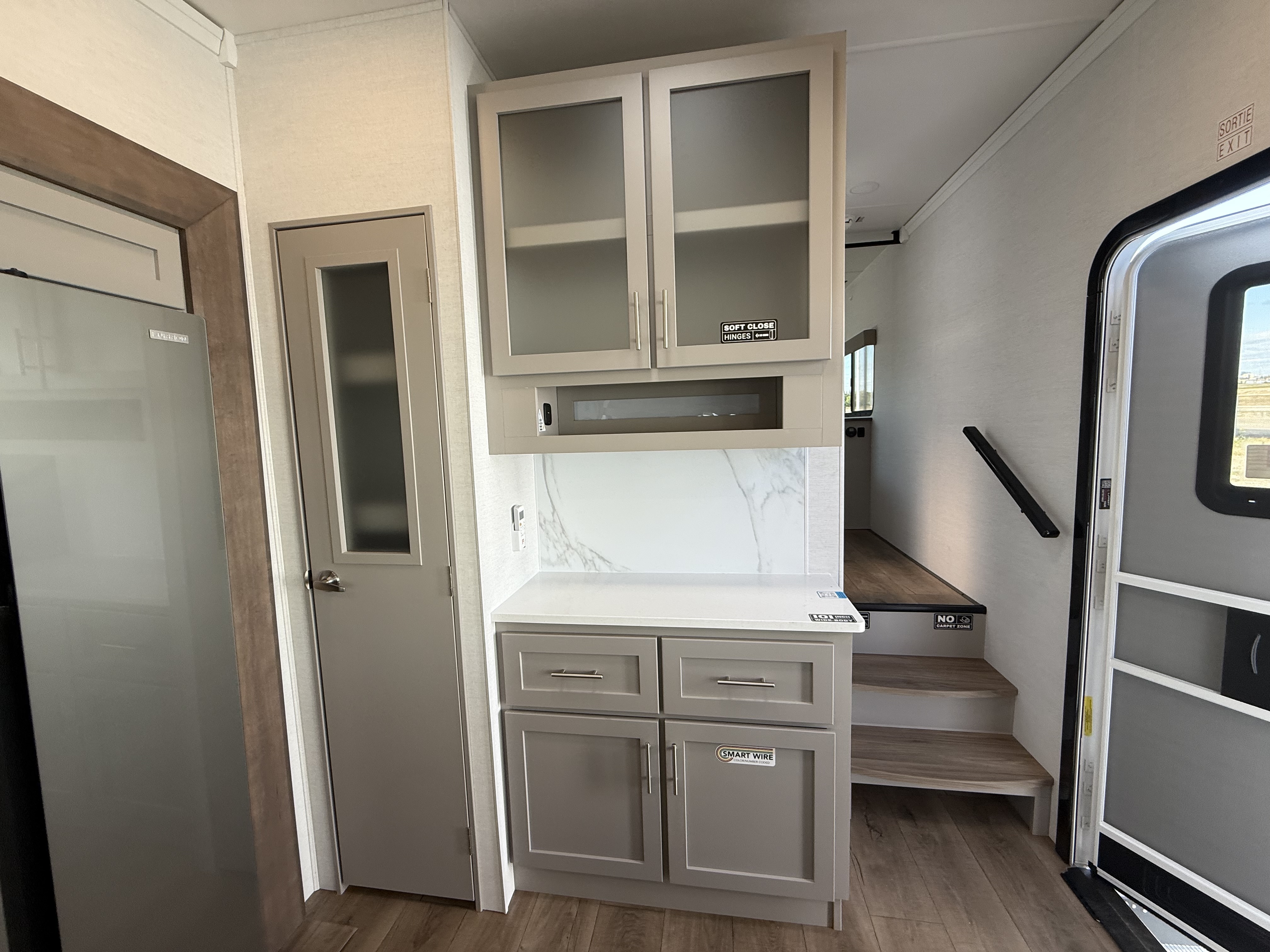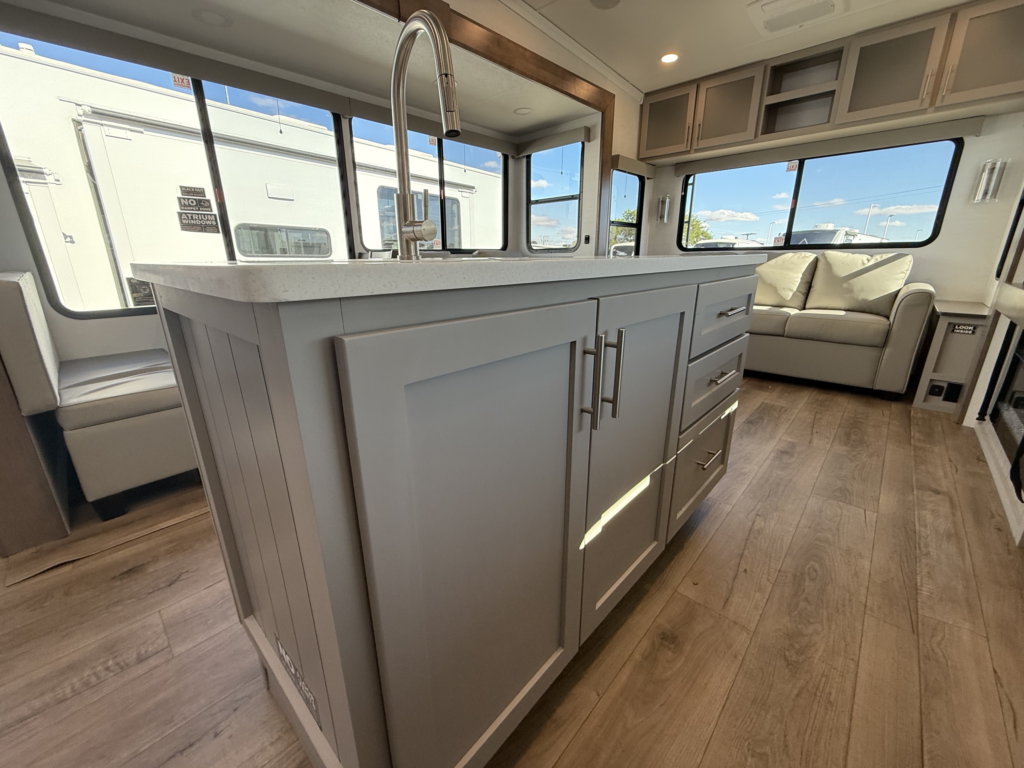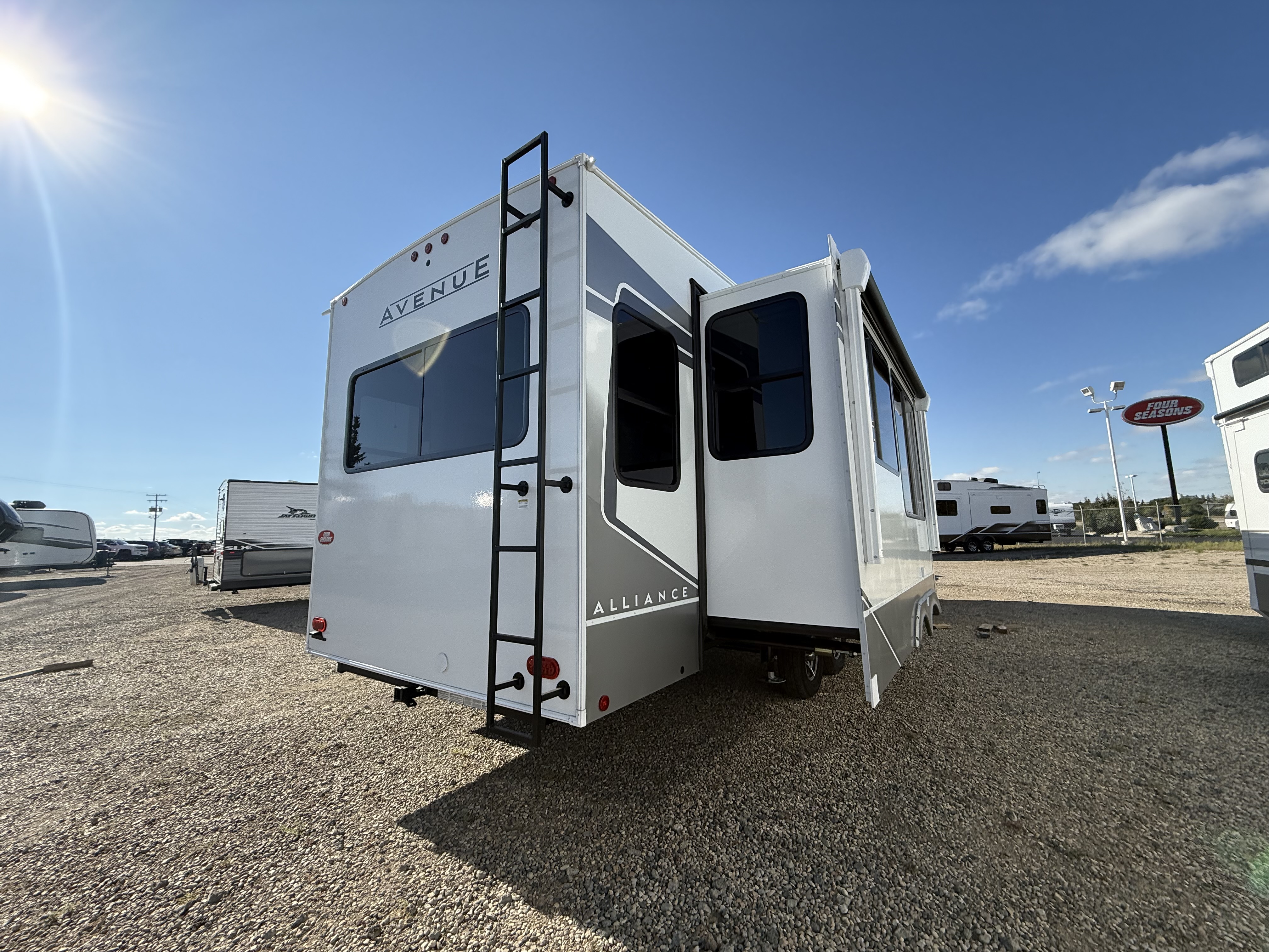 The Avenue 32RLS fifth wheel is designed for ultimate comfort and convenience. Featuring a kitchen island with ample counter space, meal prep is a breeze in this fully equipped kitchen. The floating dinette table is paired with two chairs on one side and a movable ottoman with hidden storage on the other, perfect for storing games or extra tablecloths. Enjoy additional storage in the hutch/pantry and a second pantry for snacks and essentials.