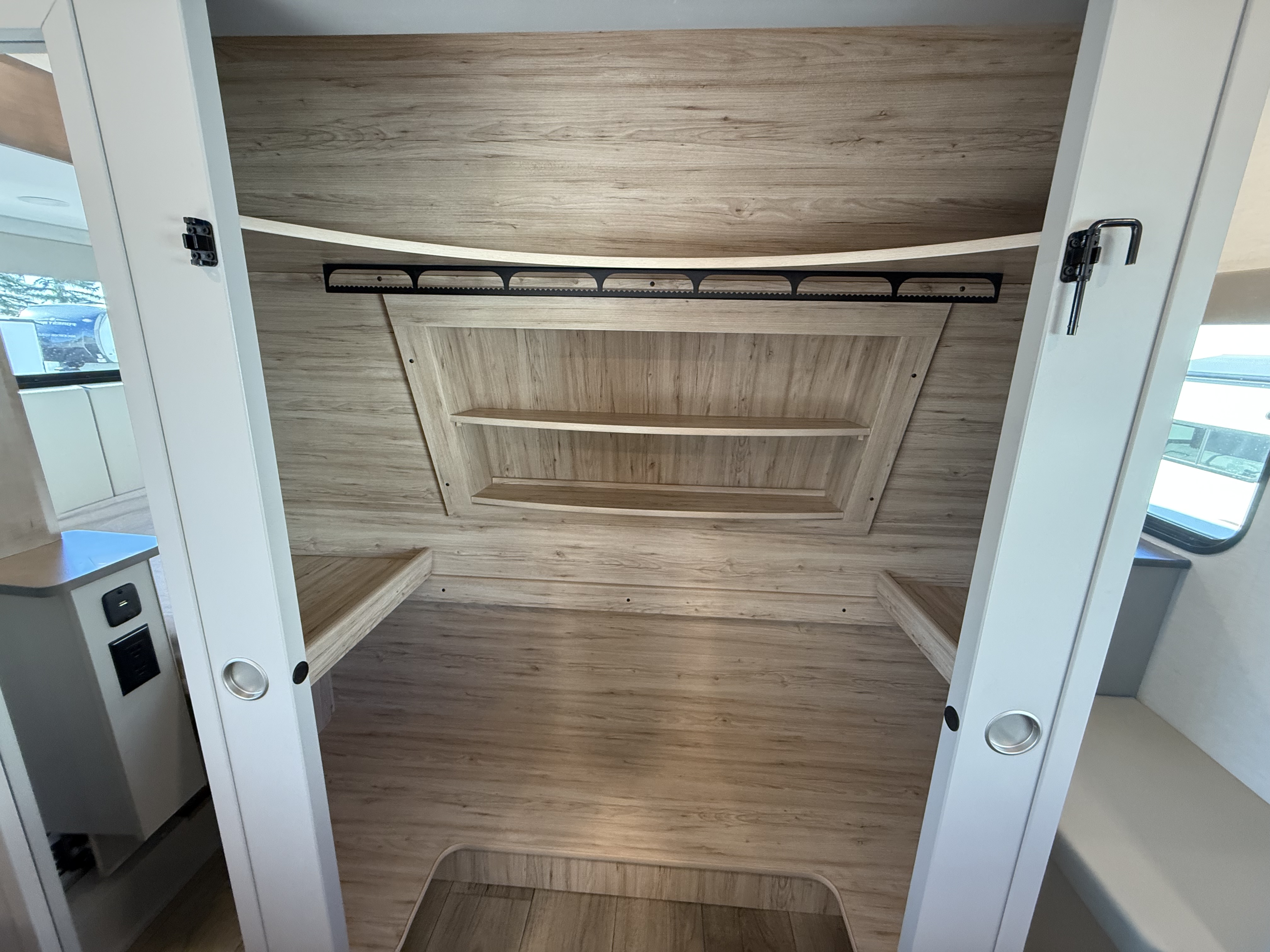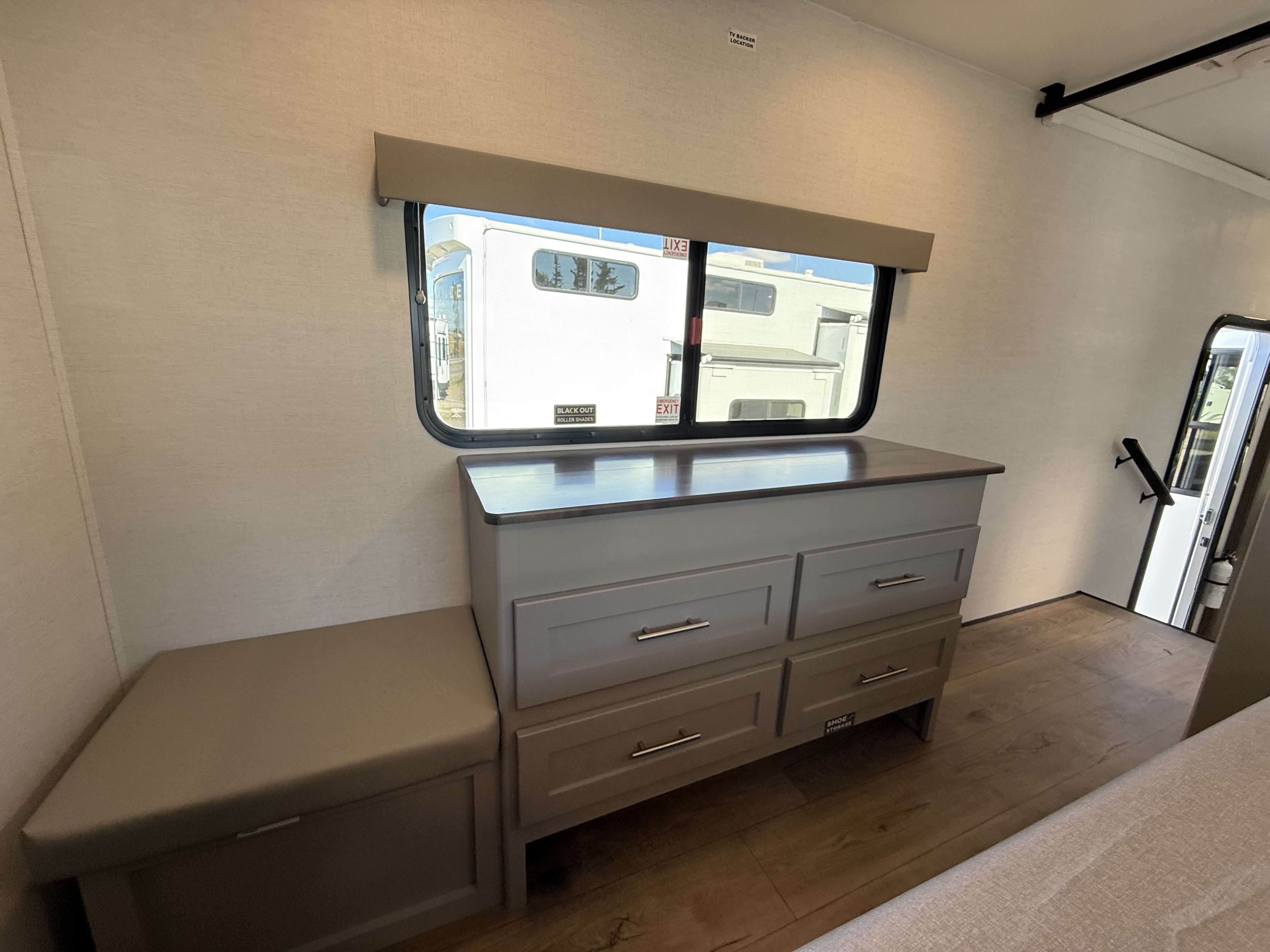 - The private front bedroom offers a queen bed slide (with optional king bed), dresser, and large wardrobe for all your clothing and gear. The wardrobe is prepped for a washer and dryer, making this RV perfect for longer stays or extended trips.