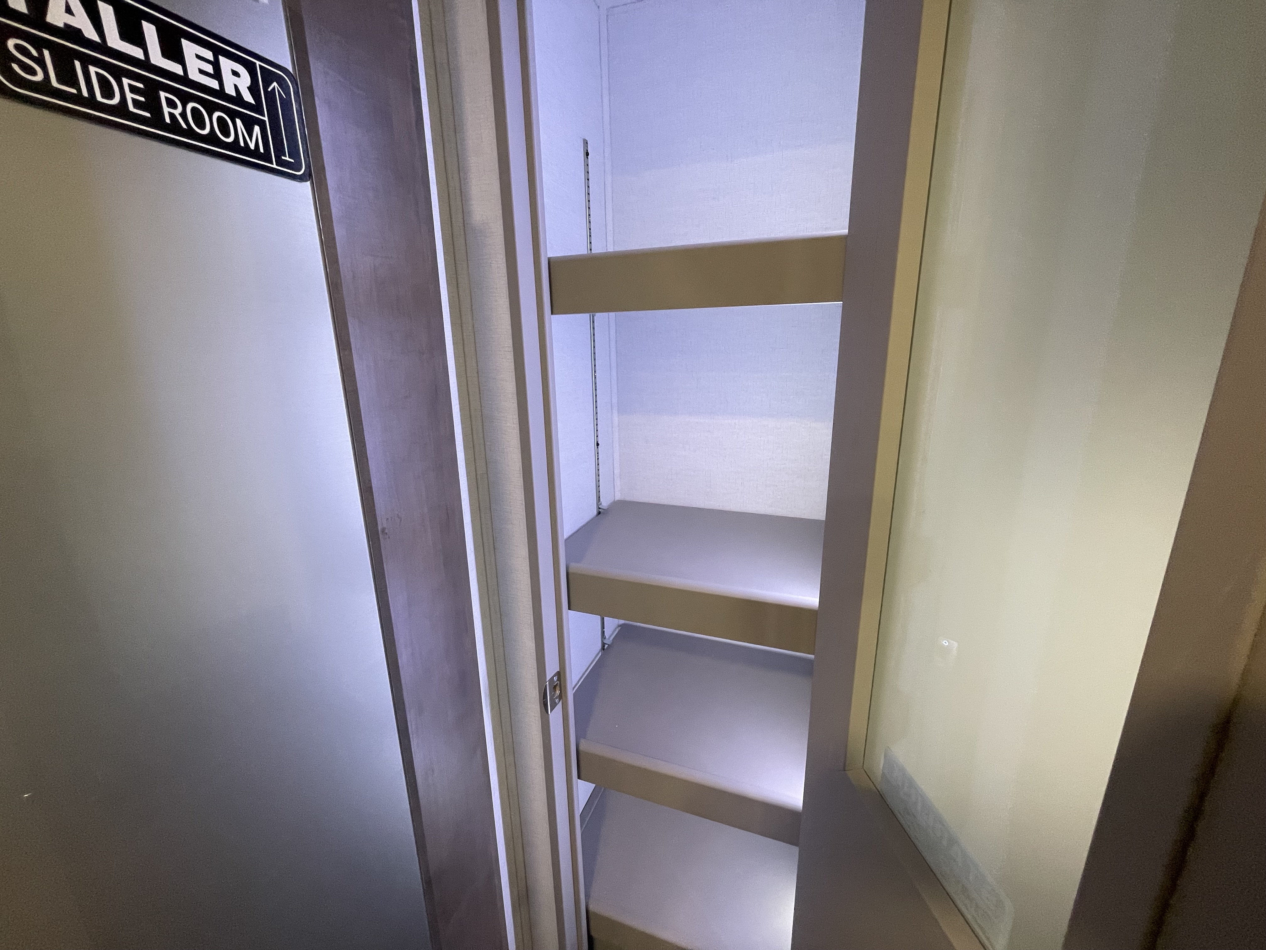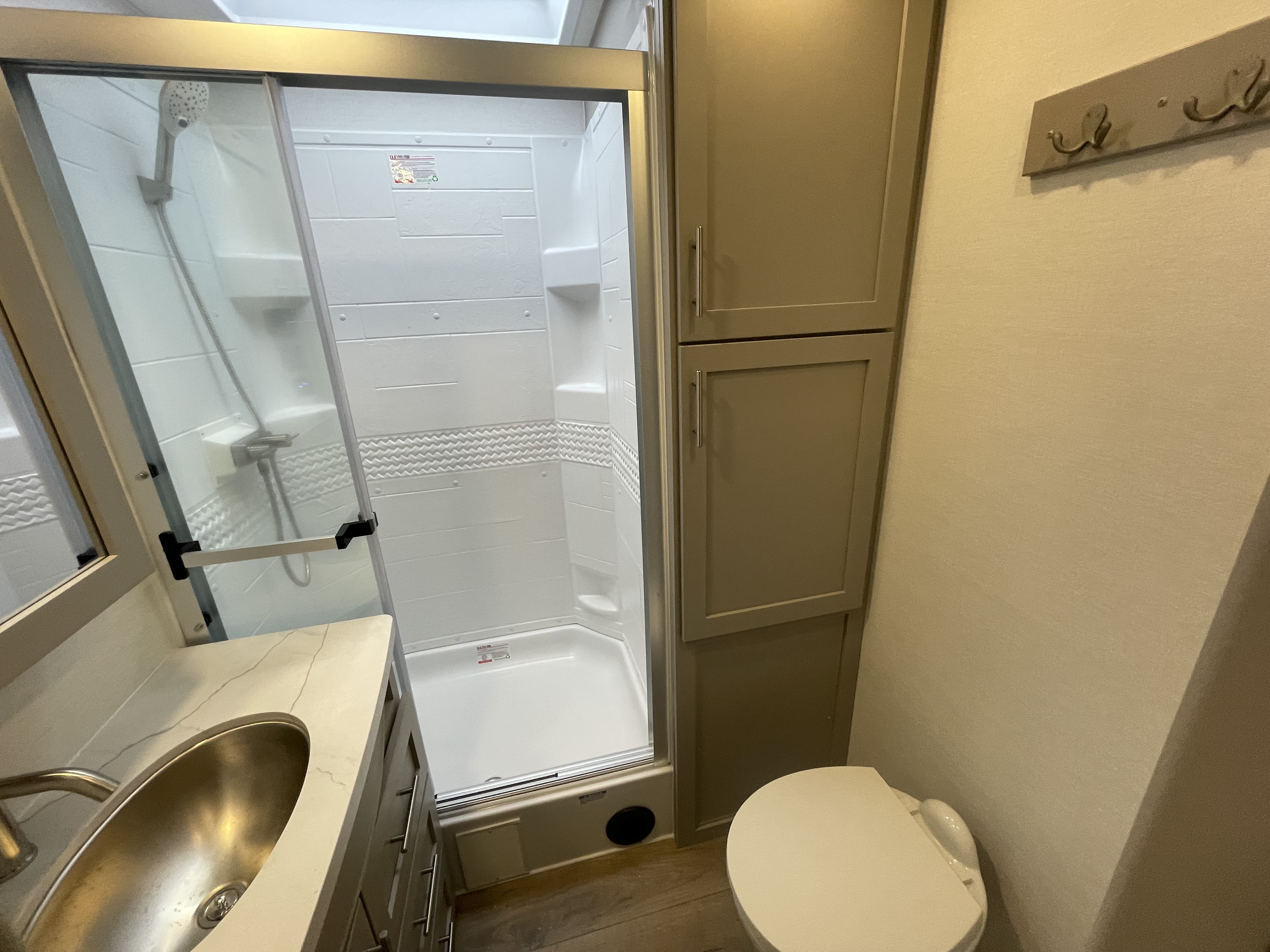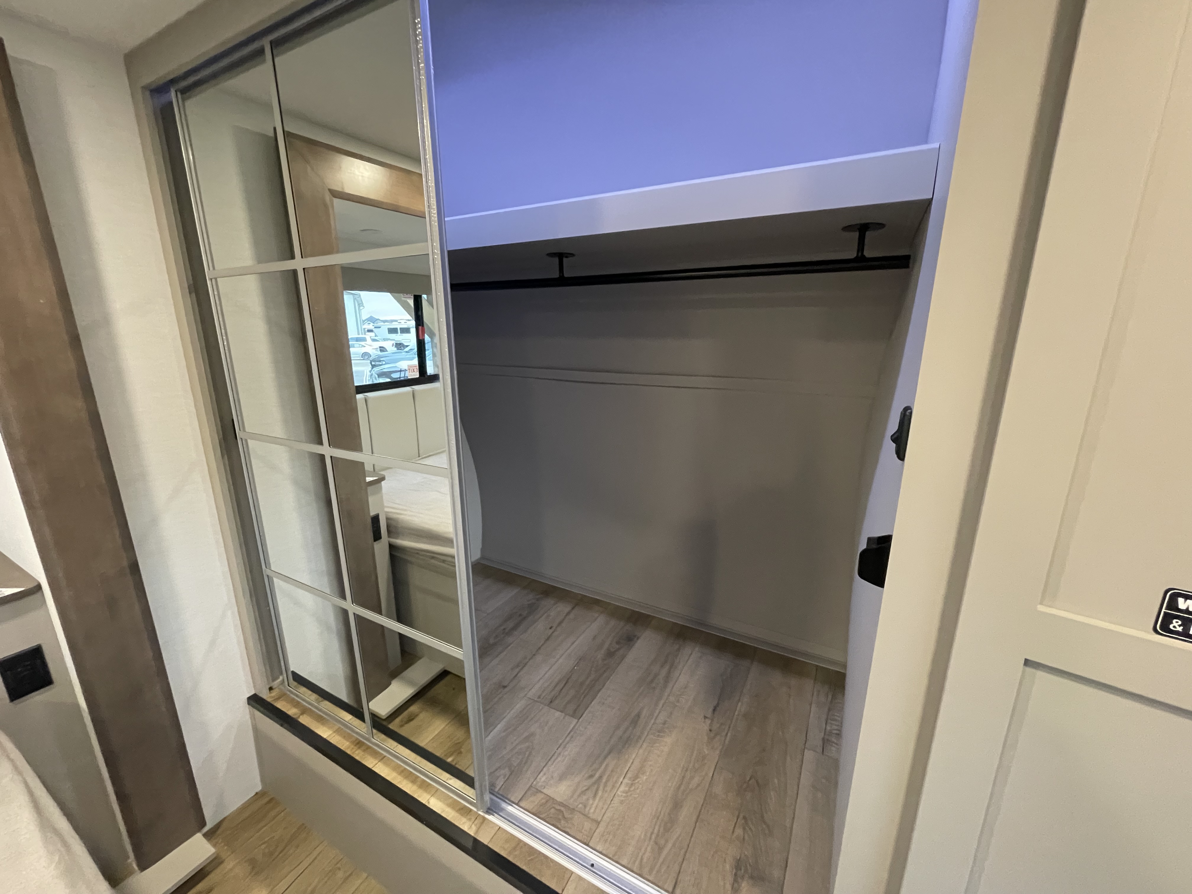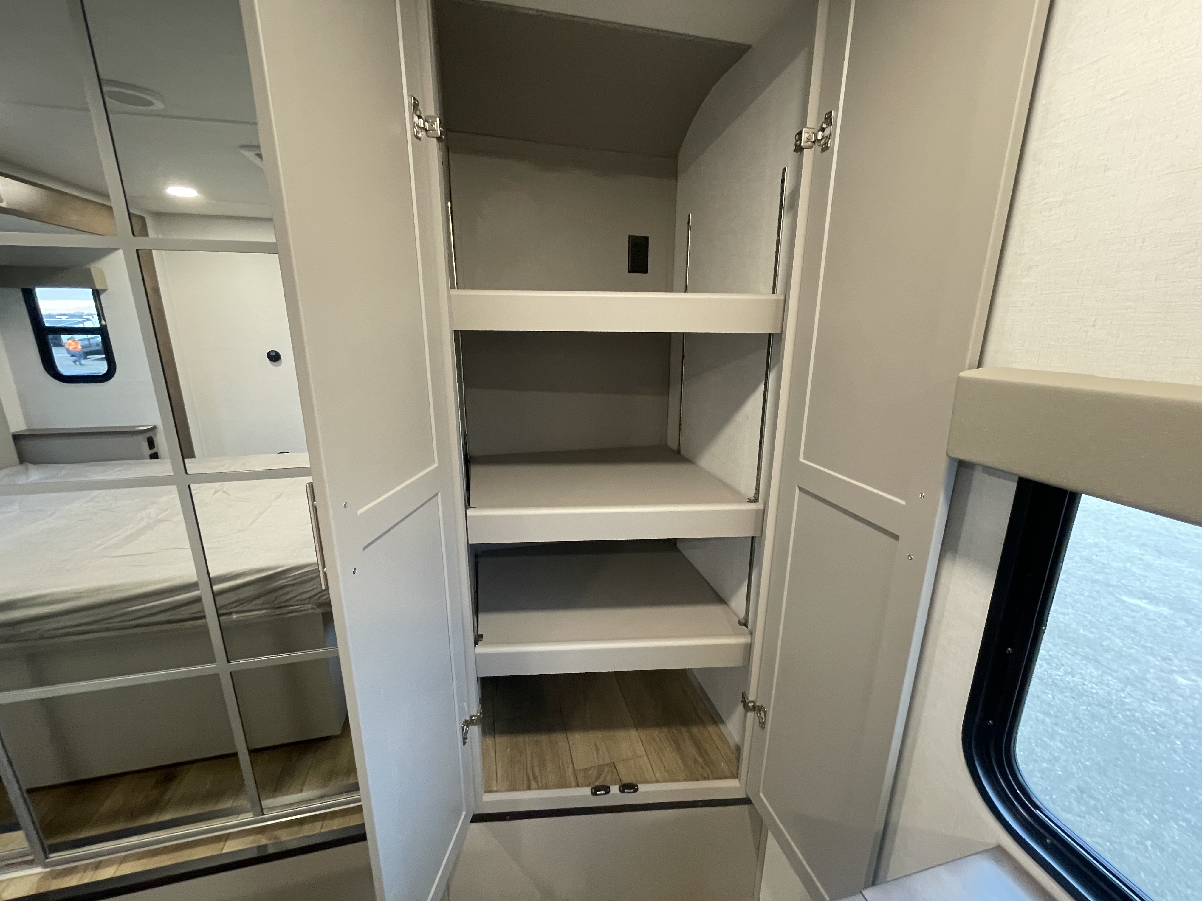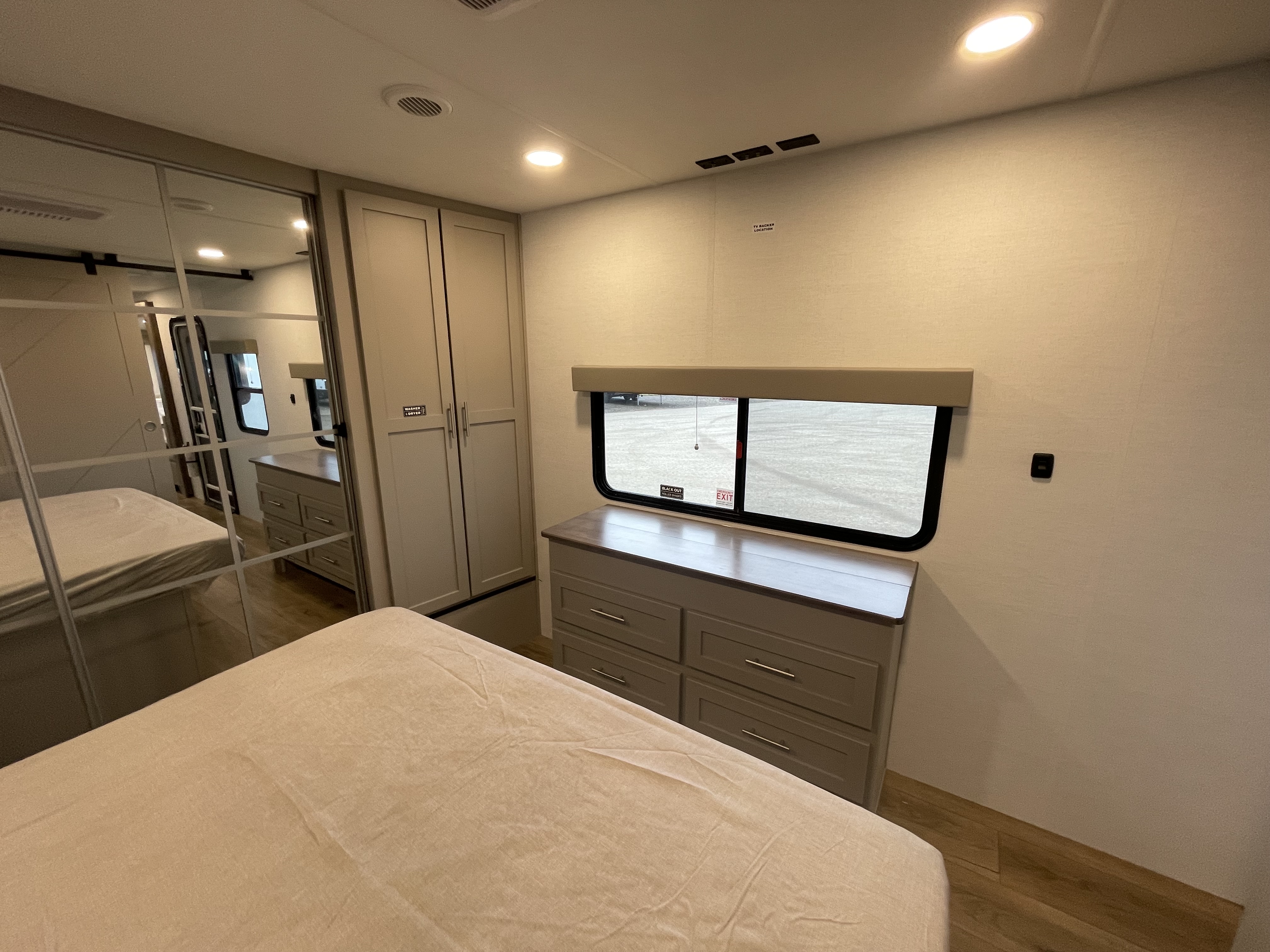 - Luxury Bedroom: The front bedroom features a queen bed slide, with an optional upgrade to a king-size bed. It also includes a wardrobe prepped for a washer and dryer, and a dresser offers ample storage for clothing and personal items.