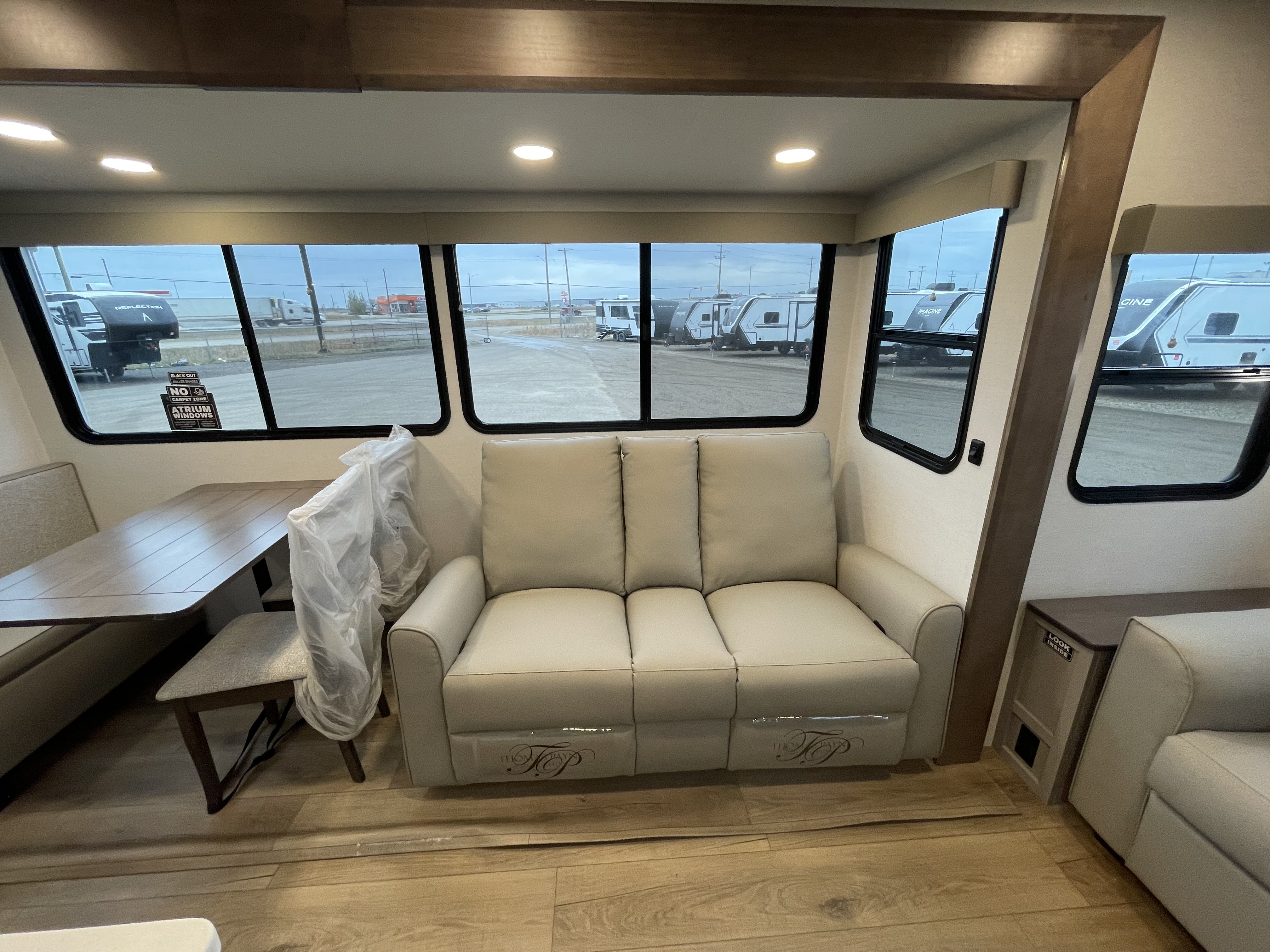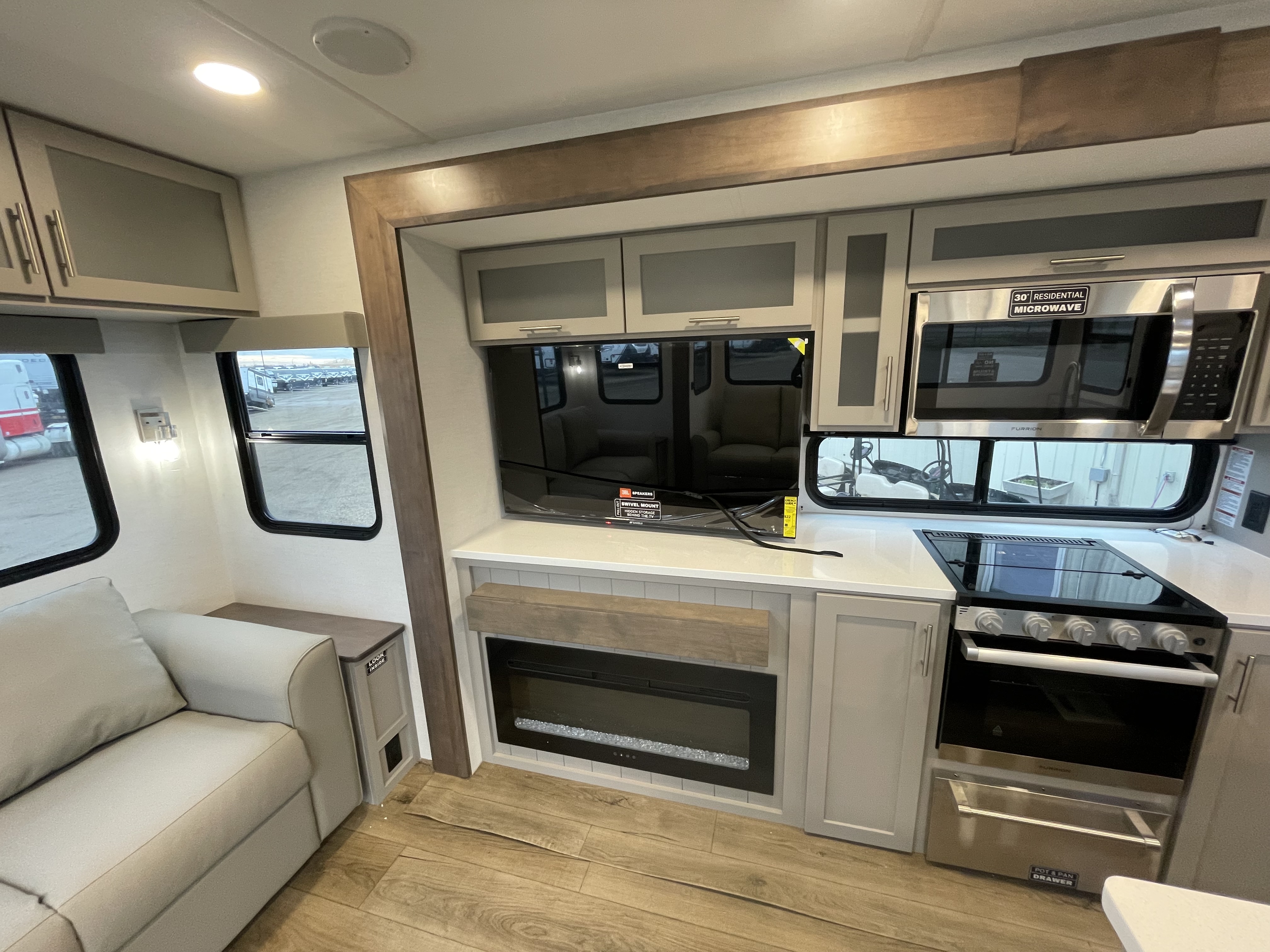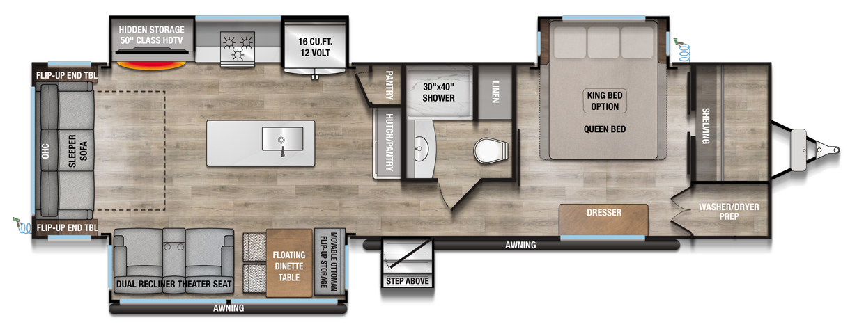 - Spacious Rear Living Area: Relax in style with dual recliner theater seating and a cozy rear sleeper sofa. The 50" HDTV is mounted on a swing bracket, revealing hidden storage behind for added convenience.