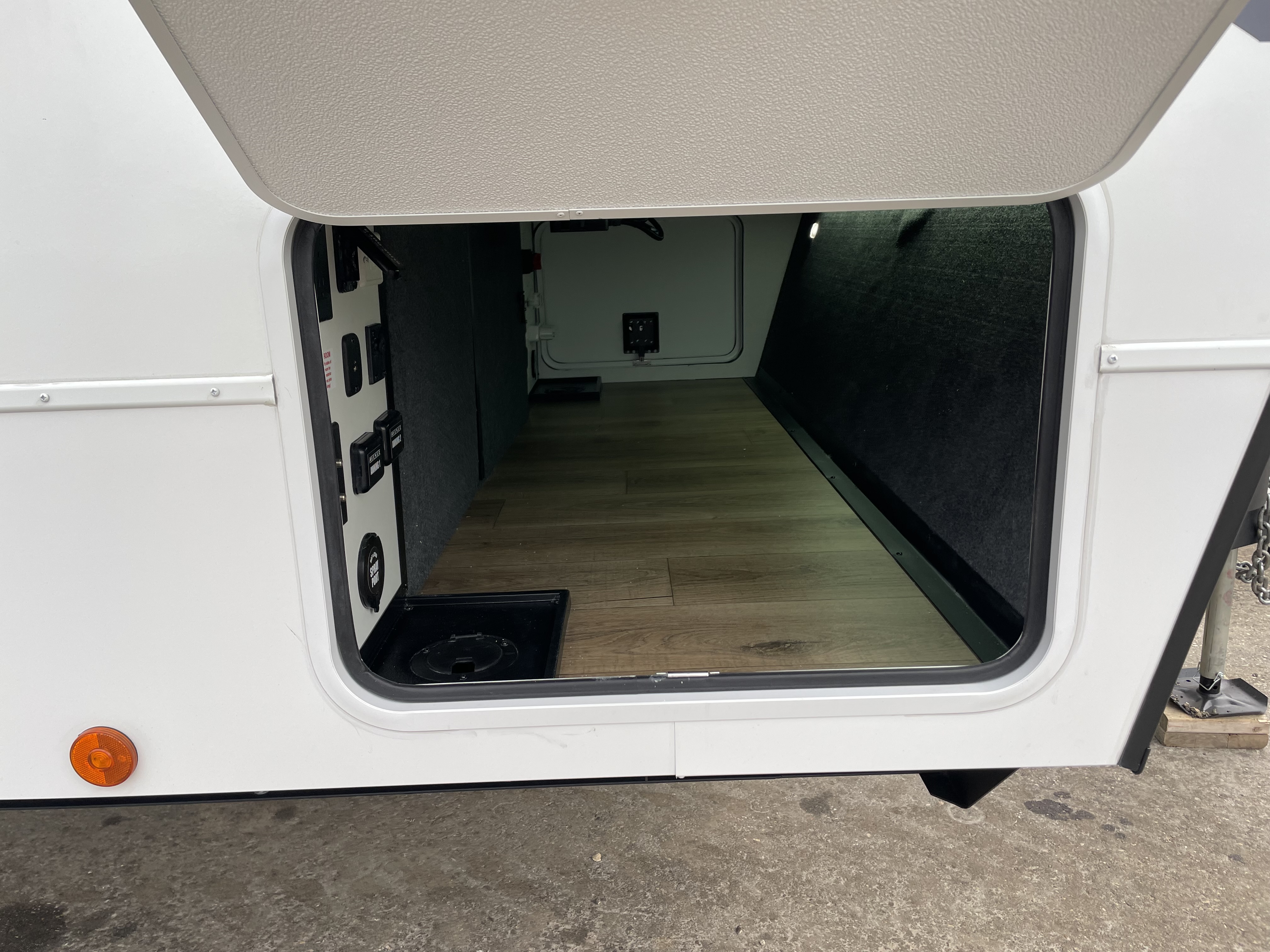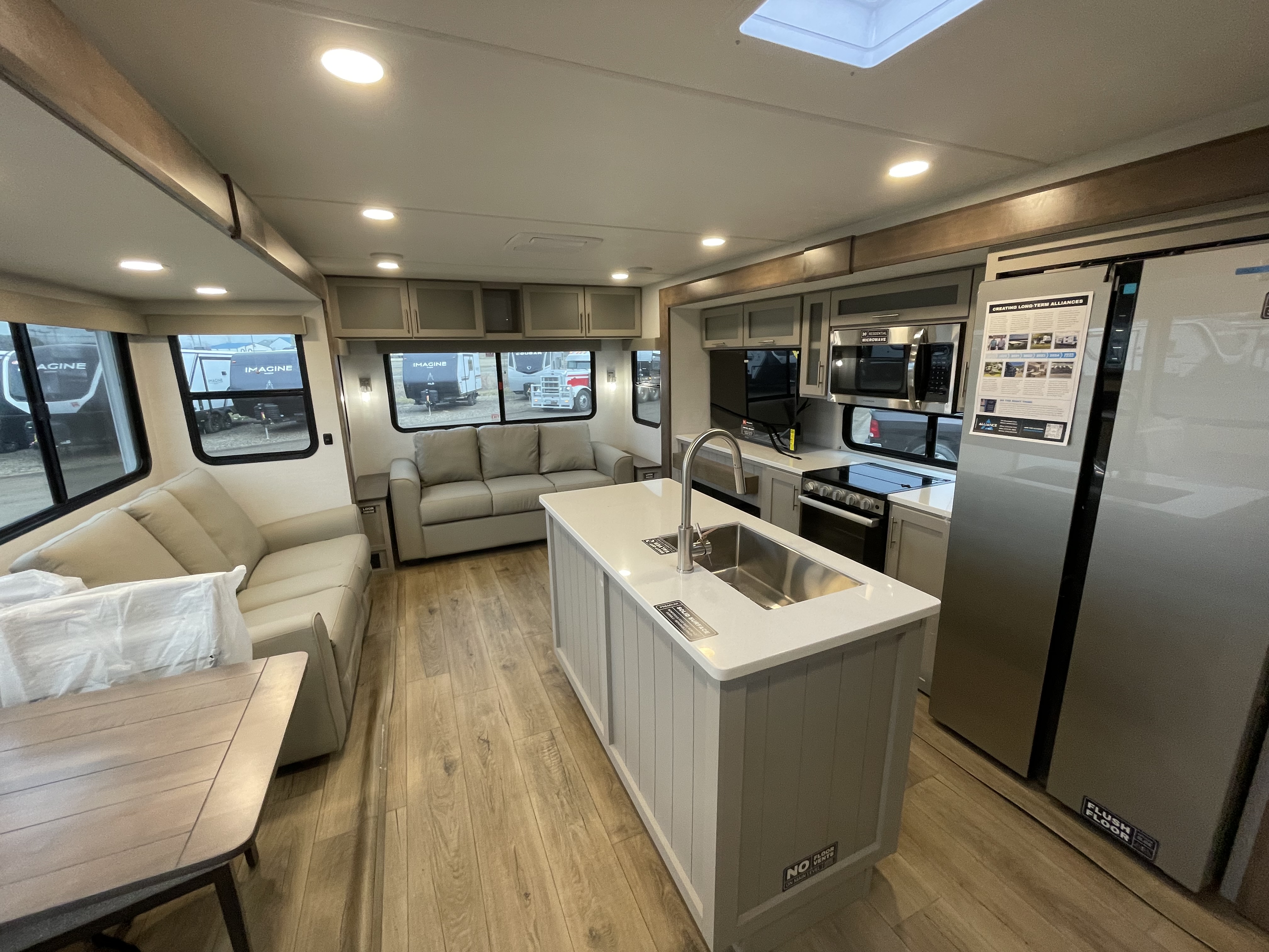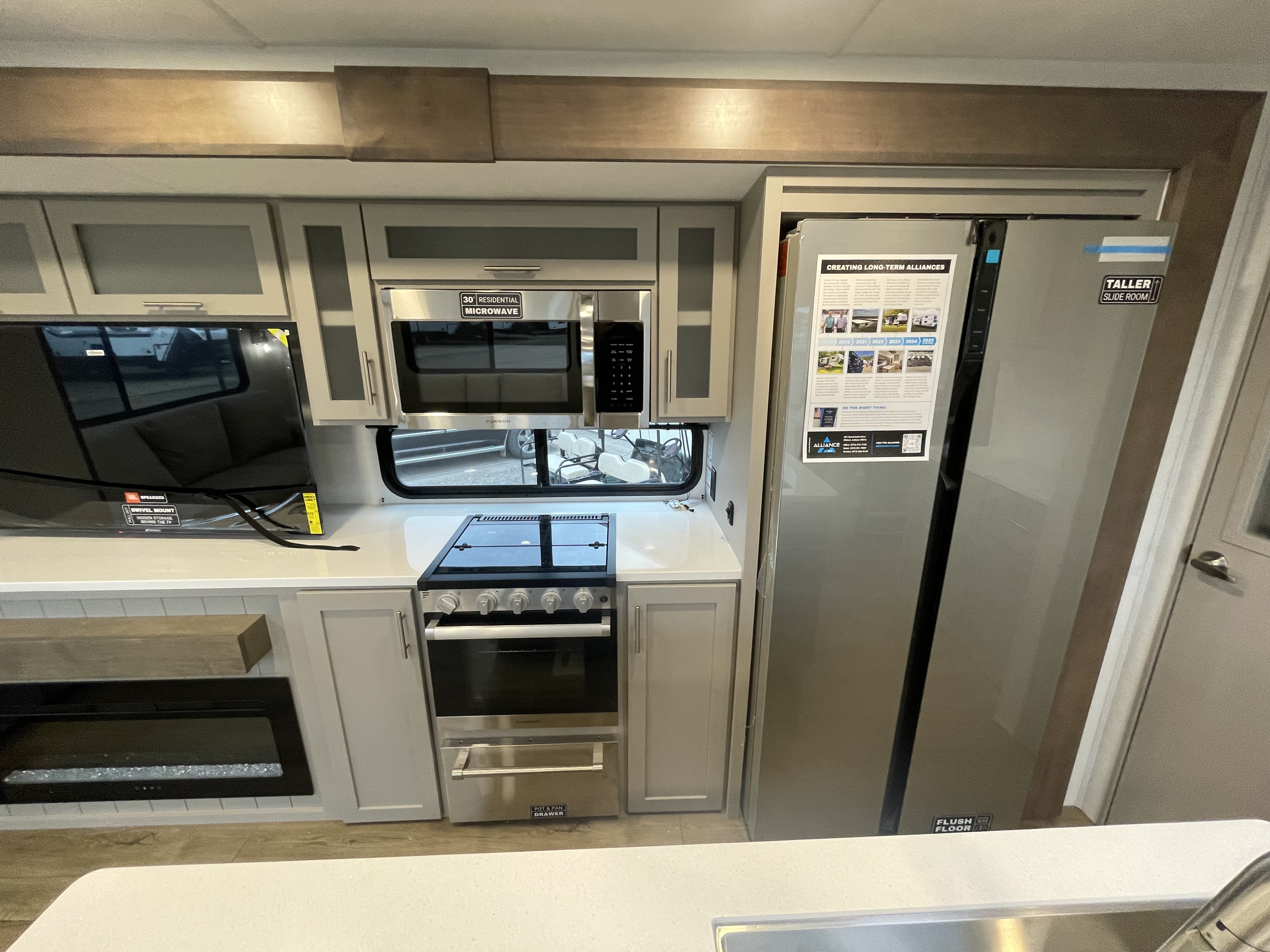 - Spacious Rear Living Area: Relax in style with dual recliner theater seating and a cozy rear sleeper sofa. The 50" HDTV is mounted on a swing bracket, revealing hidden storage behind for added convenience.