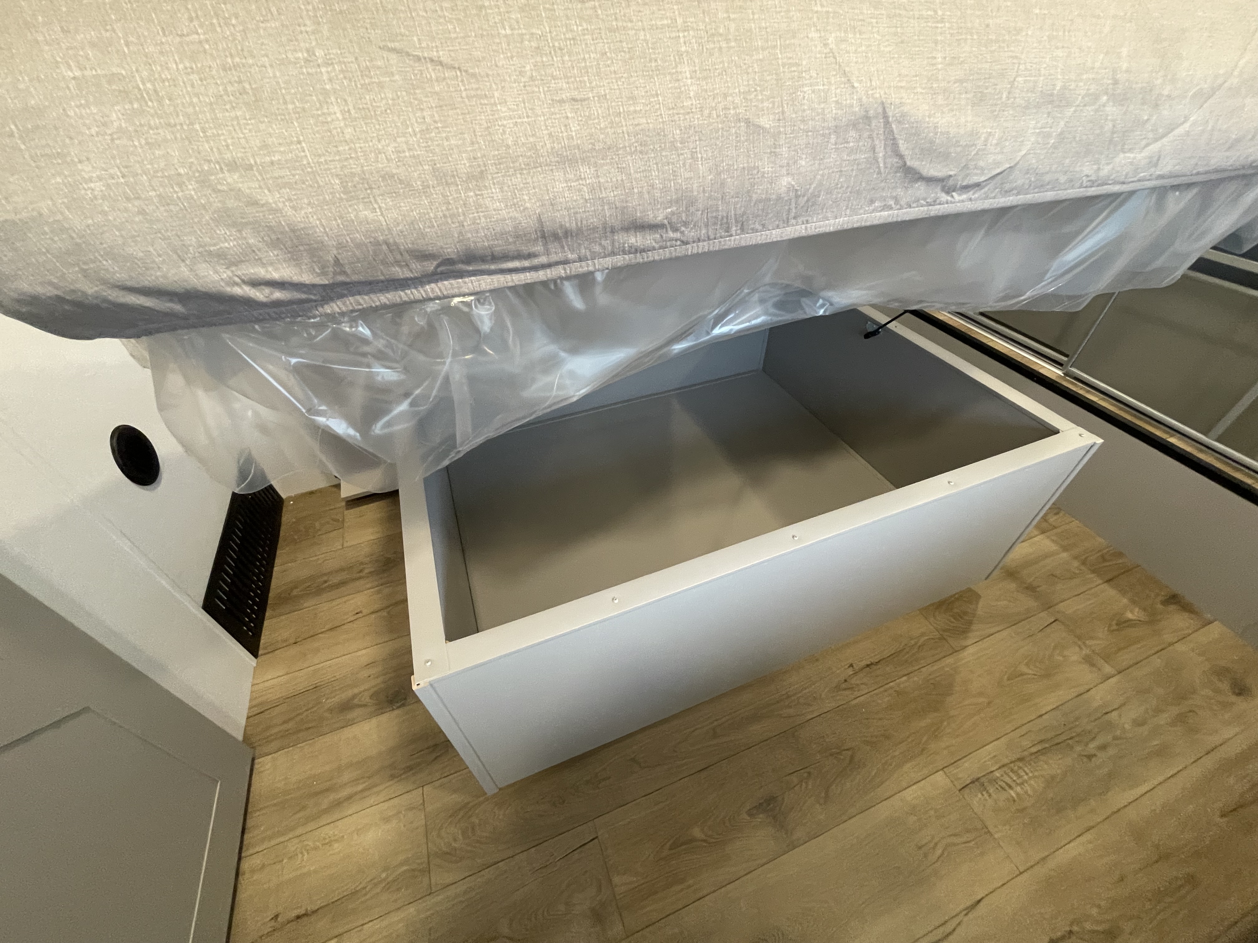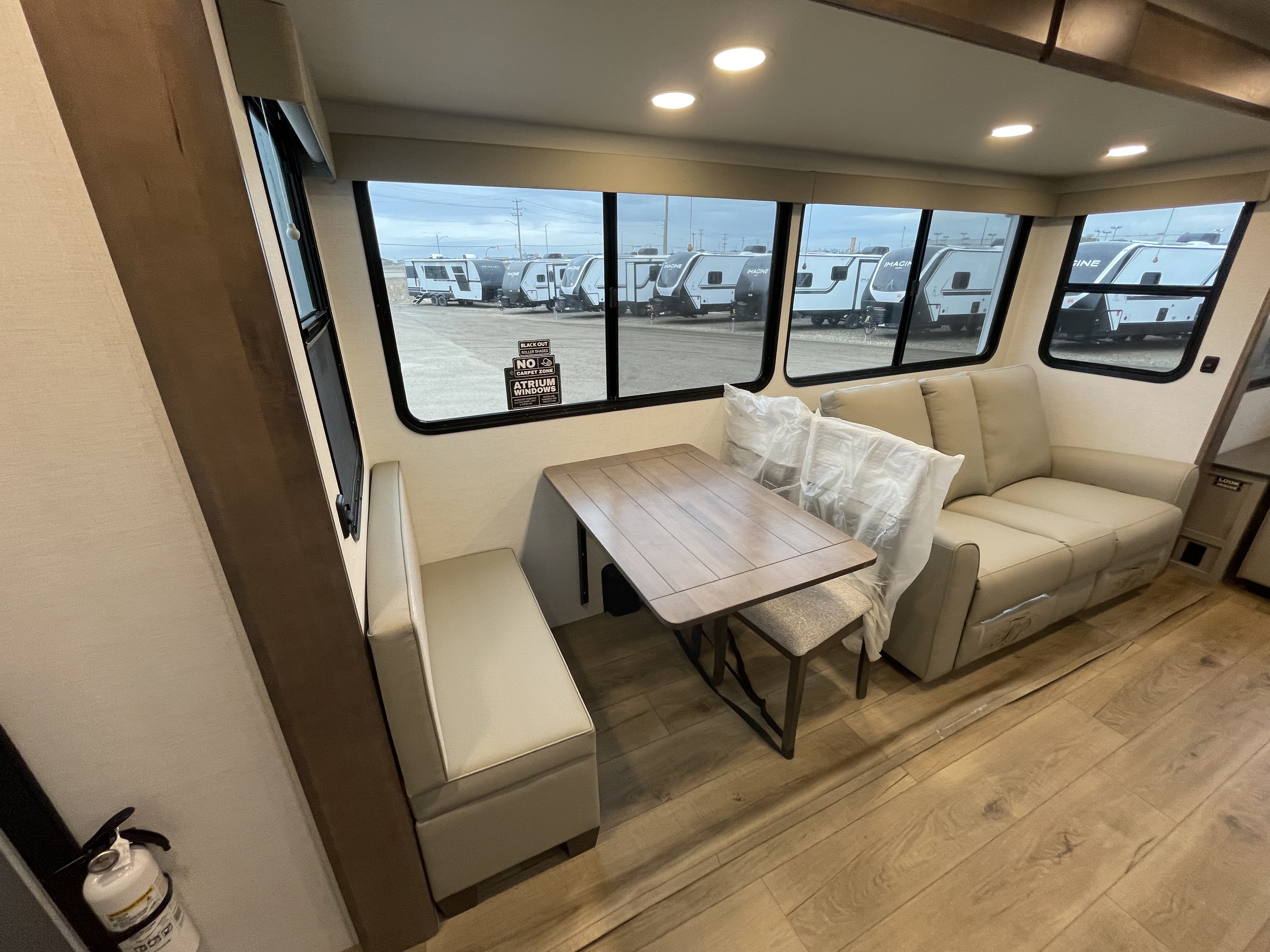 - Floating Dinette: The floating dinette with two chairs and a movable ottoman provides both dining space and additional storage for games, blankets, or other essentials.