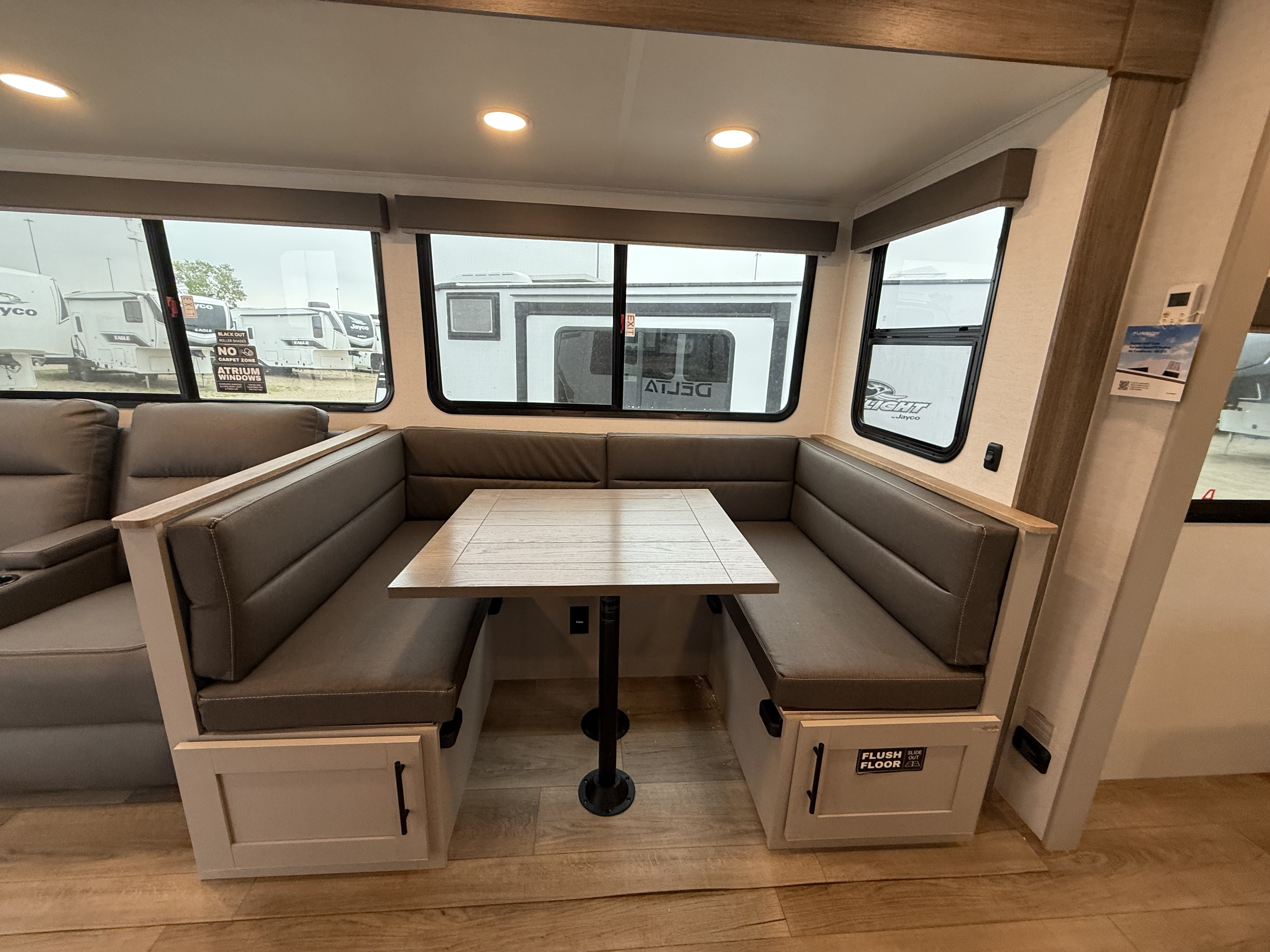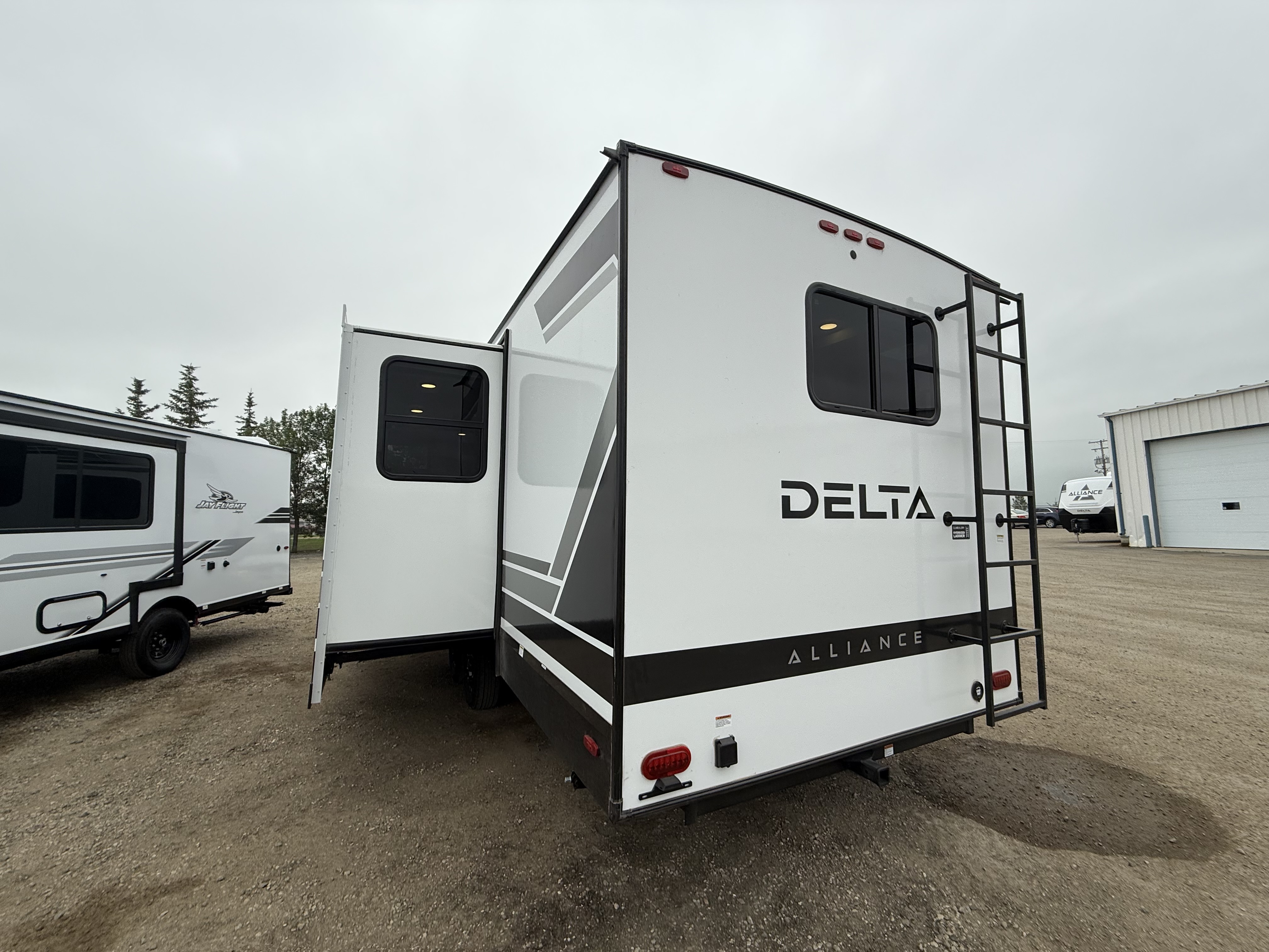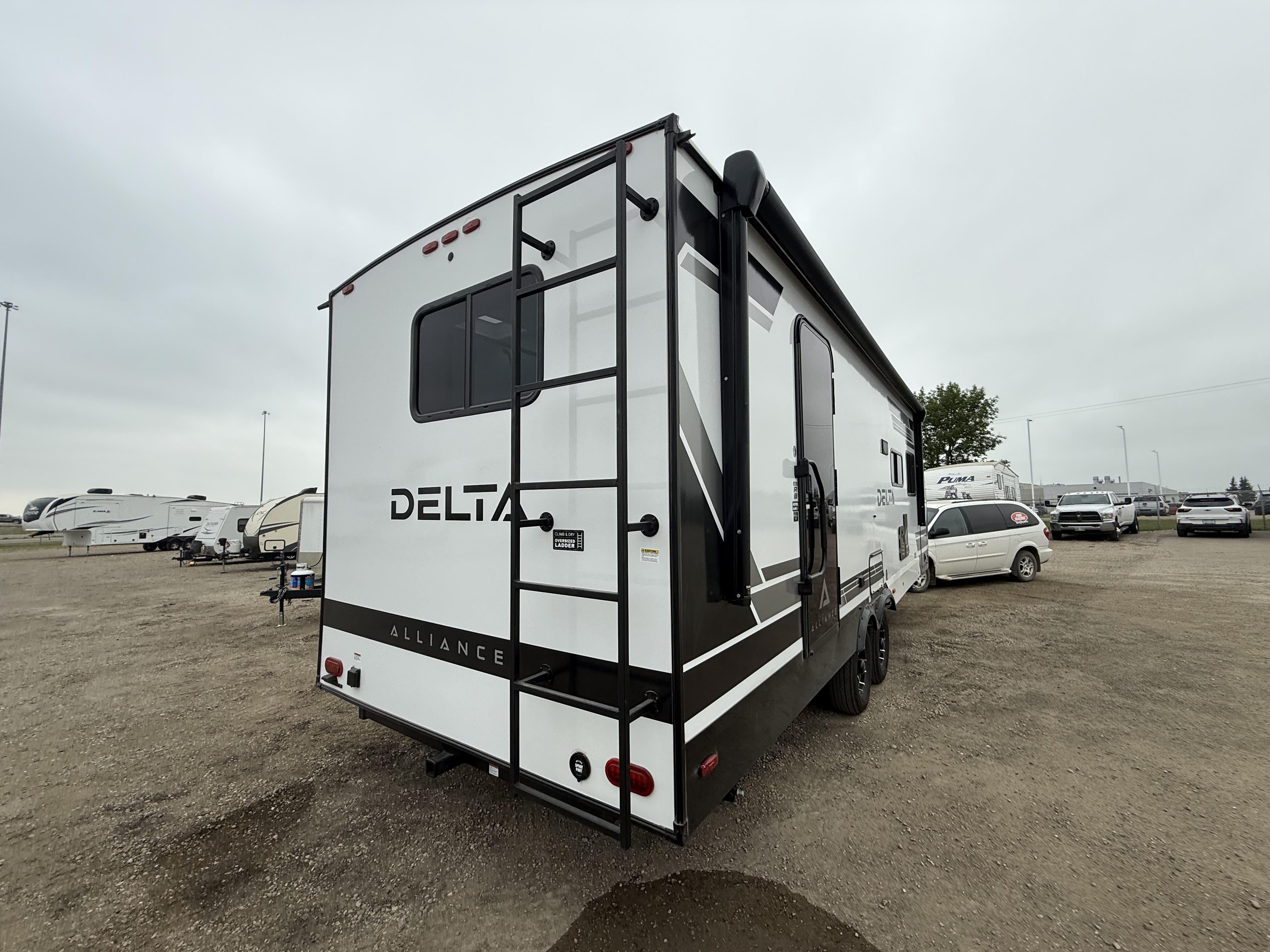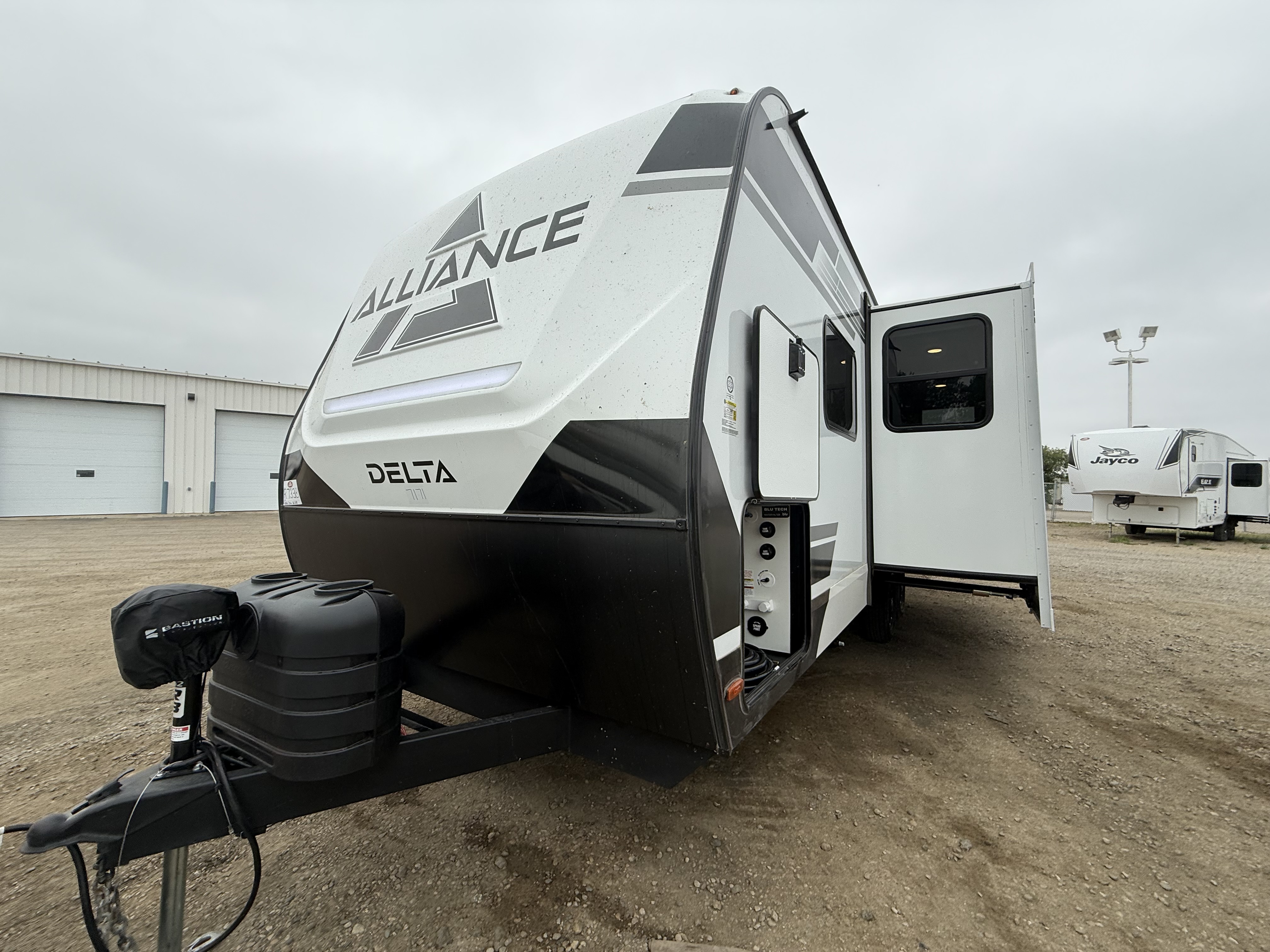 The Alliance RV Delta 262RB is a travel trailer perfect for couples or small families looking for comfort on camping trips. It features a full rear bath, U-shaped dinette, queen bed, outdoor griddle, 40" HDTV, 10 cu. ft. refrigerator, pull-out trash can, and flip-up counter extension. The U-shaped dinette is great for meals, games, or extra sleeping space. The kitchen has a three-burner range, large sink, and outdoor griddle for cooking. The full rear bath includes a shower, toilet, vanity with sink, and linen cabinet for storage. The trailer is ideal for couples or families with a queen bed, sofa, and U-shaped dinette that can be converted into sleeping spaces. The kitchen amenities include a three-burner range, outdoor griddle, 10 cu. ft. refrigerator, large sink, pull-out trash can, and flip-up counter extension. The full rear bath features a shower, toilet, vanity, and linen cabinet for added convenience.