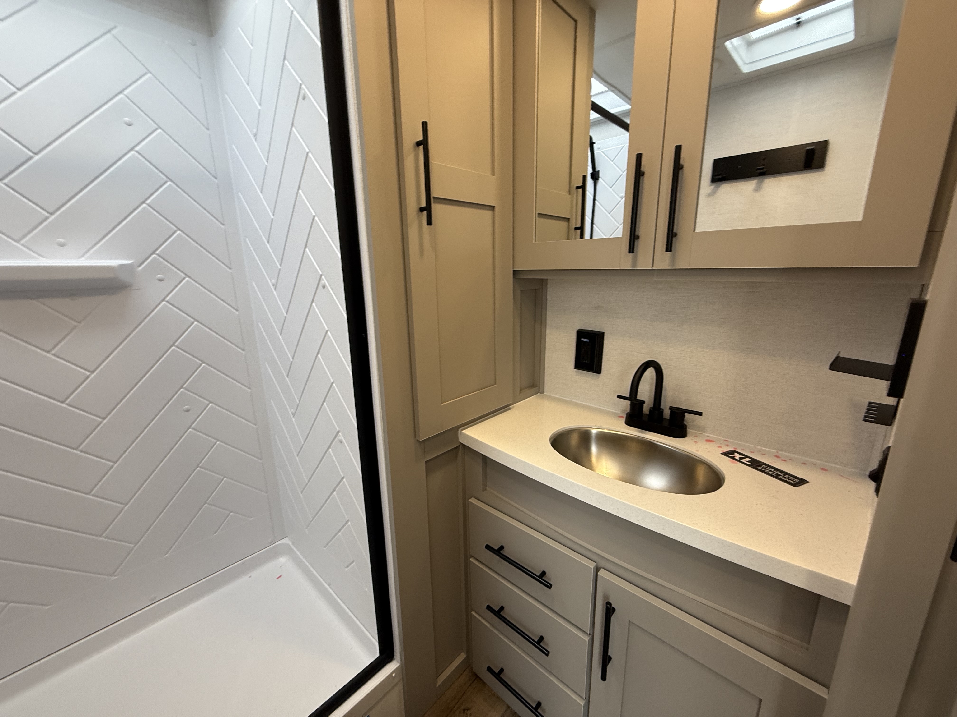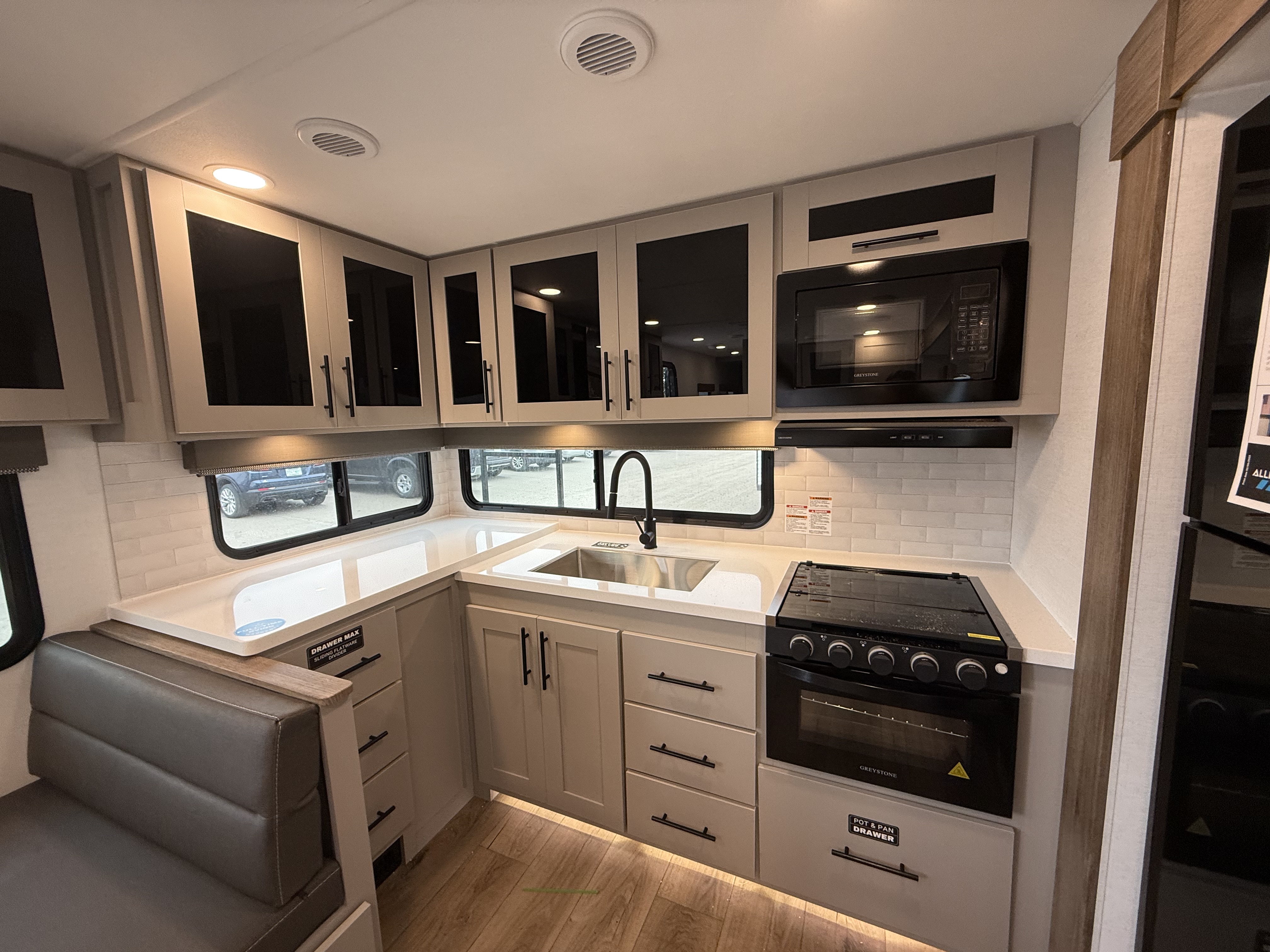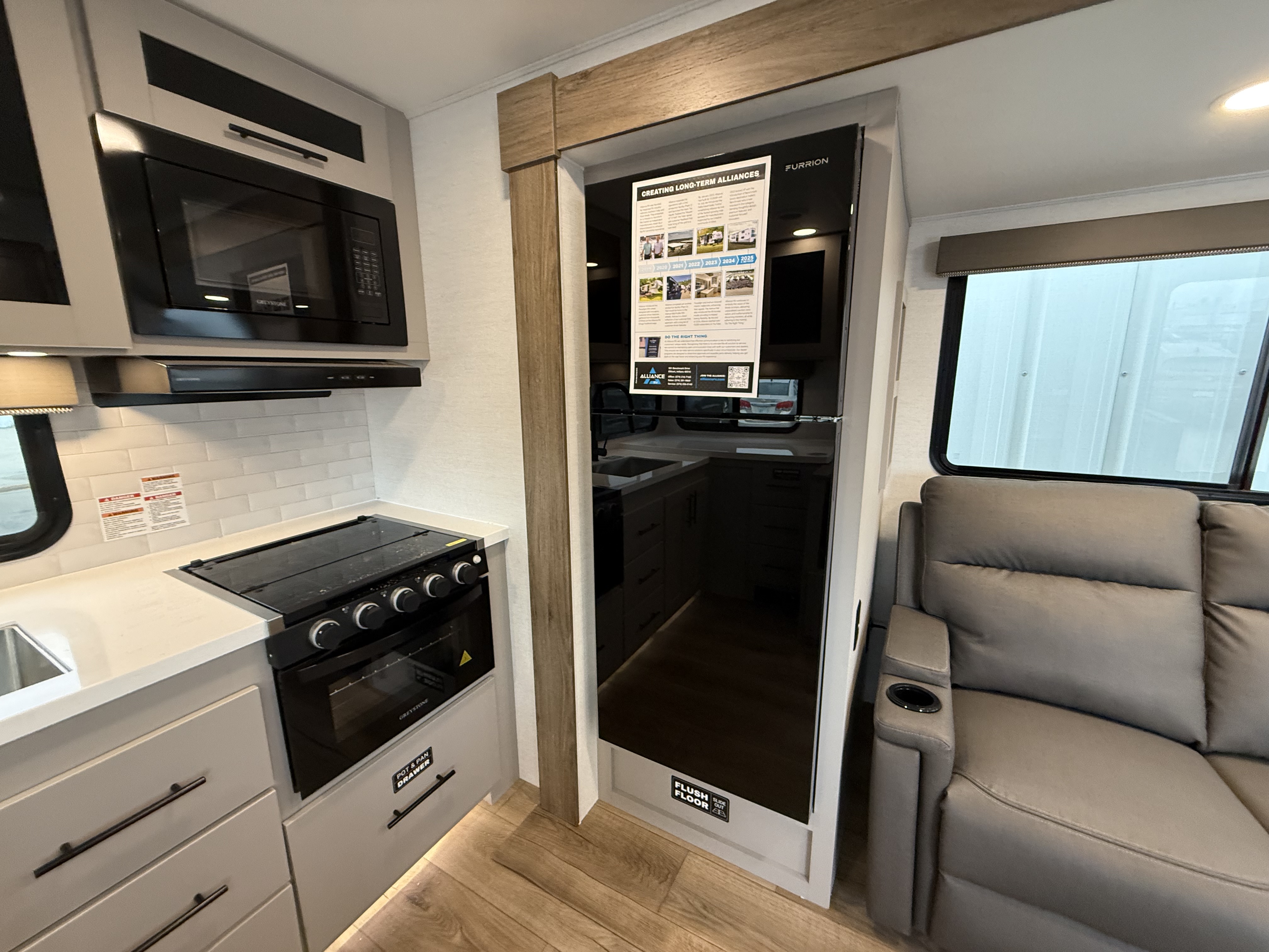 - Rear Kitchen Layout – Expansive counter space, a 10 cu. ft. 12-volt refrigerator, and a pull-out pantry for all your cooking essentials.