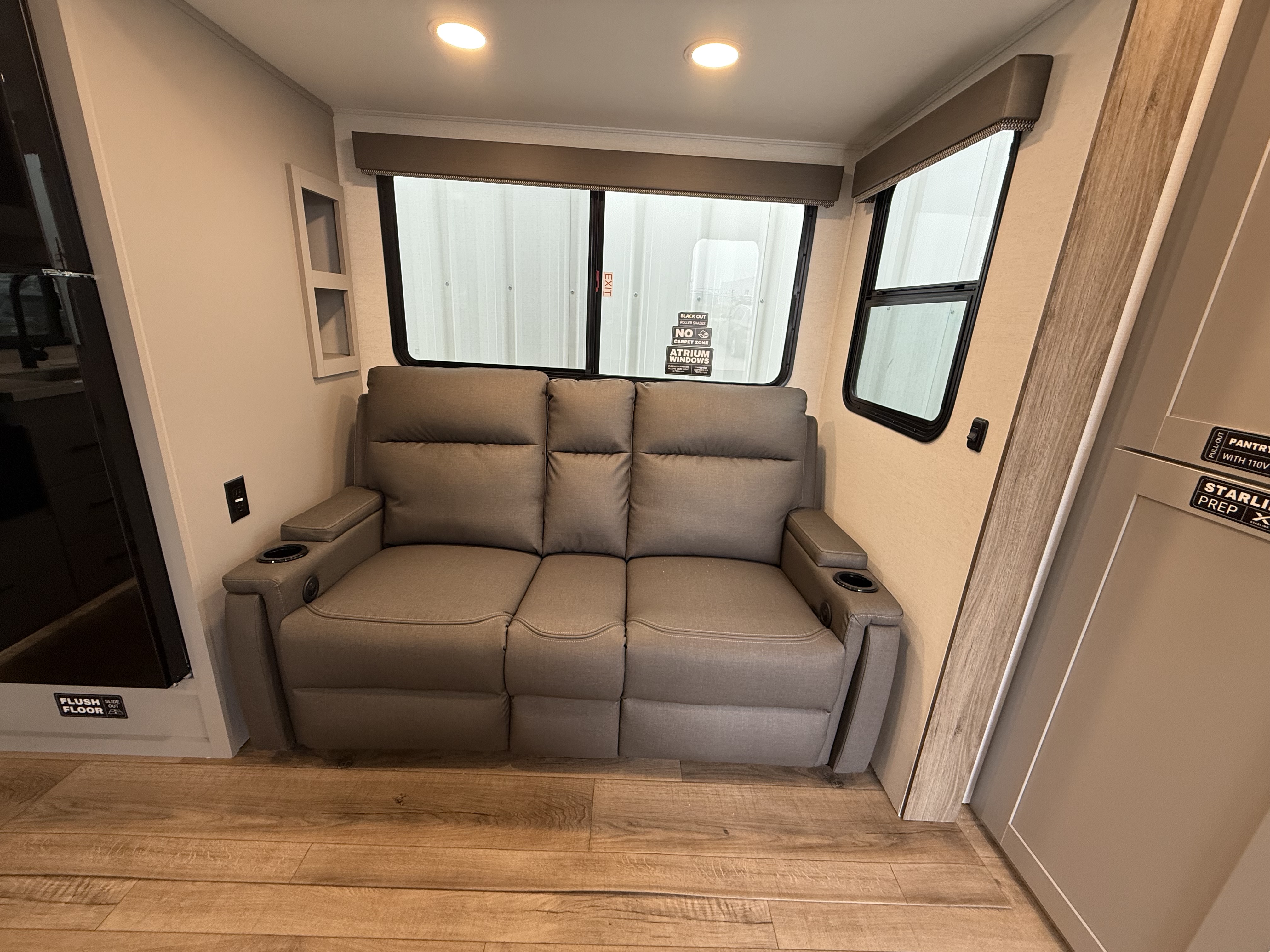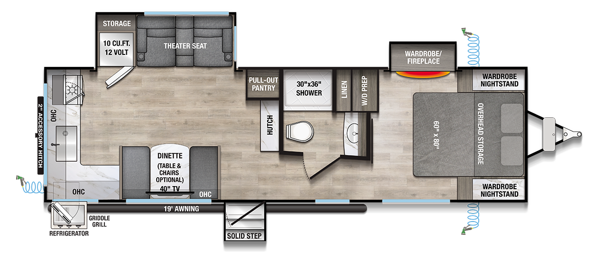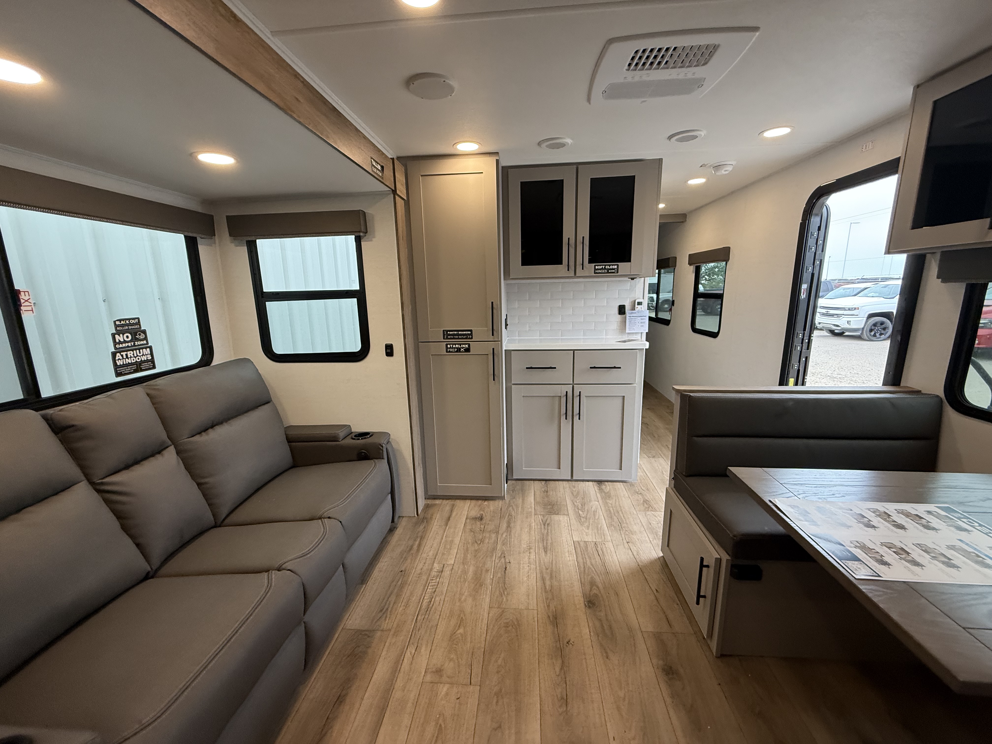 - Spacious Living Area – Comfortable theater seating and a dinette with an optional table & chairs for ultimate flexibility.