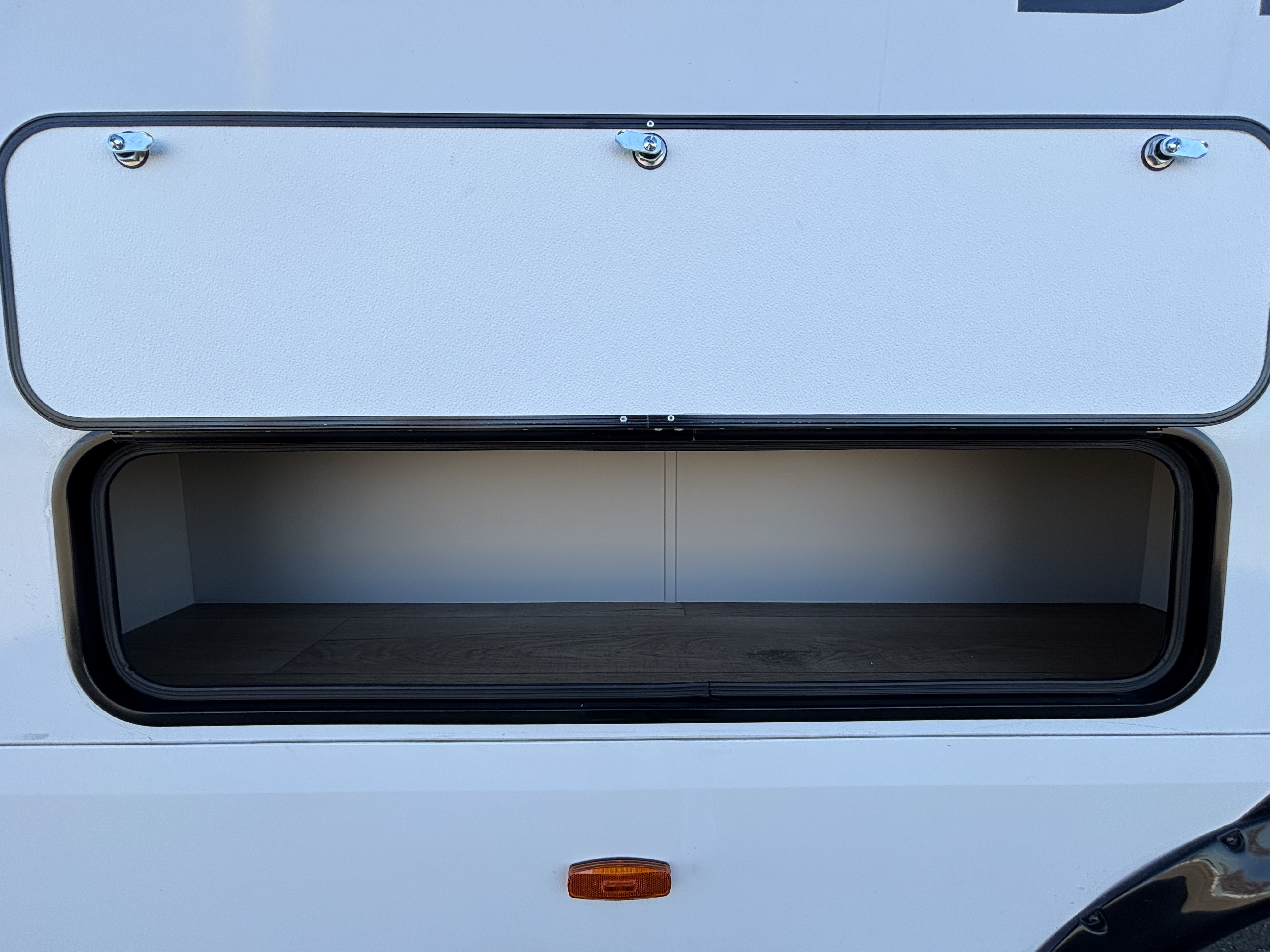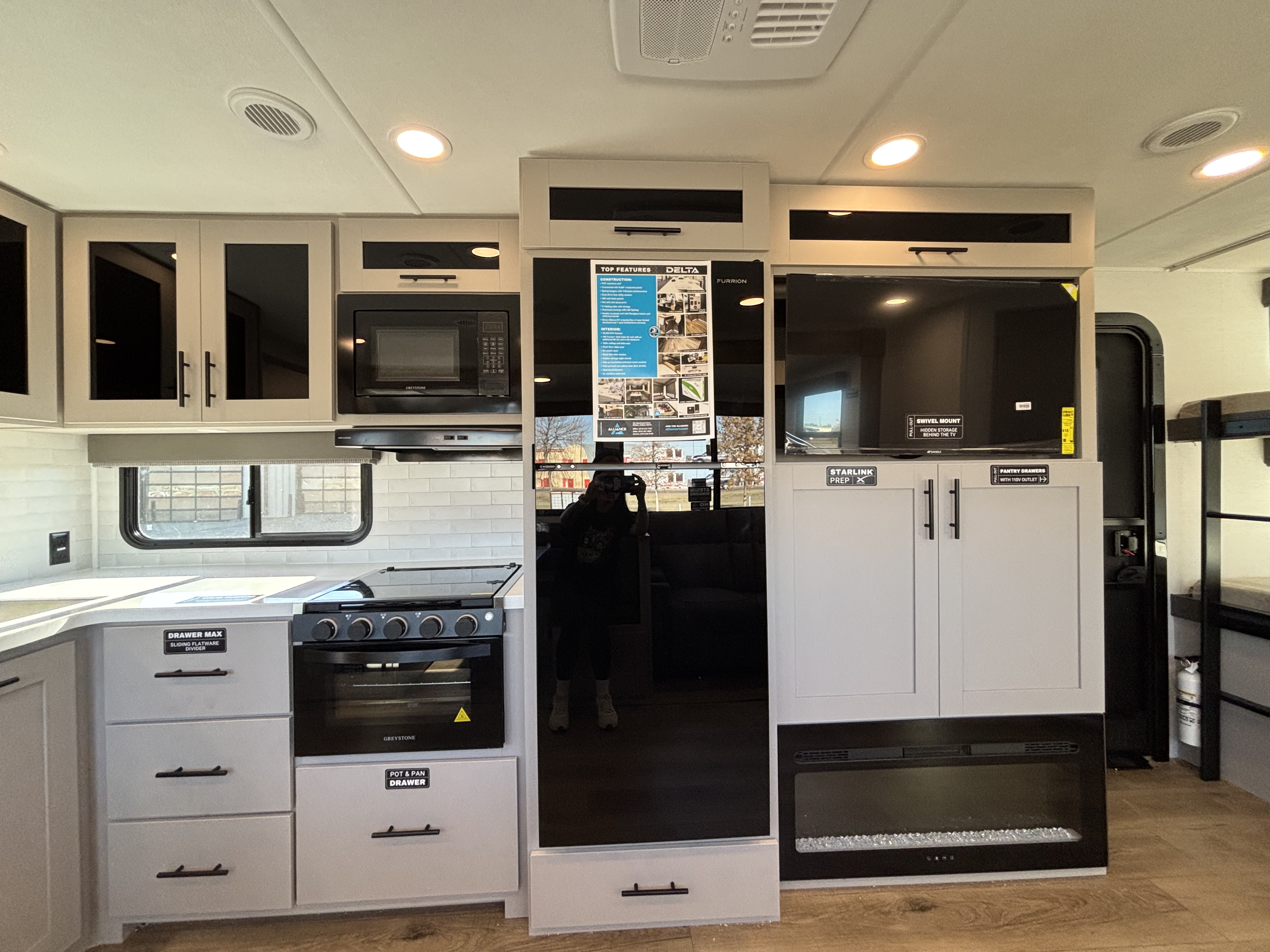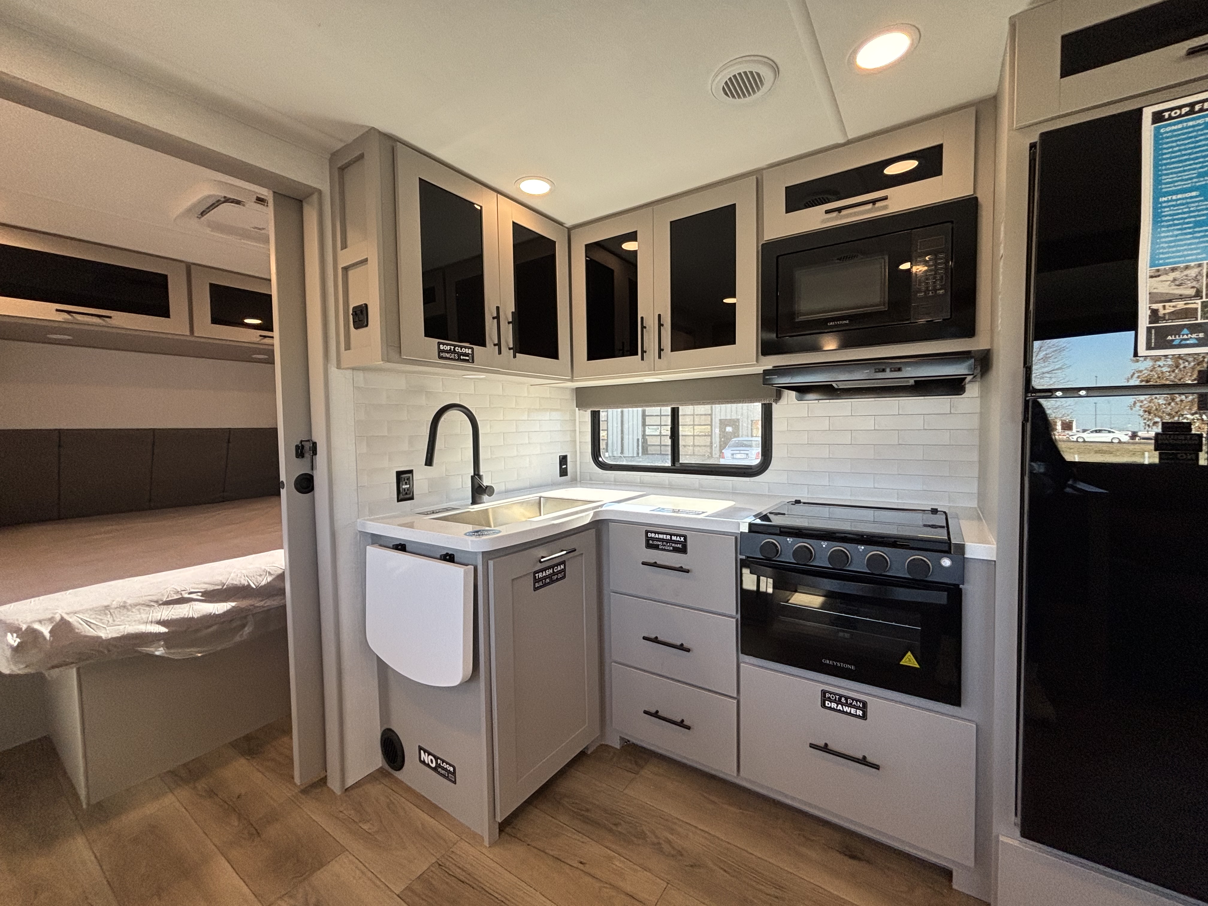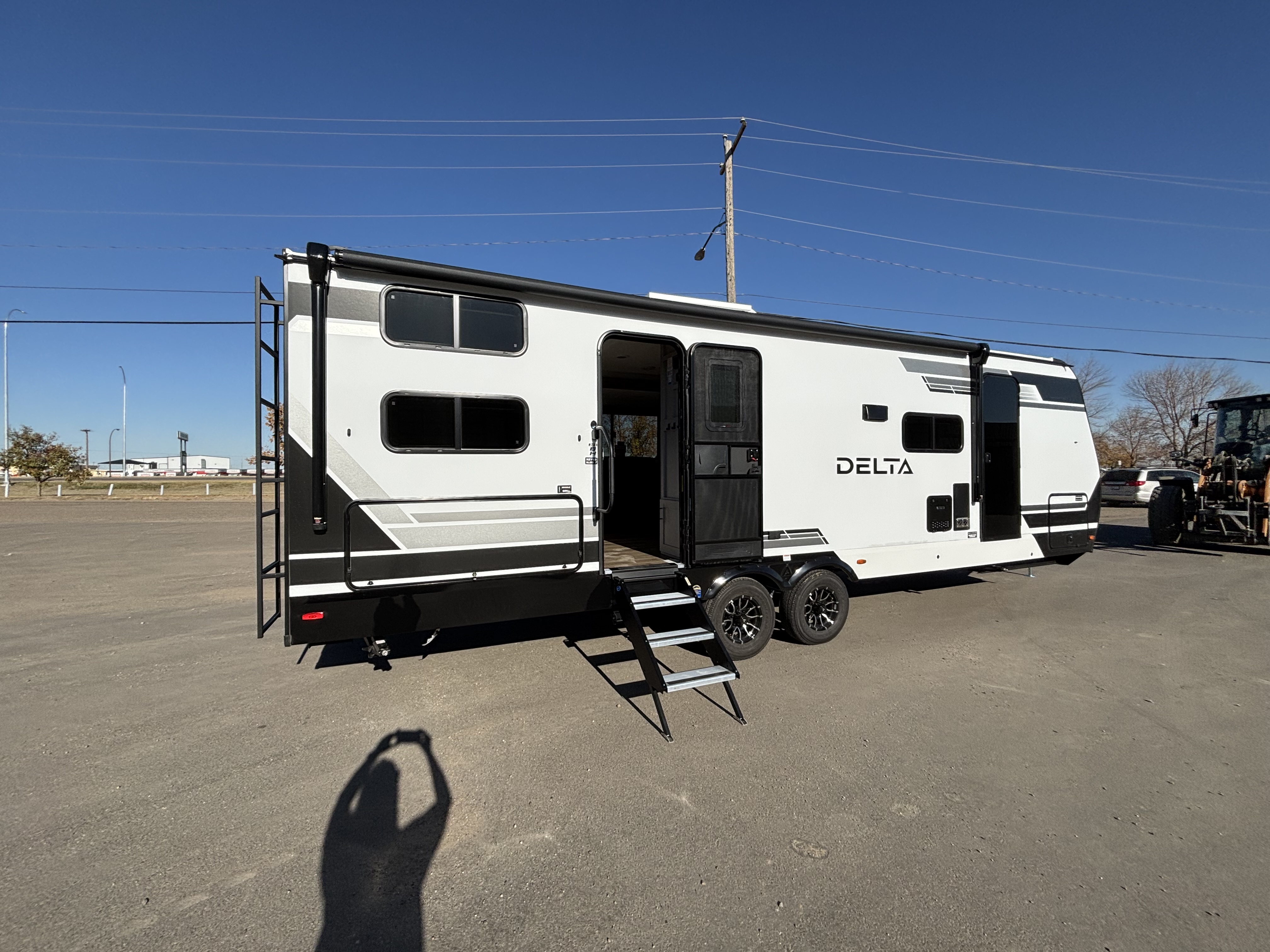 The Delta 281BH is an exceptional family camper that offers the convenience of bunk beds. This stunning model not only provides a private bedroom with a queen-sized mattress, dual wardrobes, and overhead storage, but also caters to the kids' needs. With dual entry doors on each end of the camper, the flow of traffic is seamless and convenient. At the back end of the camper, you'll find a full bathroom that remains accessible even when the slides are in. The living room is designed for relaxation, featuring a sofa slide where you can comfortably watch your favorite shows on the 40" HDTV. In the well-equipped kitchen, all the essentials are at your fingertips, including a 12-volt refrigerator, a 3-burner stovetop and oven, a residential microwave, an industrial sink with a pull-out trash can, and a flip-up extension that provides additional counter space. Opposite the kitchen, the U-shaped dinette offers a versatile space for card games with friends or can be converted into an extra bed when needed.