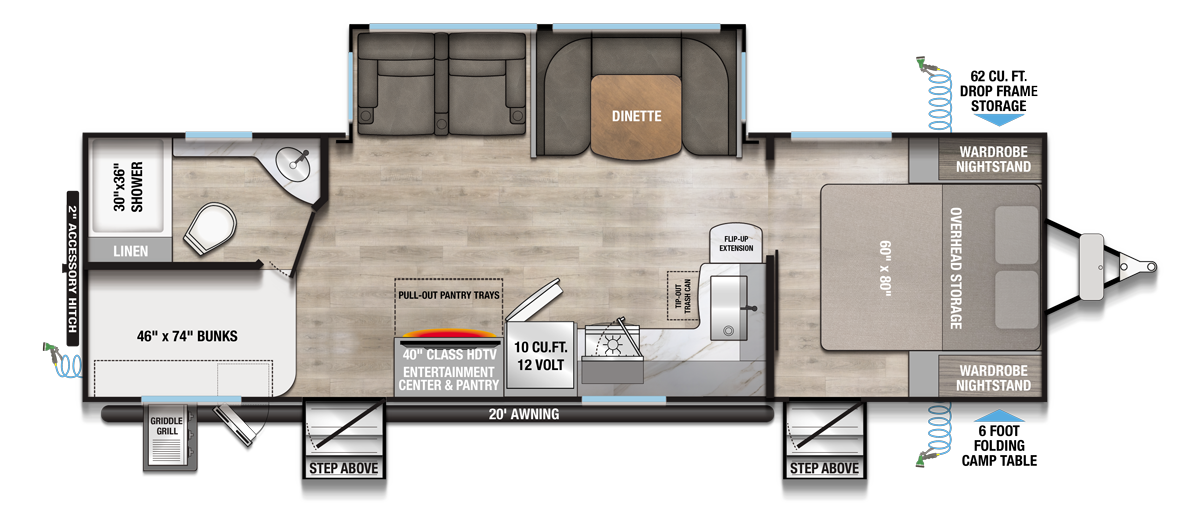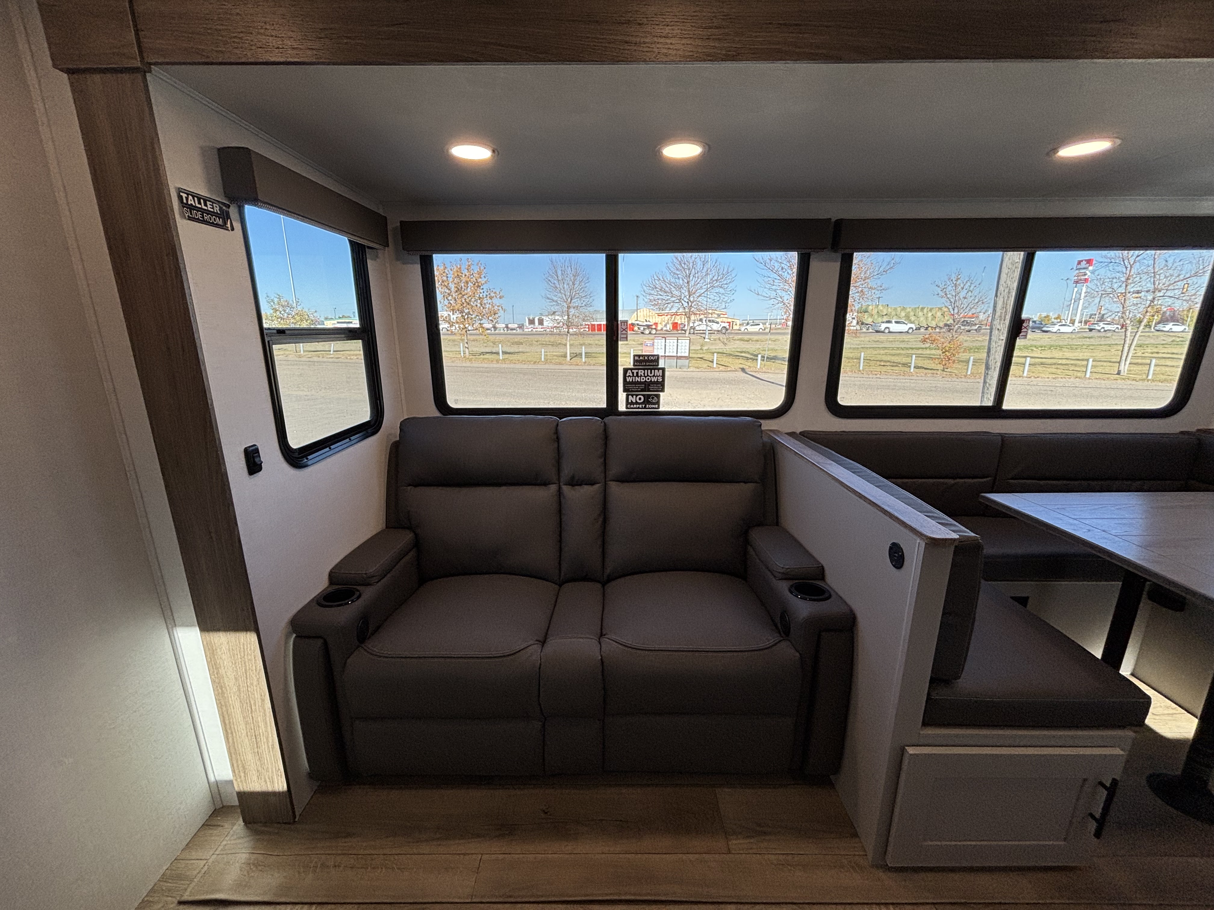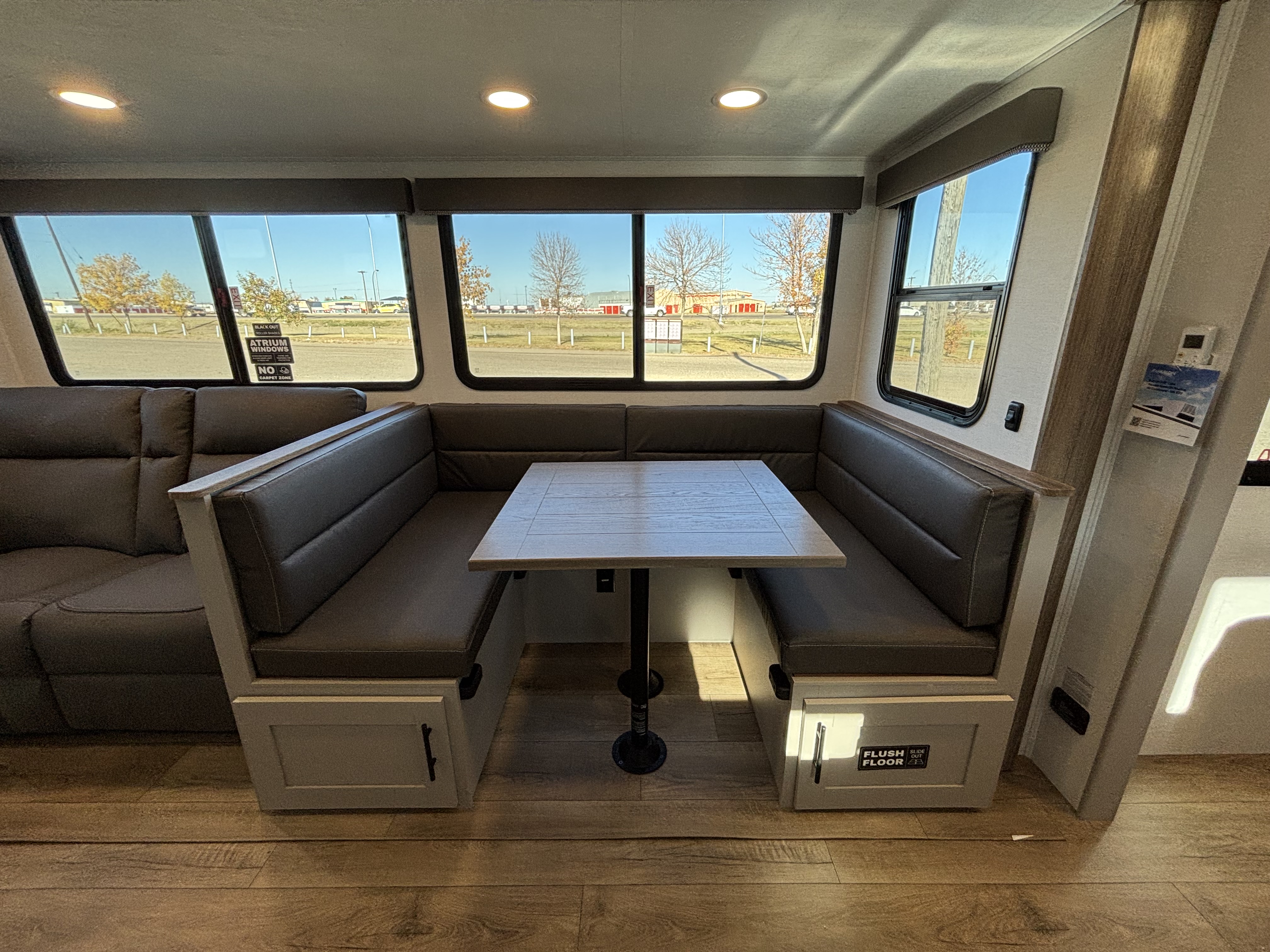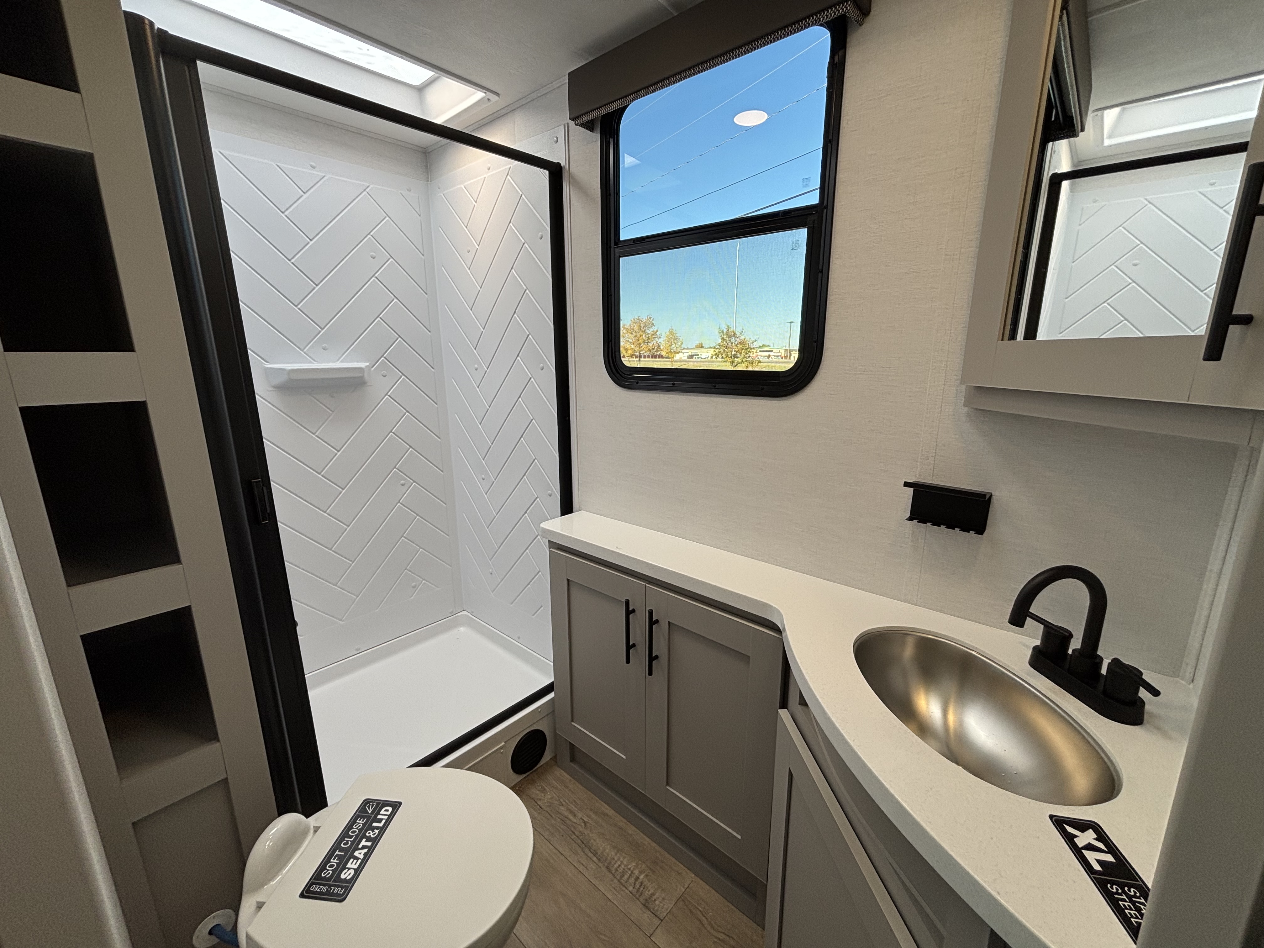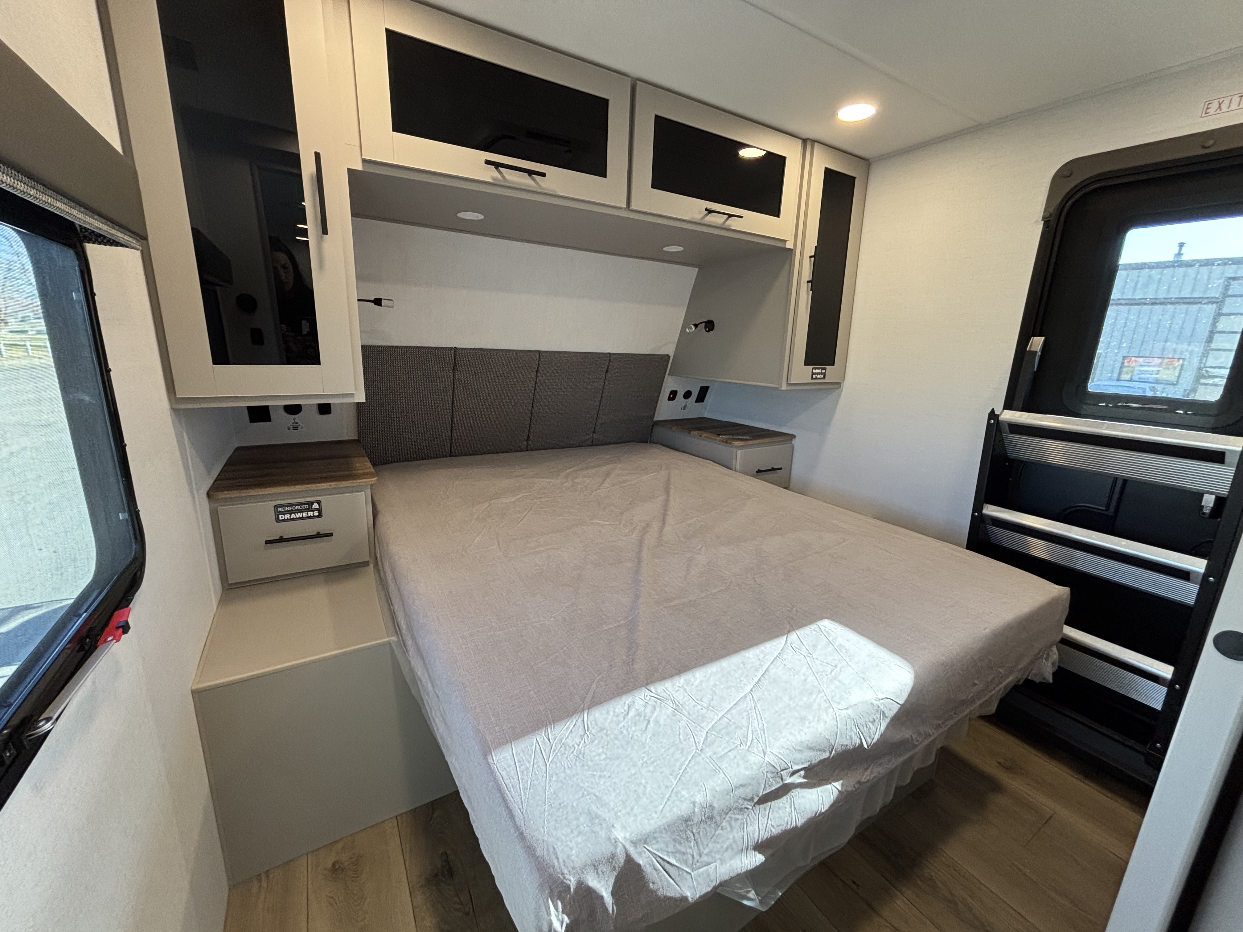 The Delta 281BH is an exceptional family camper that offers the convenience of bunk beds. This stunning model not only provides a private bedroom with a queen-sized mattress, dual wardrobes, and overhead storage, but also caters to the kids' needs. With dual entry doors on each end of the camper, the flow of traffic is seamless and convenient. At the back end of the camper, you'll find a full bathroom that remains accessible even when the slides are in. The living room is designed for relaxation, featuring a sofa slide where you can comfortably watch your favorite shows on the 40" HDTV. In the well-equipped kitchen, all the essentials are at your fingertips, including a 12-volt refrigerator, a 3-burner stovetop and oven, a residential microwave, an industrial sink with a pull-out trash can, and a flip-up extension that provides additional counter space. Opposite the kitchen, the U-shaped dinette offers a versatile space for card games with friends or can be converted into an extra bed when needed.