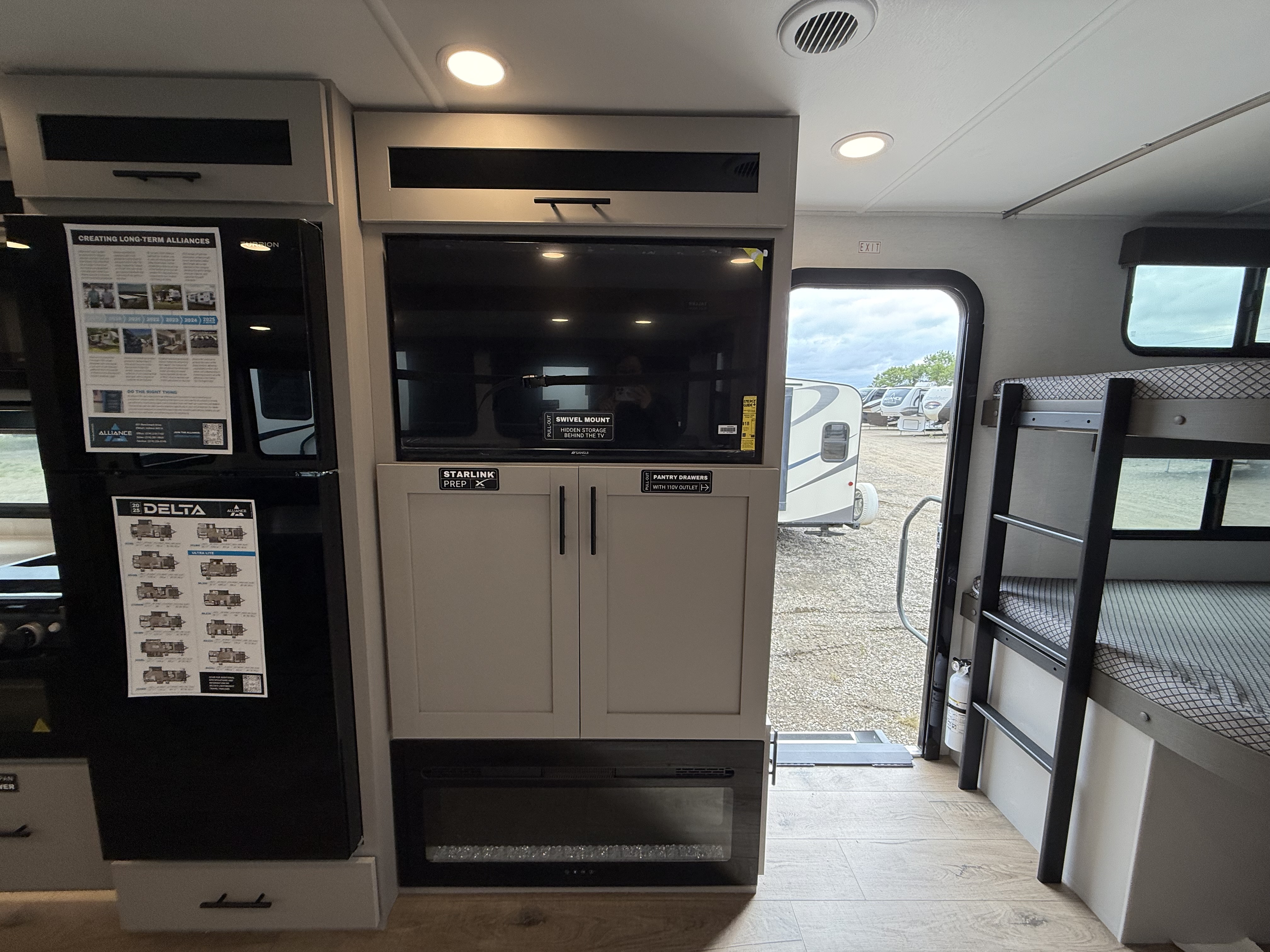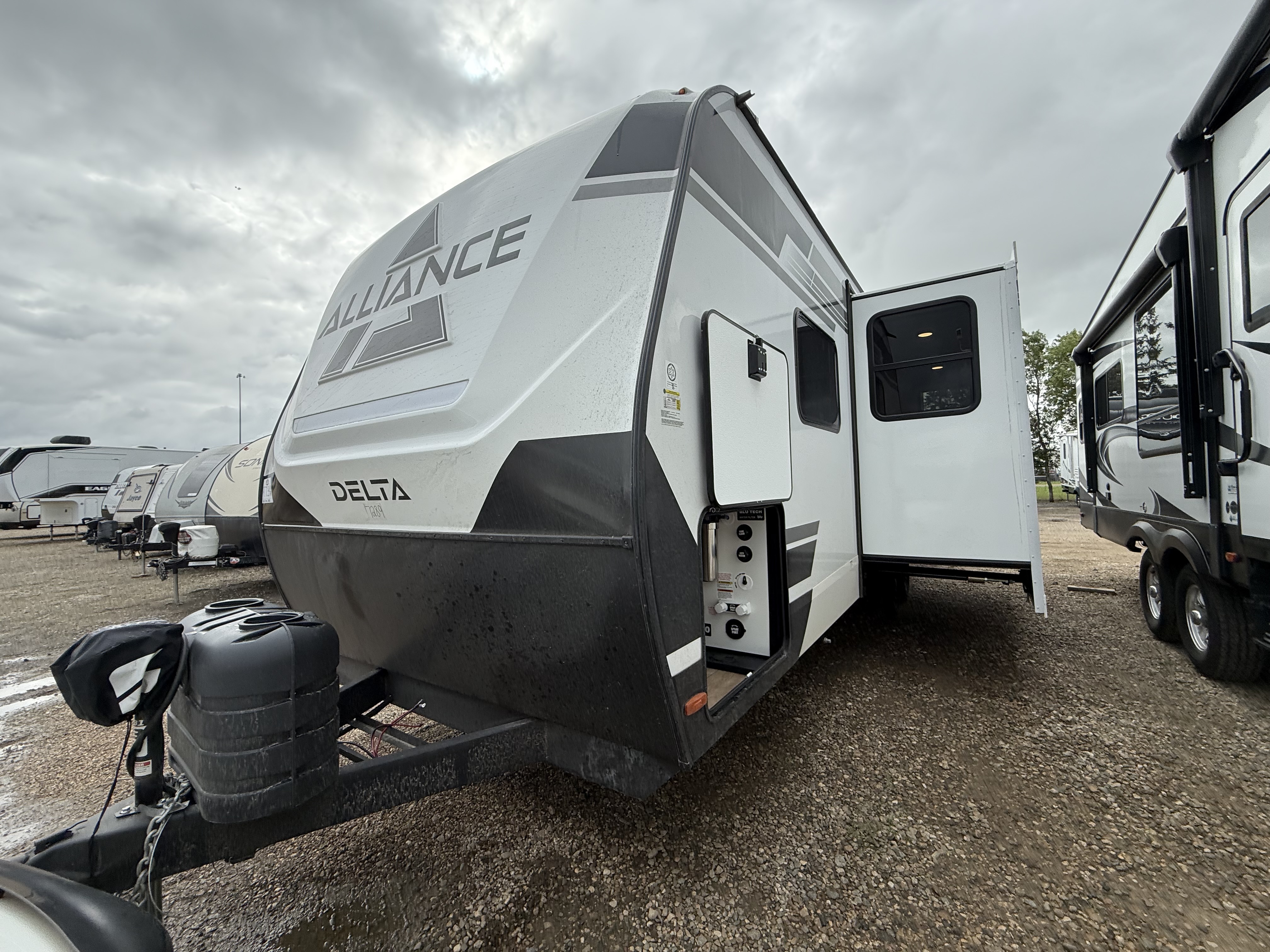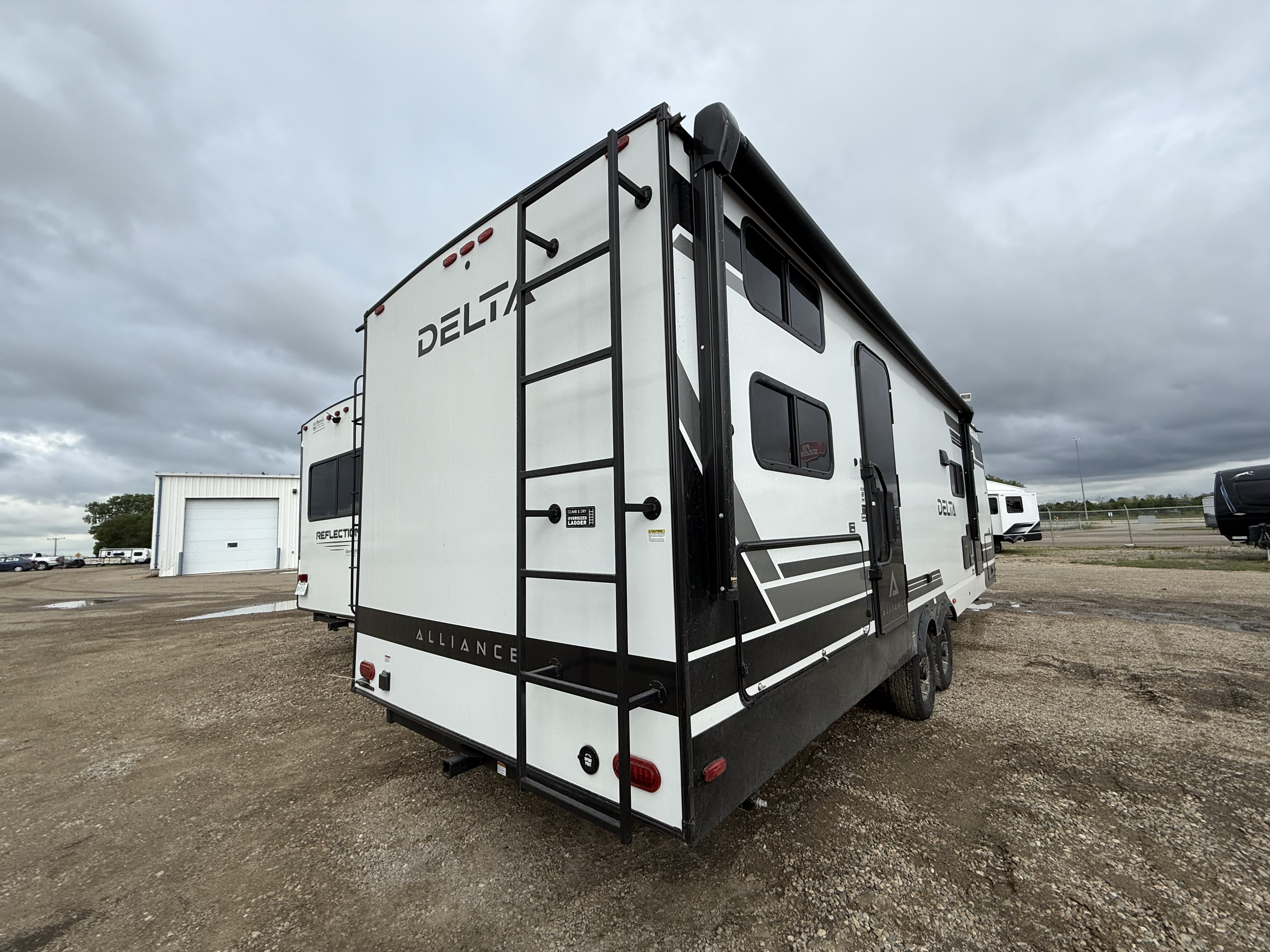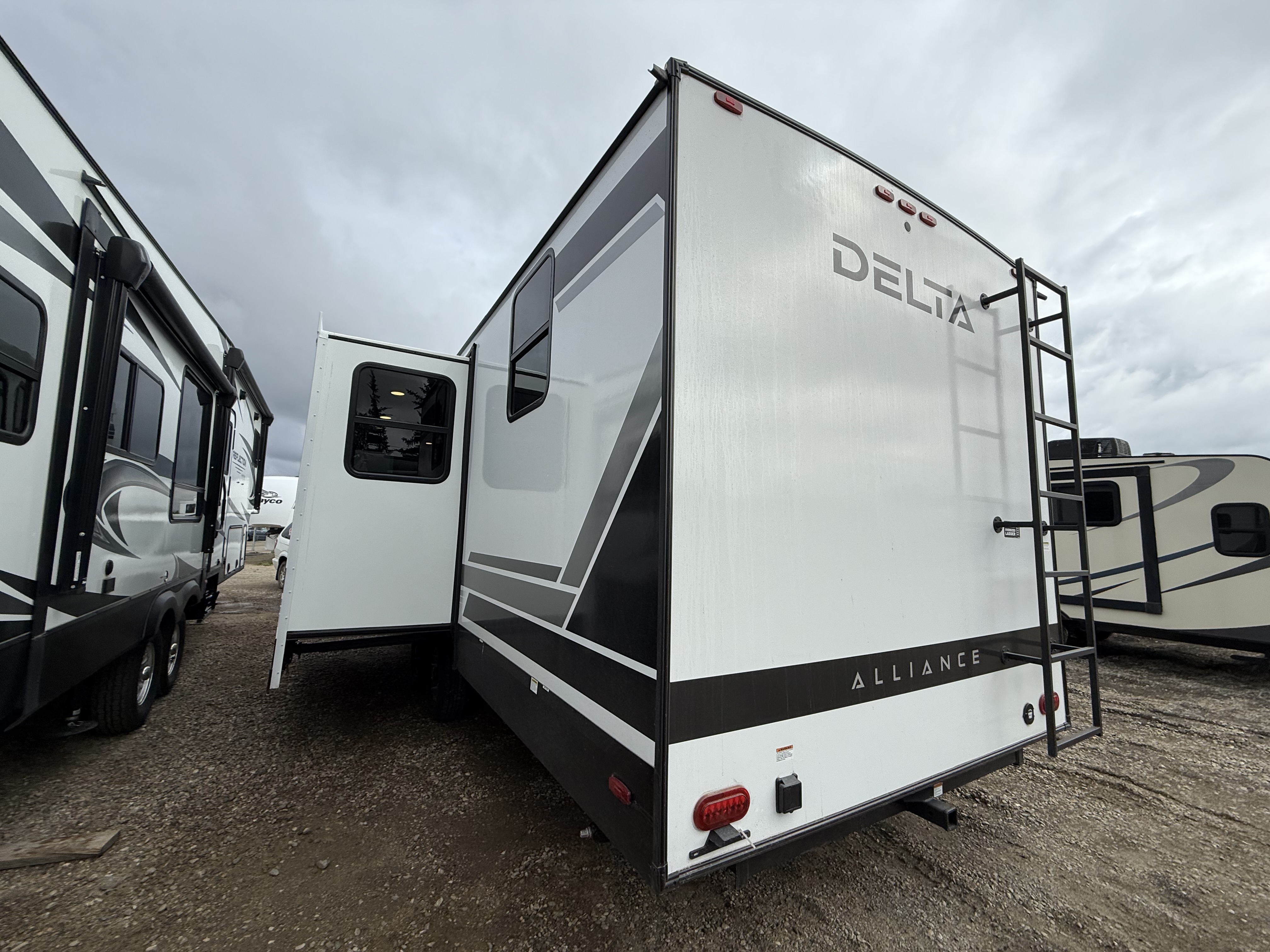 The Delta 281BH is an exceptional family camper that offers the convenience of bunk beds. This stunning model not only provides a private bedroom with a queen-sized mattress, dual wardrobes, and overhead storage, but also caters to the kids' needs. With dual entry doors on each end of the camper, the flow of traffic is seamless and convenient. At the back end of the camper, you'll find a full bathroom that remains accessible even when the slides are in. The living room is designed for relaxation, featuring a sofa slide where you can comfortably watch your favorite shows on the 40" HDTV. In the well-equipped kitchen, all the essentials are at your fingertips, including a 12-volt refrigerator, a 3-burner stovetop and oven, a residential microwave, an industrial sink with a pull-out trash can, and a flip-up extension that provides additional counter space. Opposite the kitchen, the U-shaped dinette offers a versatile space for card games with friends or can be converted into an extra bed when needed.