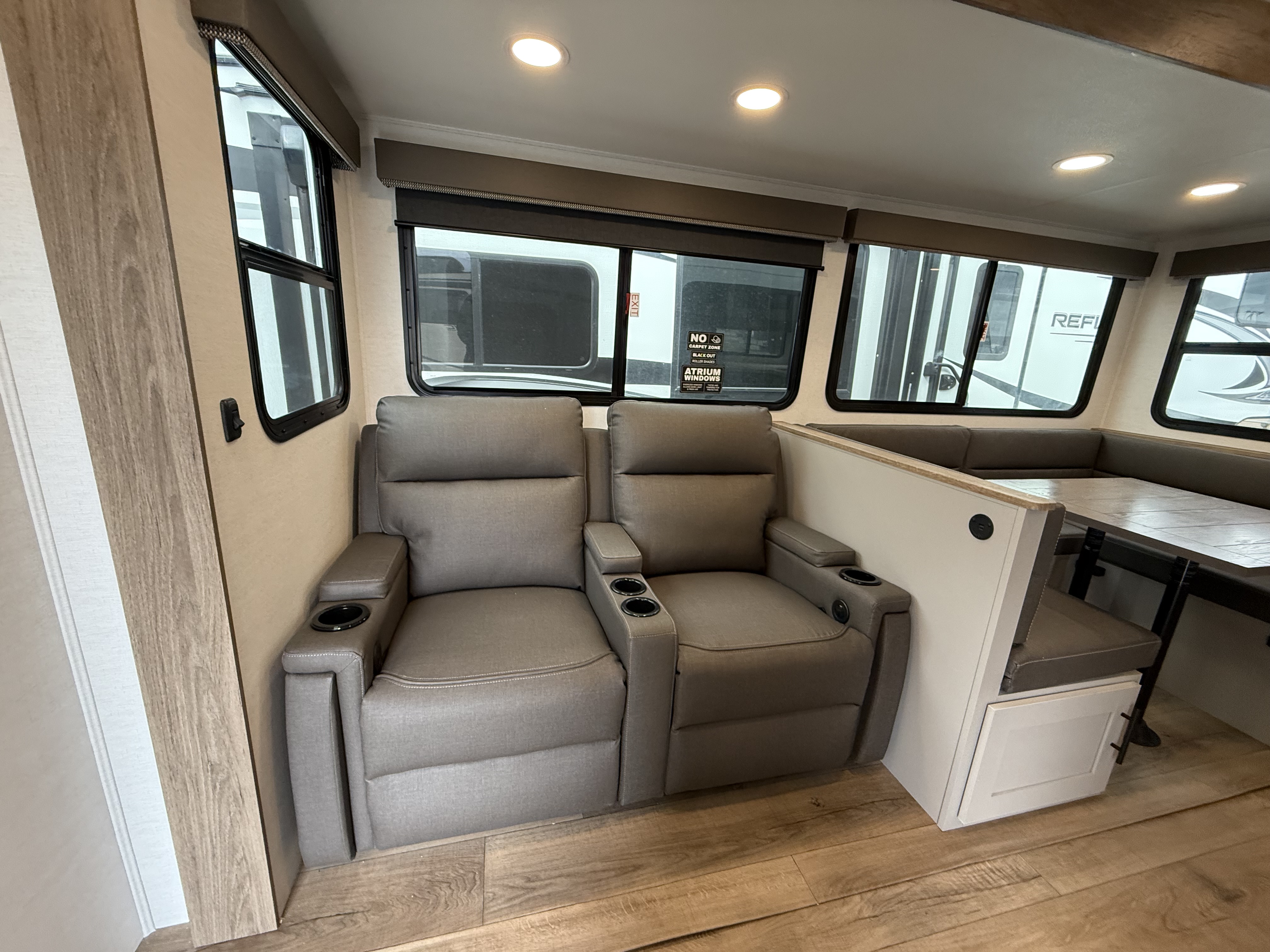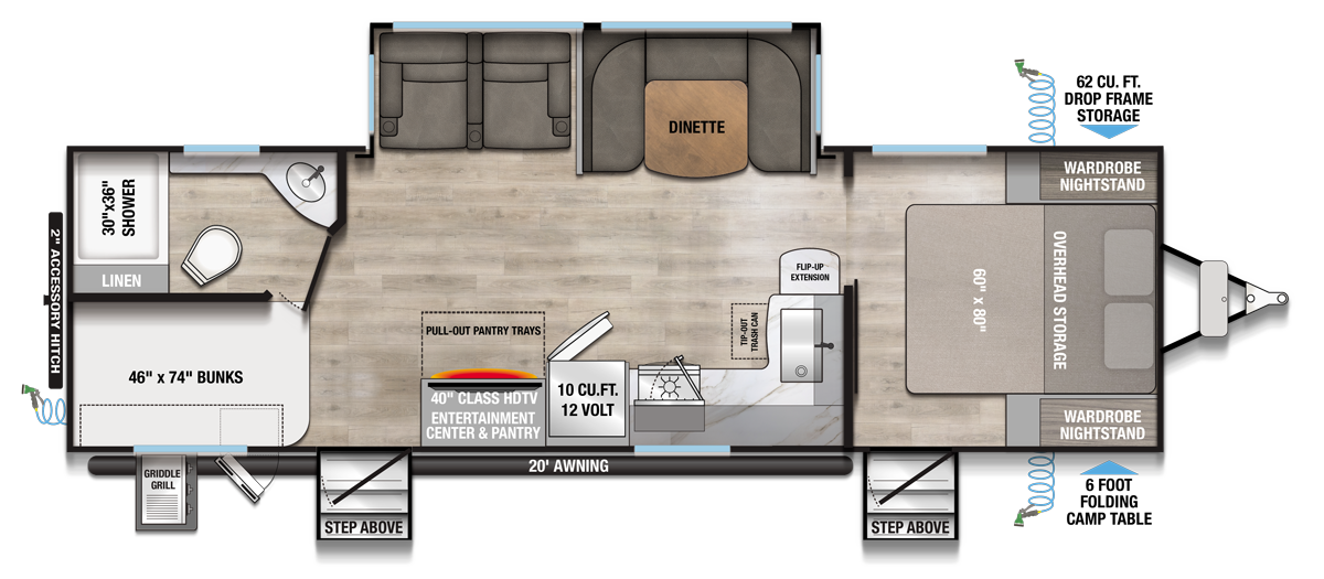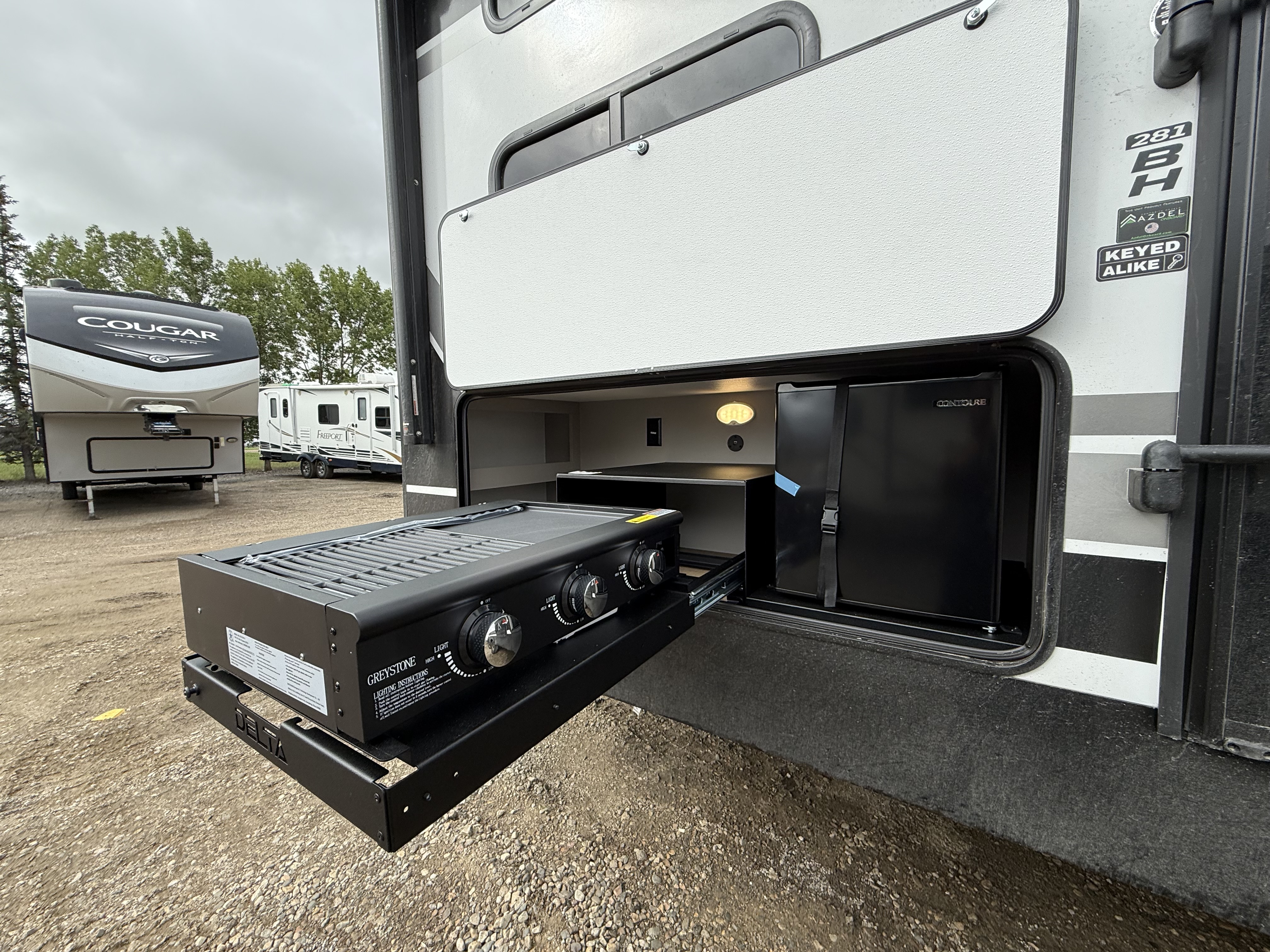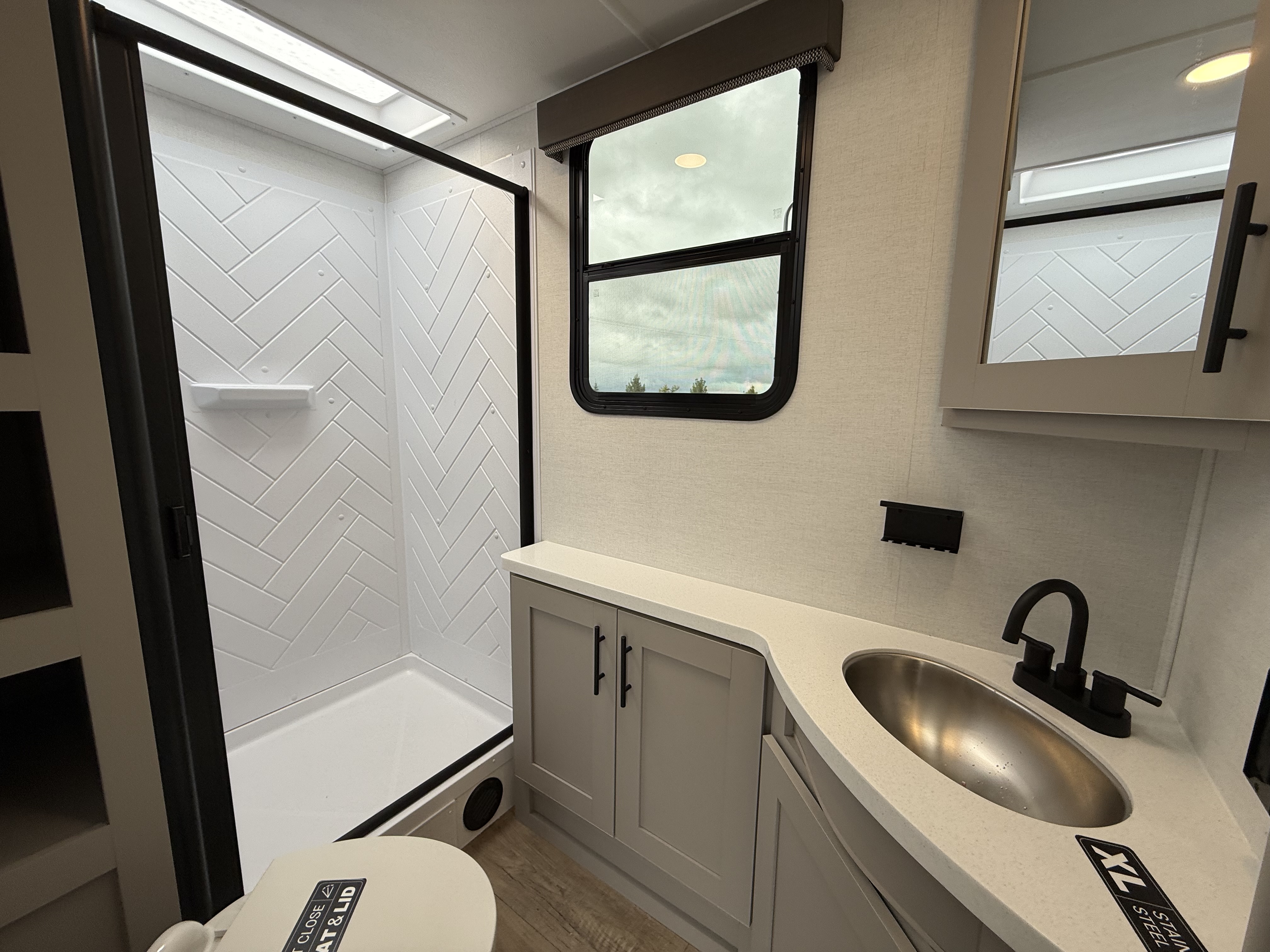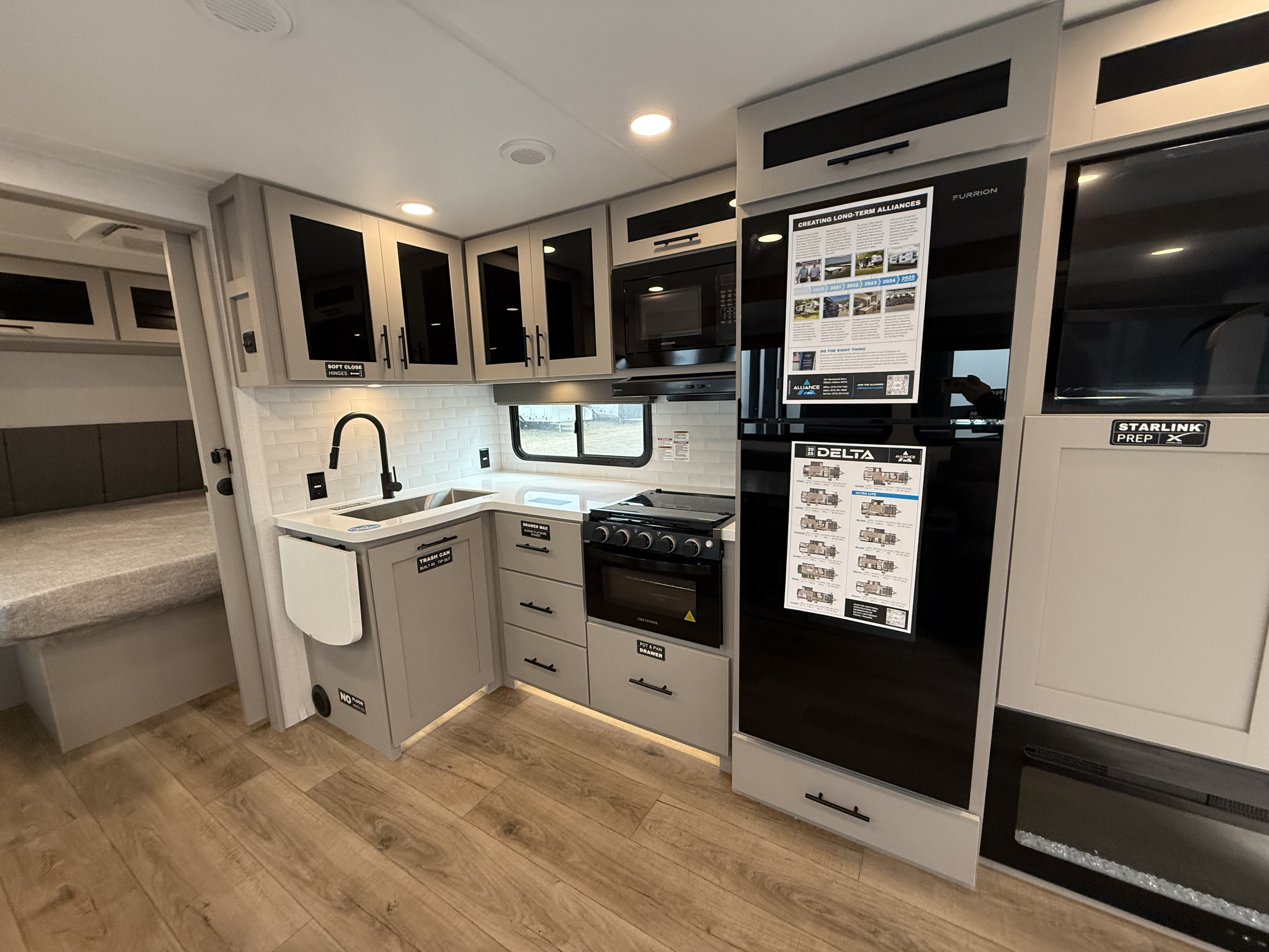 The Delta 281BH is an exceptional family camper that offers the convenience of bunk beds. This stunning model not only provides a private bedroom with a queen-sized mattress, dual wardrobes, and overhead storage, but also caters to the kids' needs. With dual entry doors on each end of the camper, the flow of traffic is seamless and convenient. At the back end of the camper, you'll find a full bathroom that remains accessible even when the slides are in. The living room is designed for relaxation, featuring a sofa slide where you can comfortably watch your favorite shows on the 40" HDTV. In the well-equipped kitchen, all the essentials are at your fingertips, including a 12-volt refrigerator, a 3-burner stovetop and oven, a residential microwave, an industrial sink with a pull-out trash can, and a flip-up extension that provides additional counter space. Opposite the kitchen, the U-shaped dinette offers a versatile space for card games with friends or can be converted into an extra bed when needed.