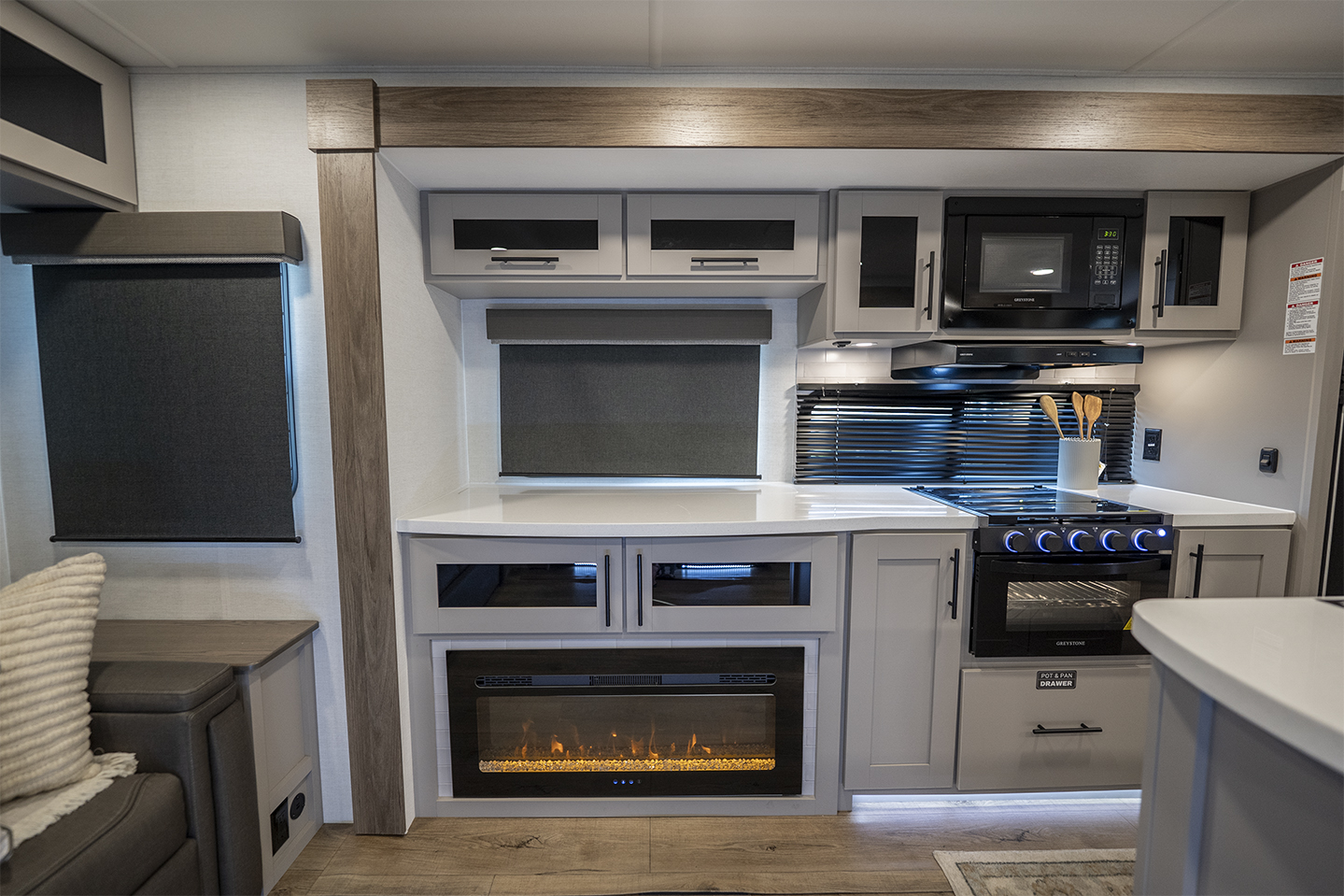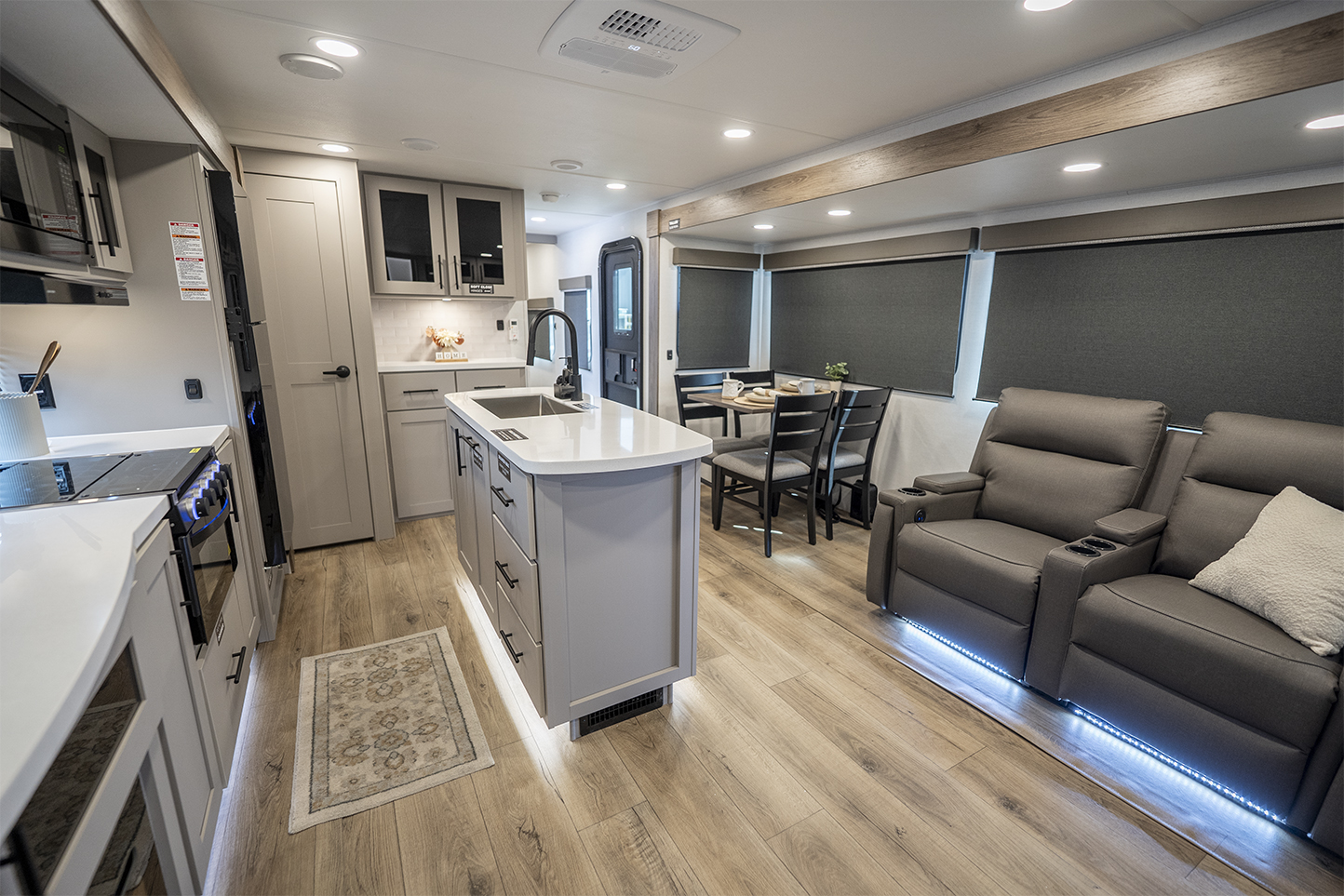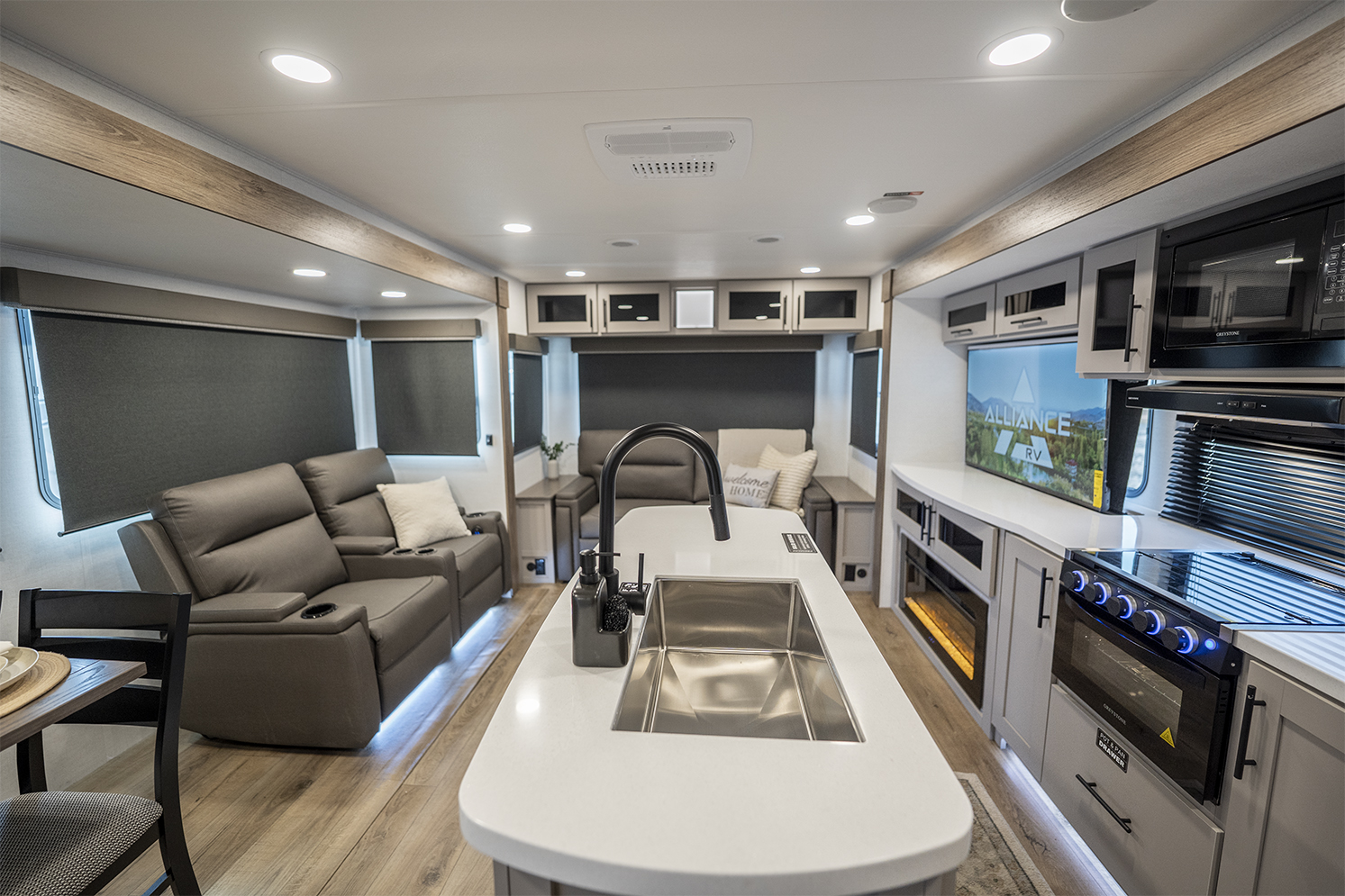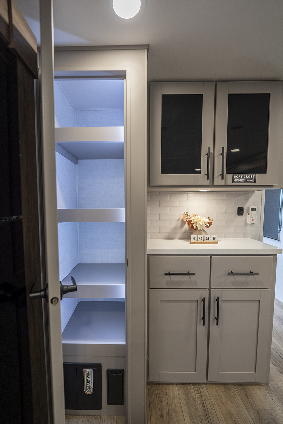 The Delta 292RL is a perfect choice for those who appreciate a comfortable and inviting living space. With a sleeper sofa on one side and a dual reclining loveseat on the other, maximum comfort is guaranteed. The same slide-out accommodates a free-standing dinette, ideal for enjoying meals or playing games. Enhancing the overall appeal is the entertainment center, directly across from the loveseat, featuring a 50" HDTV, a high-quality soundbar, and a convenient pull-out fireplace. When it comes to the kitchen, this unit offers a wide range of features. From the kitchen island with a sink and tip-out trash can to the three-burner stovetop, microwave, 12-volt refrigerator, and pantry, you'll find everything you need for culinary convenience. There's no shortage of amenities here! On the way to the bedroom, you'll discover a full bathroom that boasts a spacious shower and a porcelain toilet. The master suite is equipped with a comfortable queen-sized bed and offers ample storage space with bedside wardrobes and overhead bins.