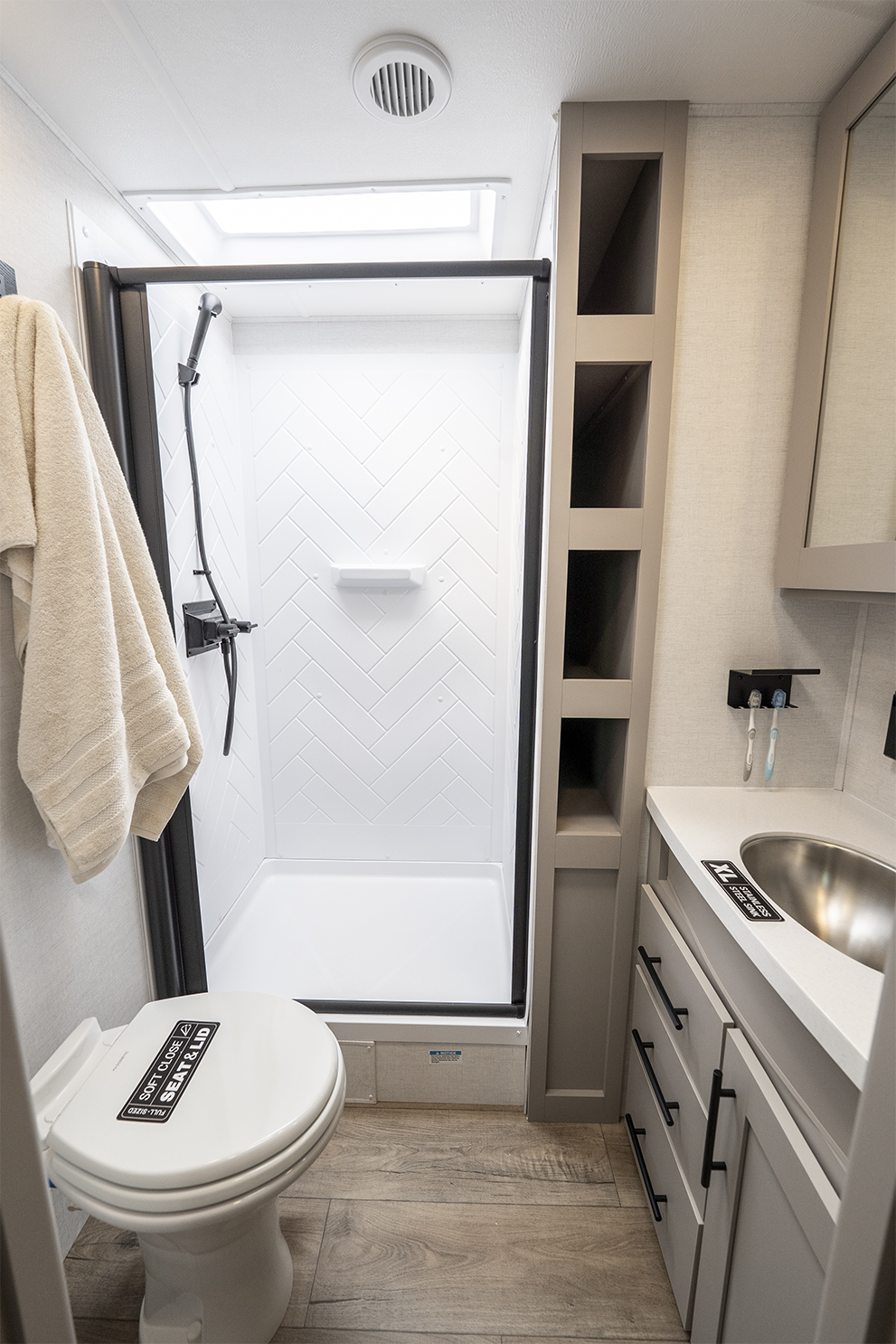 - Full width exterior ladder with built in towel rack
