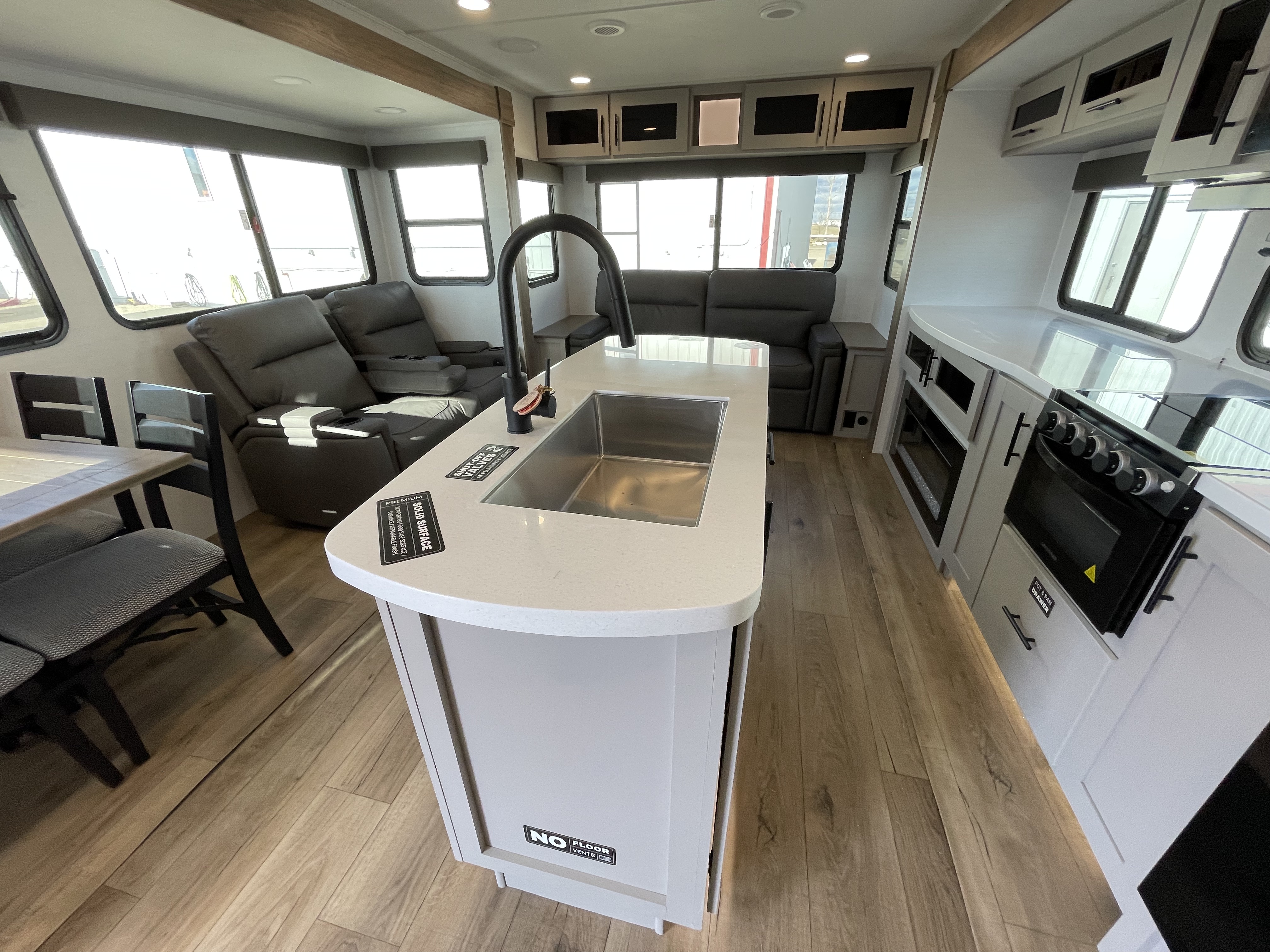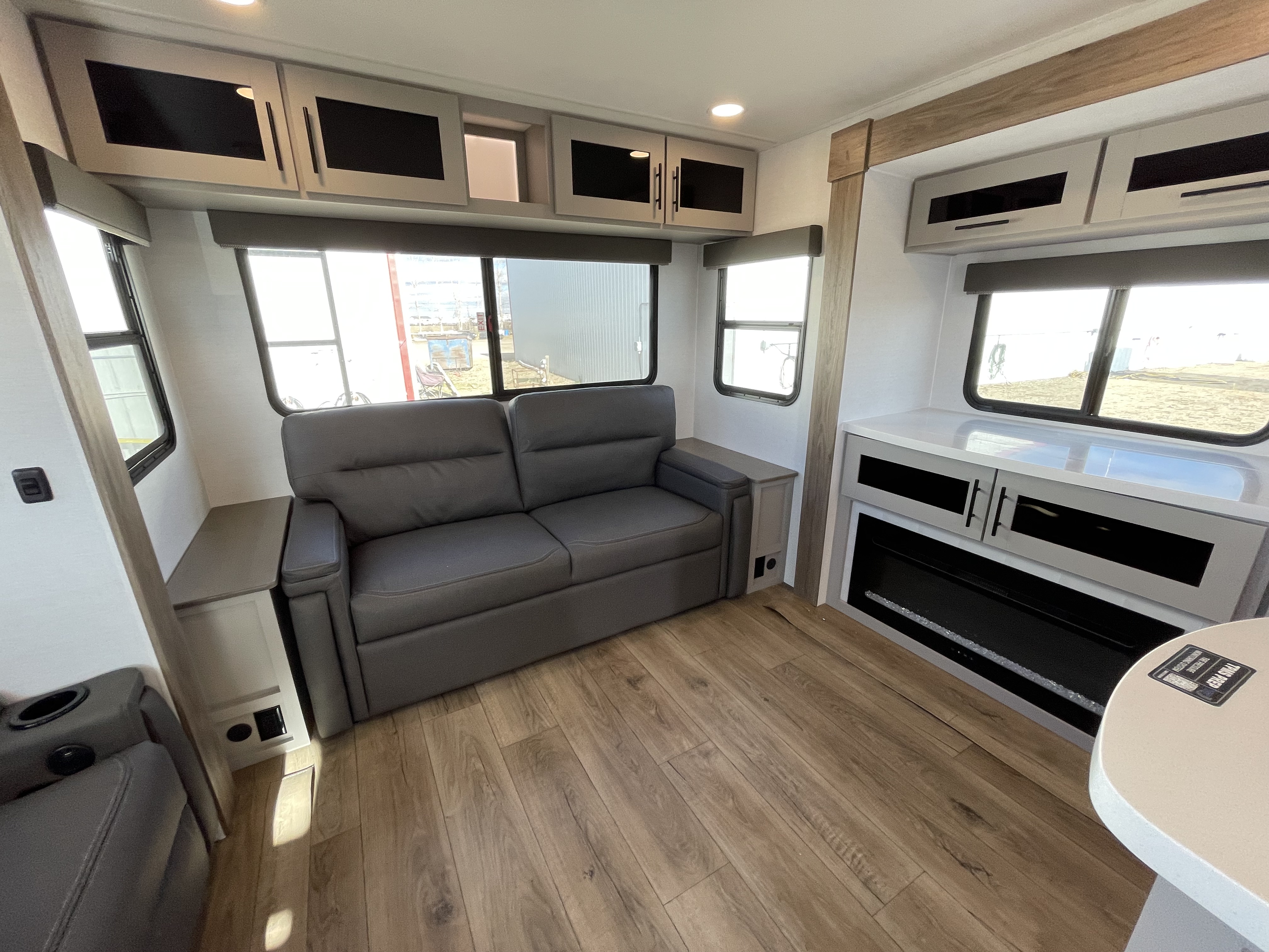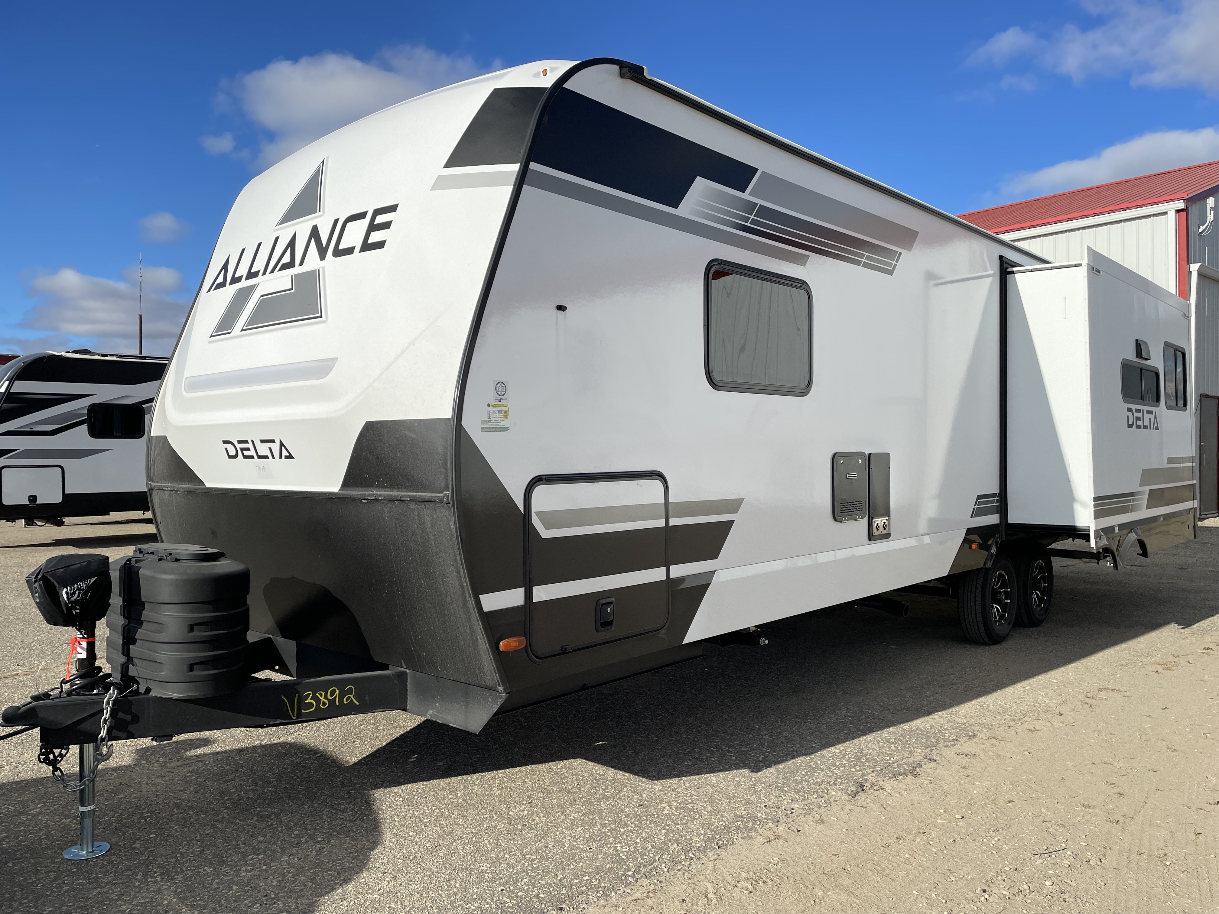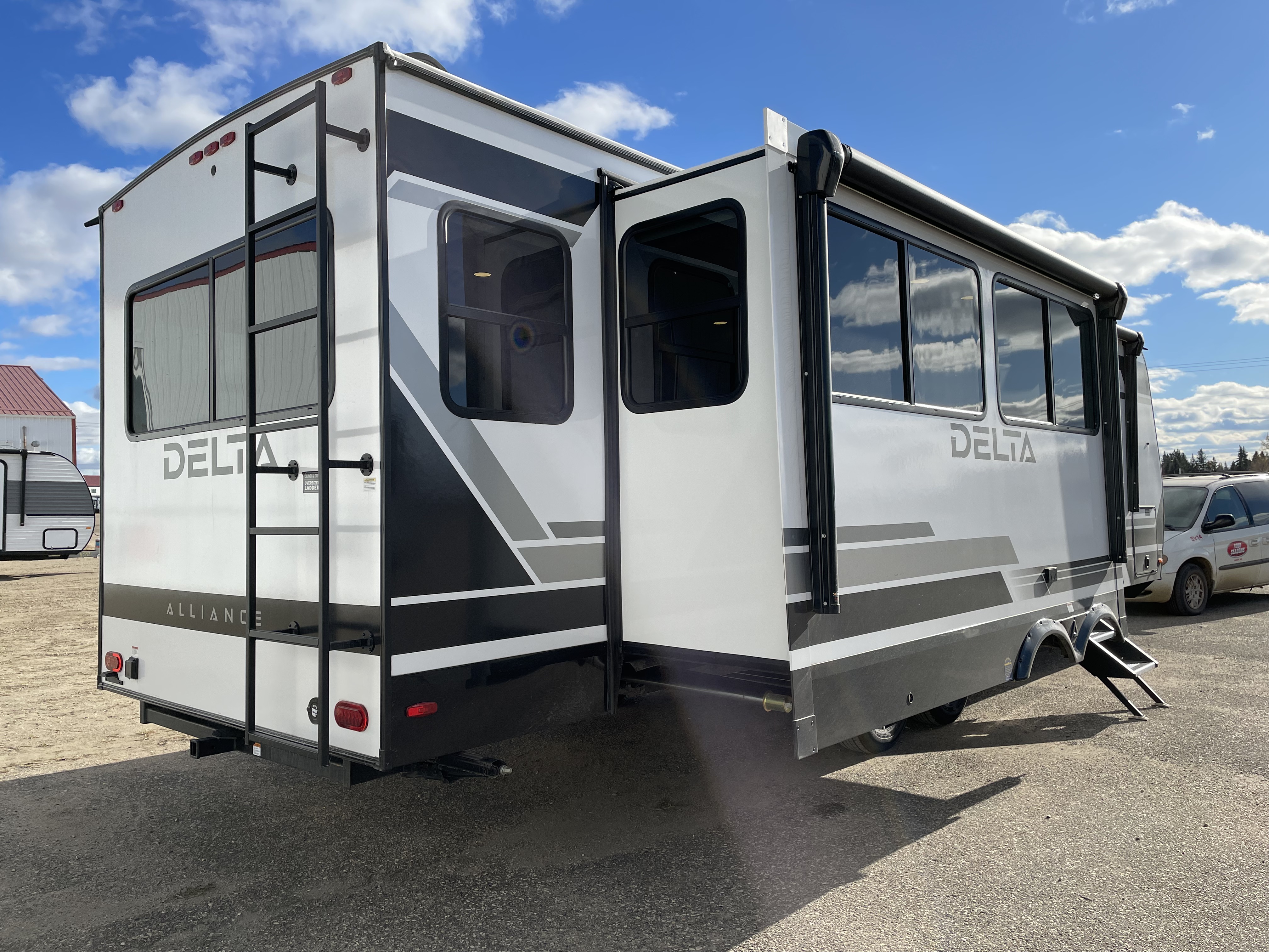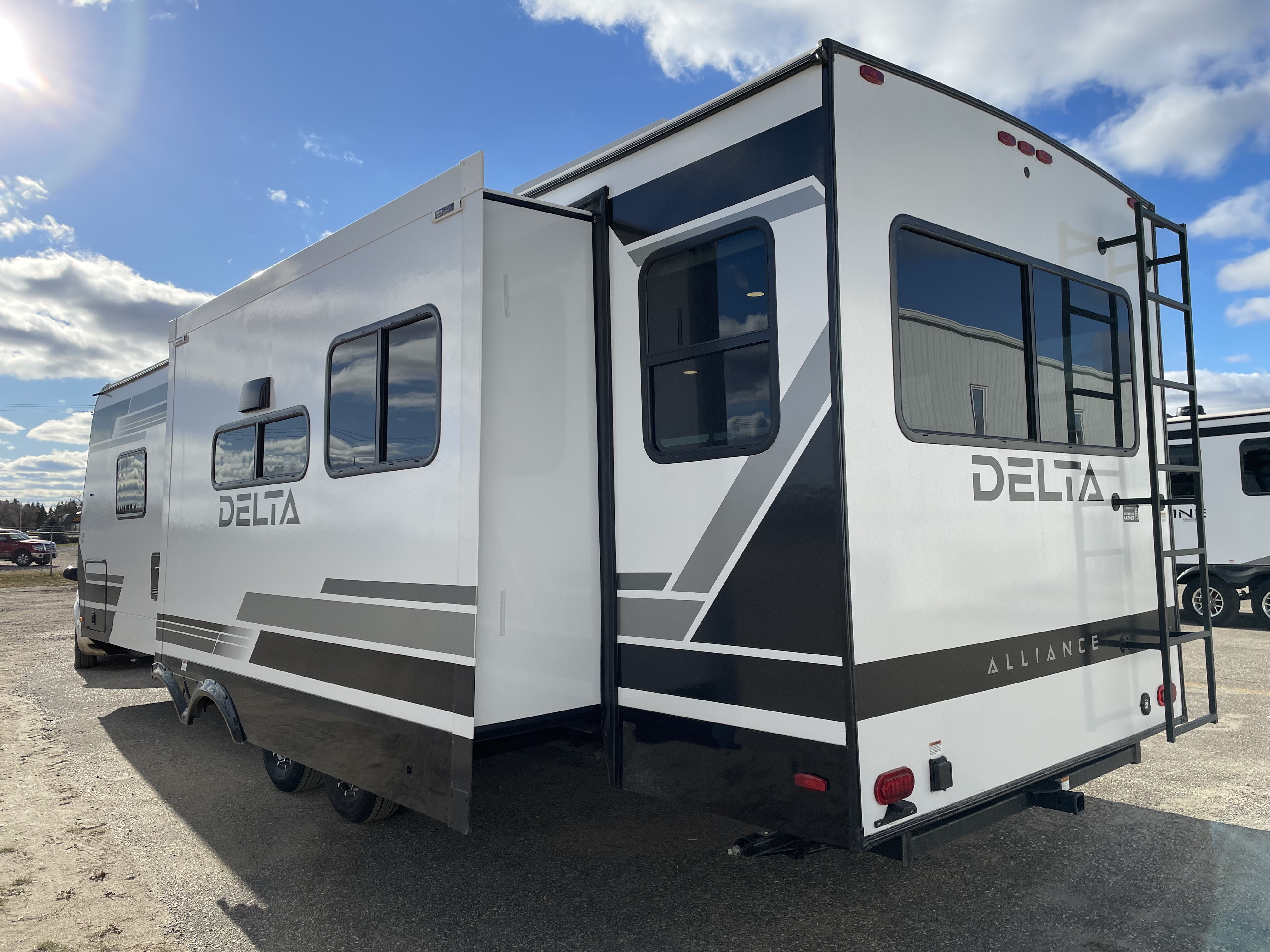 The Delta 292RL is a perfect choice for those who appreciate a comfortable and inviting living space. With a sleeper sofa on one side and a dual reclining loveseat on the other, maximum comfort is guaranteed. The same slide-out accommodates a free-standing dinette, ideal for enjoying meals or playing games. Enhancing the overall appeal is the entertainment center, directly across from the loveseat, featuring a 50" HDTV, a high-quality soundbar, and a convenient pull-out fireplace. When it comes to the kitchen, this unit offers a wide range of features. From the kitchen island with a sink and tip-out trash can to the three-burner stovetop, microwave, 12-volt refrigerator, and pantry, you'll find everything you need for culinary convenience. There's no shortage of amenities here! On the way to the bedroom, you'll discover a full bathroom that boasts a spacious shower and a porcelain toilet. The master suite is equipped with a comfortable queen-sized bed and offers ample storage space with bedside wardrobes and overhead bins.