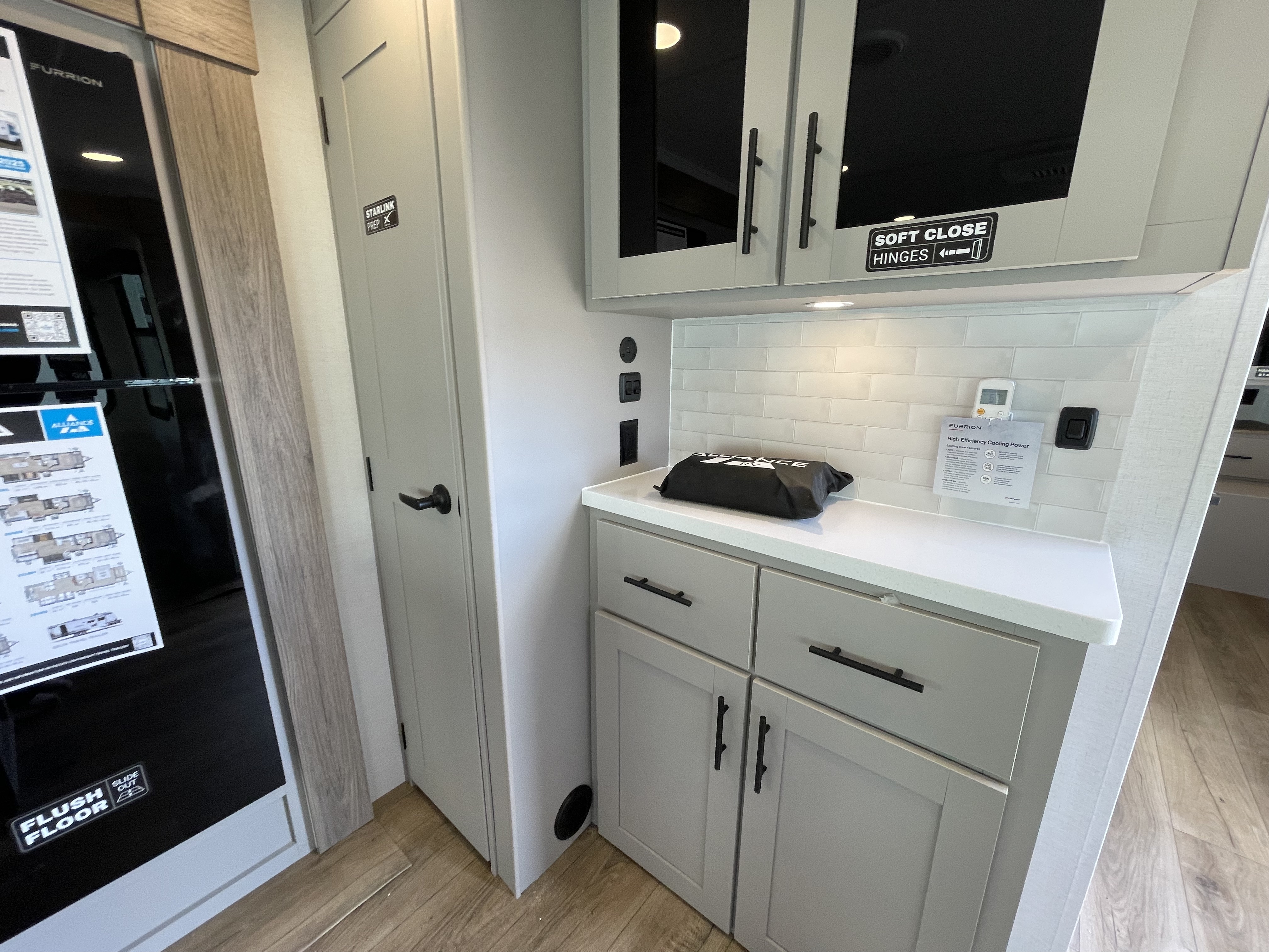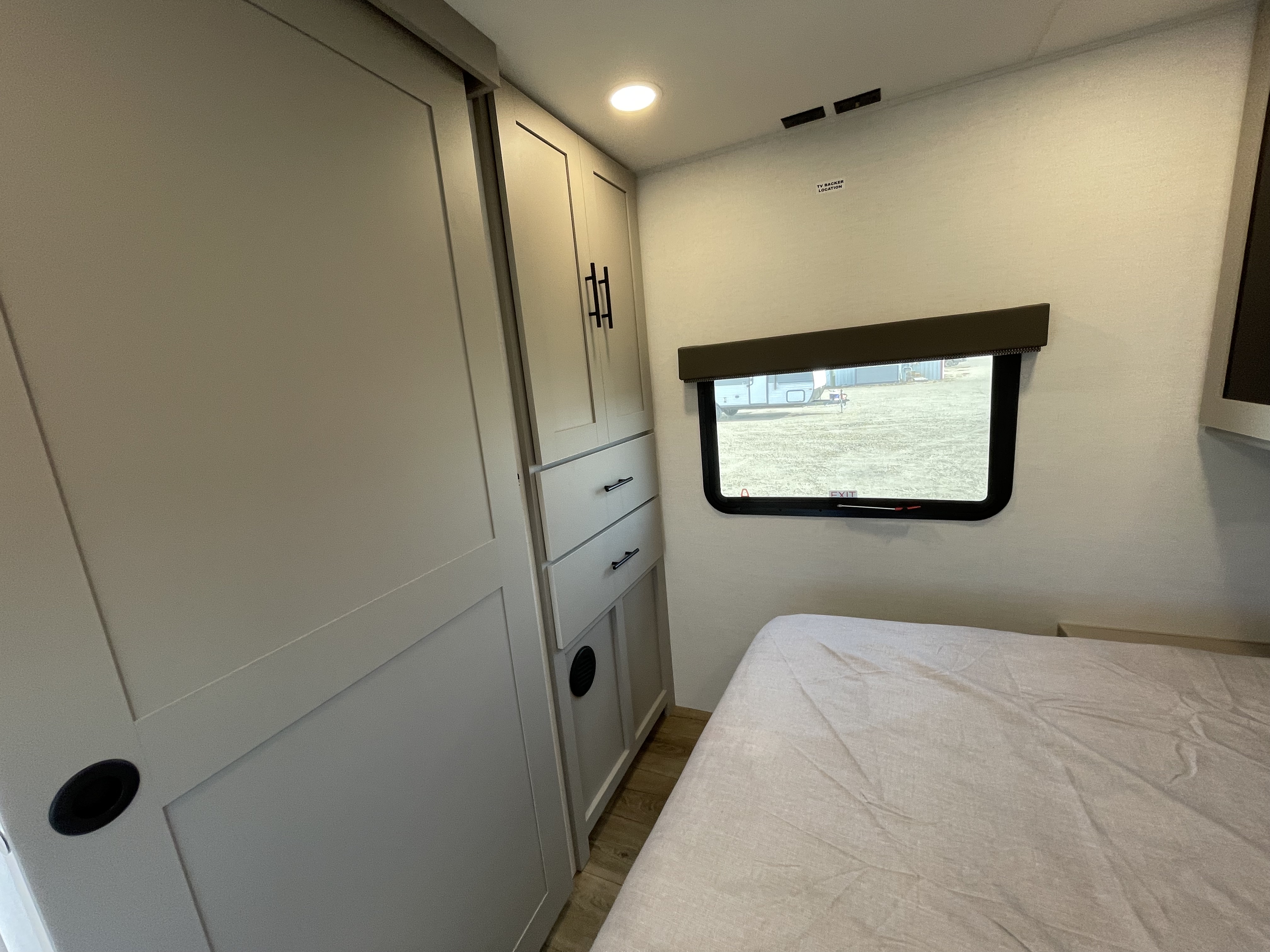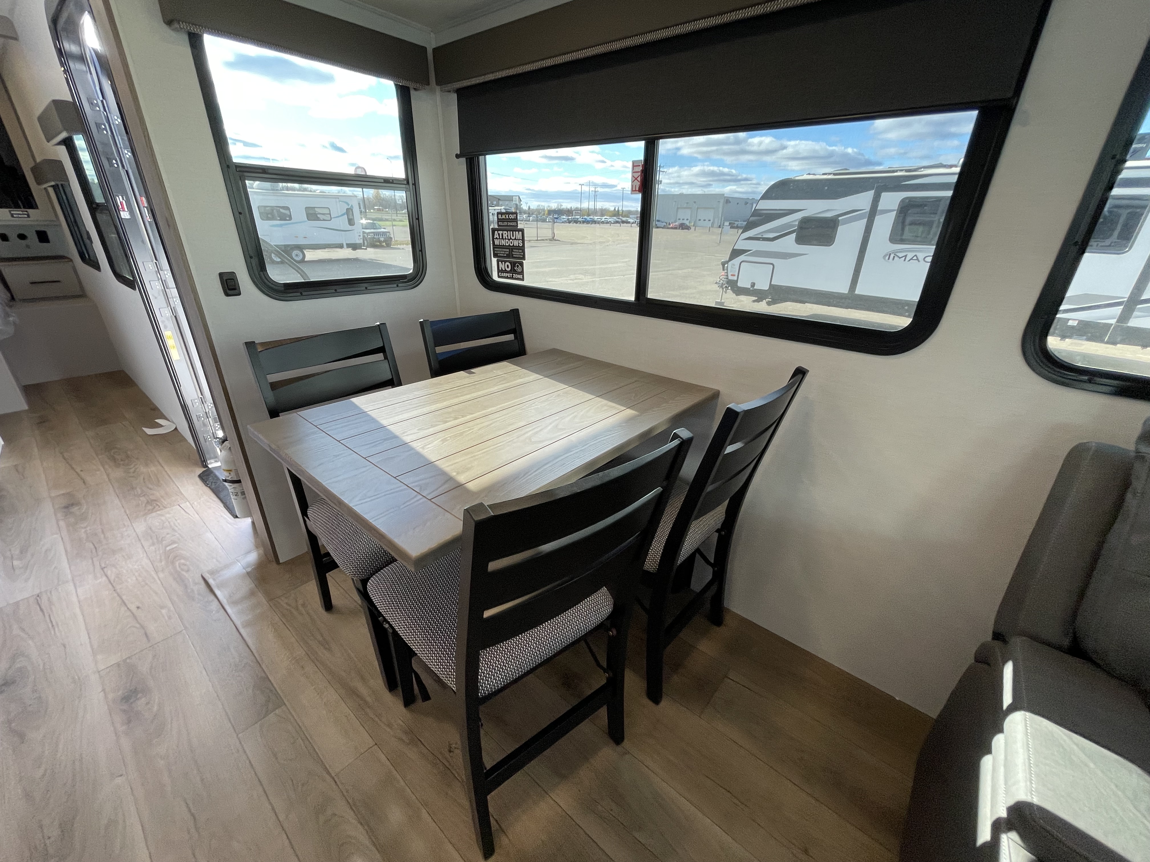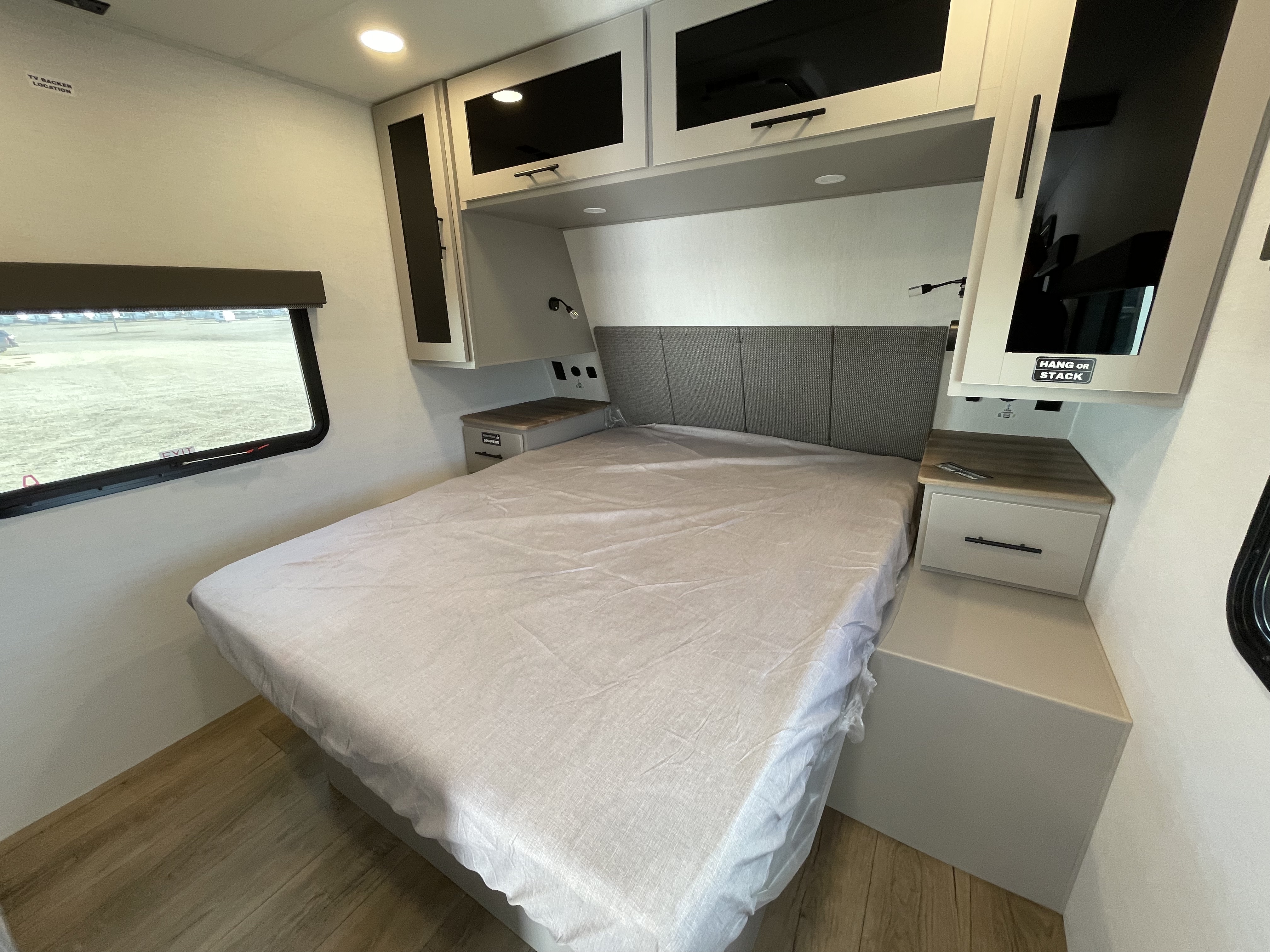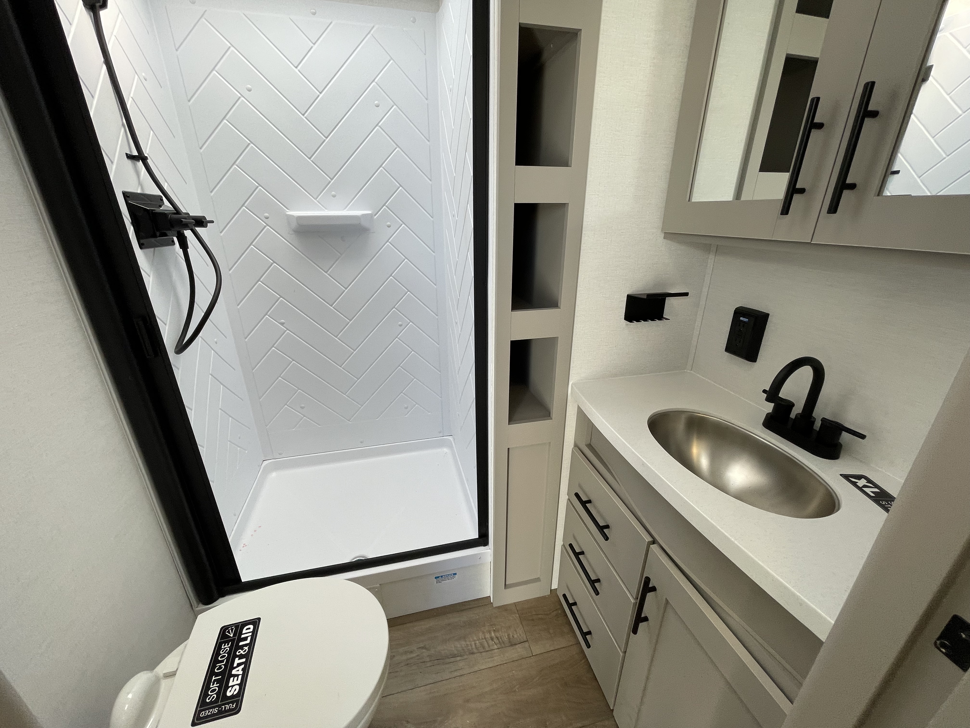 The Delta 292RL is a perfect choice for those who appreciate a comfortable and inviting living space. With a sleeper sofa on one side and a dual reclining loveseat on the other, maximum comfort is guaranteed. The same slide-out accommodates a free-standing dinette, ideal for enjoying meals or playing games. Enhancing the overall appeal is the entertainment center, directly across from the loveseat, featuring a 50" HDTV, a high-quality soundbar, and a convenient pull-out fireplace. When it comes to the kitchen, this unit offers a wide range of features. From the kitchen island with a sink and tip-out trash can to the three-burner stovetop, microwave, 12-volt refrigerator, and pantry, you'll find everything you need for culinary convenience. There's no shortage of amenities here! On the way to the bedroom, you'll discover a full bathroom that boasts a spacious shower and a porcelain toilet. The master suite is equipped with a comfortable queen-sized bed and offers ample storage space with bedside wardrobes and overhead bins.