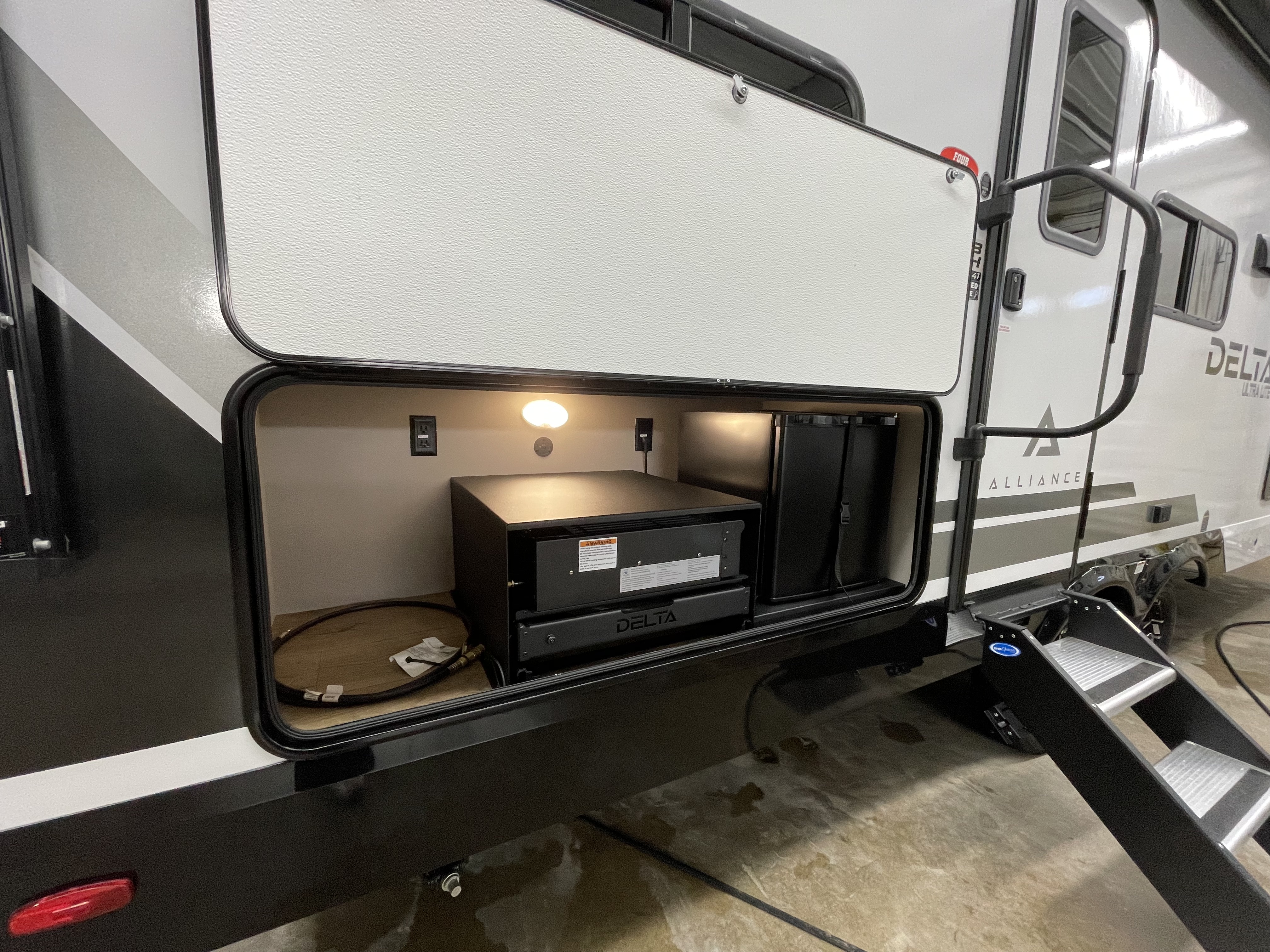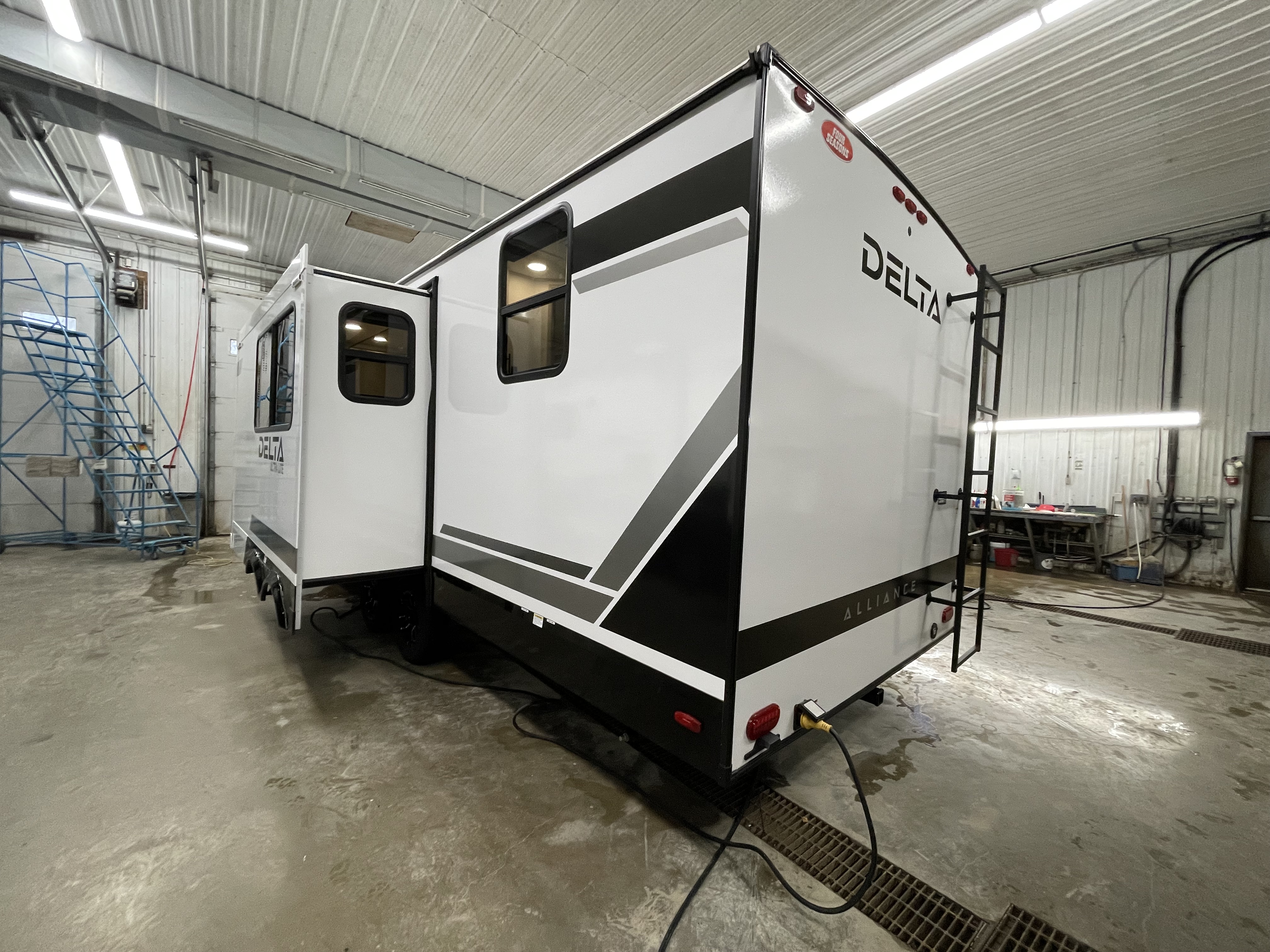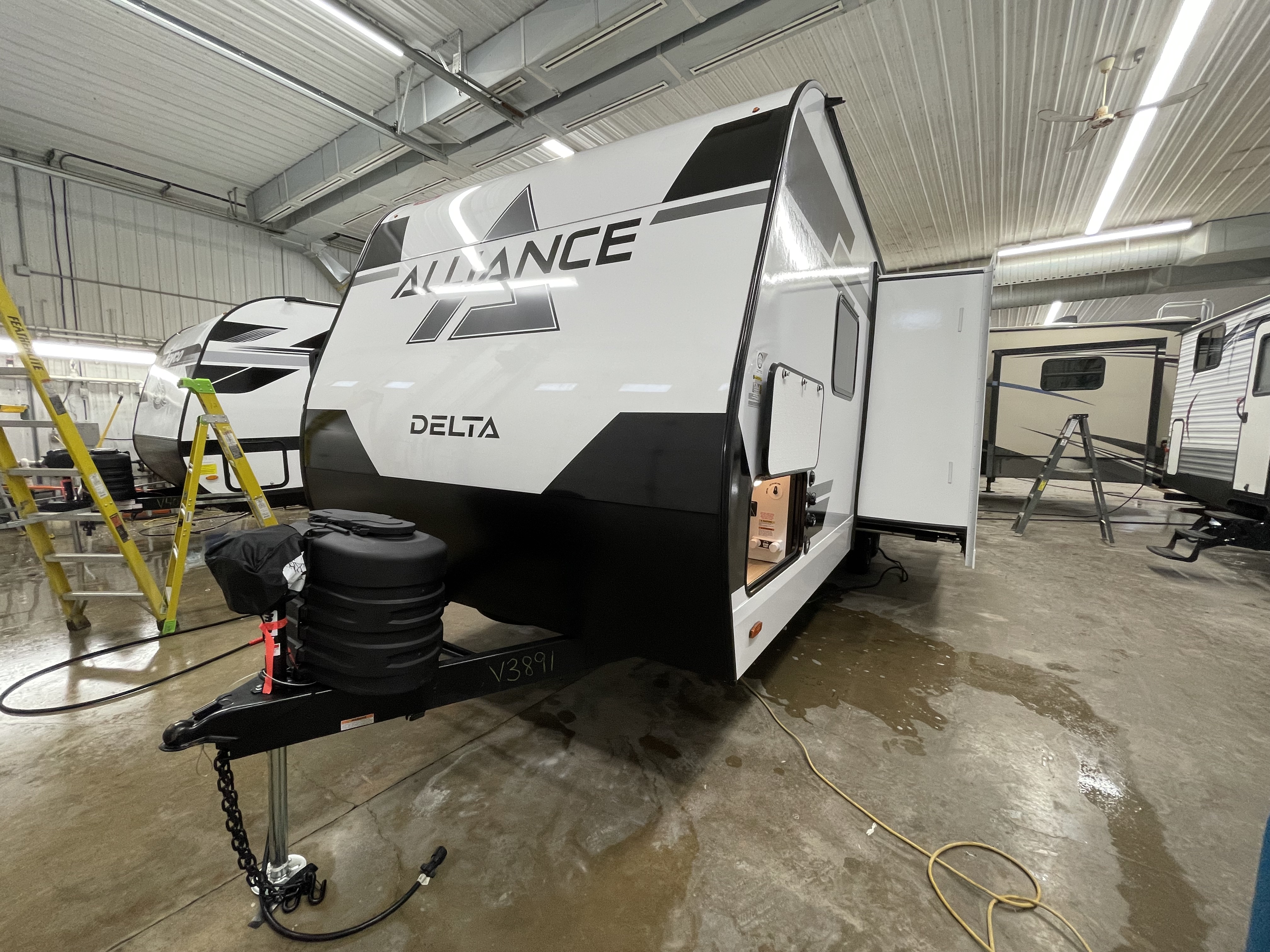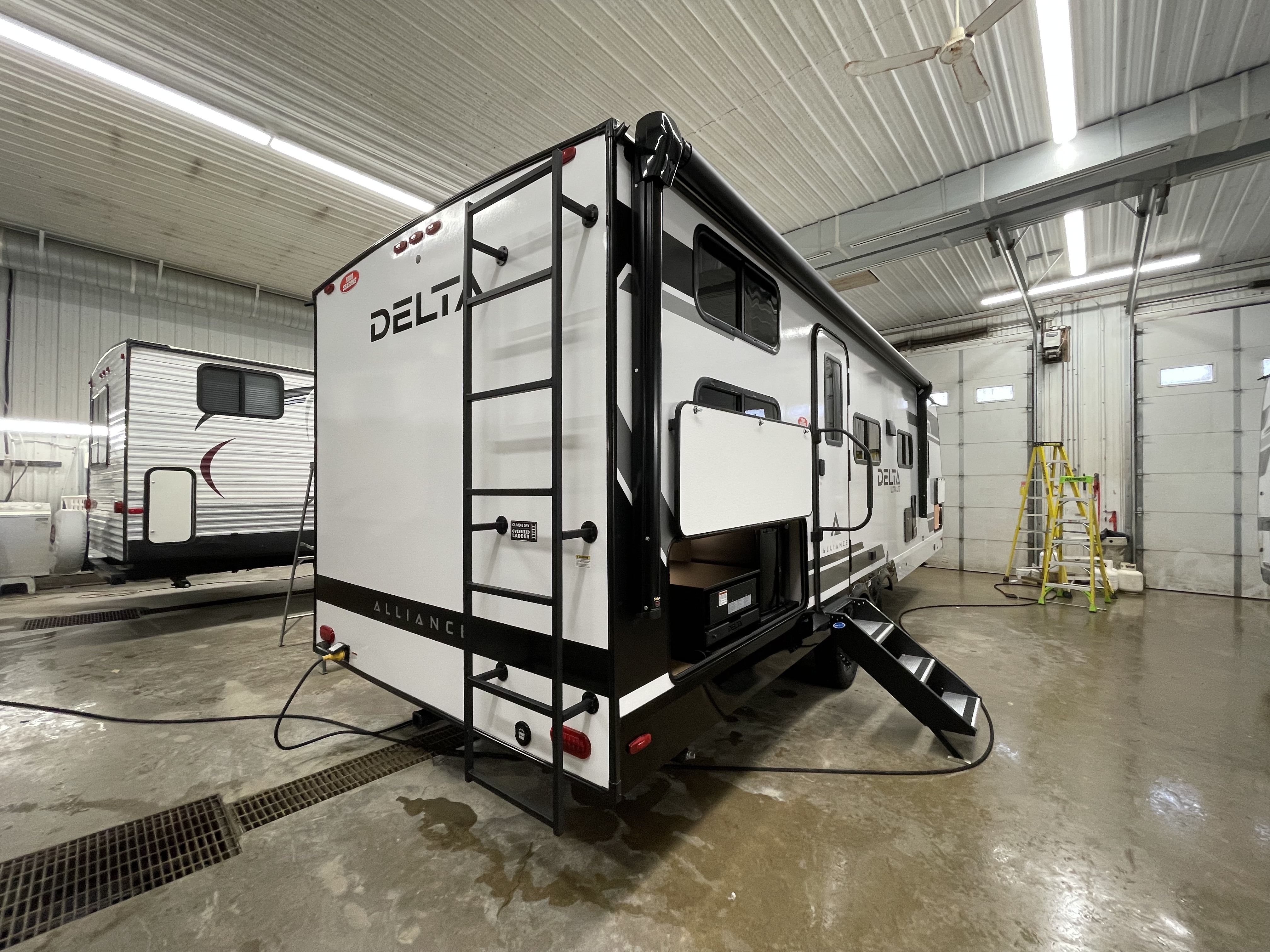 The Alliance RV Delta Ultra Lite travel trailer BH241 is a couple's trailer perfect for weekend trips. It includes a theater seat slide, fireplace, three burner cooktop, and front queen bed. The full bath has a toilet, sink, 32" shower, and linen closet. Storage with dual wardrobes, nightstands, and overhead storage. The Delta Ultra Lite BH241 is a family-friendly travel trailer designed for comfort and lightweight convenience. It is 29 feet 5 inches long and weighs 5,800 pounds, perfect for family adventures.19-foot awning, booth dinette, ample storage, bedroom, and rear bunkhouse. The exterior features of the Delta Ultra Lite travel trailer include oversized atrium windows, a carpet-free interior, magnet catches on cabinets, soft close cabinet doors, LED lighting, temperature-controlled spray ports, exterior awning controls, a 2" rear accessory hitch, and Goodyear Endurance tires.
