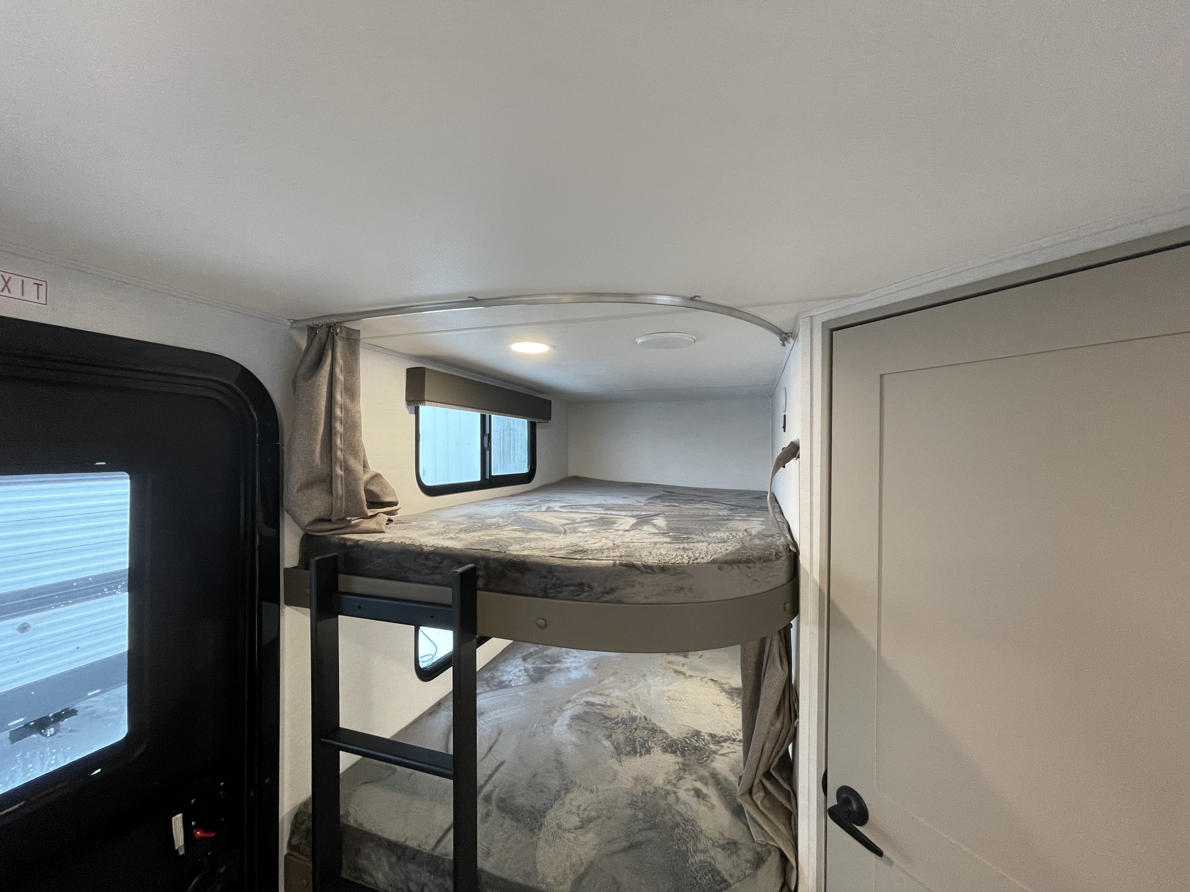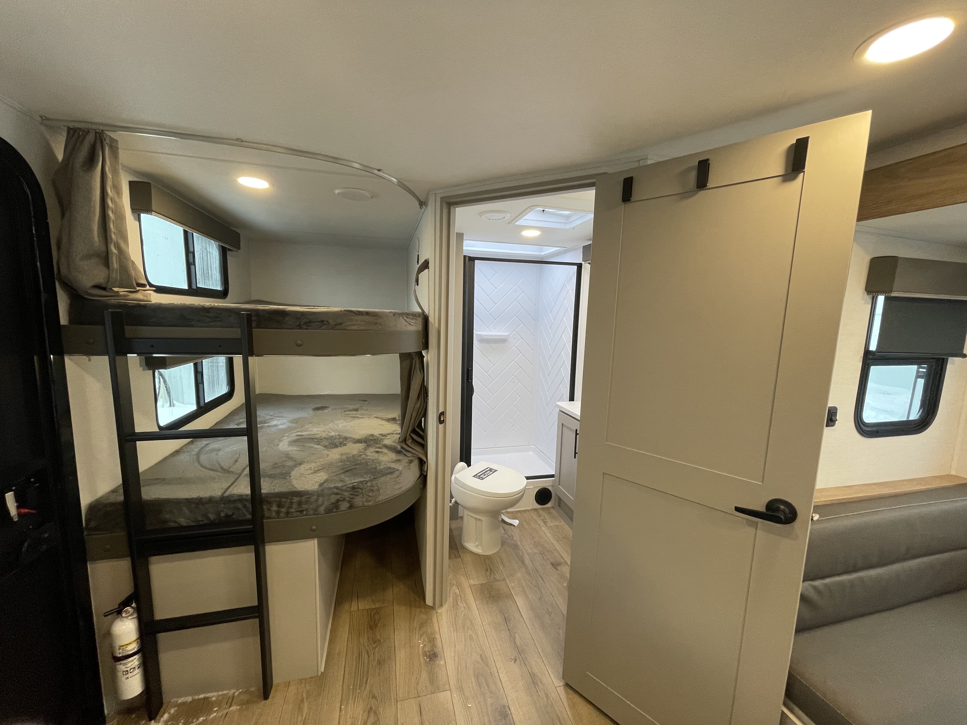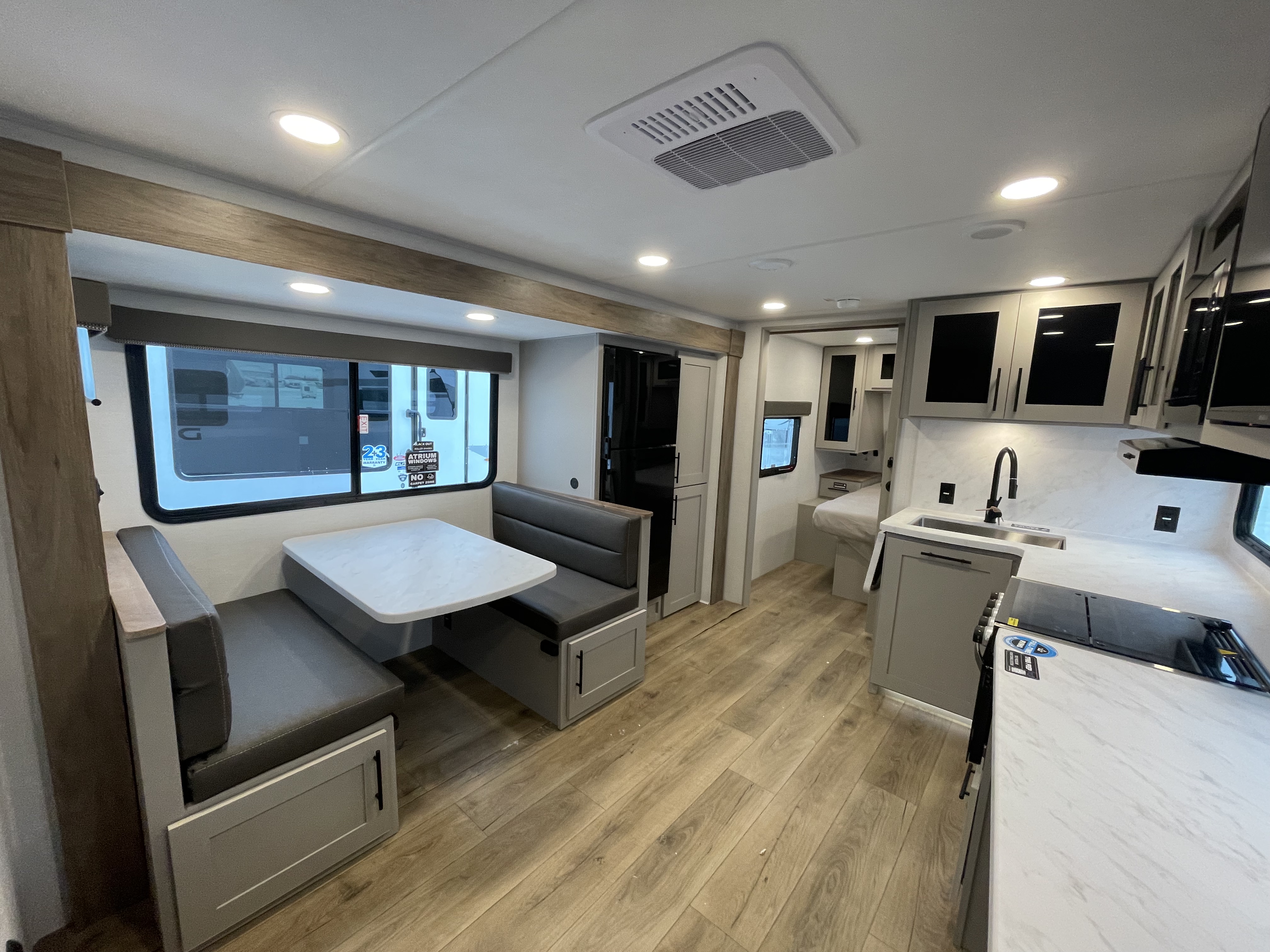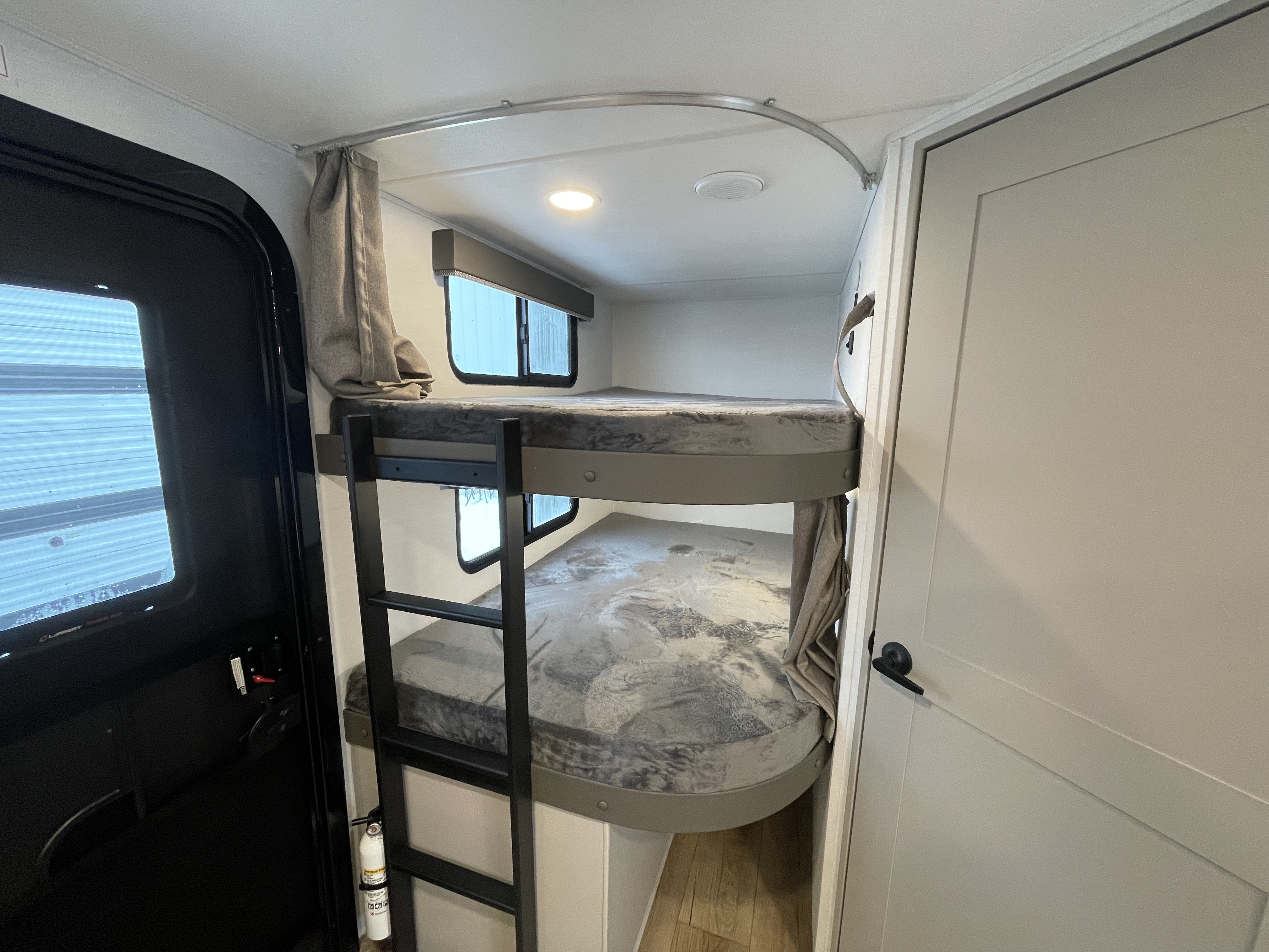 The Alliance RV Delta Ultra Lite travel trailer BH241 is a couple's trailer perfect for weekend trips. It includes a theater seat slide, fireplace, three burner cooktop, and front queen bed. The full bath has a toilet, sink, 32" shower, and linen closet. Storage with dual wardrobes, nightstands, and overhead storage. The Delta Ultra Lite BH241 is a family-friendly travel trailer designed for comfort and lightweight convenience. It is 29 feet 5 inches long and weighs 5,800 pounds, perfect for family adventures.19-foot awning, booth dinette, ample storage, bedroom, and rear bunkhouse. The exterior features of the Delta Ultra Lite travel trailer include oversized atrium windows, a carpet-free interior, magnet catches on cabinets, soft close cabinet doors, LED lighting, temperature-controlled spray ports, exterior awning controls, a 2" rear accessory hitch, and Goodyear Endurance tires.