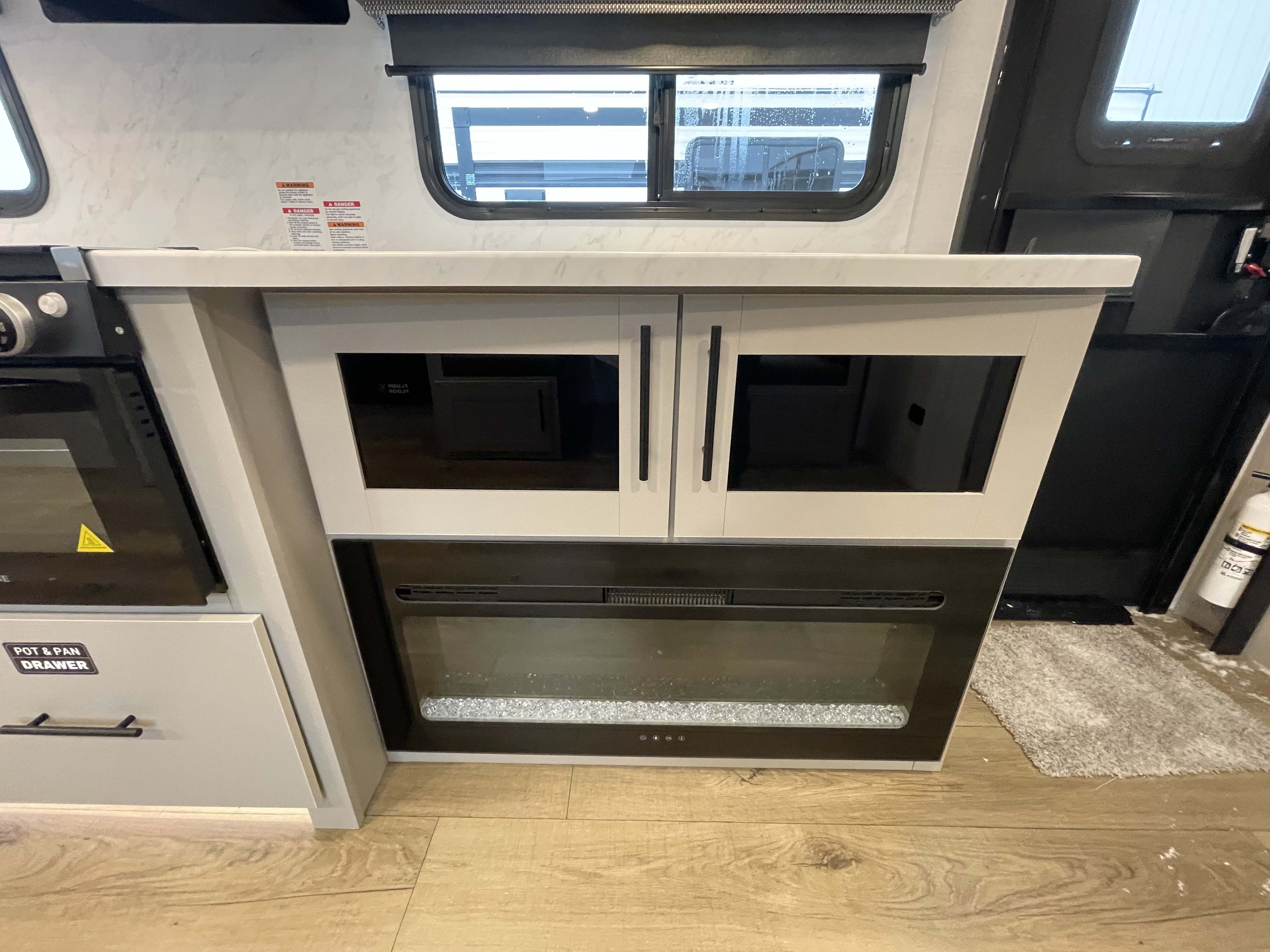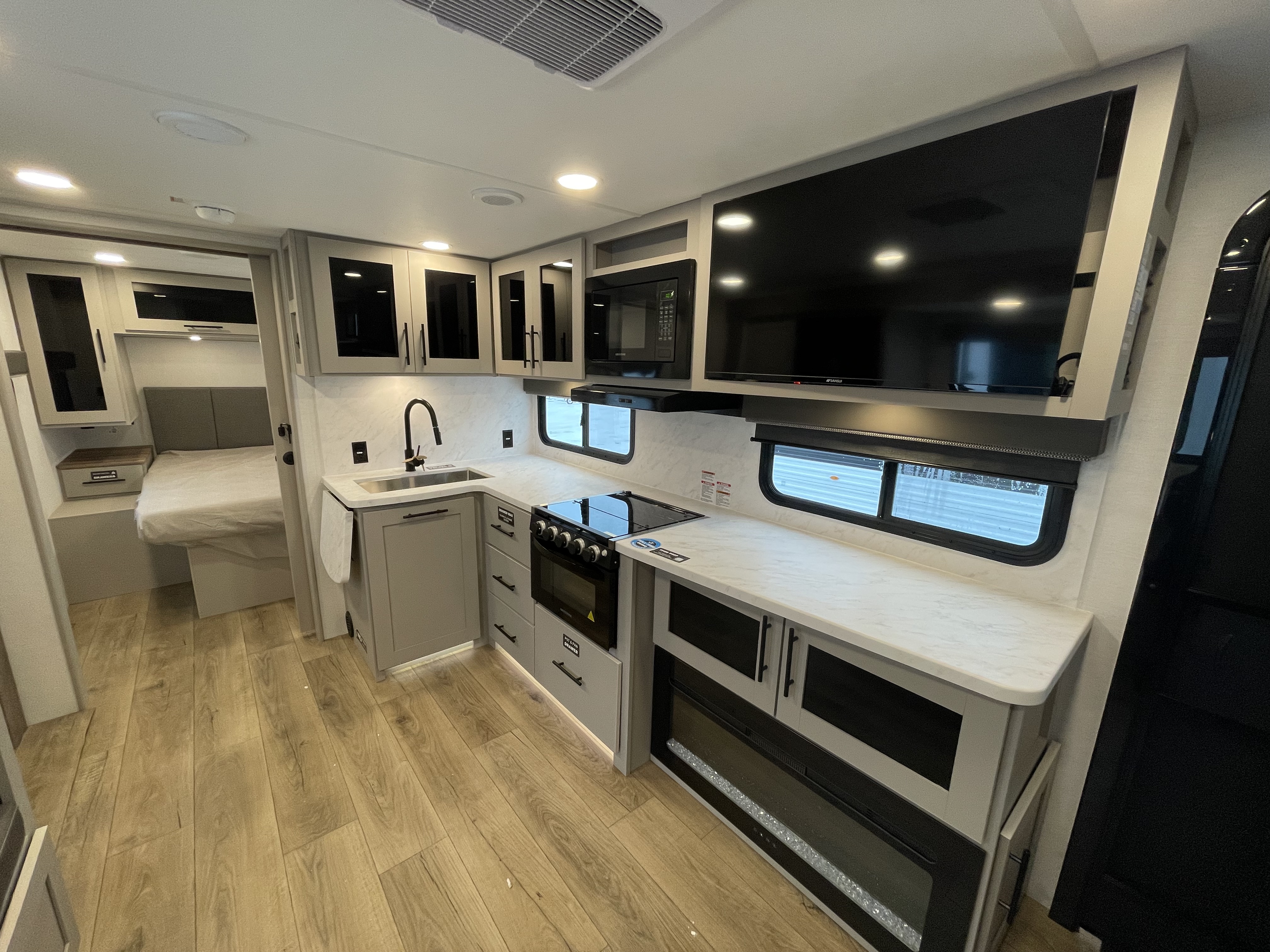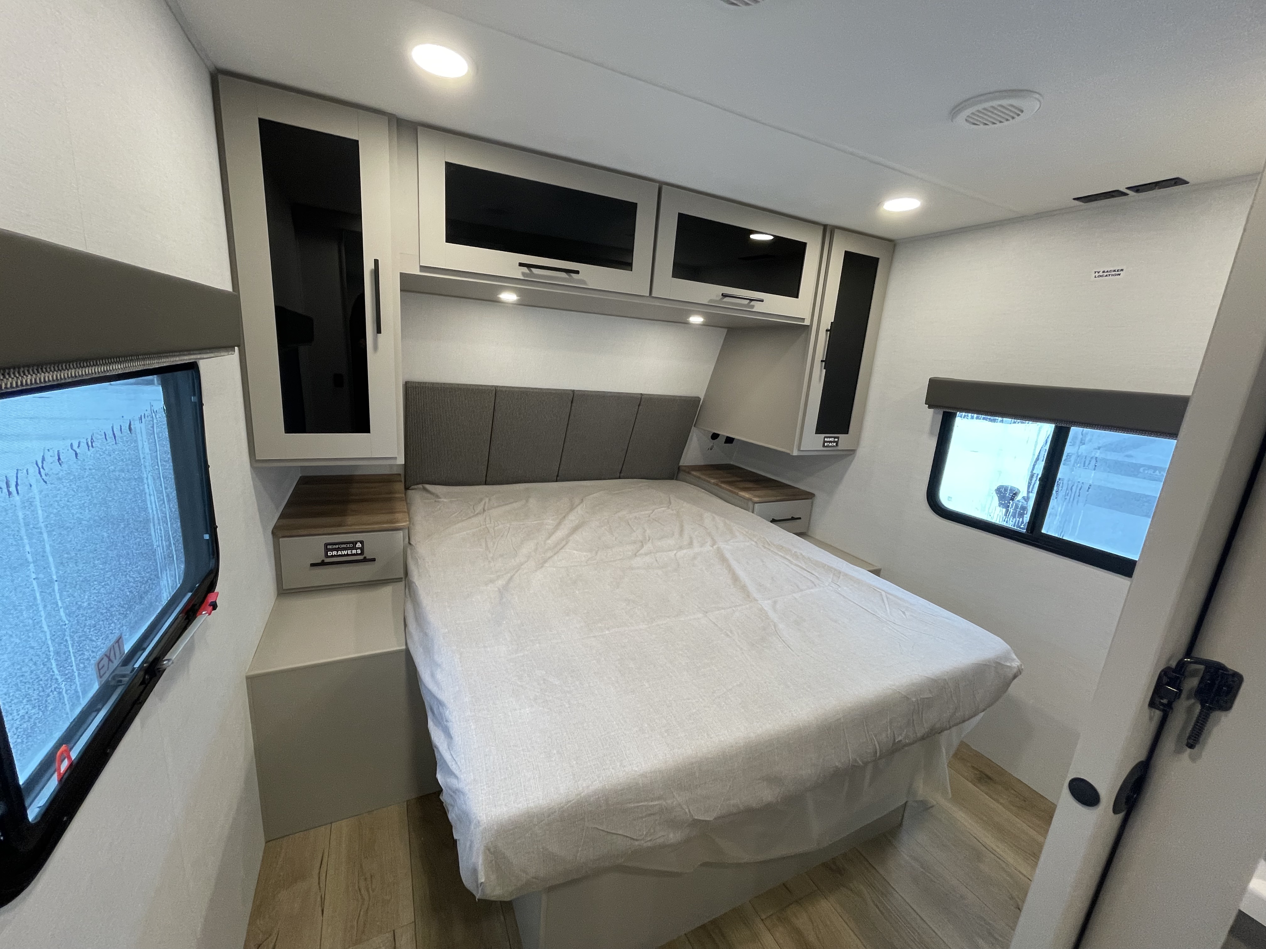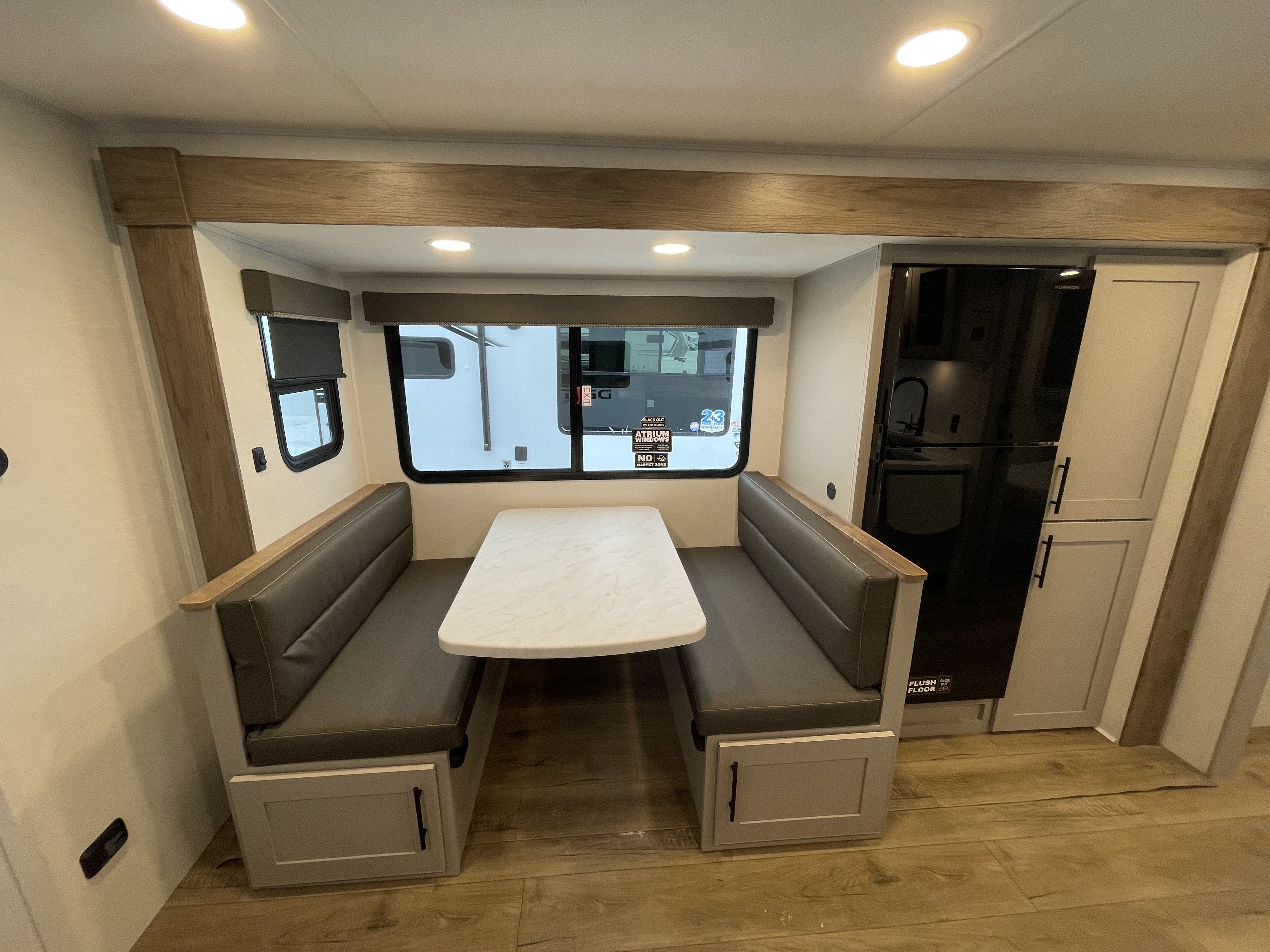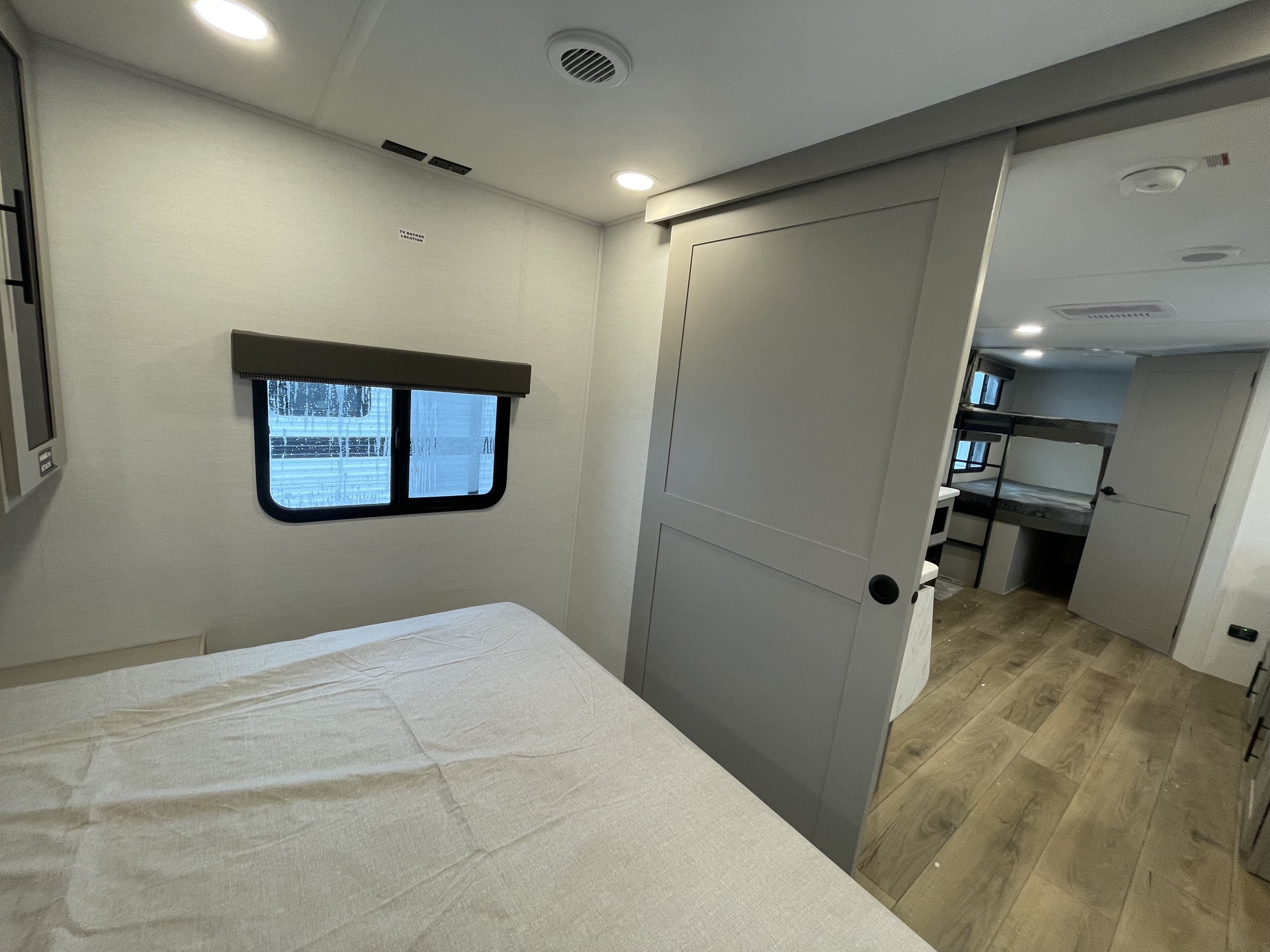 The Alliance RV Delta Ultra Lite travel trailer BH241 is a couple's trailer perfect for weekend trips. It includes a theater seat slide, fireplace, three burner cooktop, and front queen bed. The full bath has a toilet, sink, 32" shower, and linen closet. Storage with dual wardrobes, nightstands, and overhead storage. The Delta Ultra Lite BH241 is a family-friendly travel trailer designed for comfort and lightweight convenience. It is 29 feet 5 inches long and weighs 5,800 pounds, perfect for family adventures.19-foot awning, booth dinette, ample storage, bedroom, and rear bunkhouse. The exterior features of the Delta Ultra Lite travel trailer include oversized atrium windows, a carpet-free interior, magnet catches on cabinets, soft close cabinet doors, LED lighting, temperature-controlled spray ports, exterior awning controls, a 2" rear accessory hitch, and Goodyear Endurance tires.