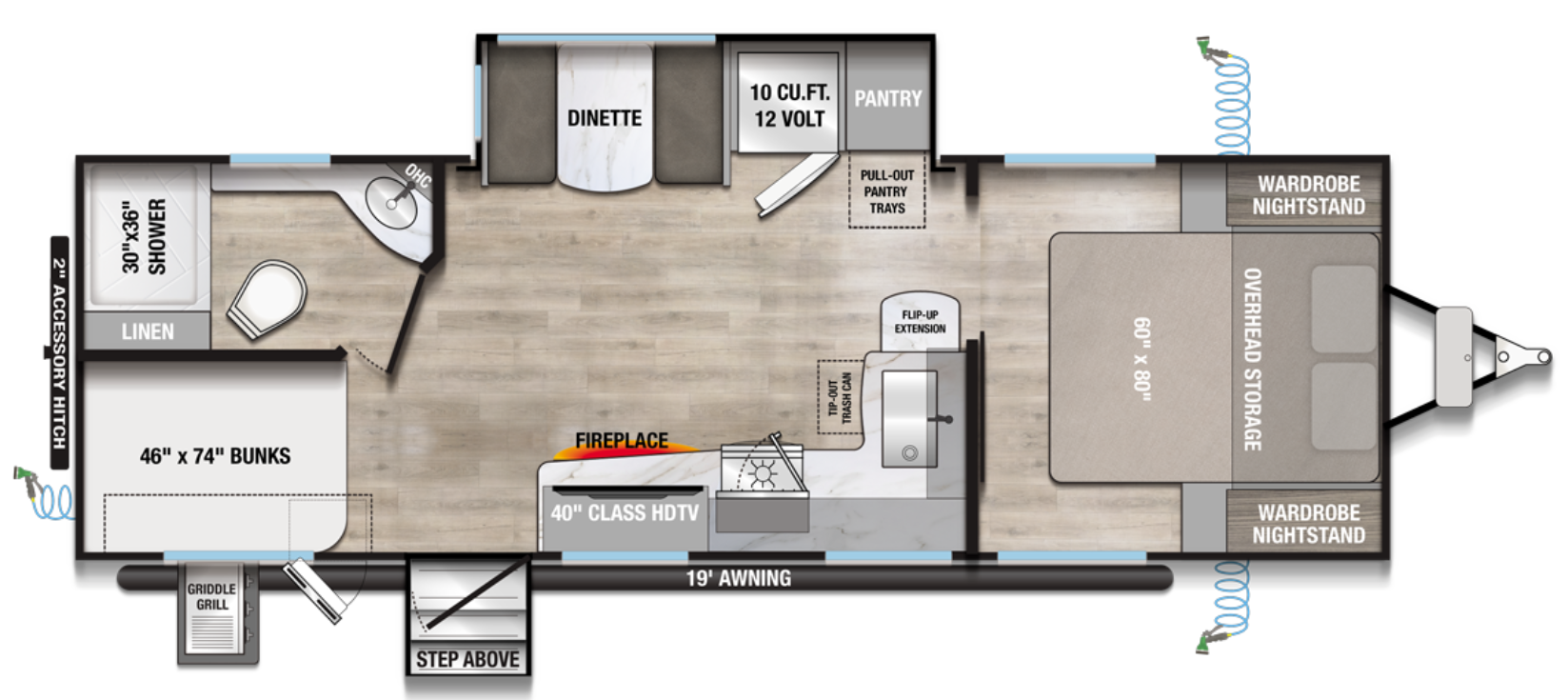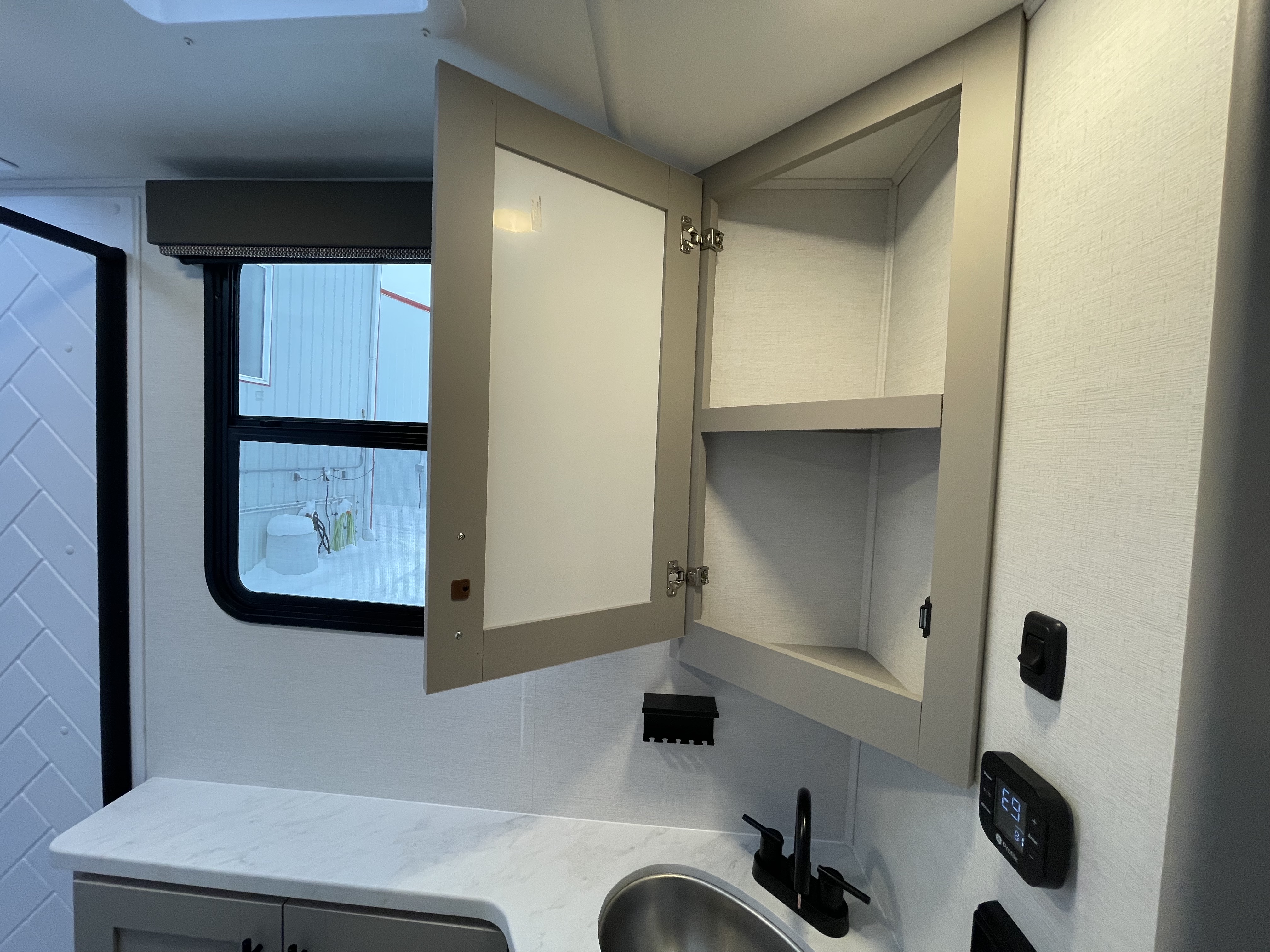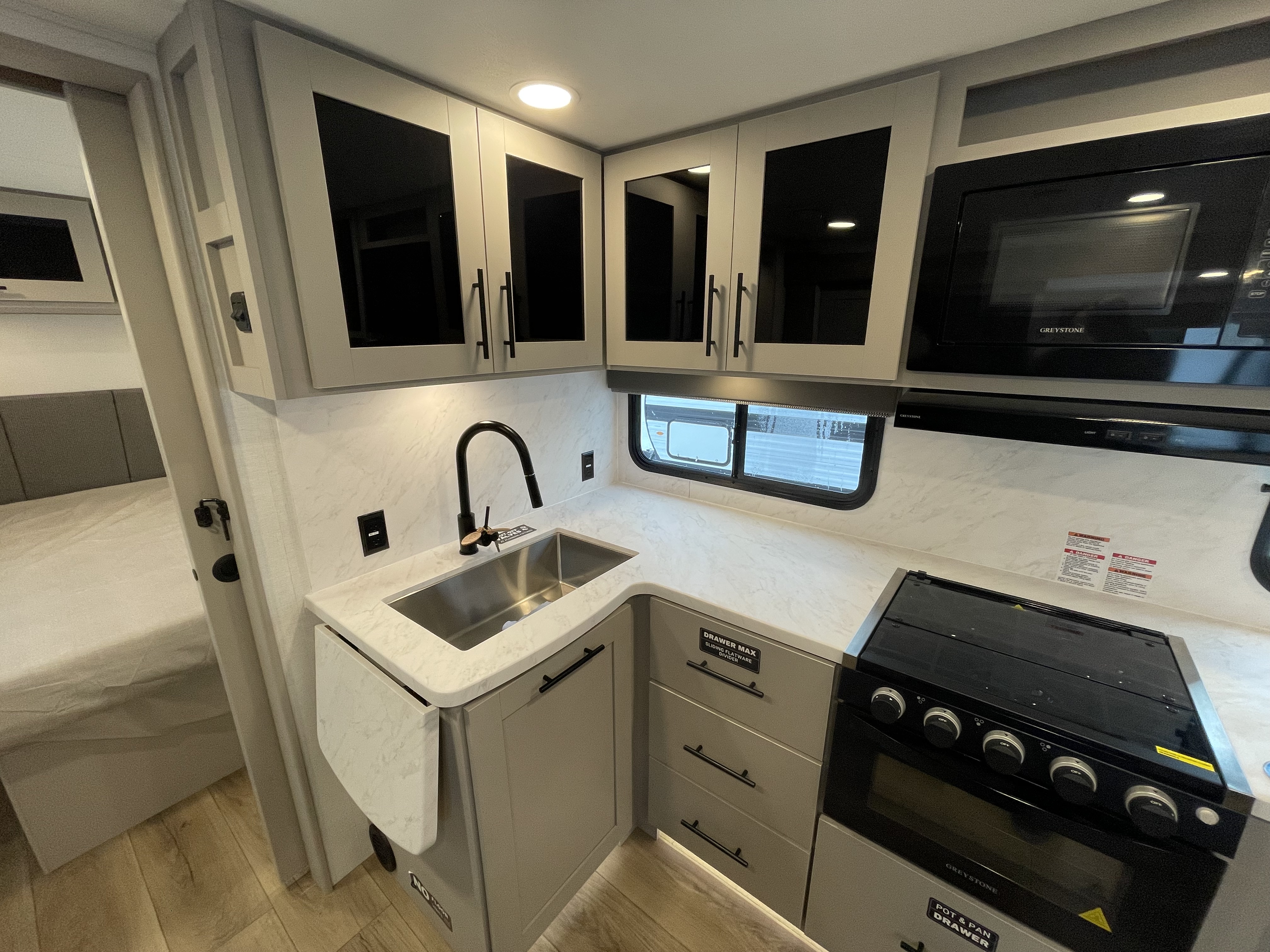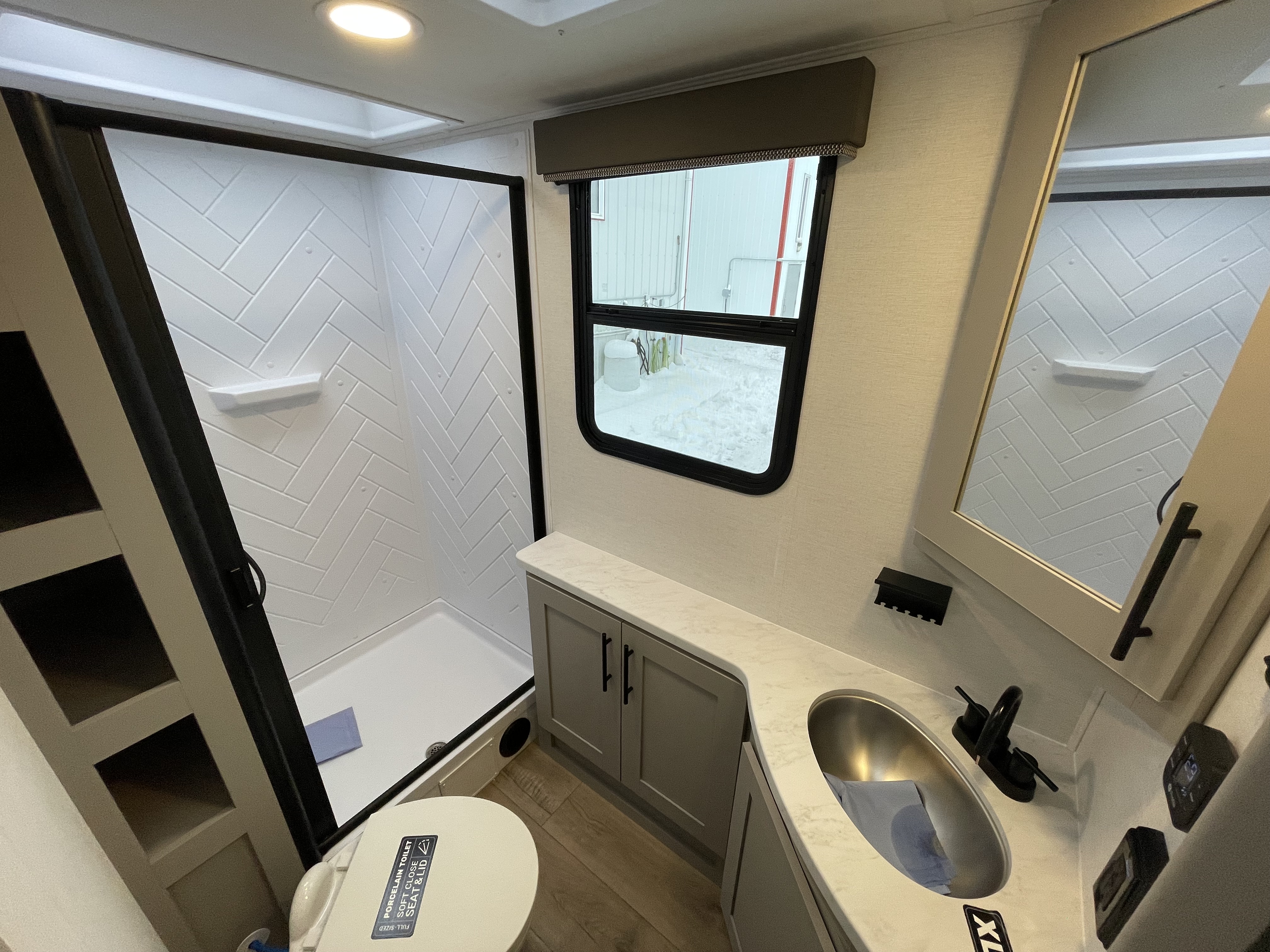 The Alliance RV Delta Ultra Lite travel trailer BH241 is a couple's trailer perfect for weekend trips. It includes a theater seat slide, fireplace, three burner cooktop, and front queen bed. The full bath has a toilet, sink, 32" shower, and linen closet. Storage with dual wardrobes, nightstands, and overhead storage. The Delta Ultra Lite BH241 is a family-friendly travel trailer designed for comfort and lightweight convenience. It is 29 feet 5 inches long and weighs 5,800 pounds, perfect for family adventures.19-foot awning, booth dinette, ample storage, bedroom, and rear bunkhouse. The exterior features of the Delta Ultra Lite travel trailer include oversized atrium windows, a carpet-free interior, magnet catches on cabinets, soft close cabinet doors, LED lighting, temperature-controlled spray ports, exterior awning controls, a 2" rear accessory hitch, and Goodyear Endurance tires.