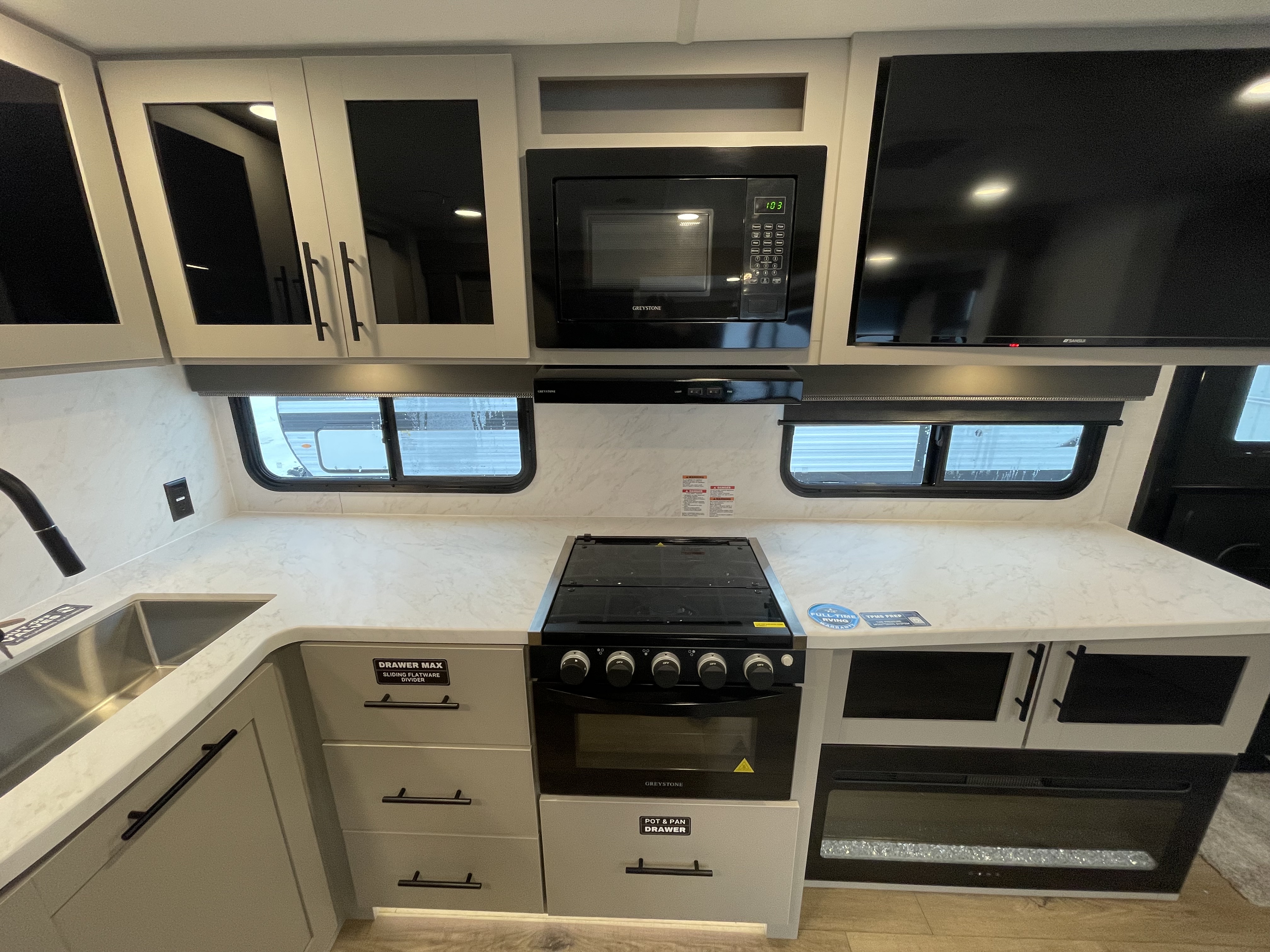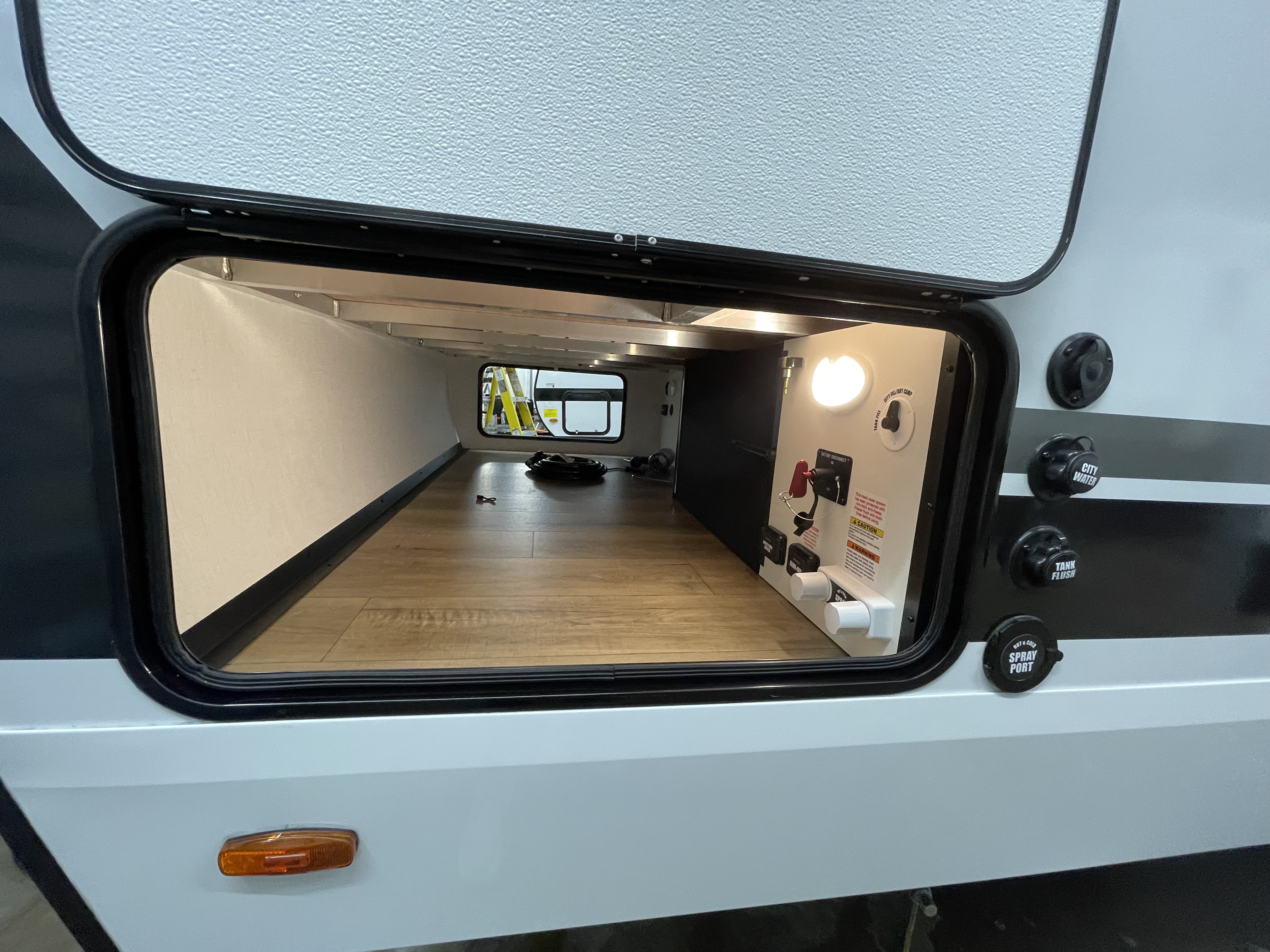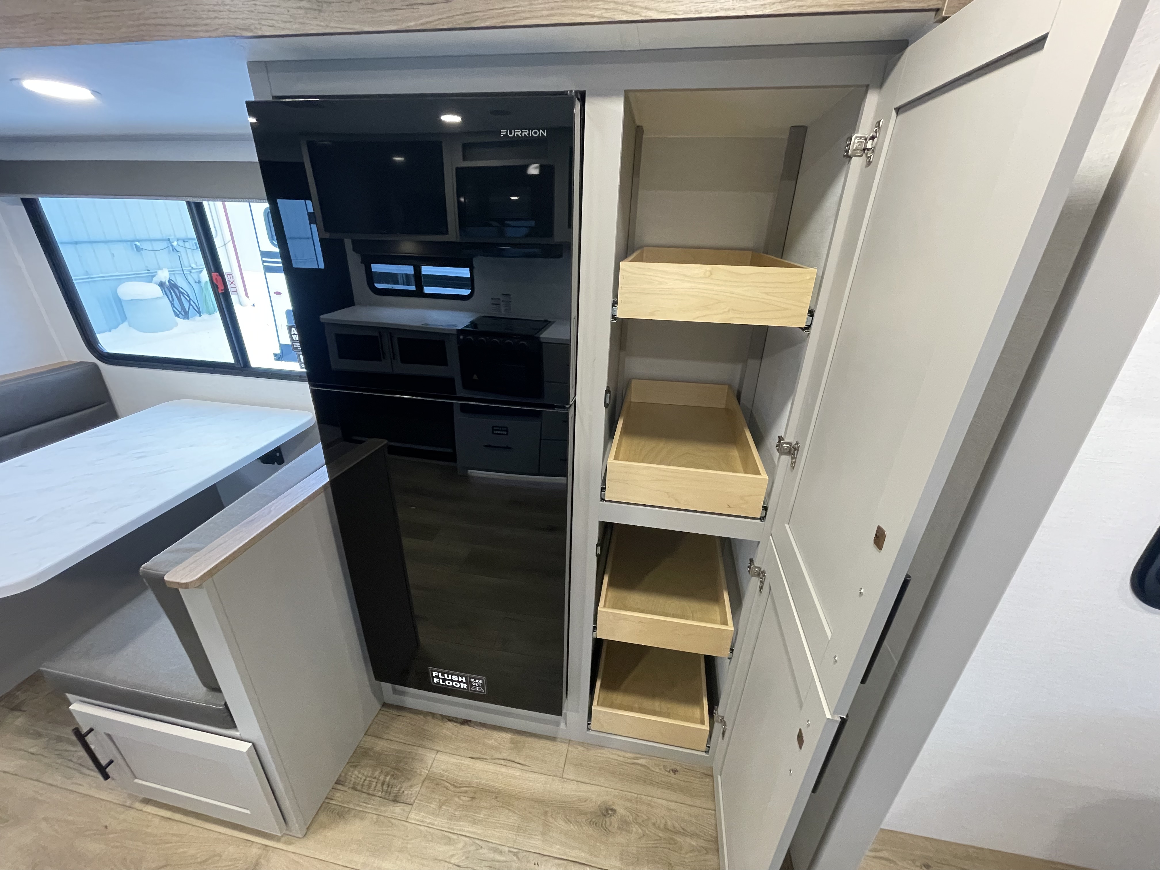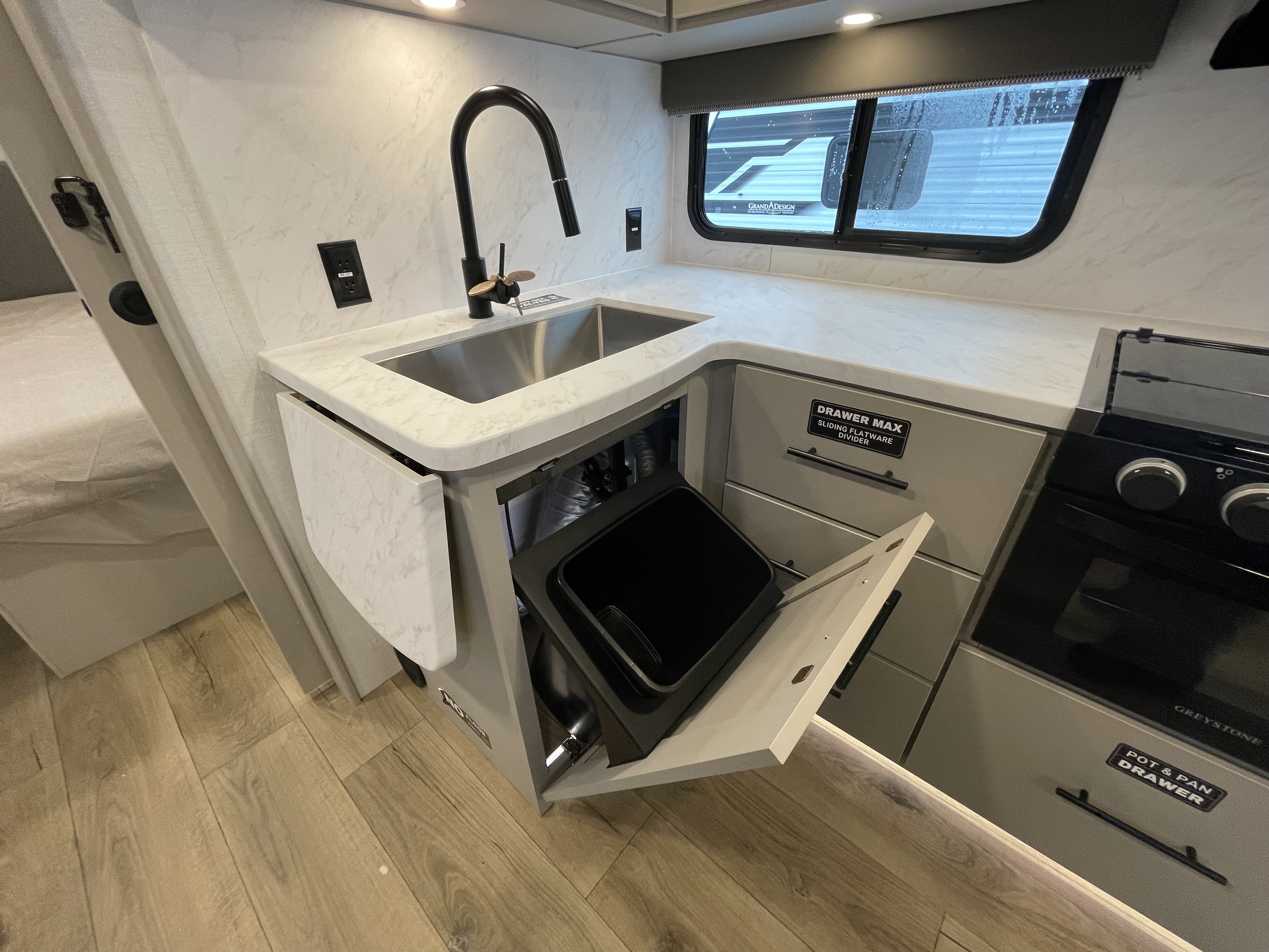 The Alliance RV Delta Ultra Lite travel trailer BH241 is a couple's trailer perfect for weekend trips. It includes a theater seat slide, fireplace, three burner cooktop, and front queen bed. The full bath has a toilet, sink, 32" shower, and linen closet. Storage with dual wardrobes, nightstands, and overhead storage. The Delta Ultra Lite BH241 is a family-friendly travel trailer designed for comfort and lightweight convenience. It is 29 feet 5 inches long and weighs 5,800 pounds, perfect for family adventures.19-foot awning, booth dinette, ample storage, bedroom, and rear bunkhouse. The exterior features of the Delta Ultra Lite travel trailer include oversized atrium windows, a carpet-free interior, magnet catches on cabinets, soft close cabinet doors, LED lighting, temperature-controlled spray ports, exterior awning controls, a 2" rear accessory hitch, and Goodyear Endurance tires.