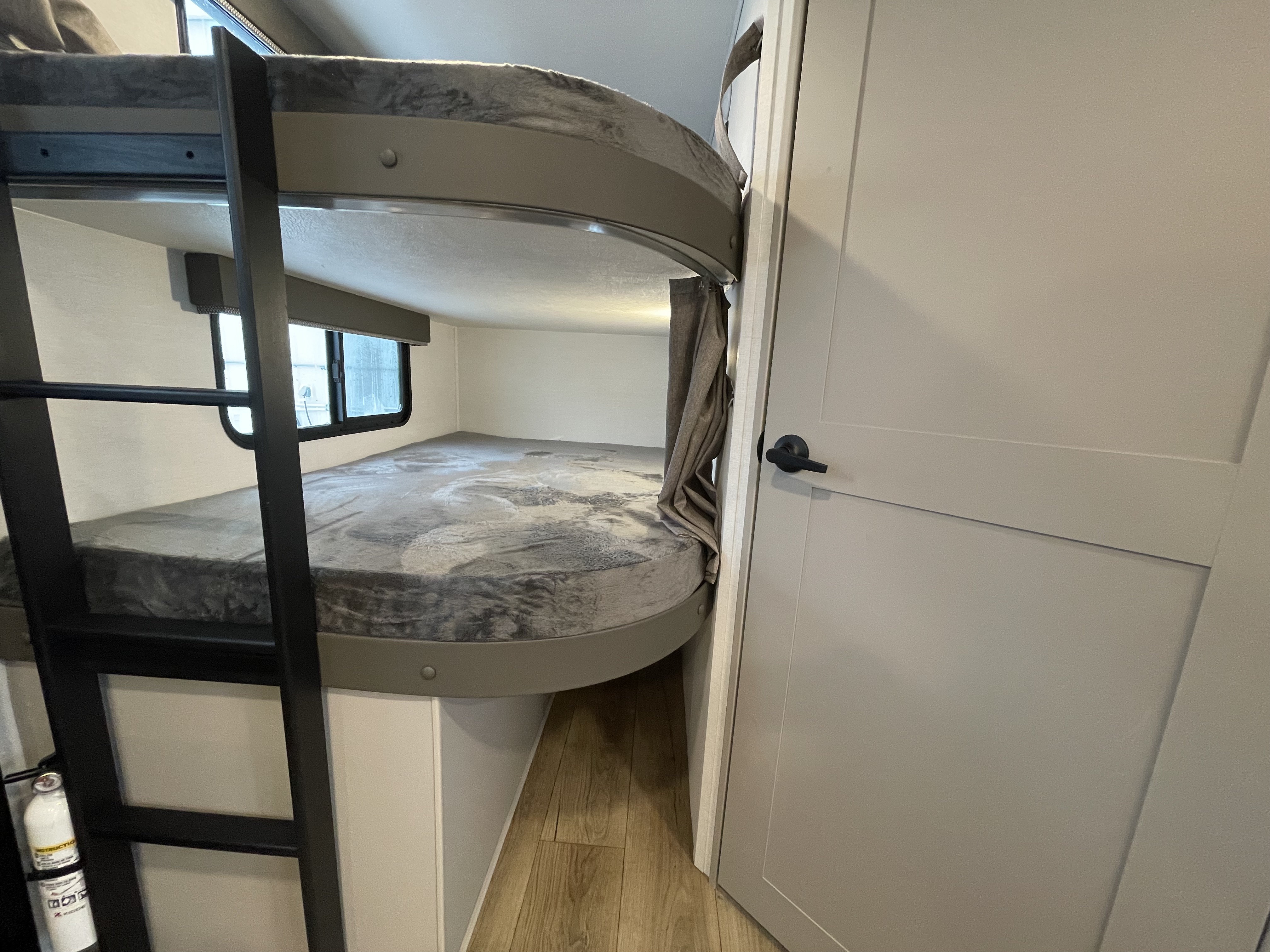 The Alliance RV Delta Ultra Lite travel trailer BH241 is a couple's trailer perfect for weekend trips. It includes a theater seat slide, fireplace, three burner cooktop, and front queen bed. The full bath has a toilet, sink, 32" shower, and linen closet. Storage with dual wardrobes, nightstands, and overhead storage. The Delta Ultra Lite BH241 is a family-friendly travel trailer designed for comfort and lightweight convenience. It is 29 feet 5 inches long and weighs 5,800 pounds, perfect for family adventures.19-foot awning, booth dinette, ample storage, bedroom, and rear bunkhouse. The exterior features of the Delta Ultra Lite travel trailer include oversized atrium windows, a carpet-free interior, magnet catches on cabinets, soft close cabinet doors, LED lighting, temperature-controlled spray ports, exterior awning controls, a 2" rear accessory hitch, and Goodyear Endurance tires.