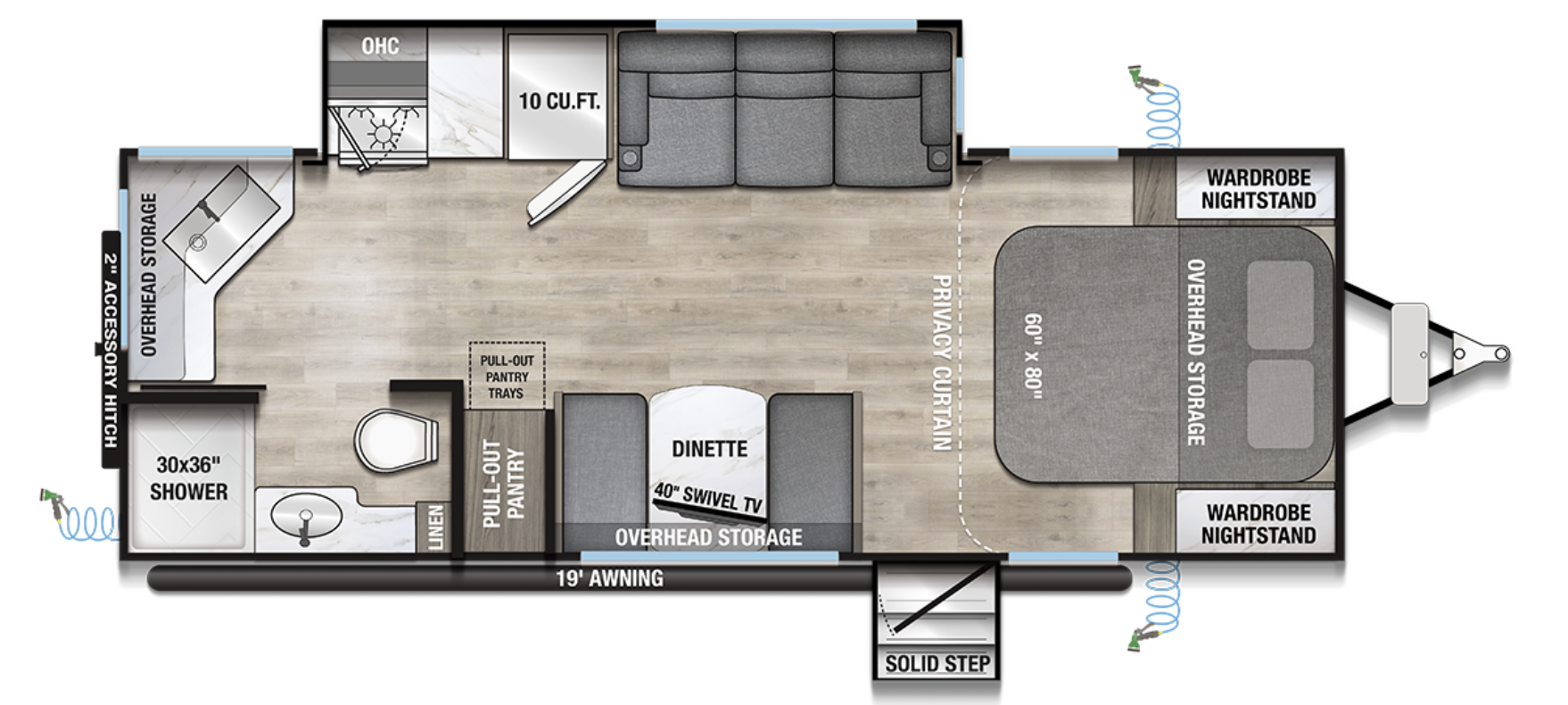 - Outdoor Living Ready: Features a 19’ awning for shaded relaxation and a solid step entry for easy access.