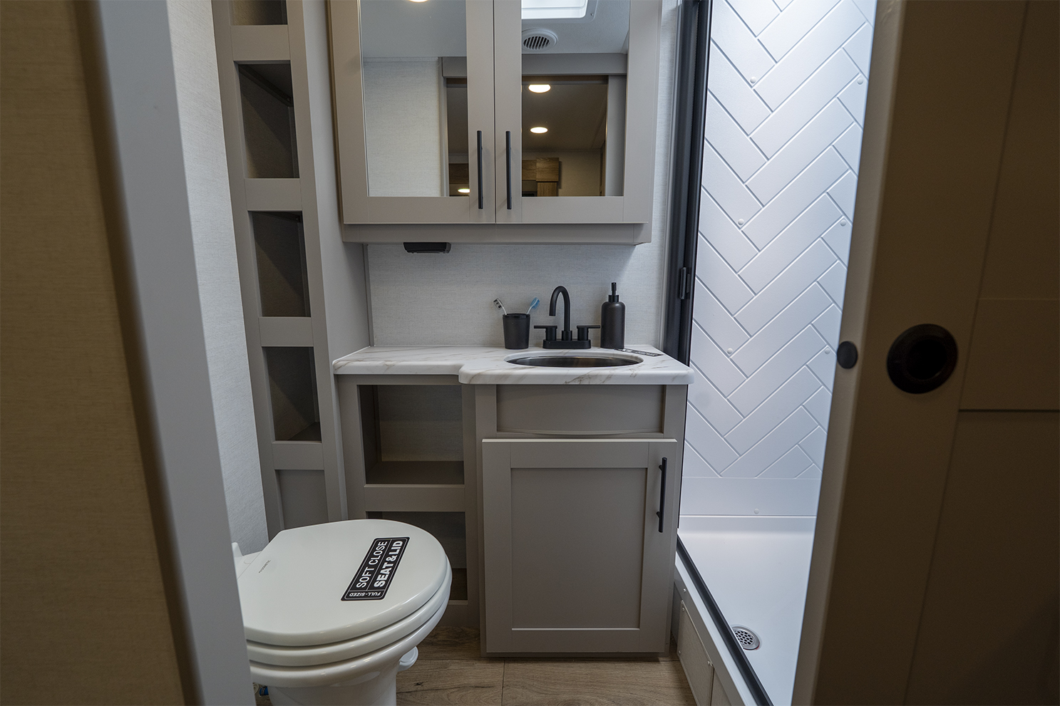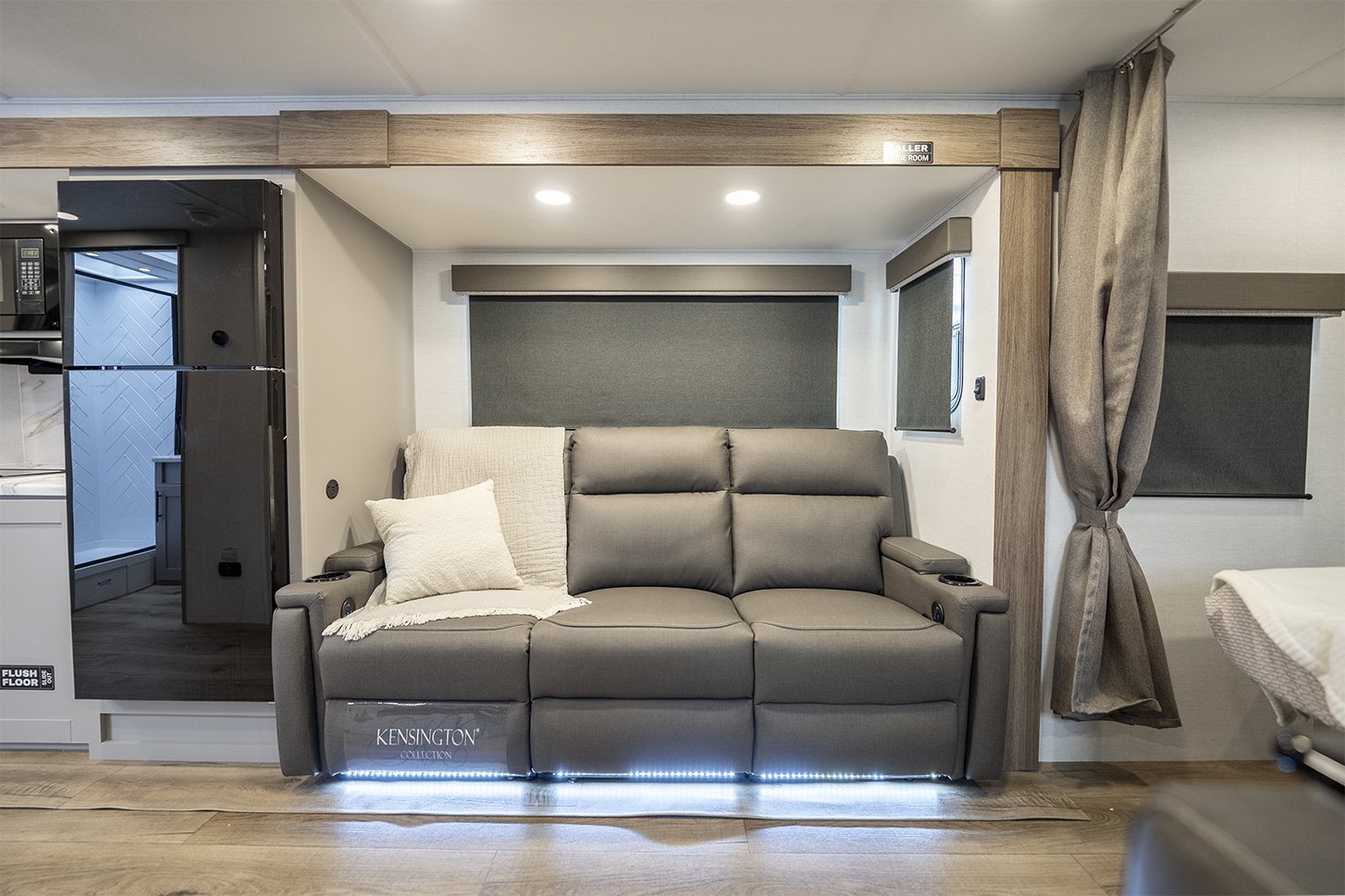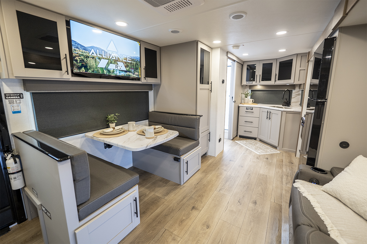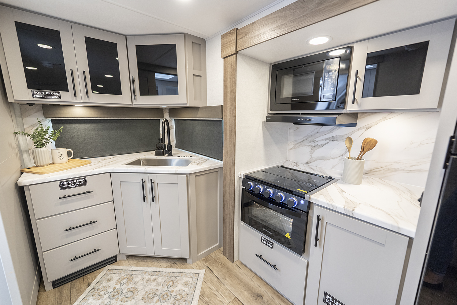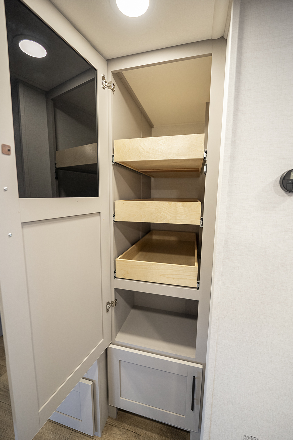- Functional Kitchen: Equipped with a 10 cu. ft. 12-volt refrigerator, a pull-out pantry, and ample overhead storage for all your cooking essentials.
