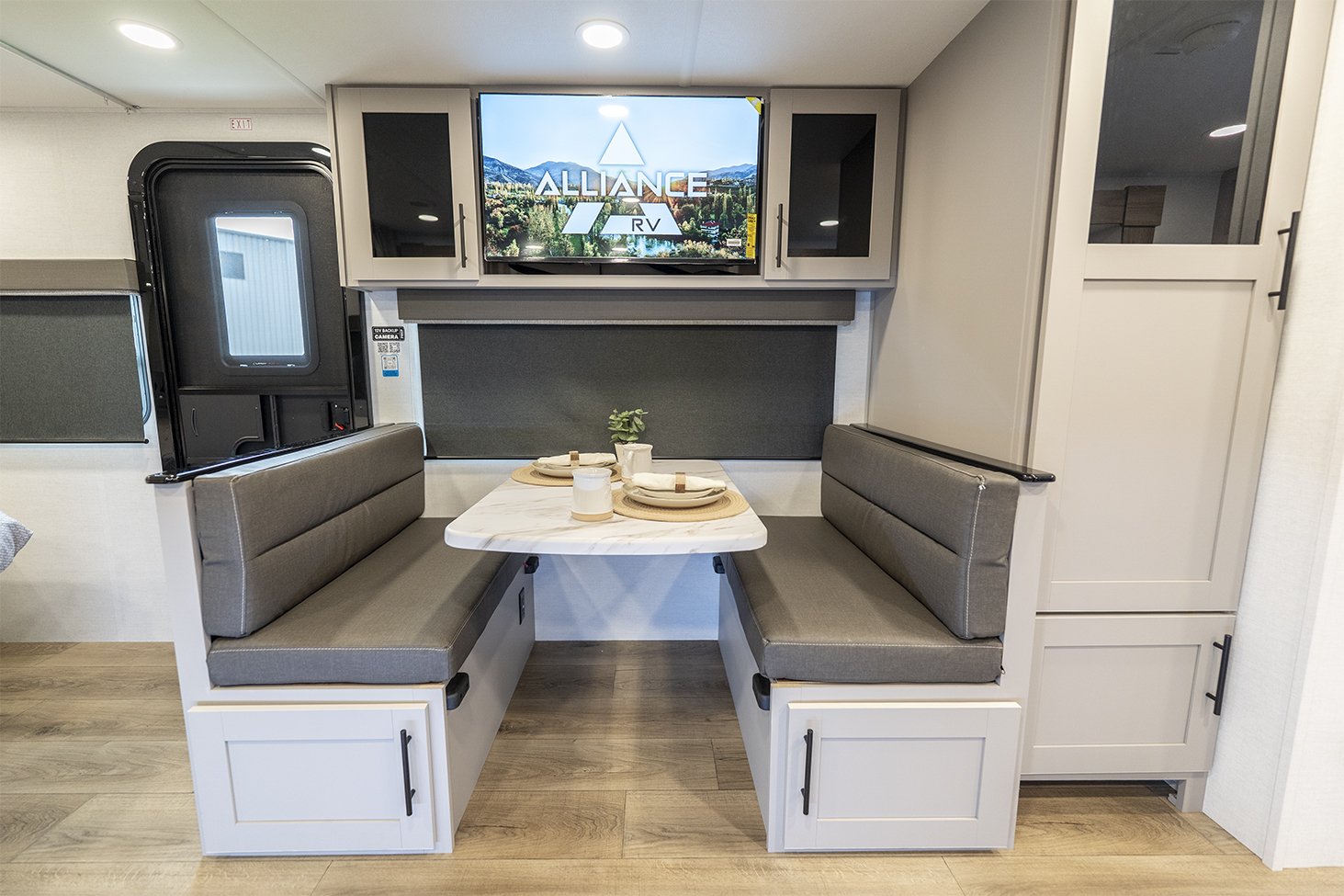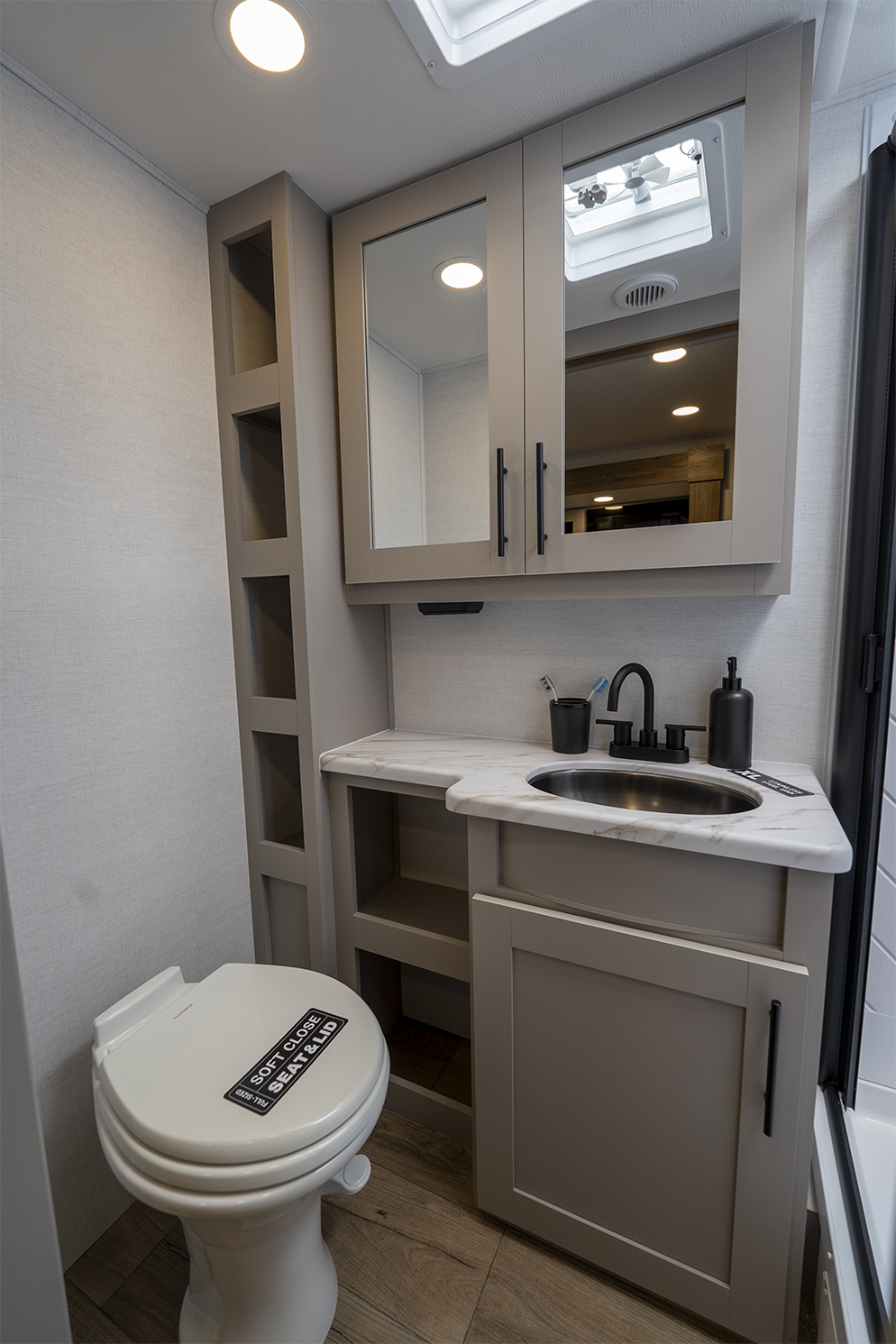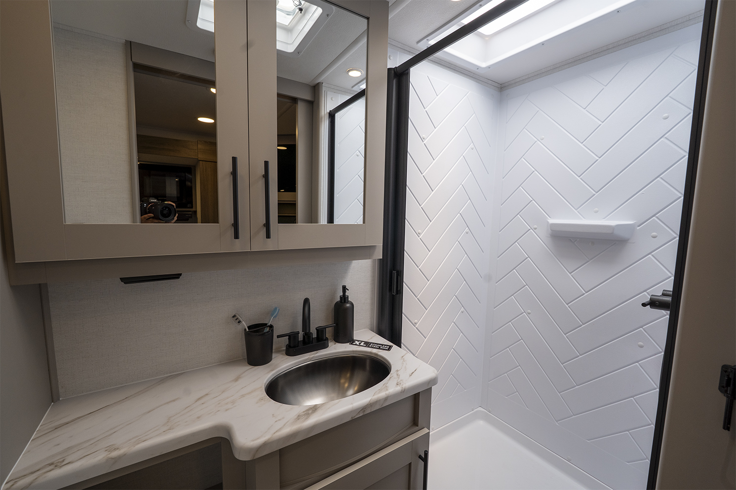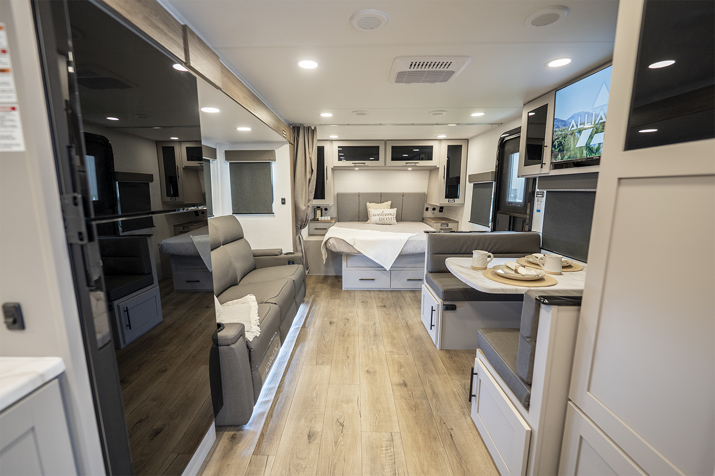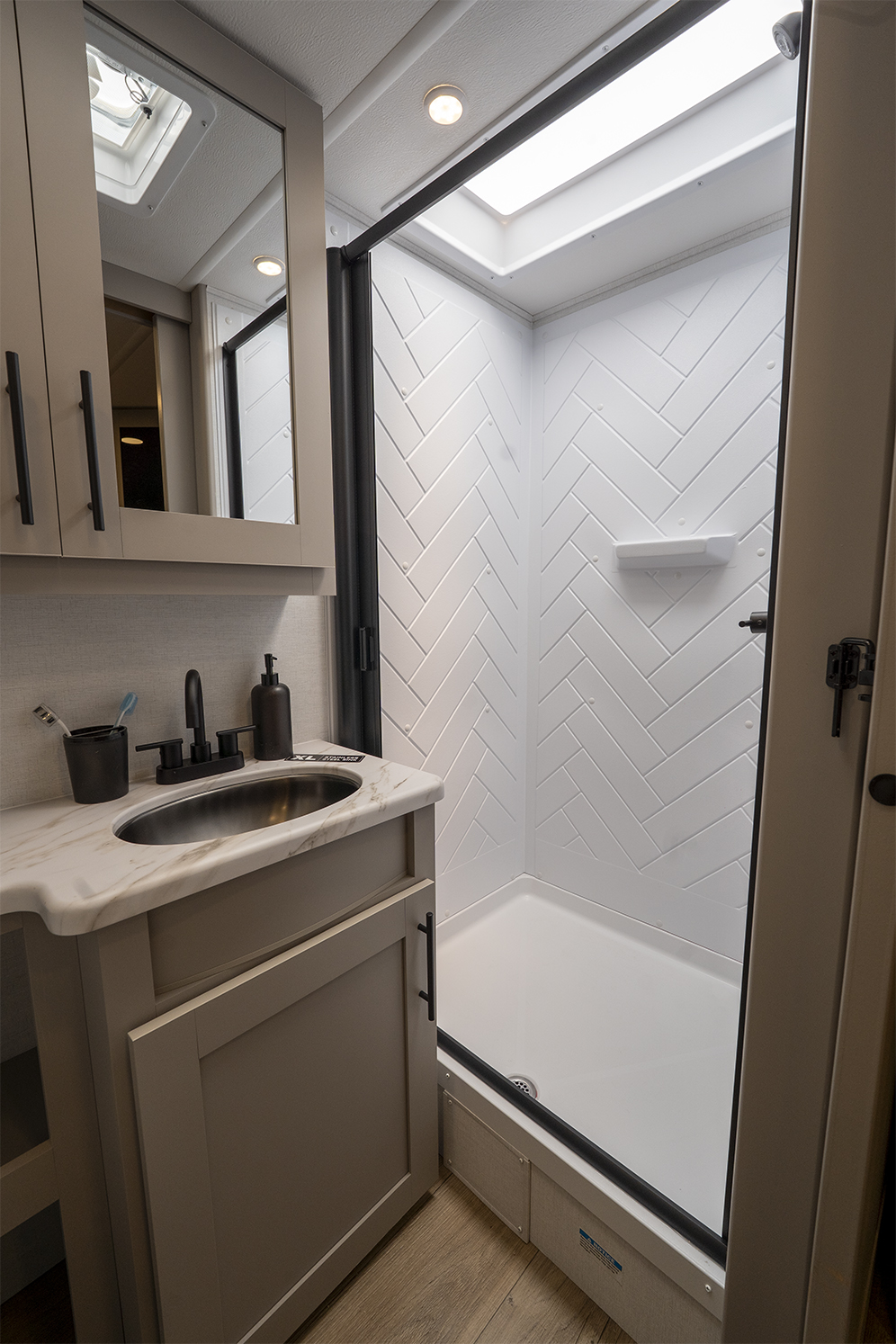 - Functional Kitchen: Equipped with a 10 cu. ft. 12-volt refrigerator, a pull-out pantry, and ample overhead storage for all your cooking essentials.