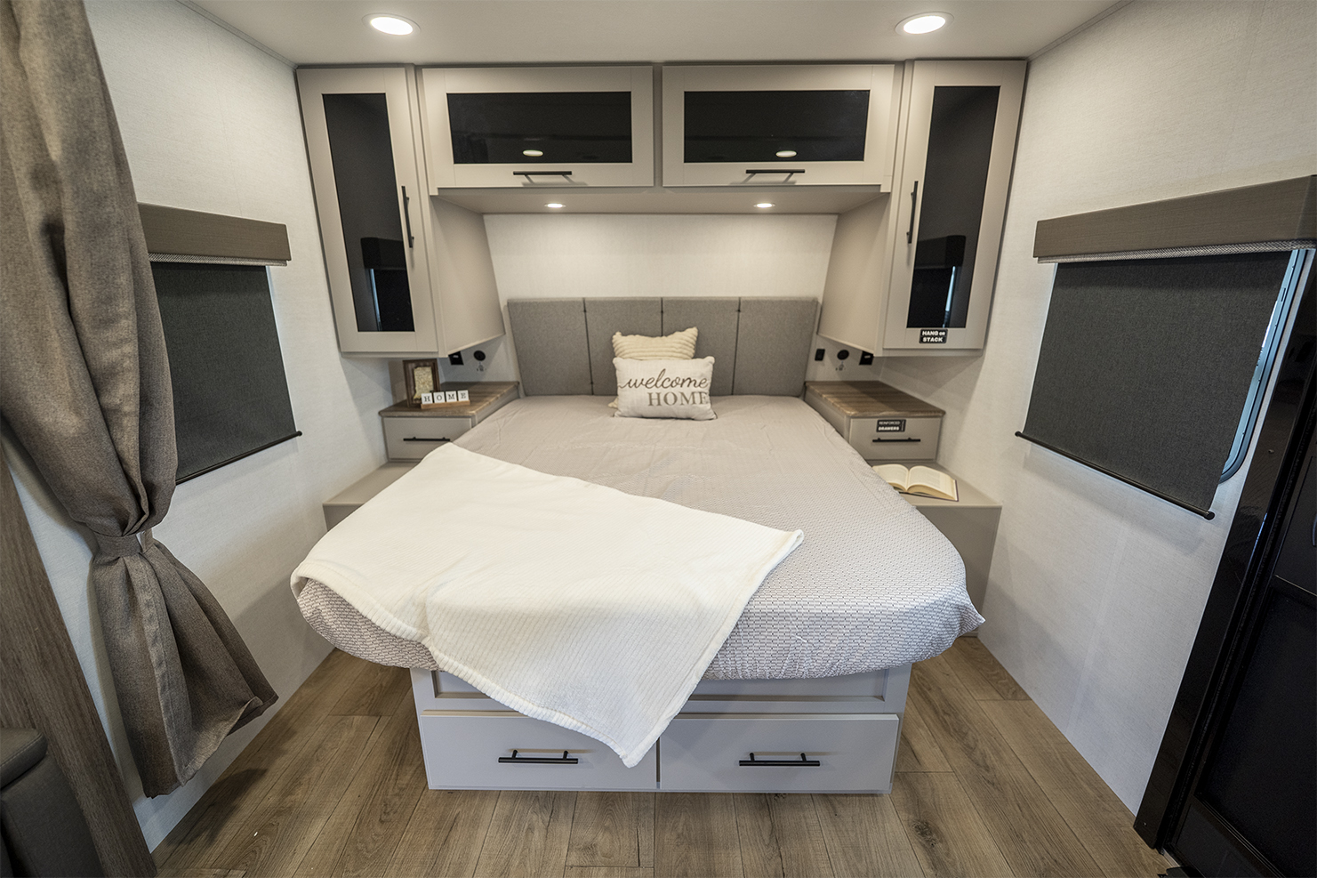 - Private Bedroom Retreat: Enjoy a 60" x 80" queen bed with wardrobe nightstands, overhead storage, and a privacy curtain for added comfort.