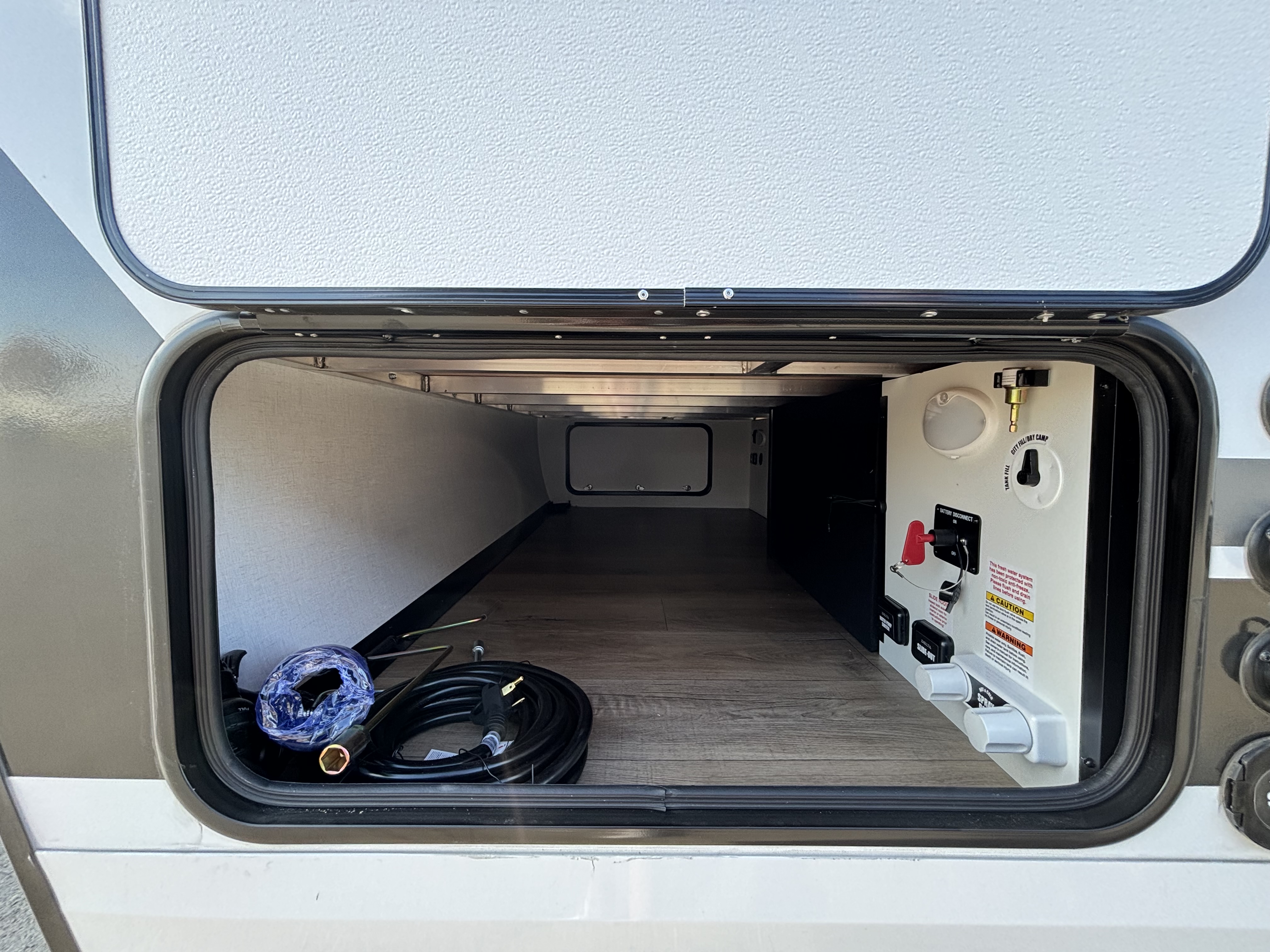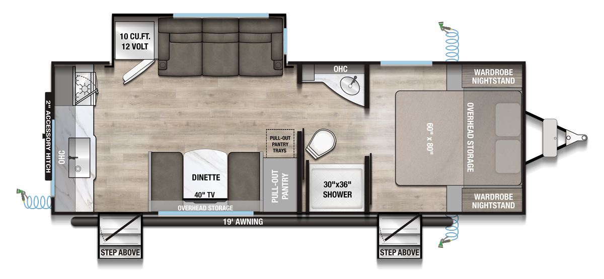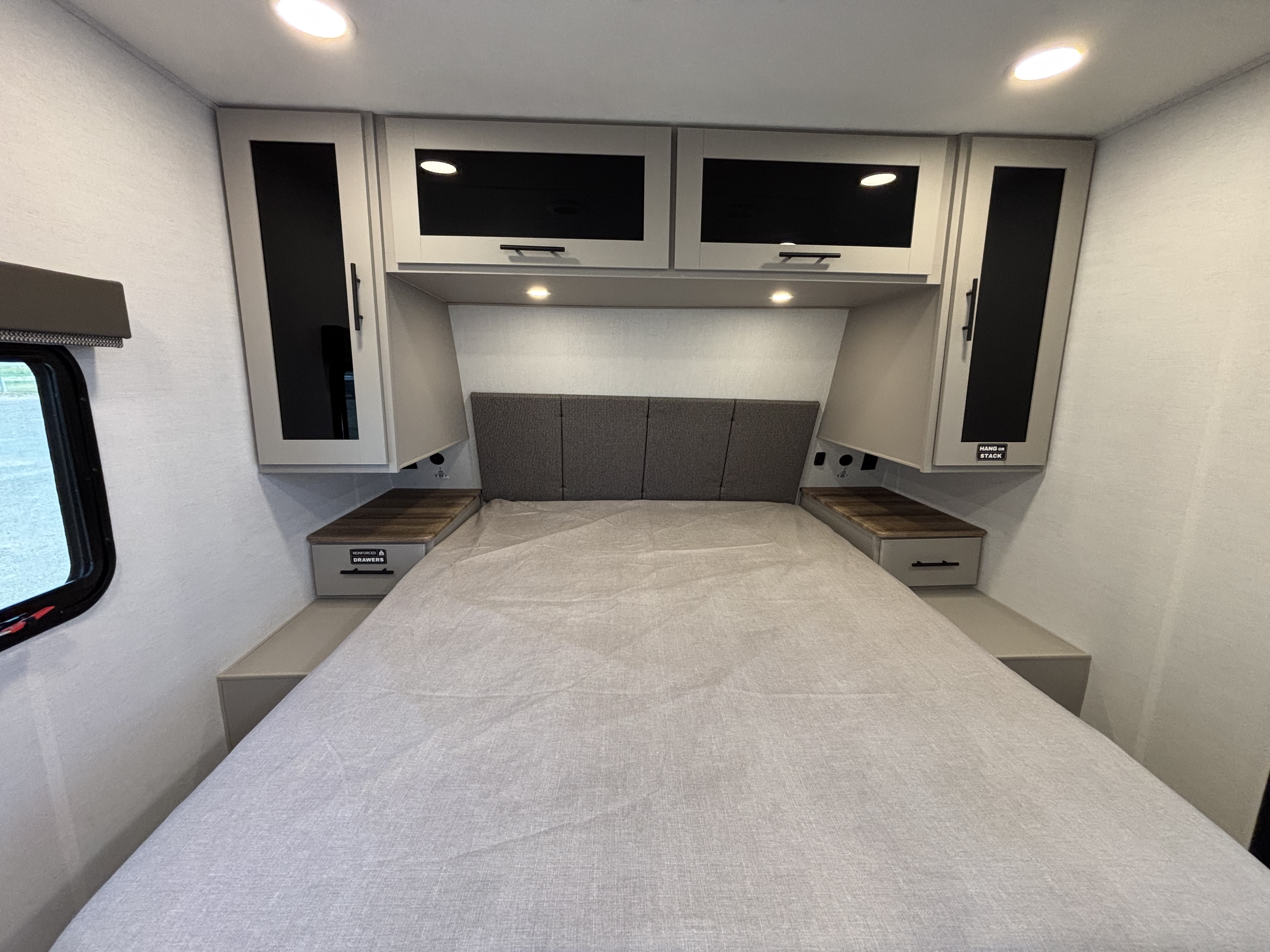 - Bedroom Retreat: At the front, you'll find a queen-size bed (60" x 80") with hidden storage underneath, perfect for blankets or extra gear. Nightstands on both sides and upper storage provide space for your clothing and personal items.