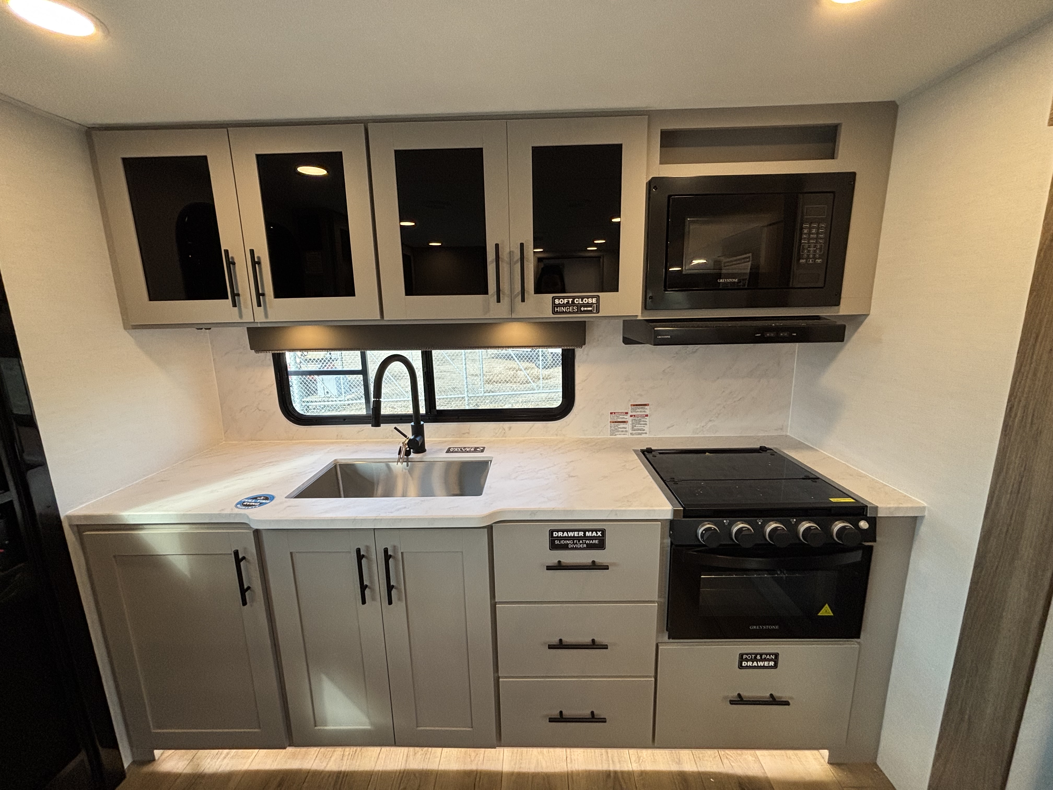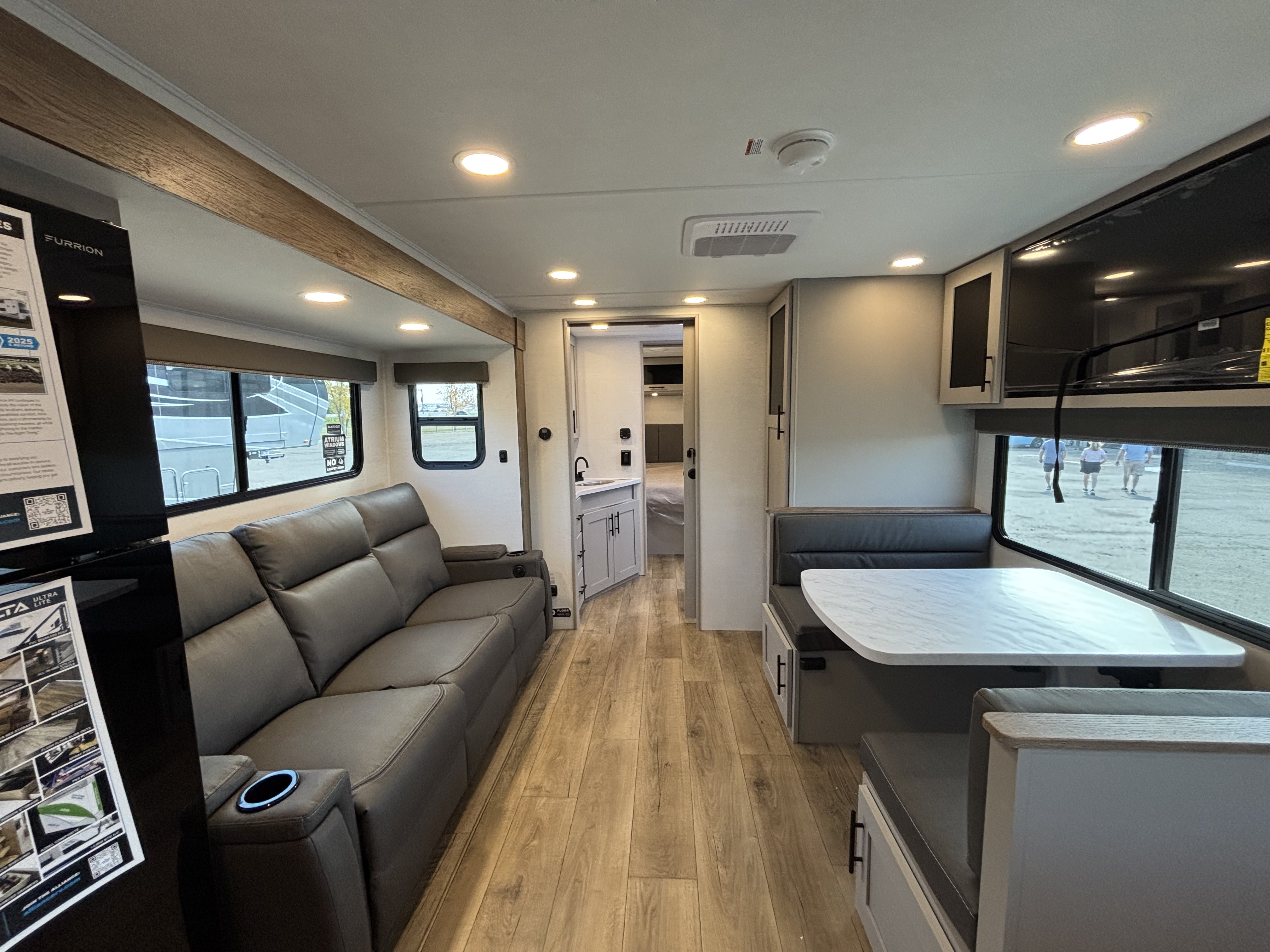 - Rear Kitchen Design: The thoughtfully designed rear kitchen includes upper cabinets for ample storage, a three-burner cooktop, and a large pantry to keep your essentials organized. The 10 cu. ft. 12-volt refrigerator ensures plenty of space to store fresh food during your travels.