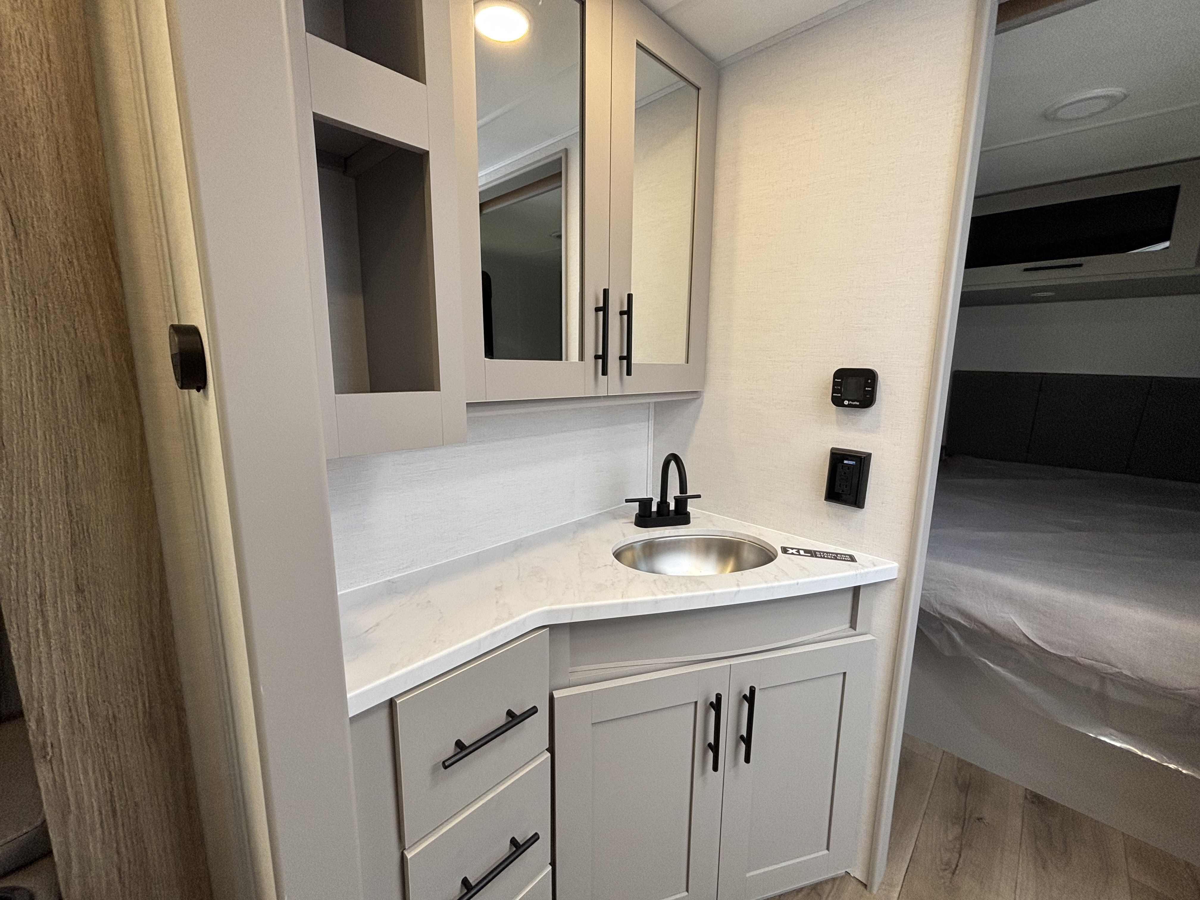 - Bedroom Retreat: At the front, you'll find a queen-size bed (60" x 80") with hidden storage underneath, perfect for blankets or extra gear. Nightstands on both sides and upper storage provide space for your clothing and personal items.